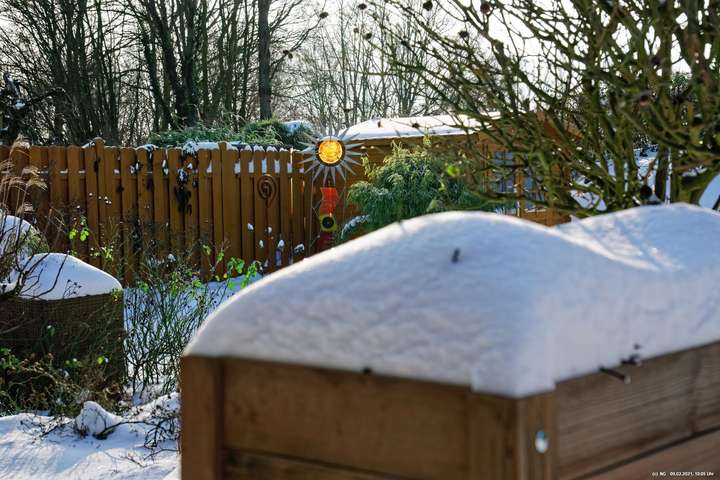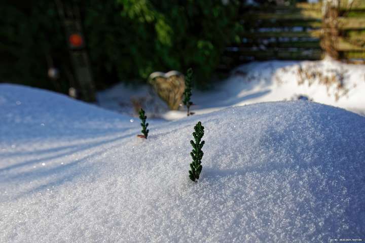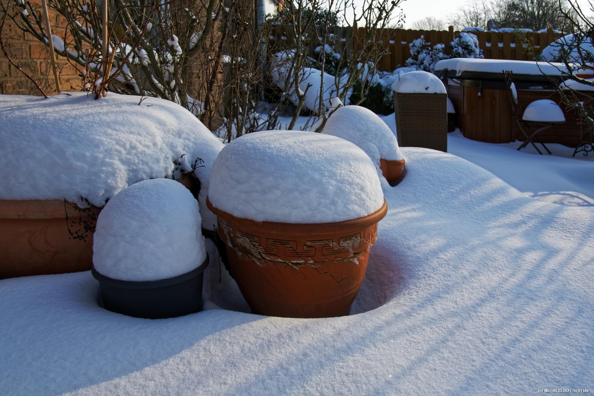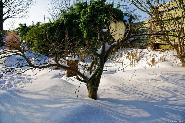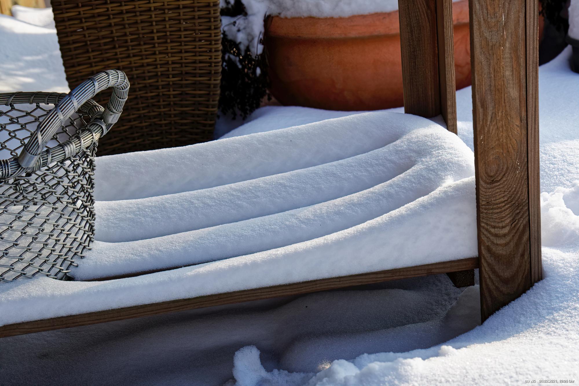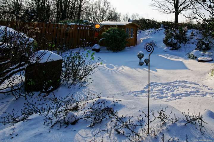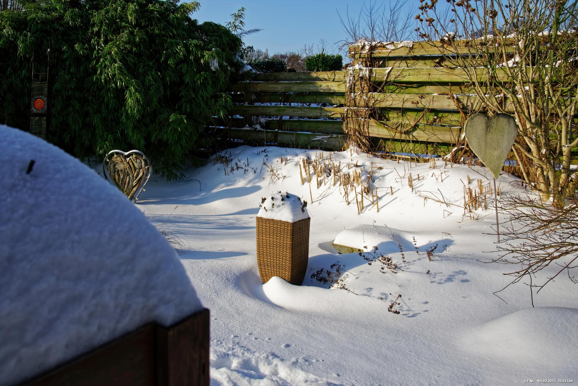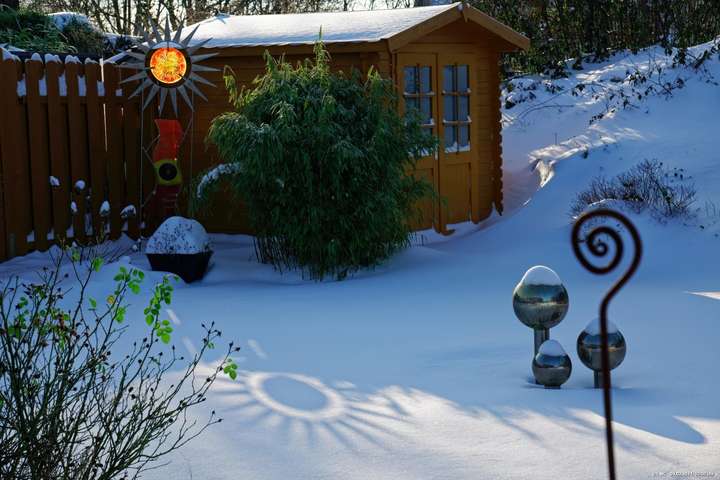 Nach dem ordentlichen Schneefall der letzten Tage habe ich mal versucht, nur 5 m zu gehen und dabei Motive zu suchen. Es gab genug - und es gibt auch Formen, die man sonst im eigenen Garten gar nicht sieht. Spannend war's!