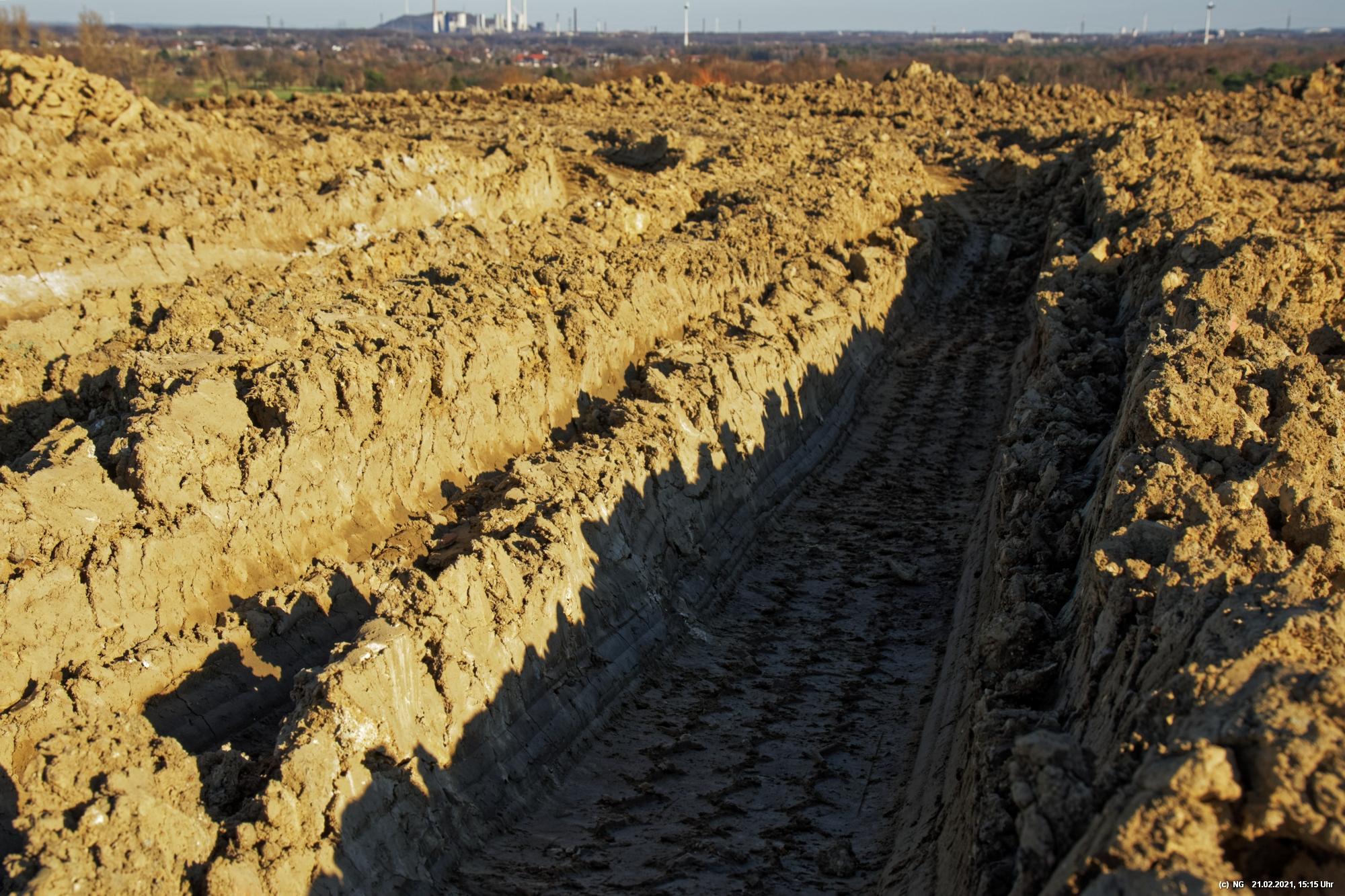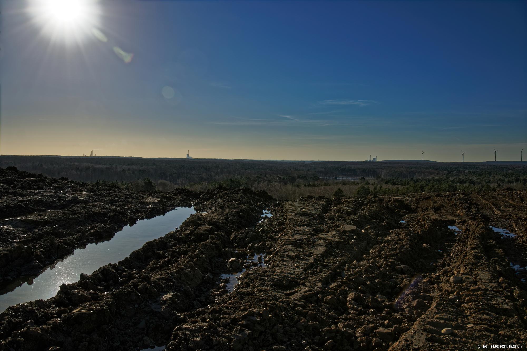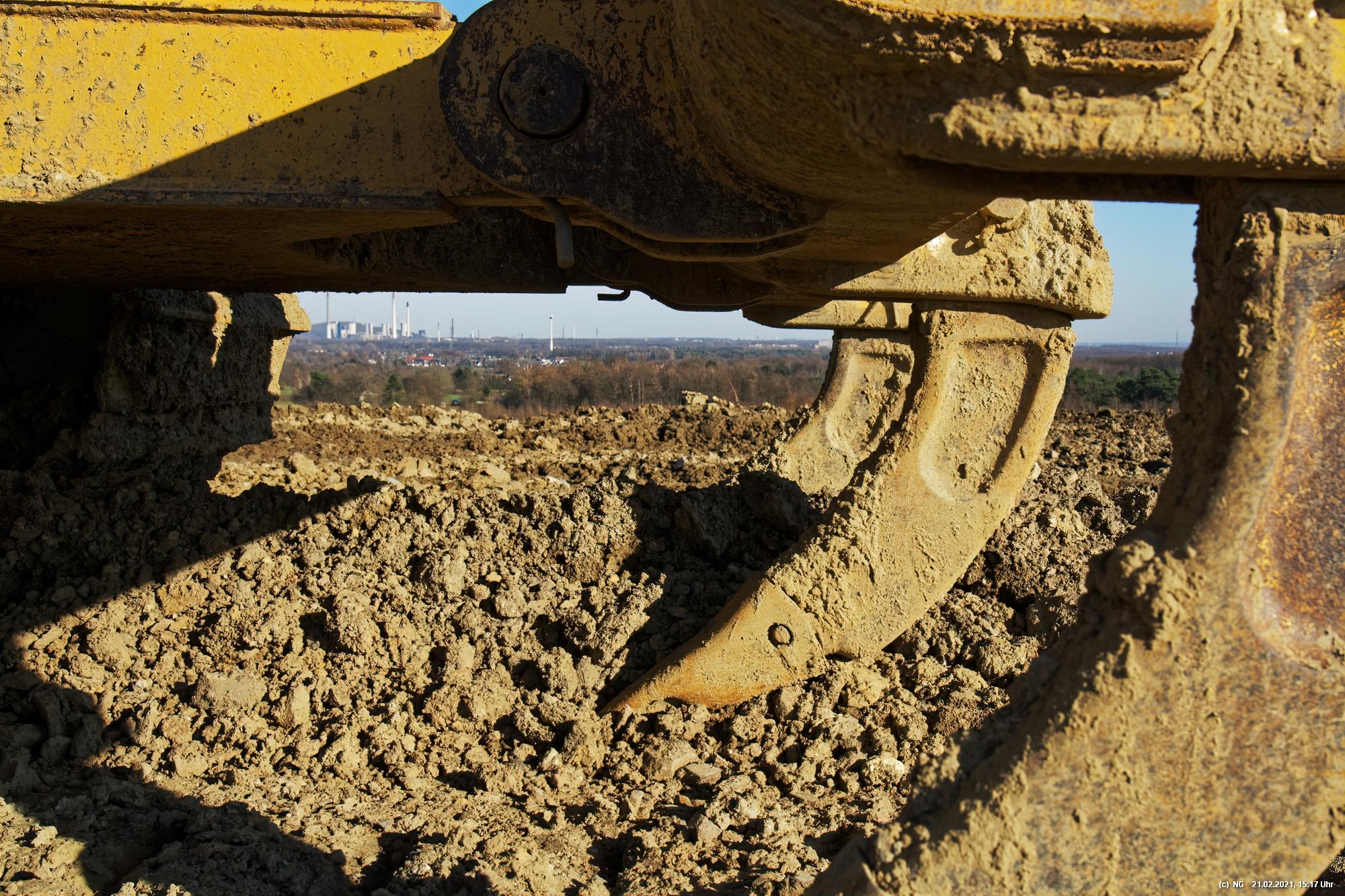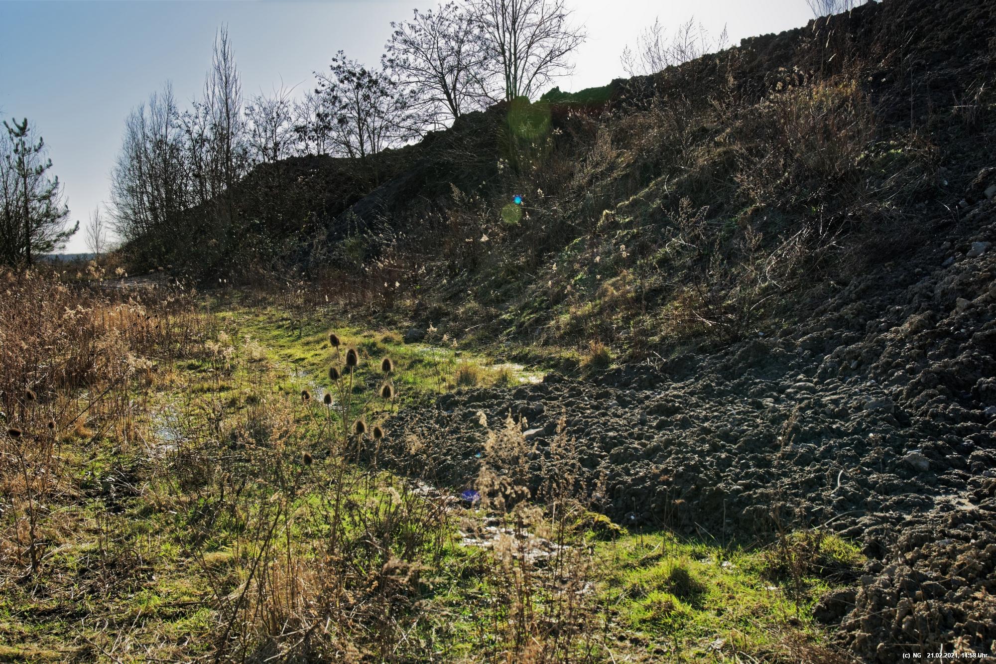 Soweit - so gut - so Wetter. Es war zwar eigentlich schön und die Temperatur war bestens, aber wir hatten ja kurz vorher gerade Schnee und viele LKW's, die den Boden ordentlich durchgepflügt haben. Kurz gesagt: Es war alles Matsche. Der Aufstieg auf die Halde war ein ständiges Suchen nach Stellen, die einen halbwegs sicheren Stand versprachen. Oben hatte ich dann aber eine ungestörte Sicht über das grüne Ruhrgebiet mit Kraftwerken und Halden im Hintergrund.