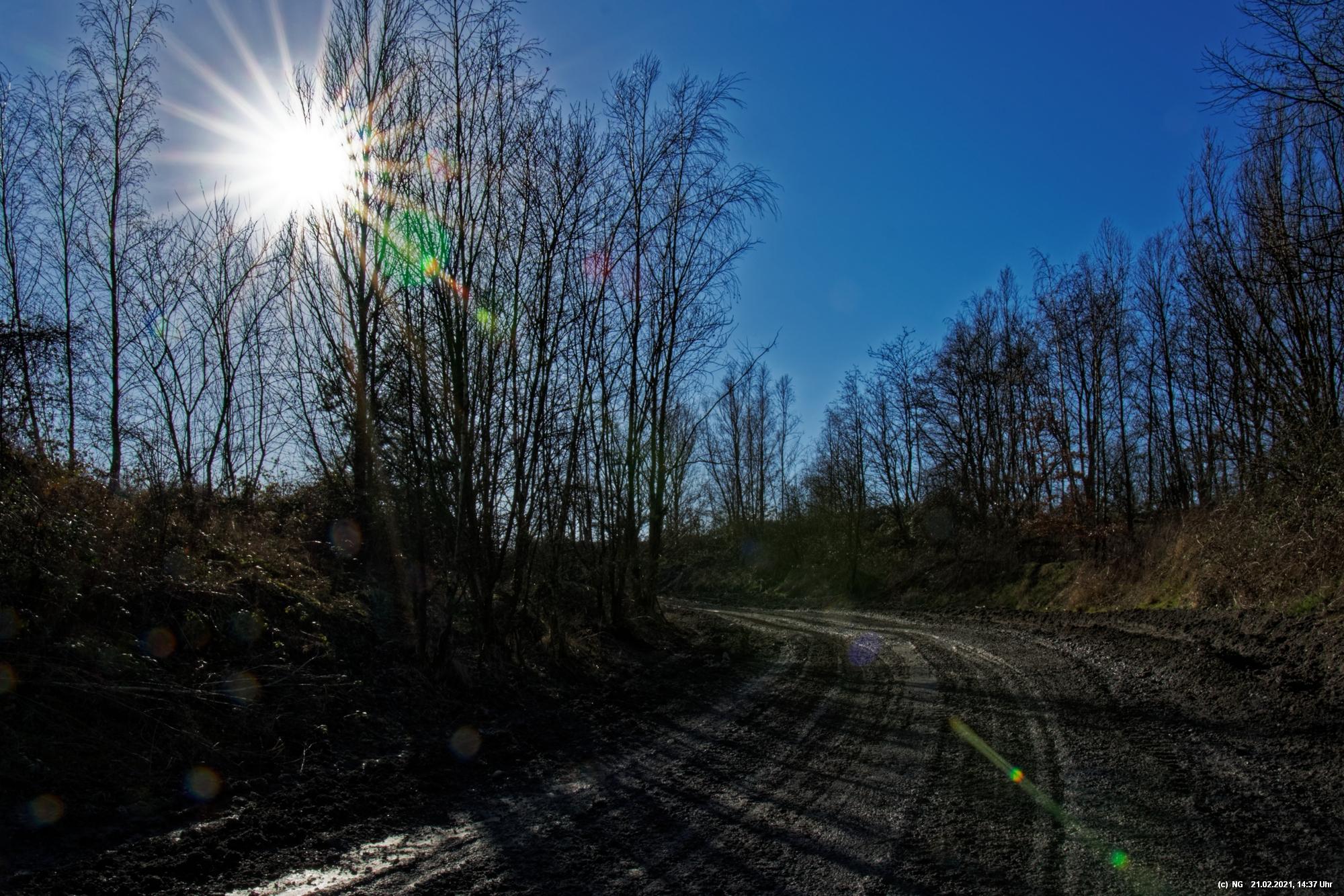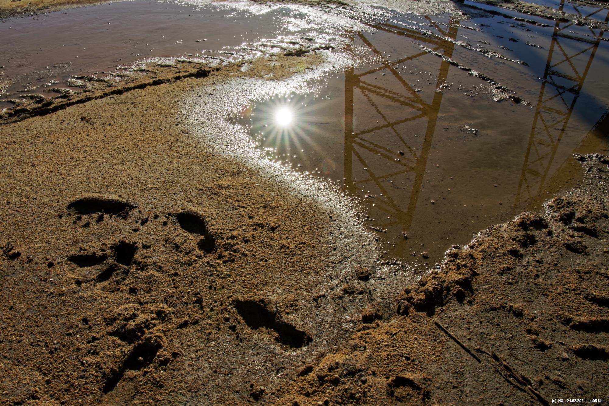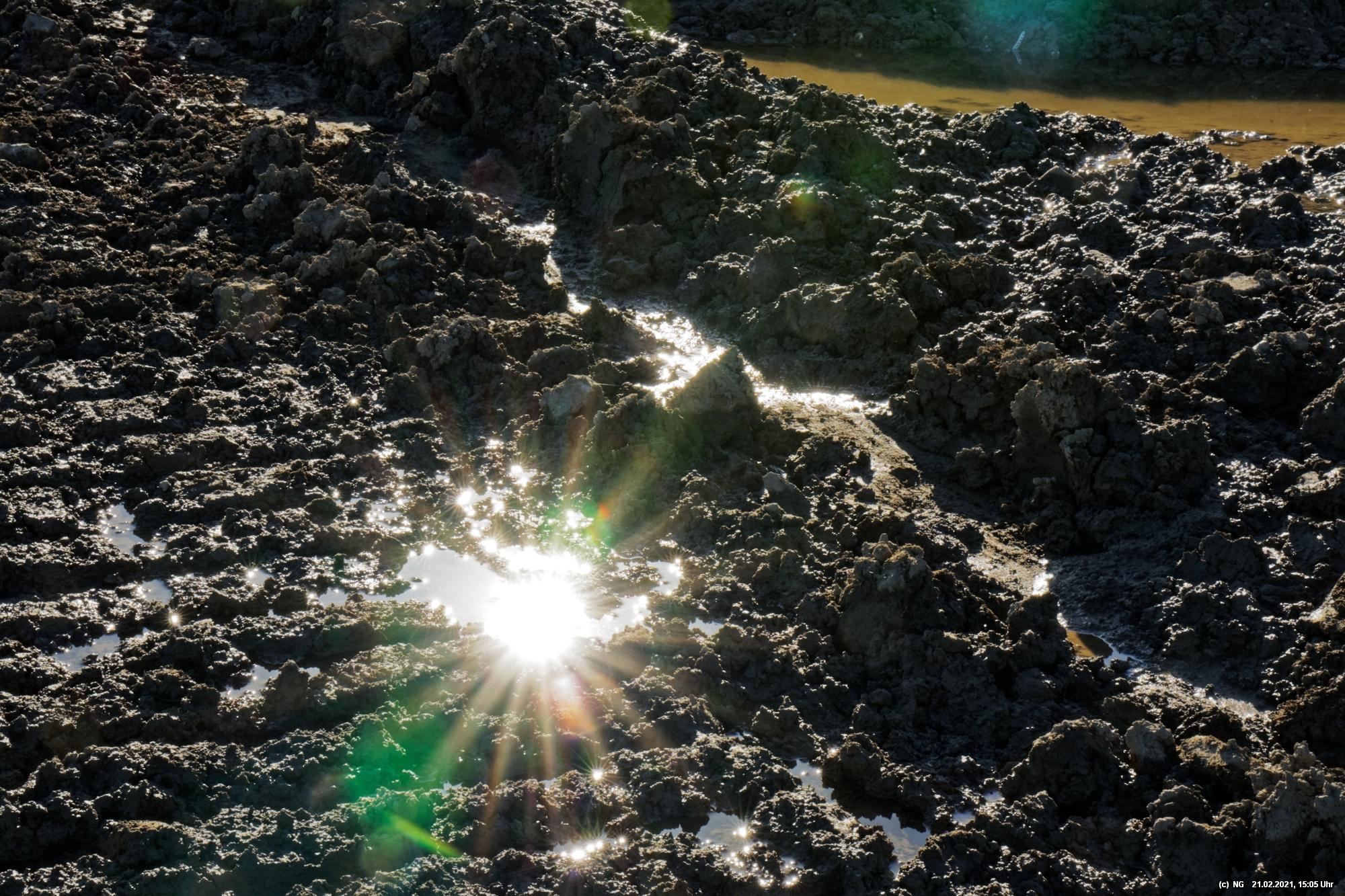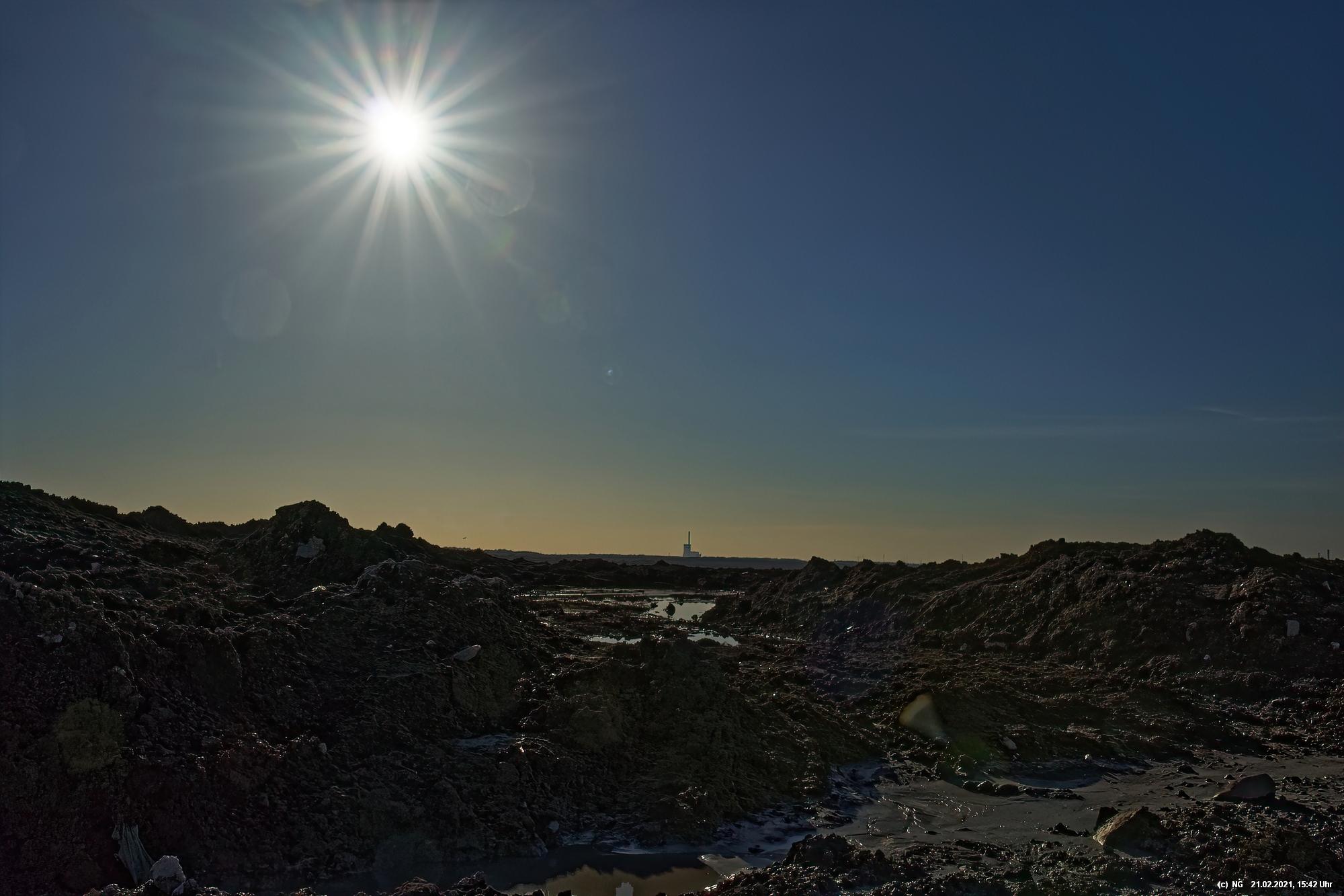 Soweit - so gut - so Wetter. Es war zwar eigentlich schön und die Temperatur war bestens, aber wir hatten ja kurz vorher gerade Schnee und viele LKW's, die den Boden ordentlich durchgepflügt haben. Kurz gesagt: Es war alles Matsche. Der Aufstieg auf die Halde war ein ständiges Suchen nach Stellen, die einen halbwegs sicheren Stand versprachen. Oben hatte ich dann aber eine ungestörte Sicht über das grüne Ruhrgebiet mit Kraftwerken und Halden im Hintergrund.