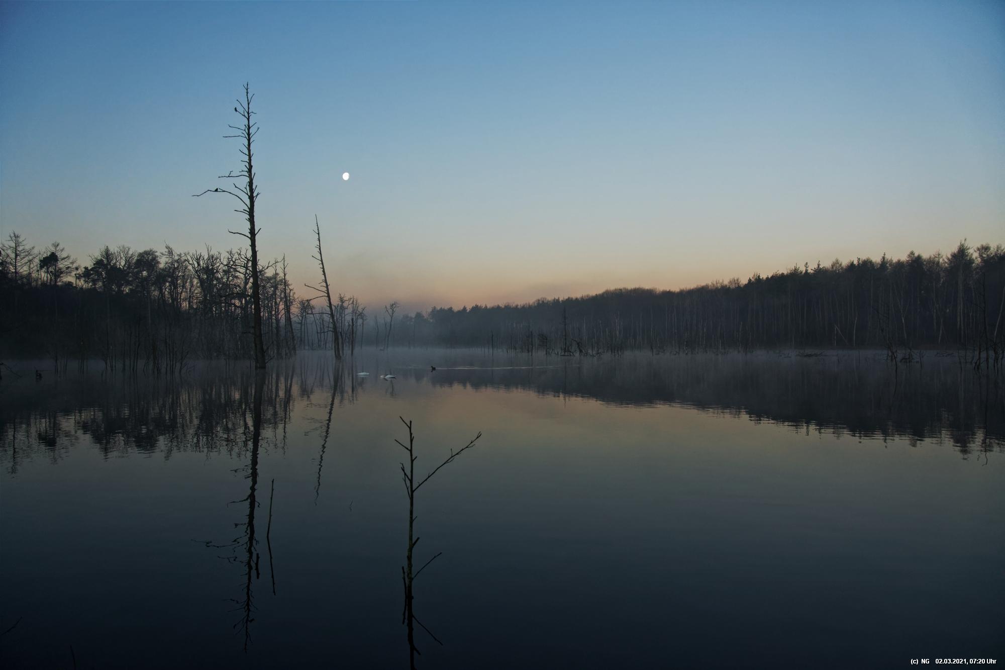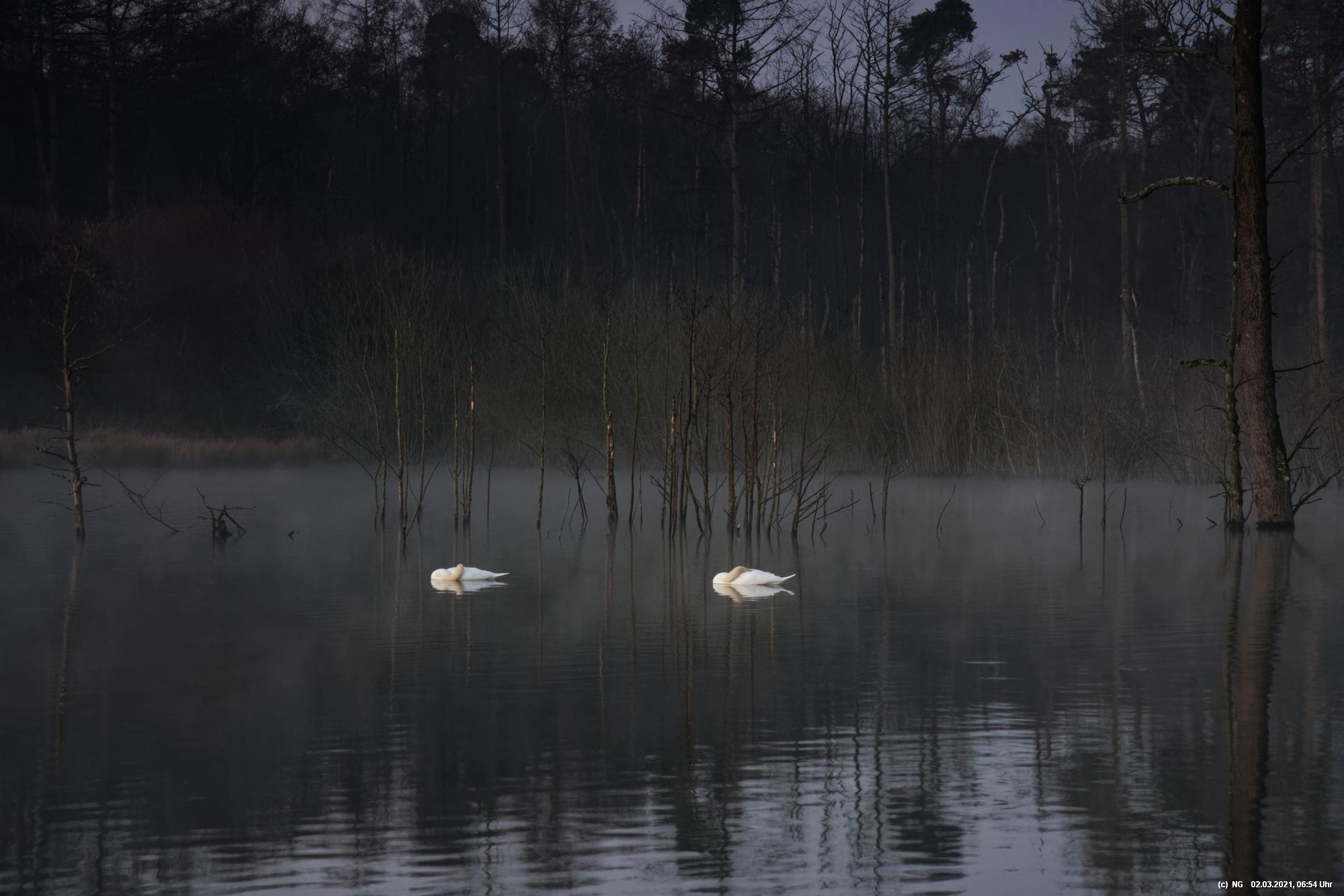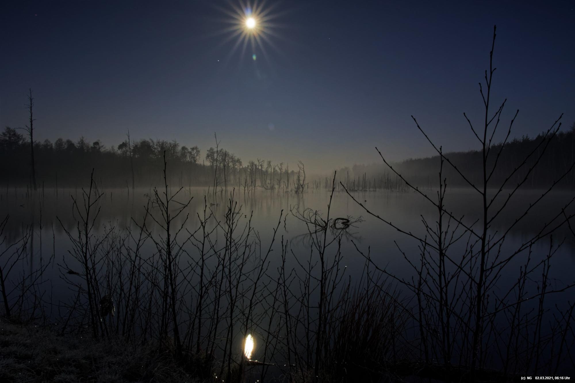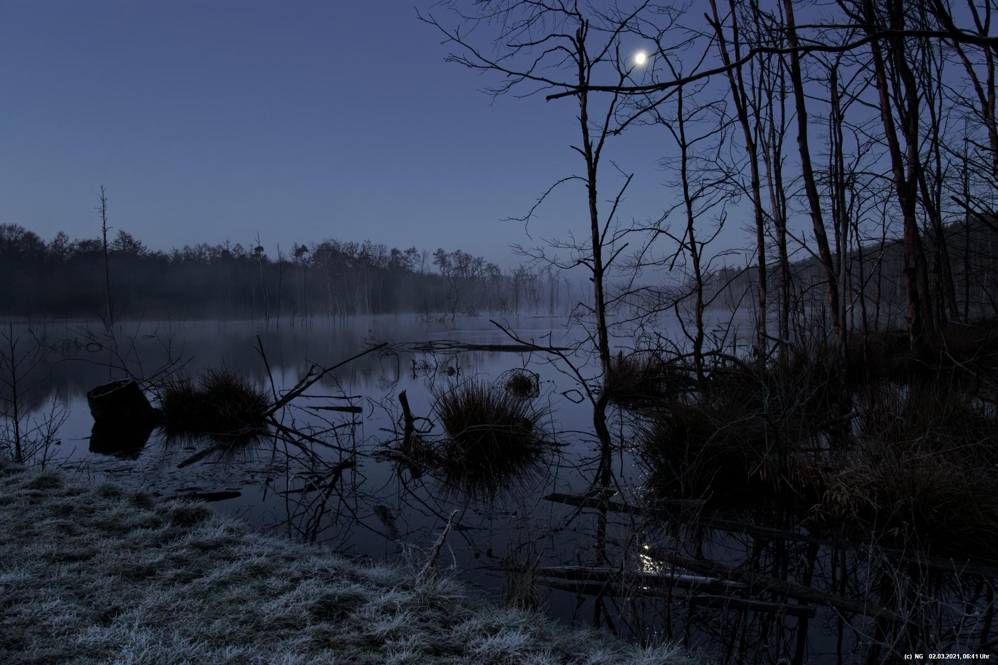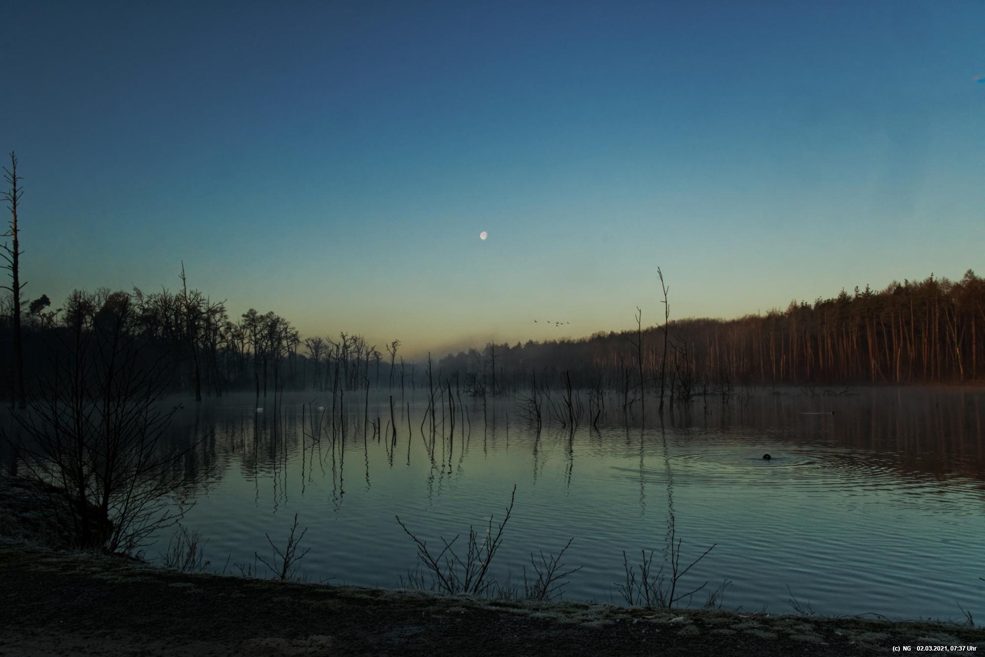 Der See ist spektakulär und für mich ein einzigartiger Ort, der im weitem Umkreis seinesgleichen sucht. Heute kam alles zusammen: Es war dunkel, aber im süd-westlichen Teil stand noch etwa 3/4-Mond und spendete bei wolkenfreiem Himmel viel Licht. Bei Temperaturen um den Gefrierpunkt entwickelten sich wandernde Nebel. Auf der anderen Seite ging dann die Sonne auf und so sah ich 2 unterschiedliche Welten links und rechts des Weges. Die Tiere erwachten und nacheinander lieferten sie ein Spektakel.