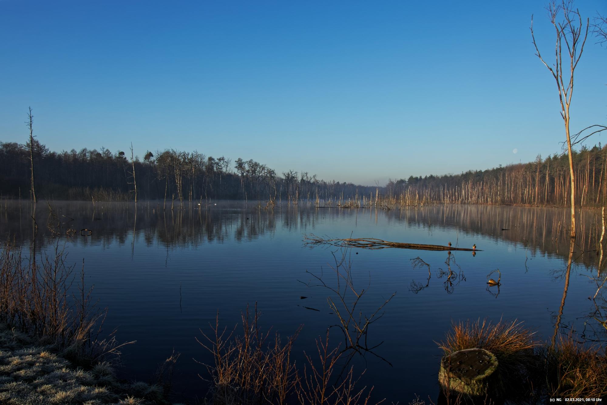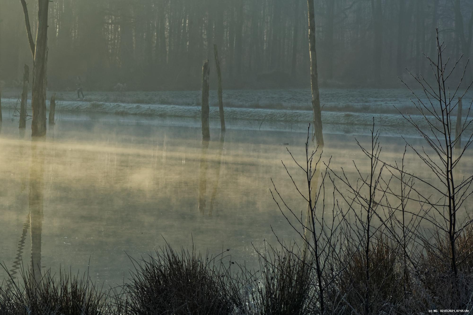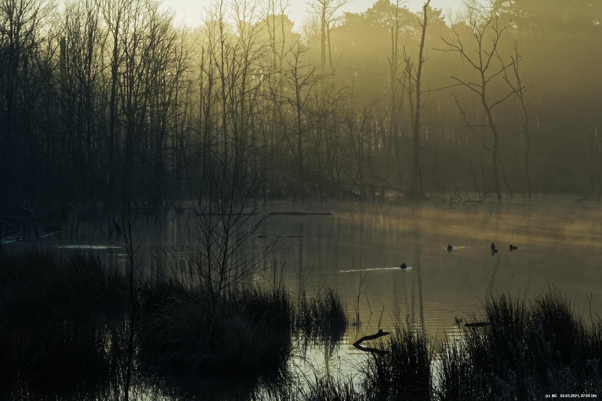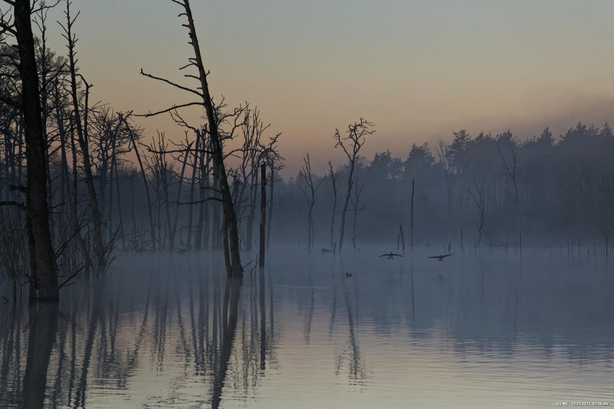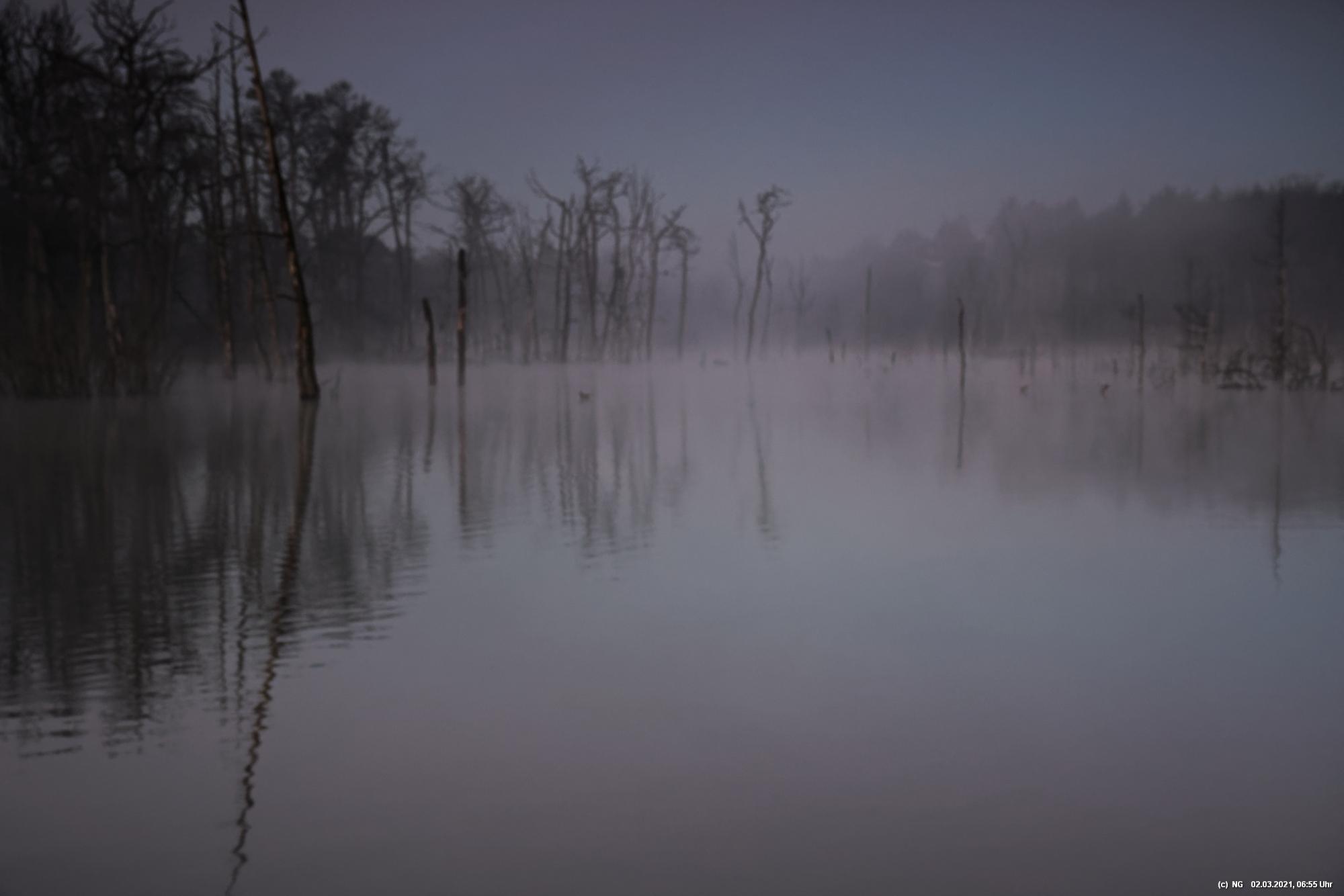 Der See ist spektakulär und für mich ein einzigartiger Ort, der im weitem Umkreis seinesgleichen sucht. Heute kam alles zusammen: Es war dunkel, aber im süd-westlichen Teil stand noch etwa 3/4-Mond und spendete bei wolkenfreiem Himmel viel Licht. Bei Temperaturen um den Gefrierpunkt entwickelten sich wandernde Nebel. Auf der anderen Seite ging dann die Sonne auf und so sah ich 2 unterschiedliche Welten links und rechts des Weges. Die Tiere erwachten und nacheinander lieferten sie ein Spektakel.