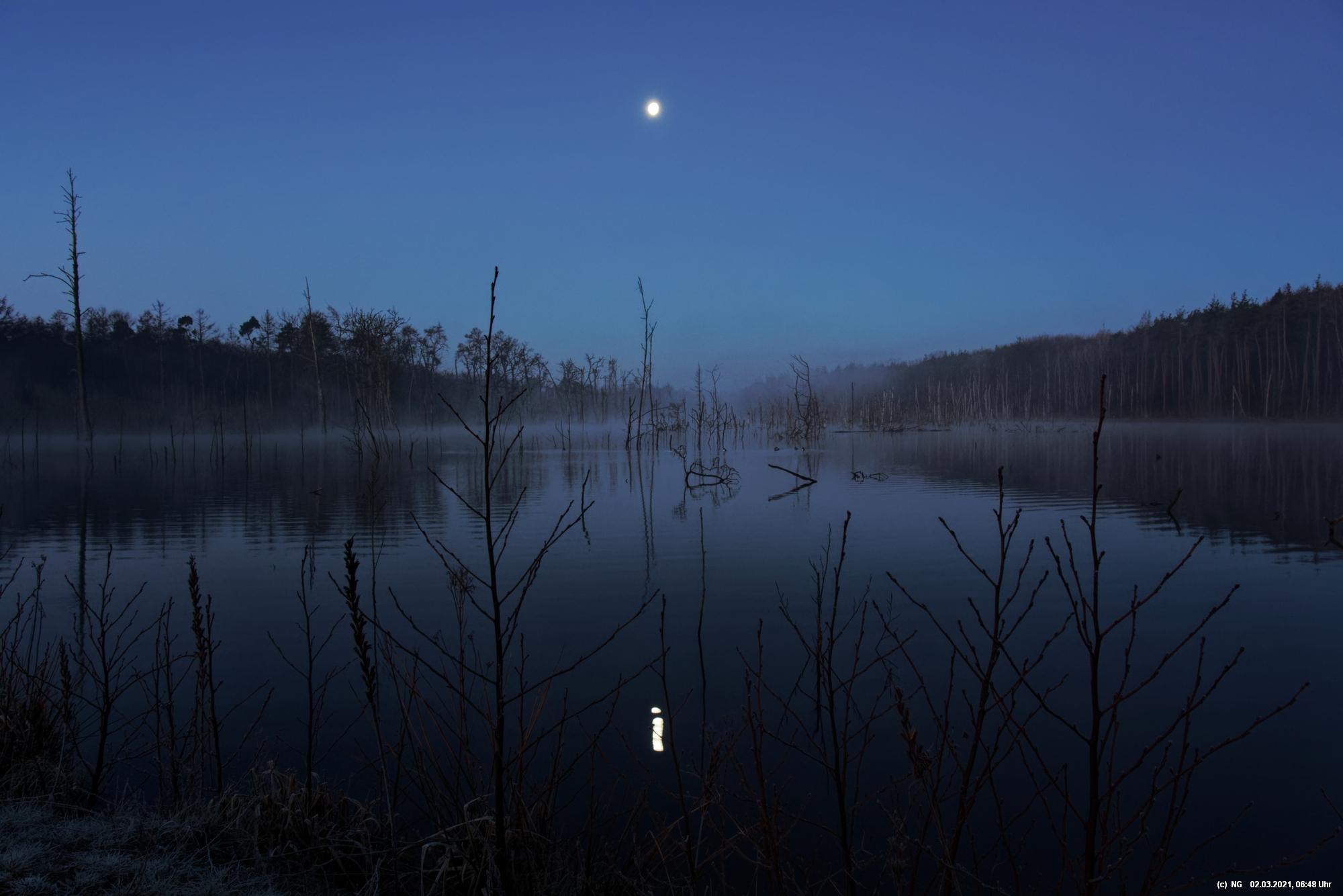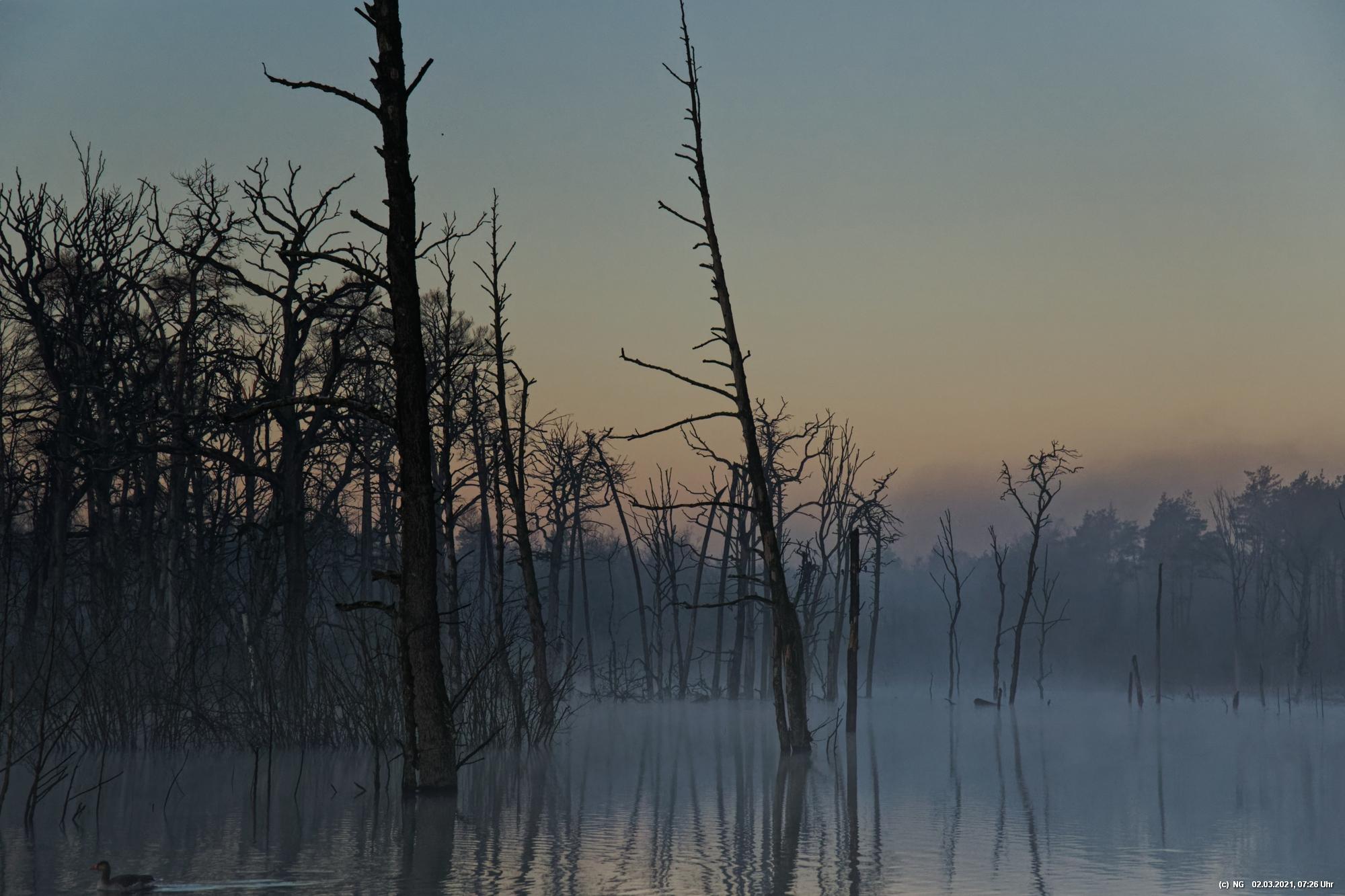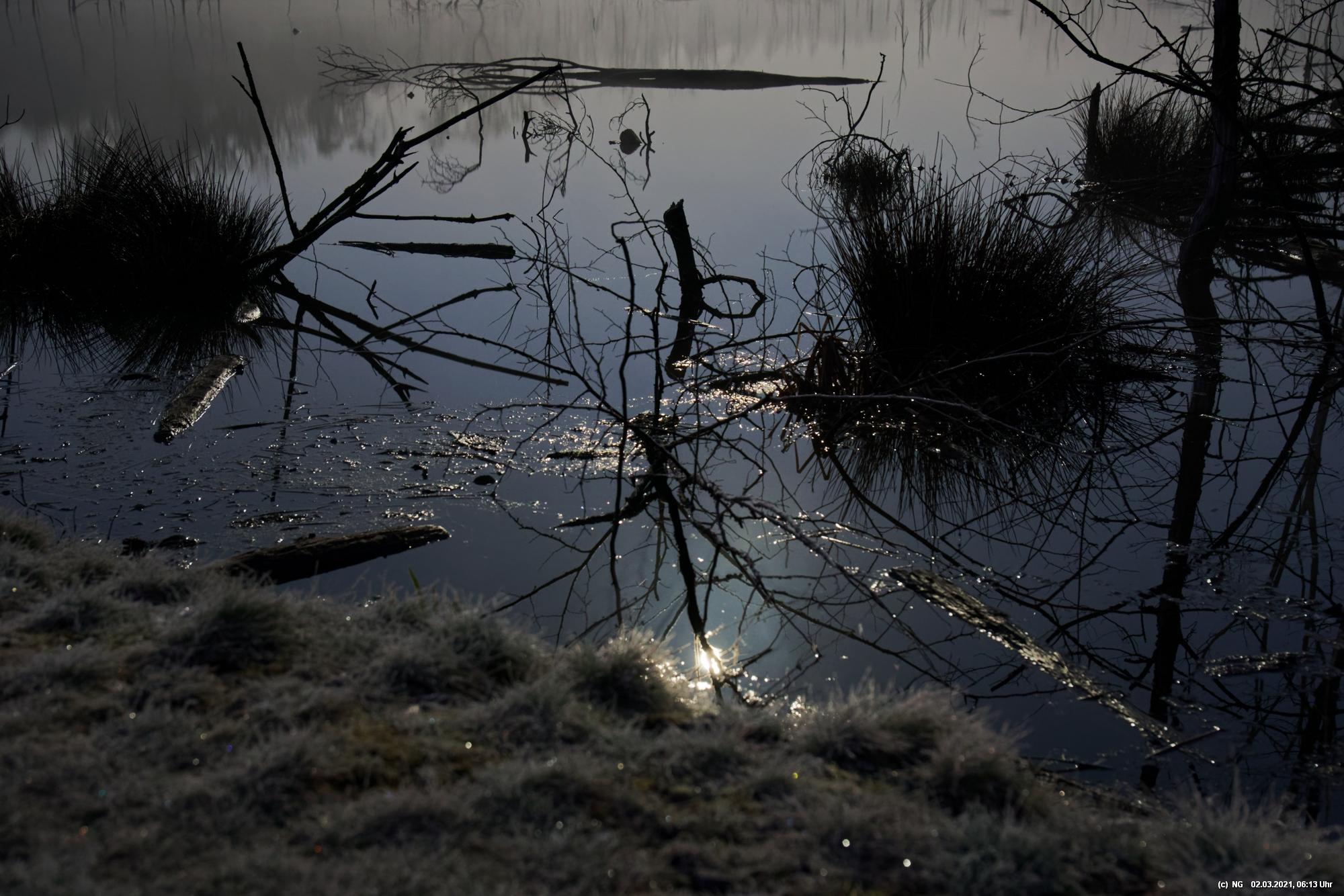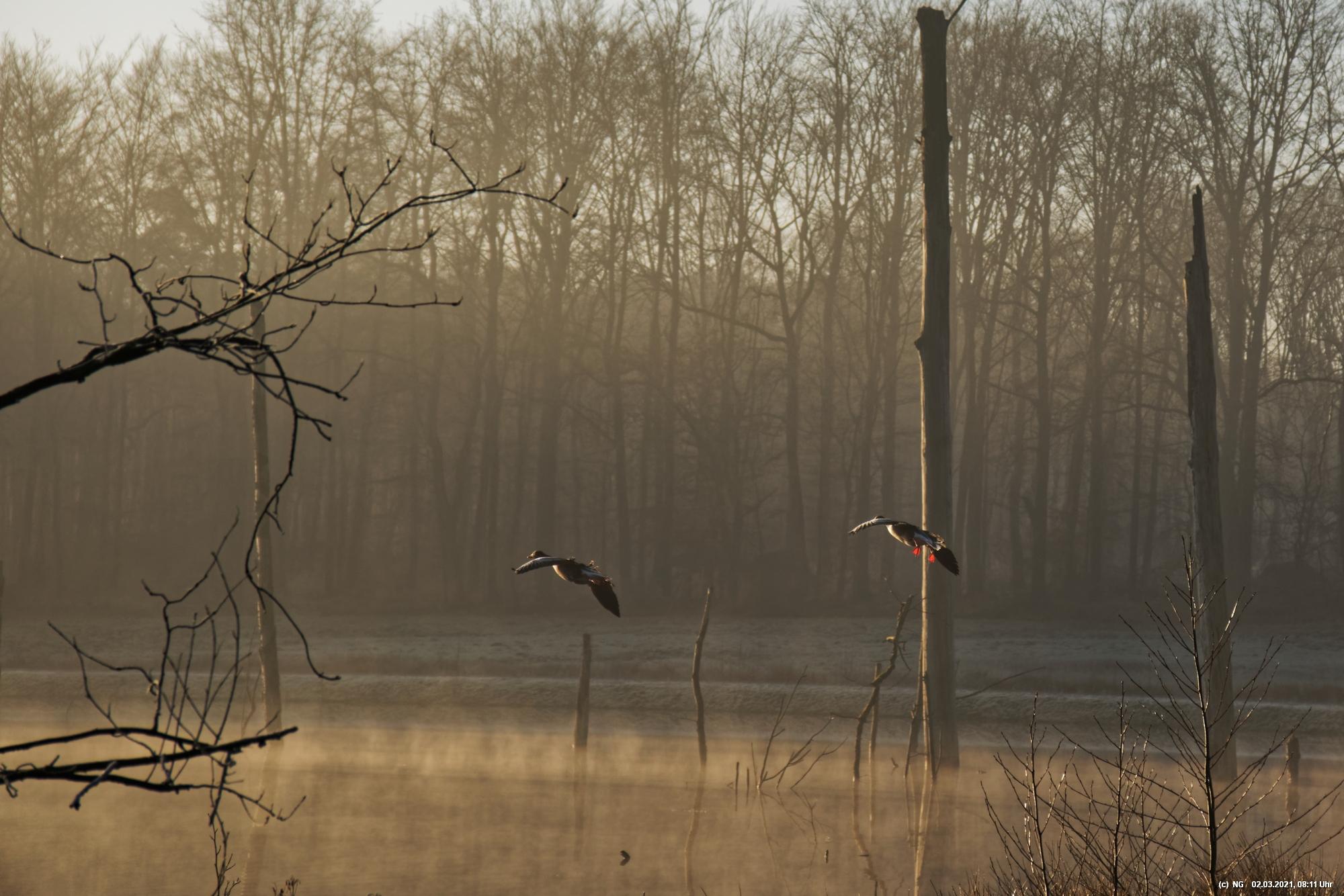 Der See ist spektakulär und für mich ein einzigartiger Ort, der im weitem Umkreis seinesgleichen sucht. Heute kam alles zusammen: Es war dunkel, aber im süd-westlichen Teil stand noch etwa 3/4-Mond und spendete bei wolkenfreiem Himmel viel Licht. Bei Temperaturen um den Gefrierpunkt entwickelten sich wandernde Nebel. Auf der anderen Seite ging dann die Sonne auf und so sah ich 2 unterschiedliche Welten links und rechts des Weges. Die Tiere erwachten und nacheinander lieferten sie ein Spektakel.