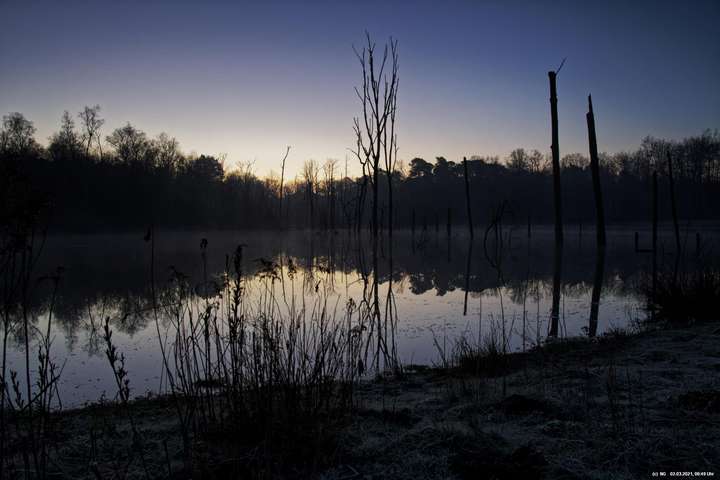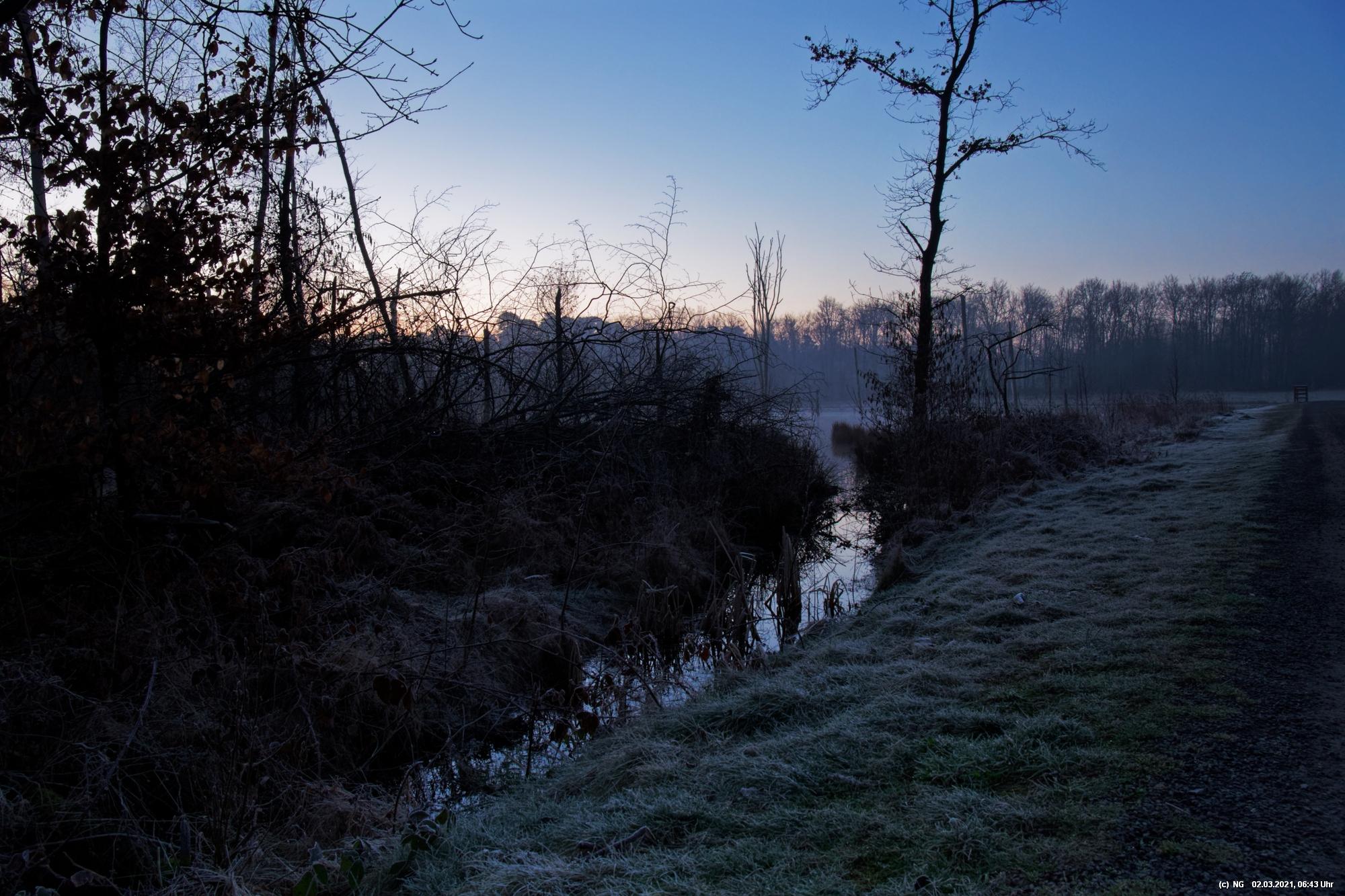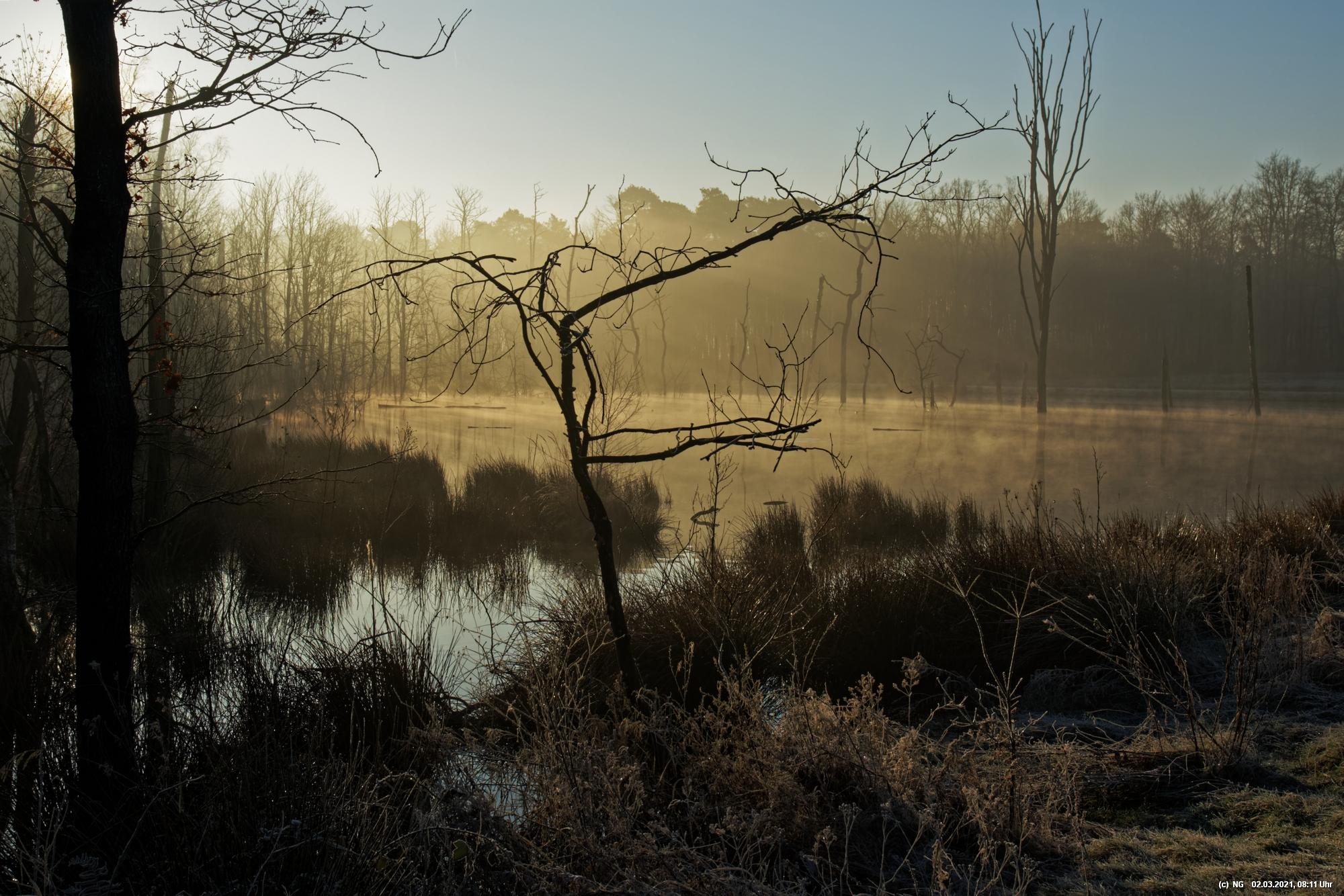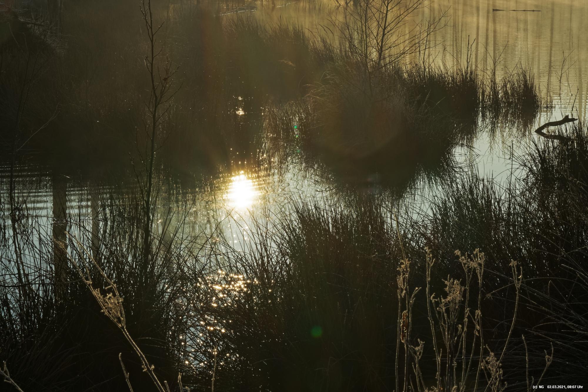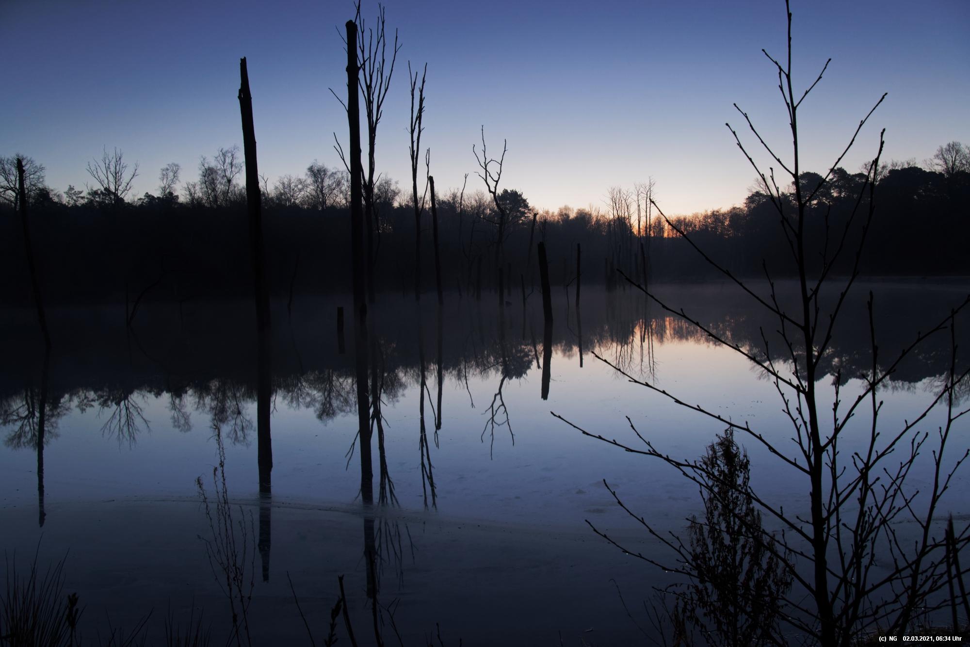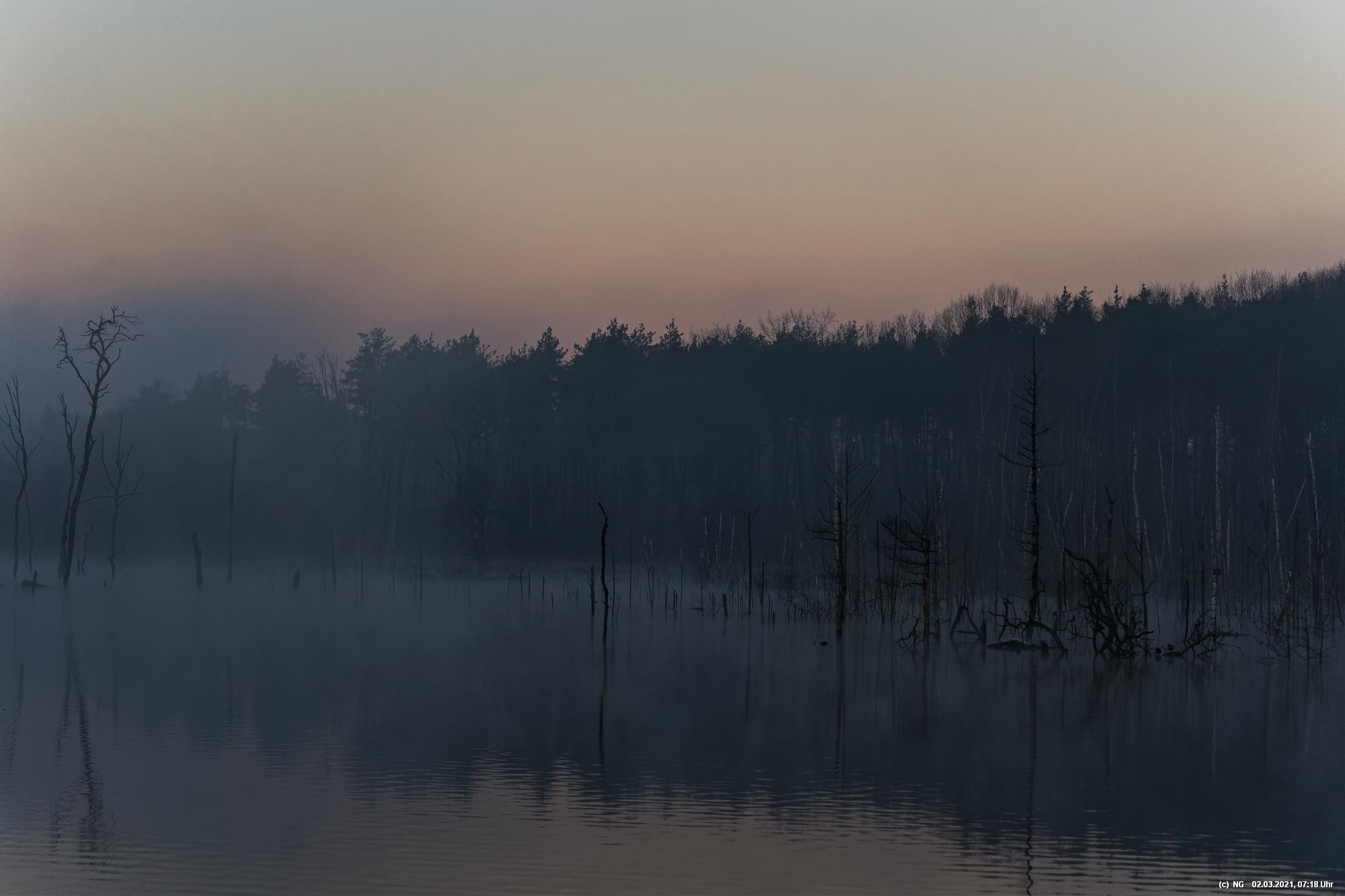 Der See ist spektakulär und für mich ein einzigartiger Ort, der im weitem Umkreis seinesgleichen sucht. Heute kam alles zusammen: Es war dunkel, aber im süd-westlichen Teil stand noch etwa 3/4-Mond und spendete bei wolkenfreiem Himmel viel Licht. Bei Temperaturen um den Gefrierpunkt entwickelten sich wandernde Nebel. Auf der anderen Seite ging dann die Sonne auf und so sah ich 2 unterschiedliche Welten links und rechts des Weges. Die Tiere erwachten und nacheinander lieferten sie ein Spektakel.