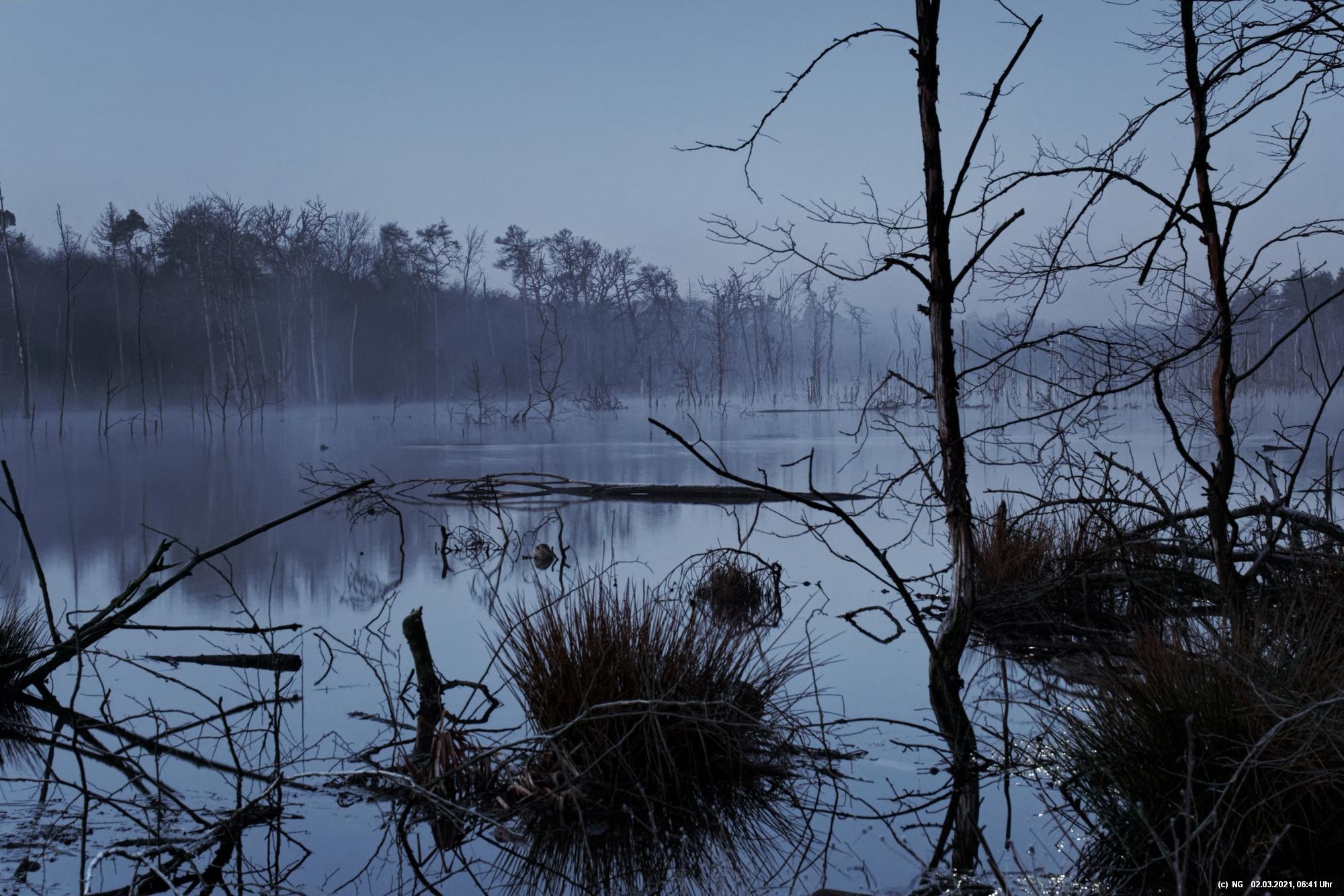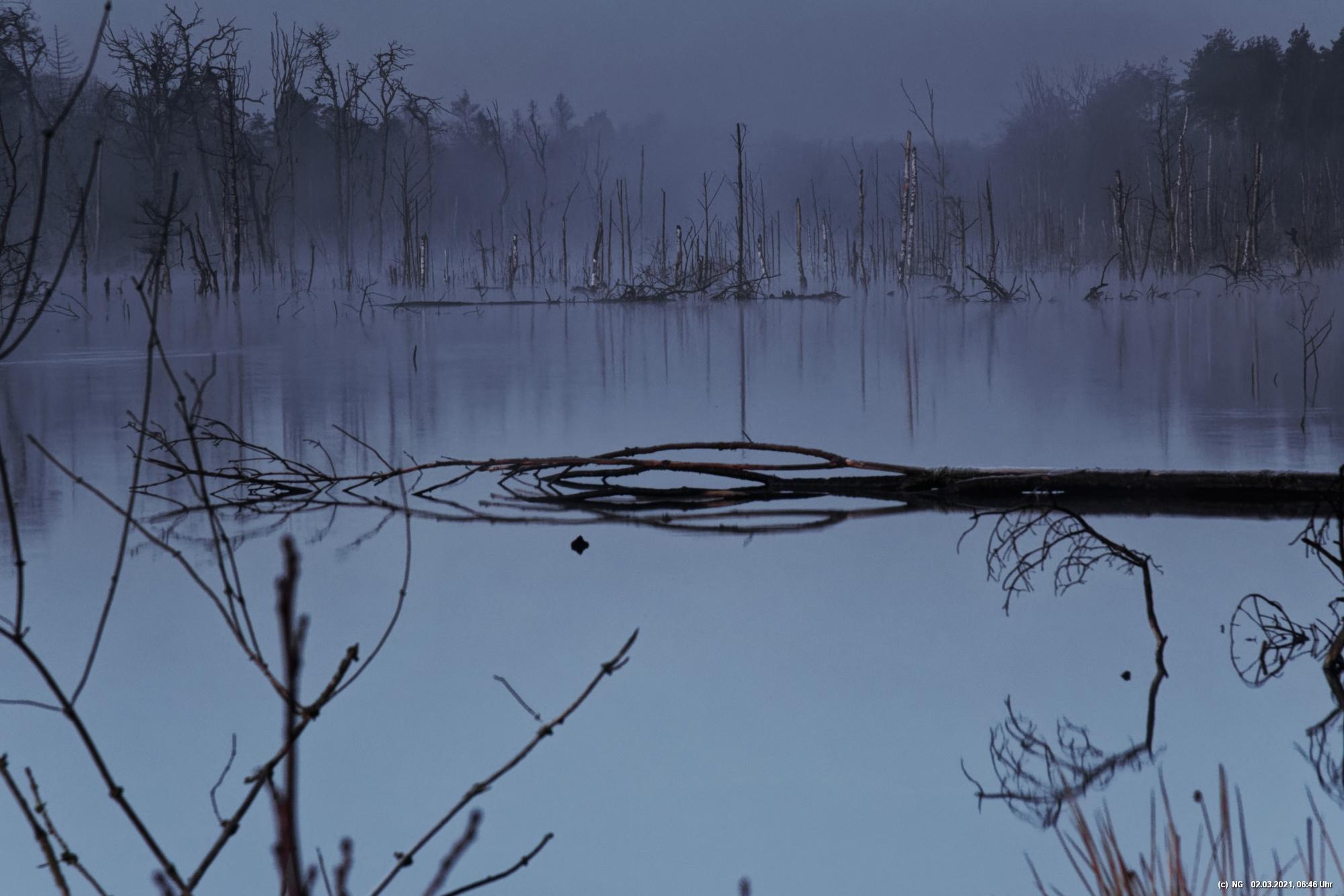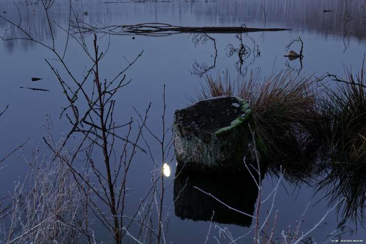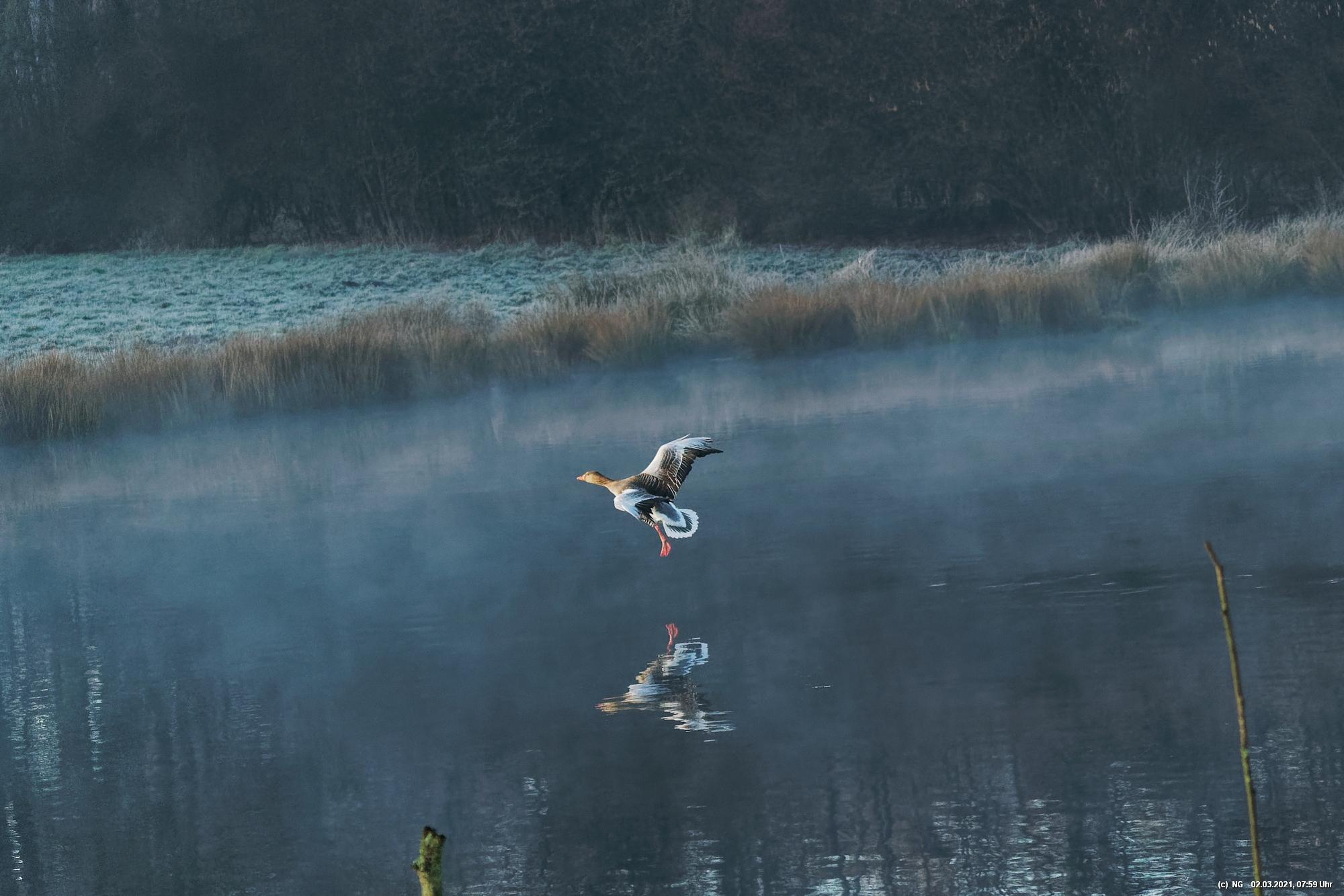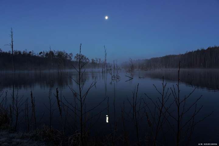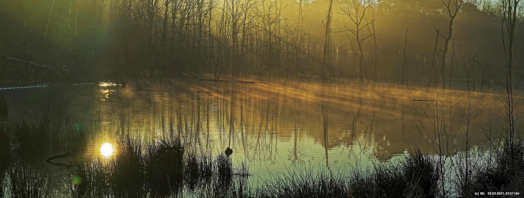 Der See ist spektakulär und für mich ein einzigartiger Ort, der im weitem Umkreis seinesgleichen sucht. Heute kam alles zusammen: Es war dunkel, aber im süd-westlichen Teil stand noch etwa 3/4-Mond und spendete bei wolkenfreiem Himmel viel Licht. Bei Temperaturen um den Gefrierpunkt entwickelten sich wandernde Nebel. Auf der anderen Seite ging dann die Sonne auf und so sah ich 2 unterschiedliche Welten links und rechts des Weges. Die Tiere erwachten und nacheinander lieferten sie ein Spektakel.