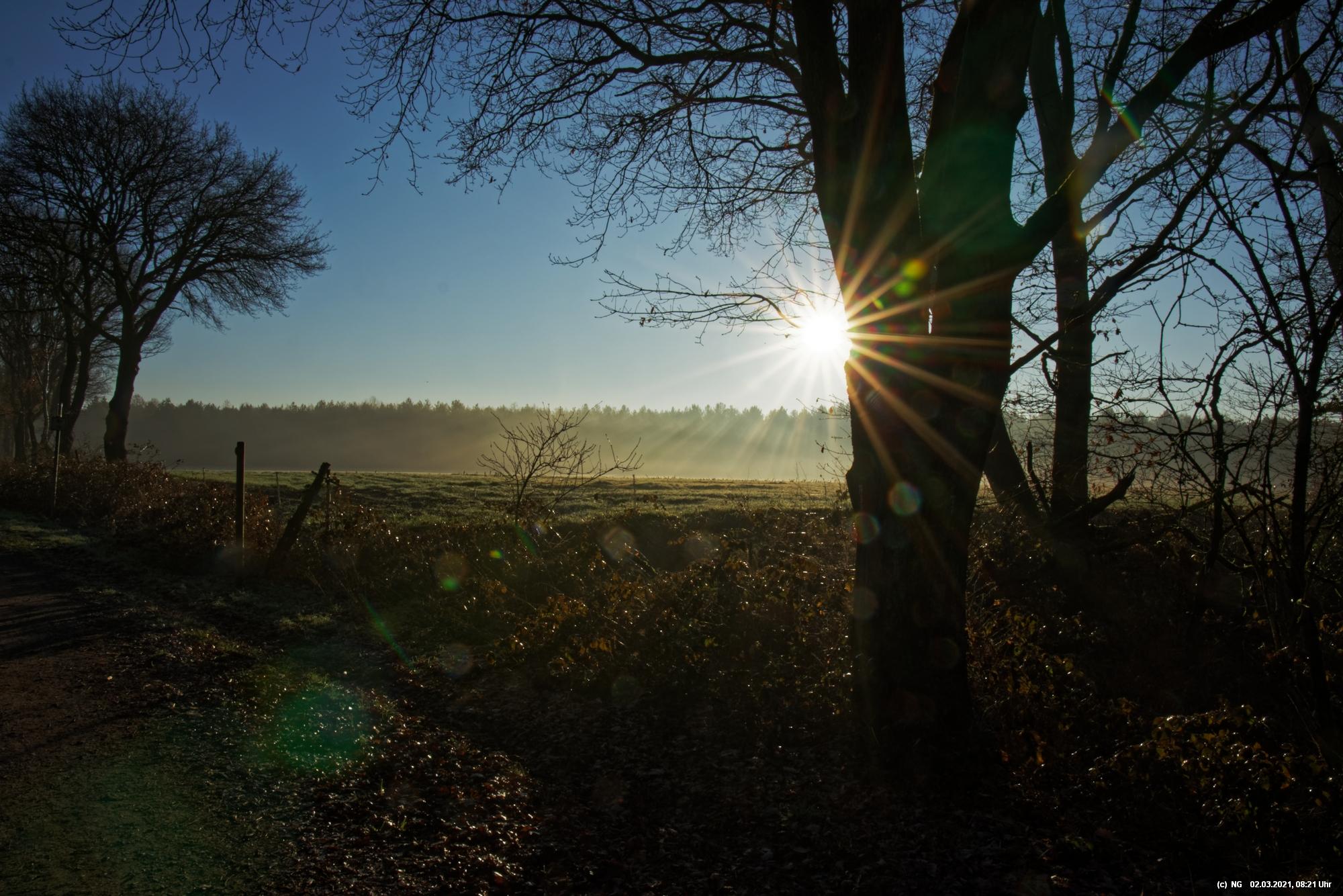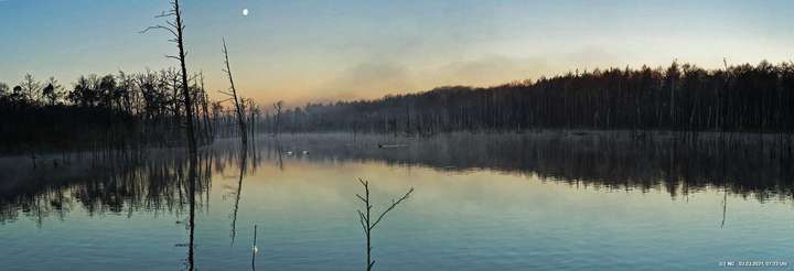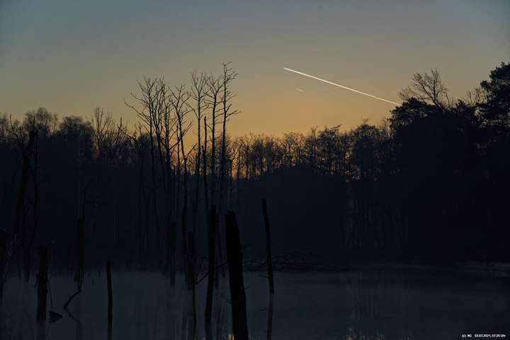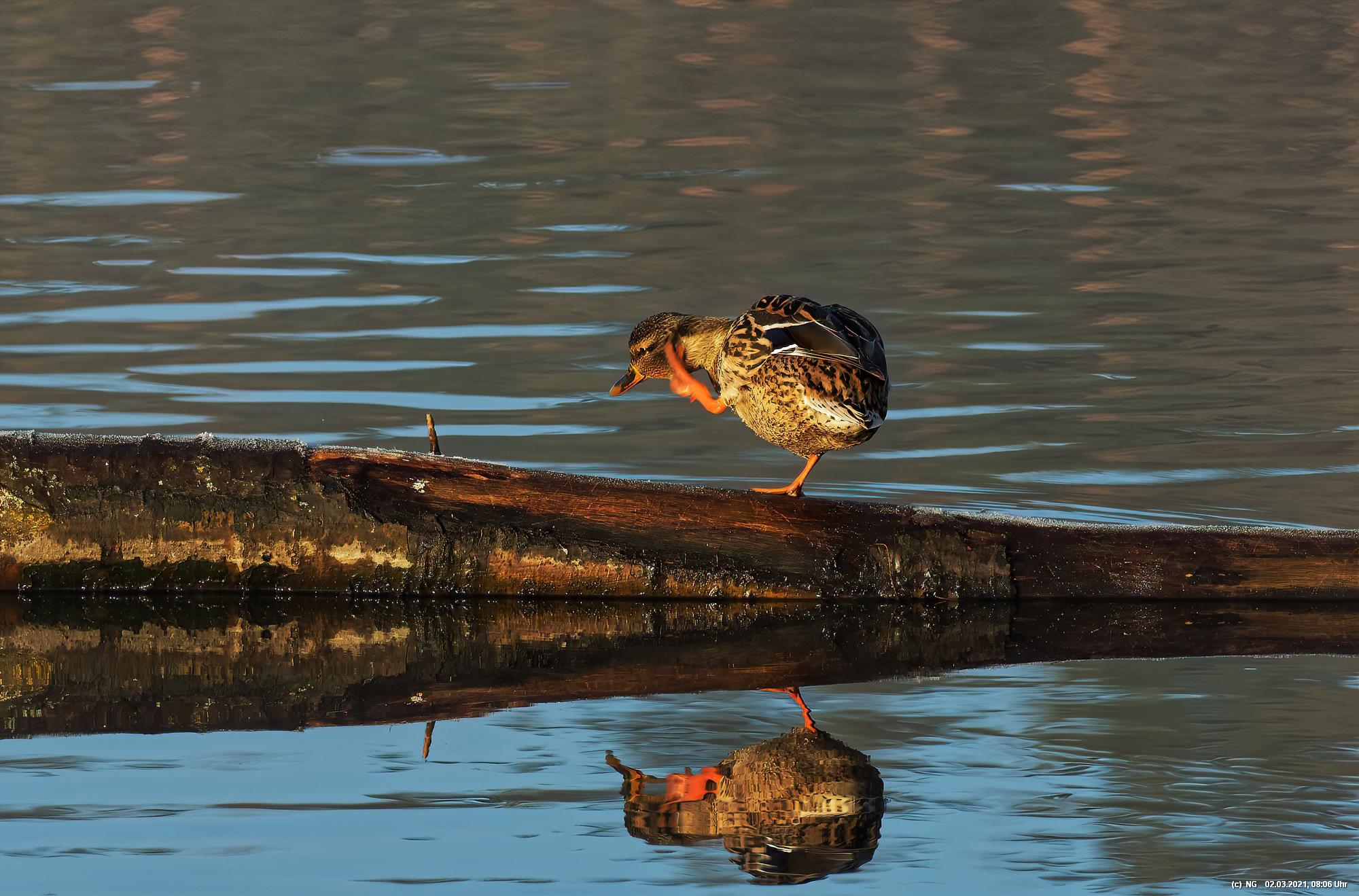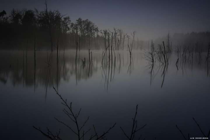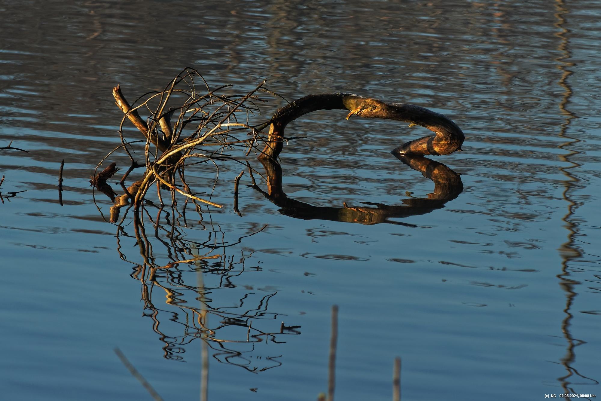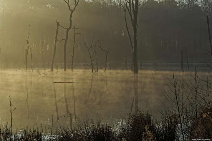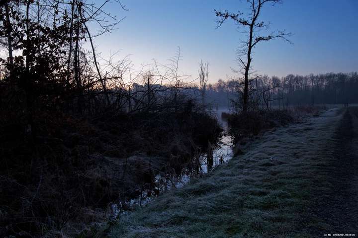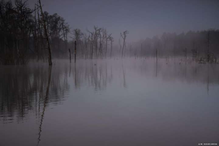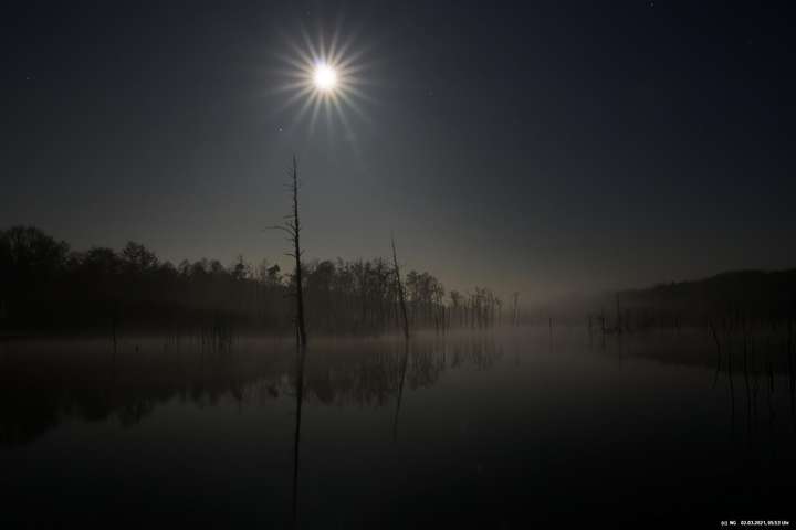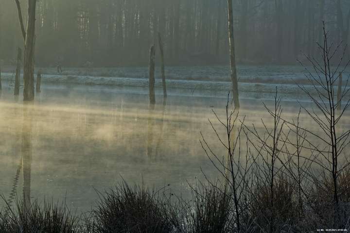 Der See ist spektakulär und für mich ein einzigartiger Ort, der im weitem Umkreis seinesgleichen sucht. Heute kam alles zusammen: Es war dunkel, aber im süd-westlichen Teil stand noch etwa 3/4-Mond und spendete bei wolkenfreiem Himmel viel Licht. Bei Temperaturen um den Gefrierpunkt entwickelten sich wandernde Nebel. Auf der anderen Seite ging dann die Sonne auf und so sah ich 2 unterschiedliche Welten links und rechts des Weges. Die Tiere erwachten und nacheinander lieferten sie ein Spektakel.