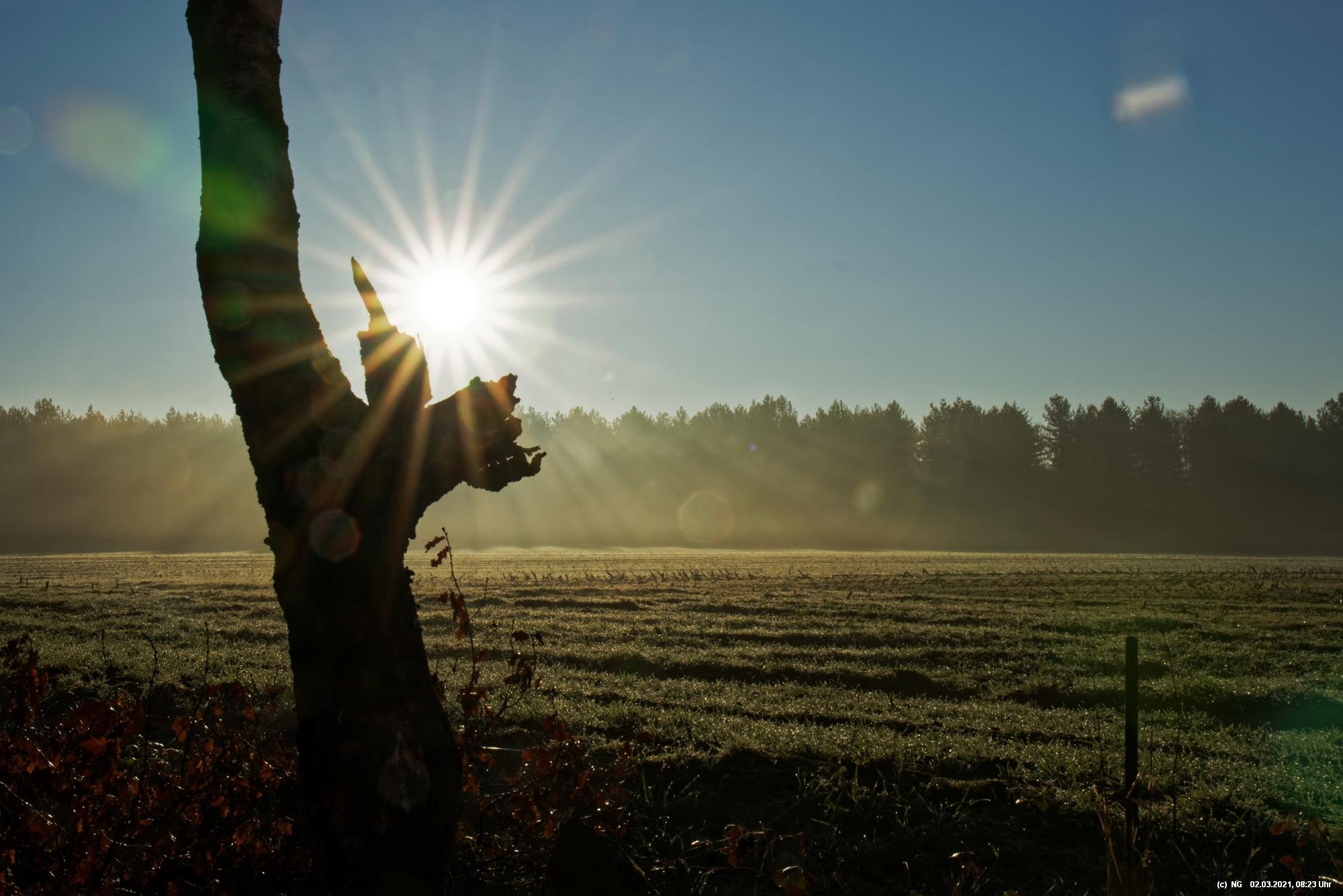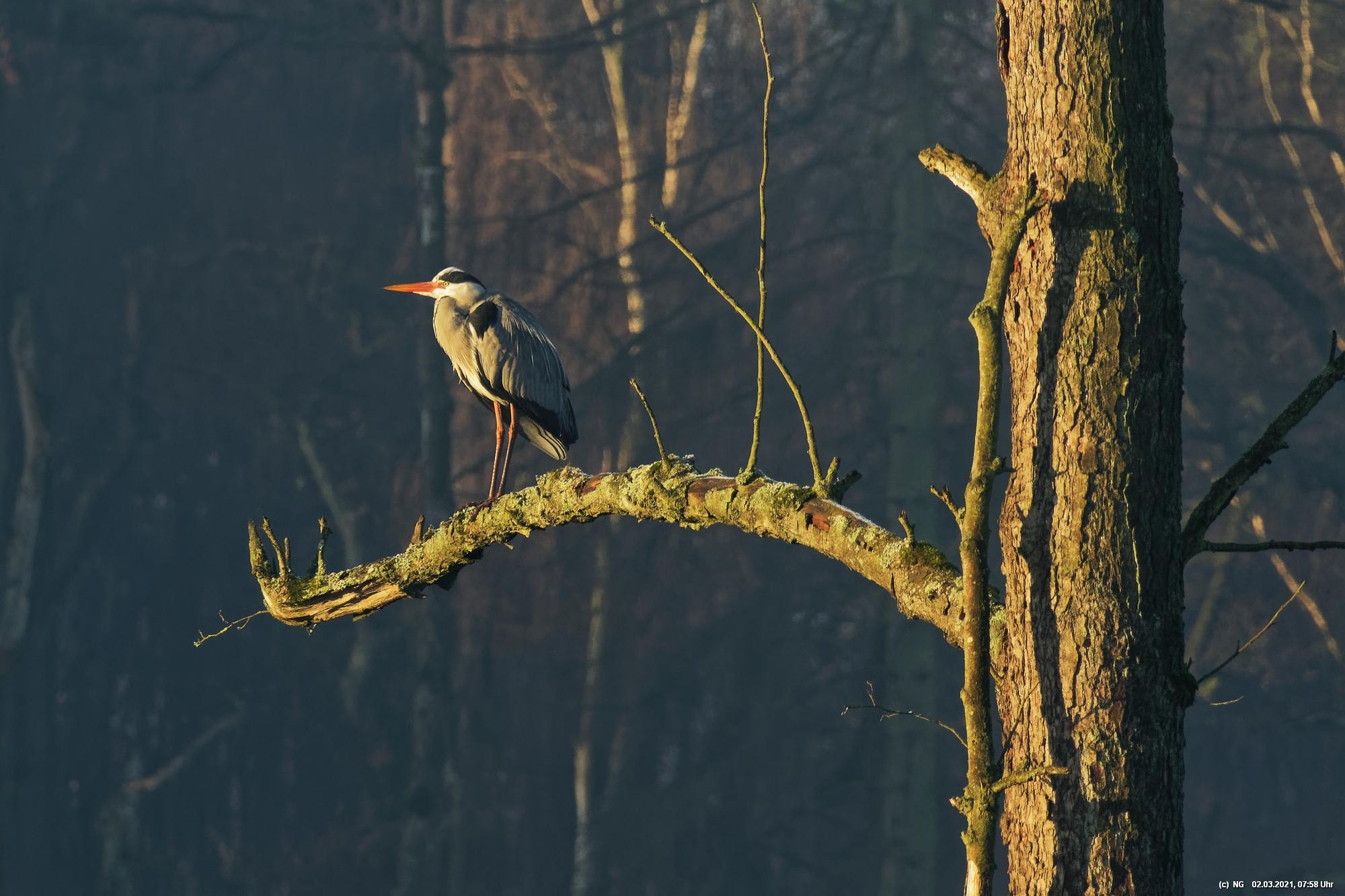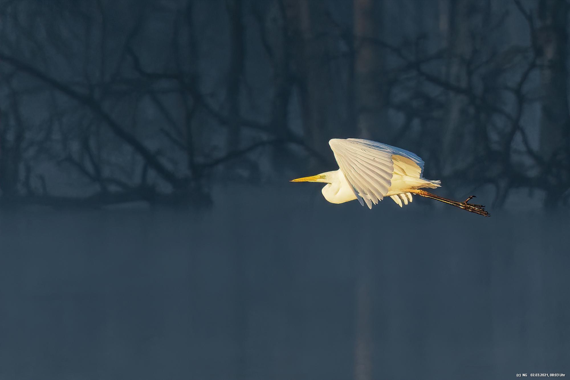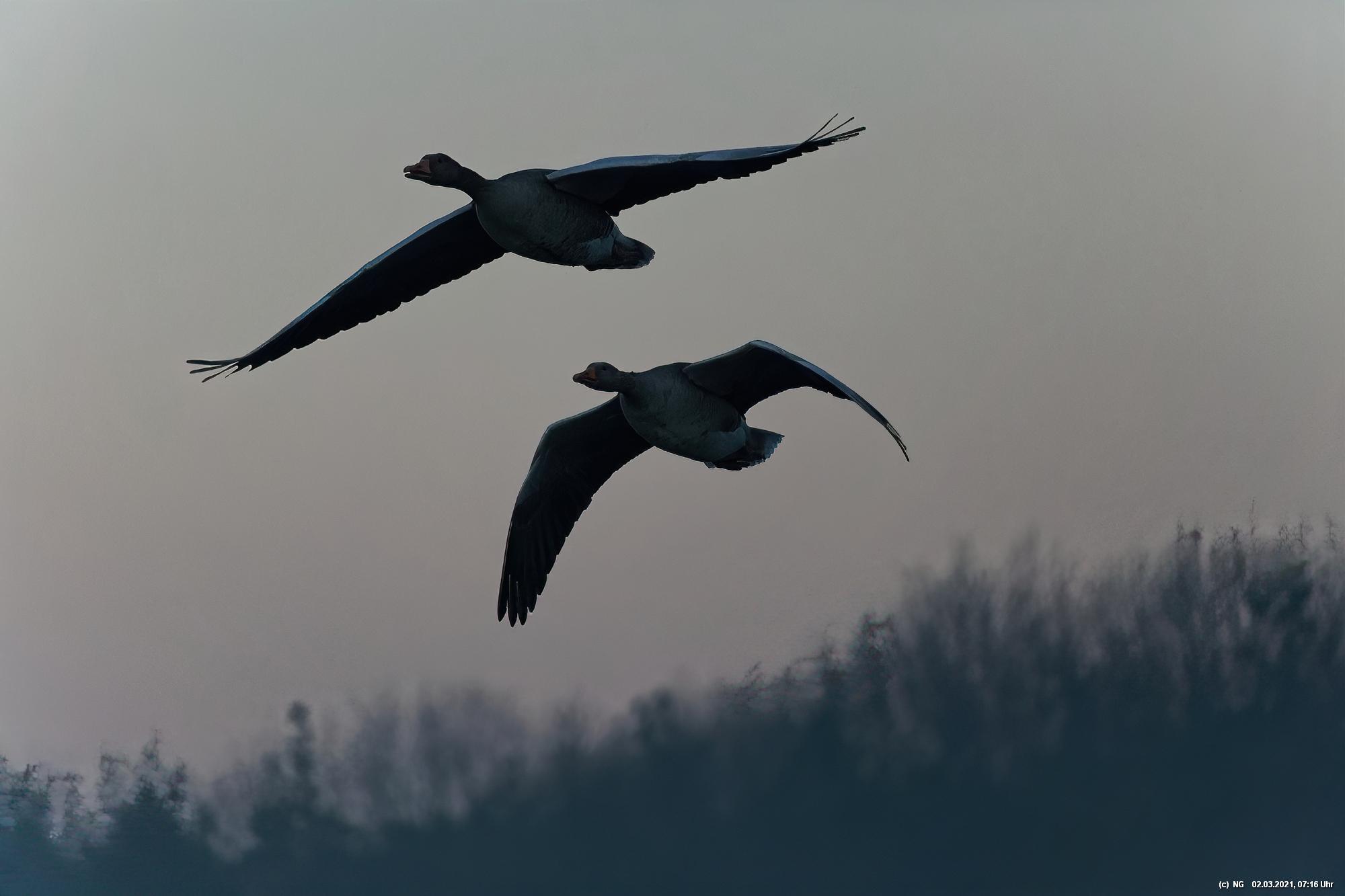 Der See ist spektakulär und für mich ein einzigartiger Ort, der im weitem Umkreis seinesgleichen sucht. Heute kam alles zusammen: Es war dunkel, aber im süd-westlichen Teil stand noch etwa 3/4-Mond und spendete bei wolkenfreiem Himmel viel Licht. Bei Temperaturen um den Gefrierpunkt entwickelten sich wandernde Nebel. Auf der anderen Seite ging dann die Sonne auf und so sah ich 2 unterschiedliche Welten links und rechts des Weges. Die Tiere erwachten und nacheinander lieferten sie ein Spektakel.