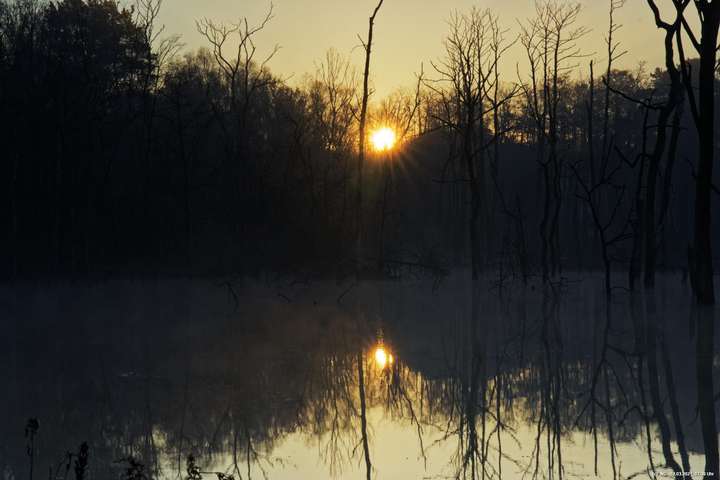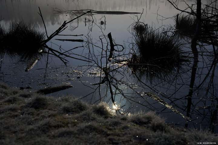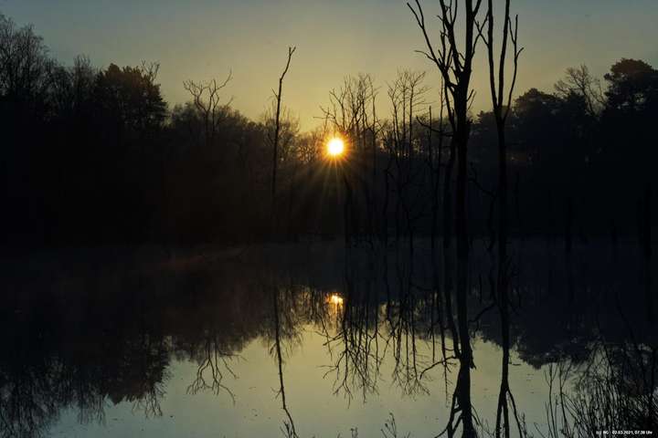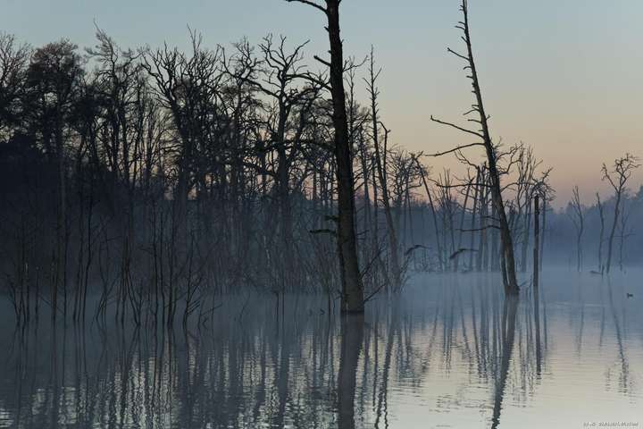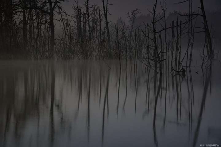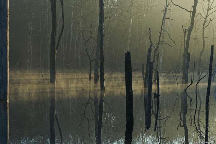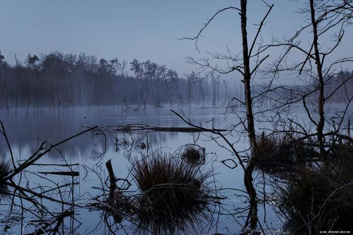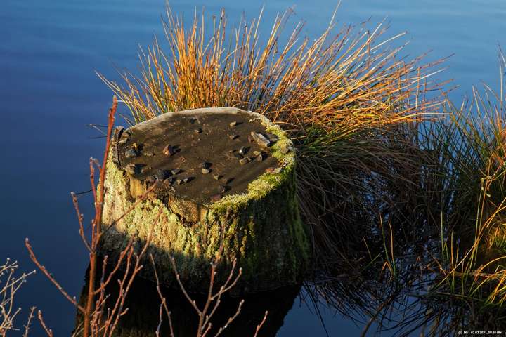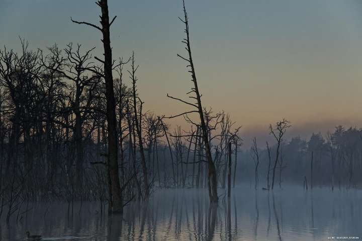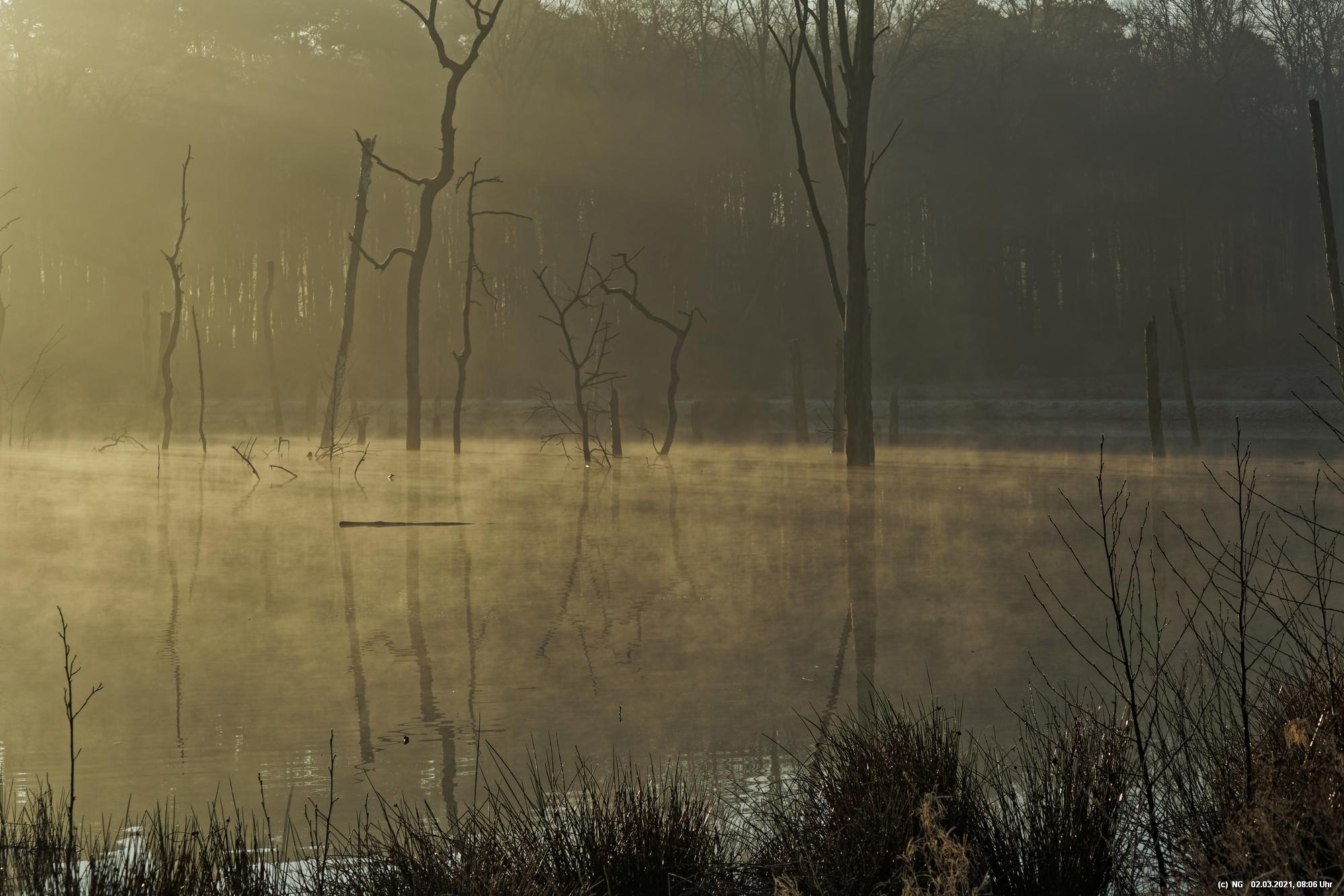 Irgendwann um die Jahrtausendwende, es war zu Pfingsten, haben Bergschäden eine deutliche Absenkung eines größeren Gebietes verursacht. So nach und nach drang das Grundwasser in diese große Grube und füllte es zu einem See. Die Bäume darin sind abgestorben und geben damit einen neuen Lebensraum frei. Was sich da entwickelt hat ist einmalig, natürlich und nicht wie Kiesgruben nach menschlichem Geschmack schön gerade angerichtet.