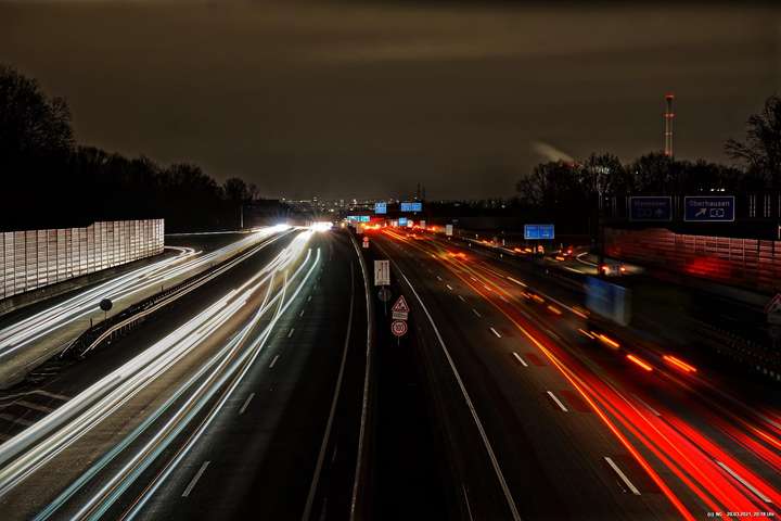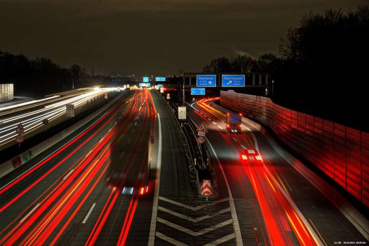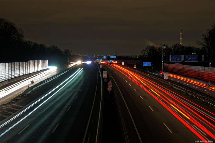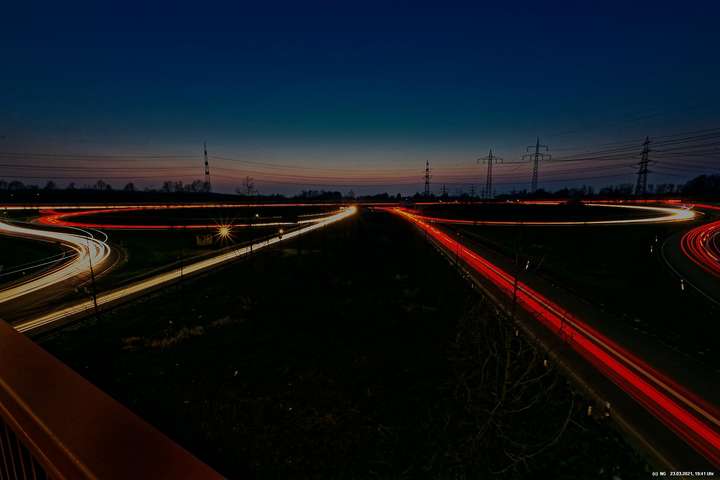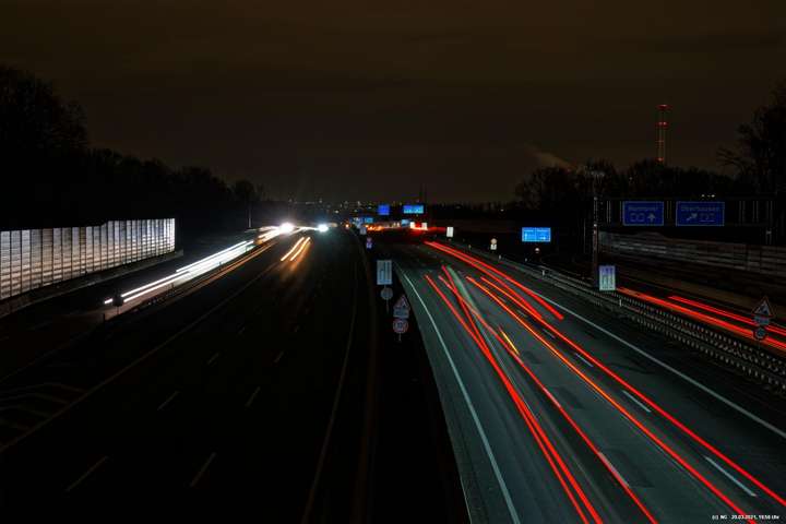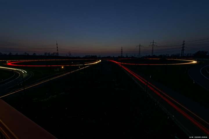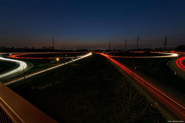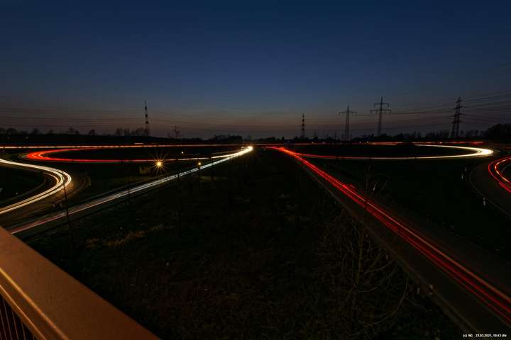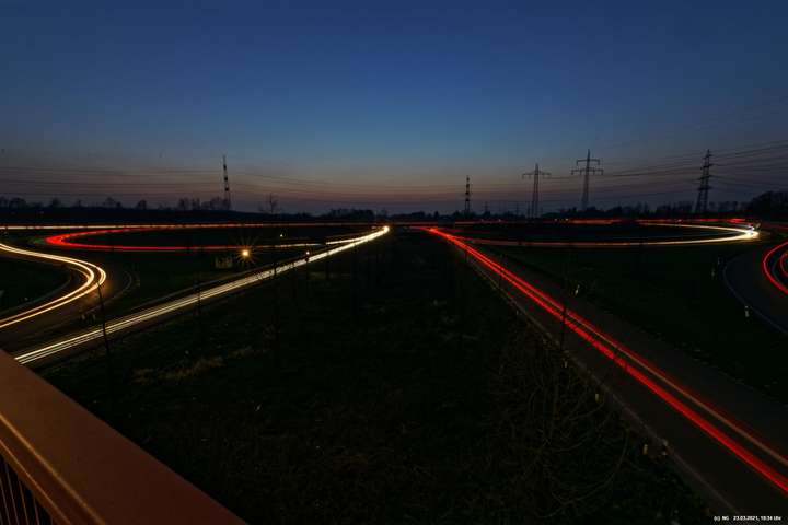 Wenn wir im Dunkeln auf die Autobahn sehen, nehmen wir nur die Geschwindigkeit und den Lärm war. Die Kamera jedoch kann bei Langzeitbelichtung (hier so bis zu 3 Minuten) auch die Lichtspuren aufzeichnen. Damit gibt es eine eigenständige, interessante Darstellungsform.