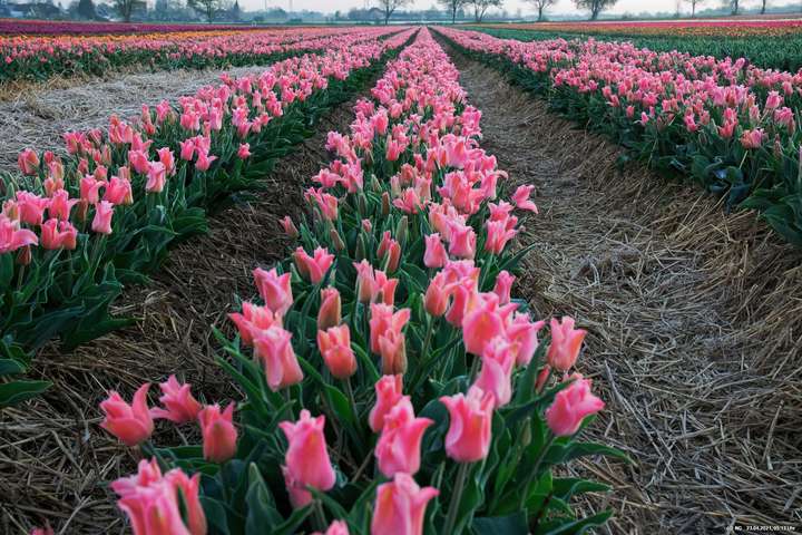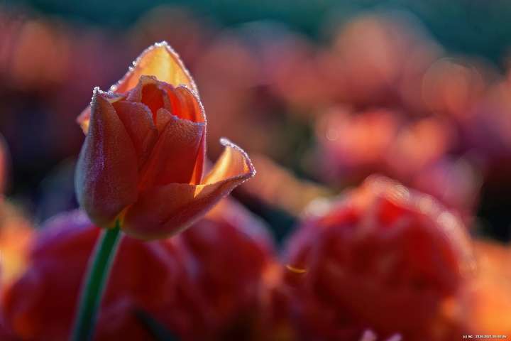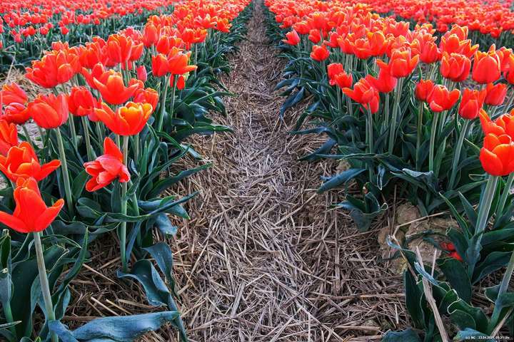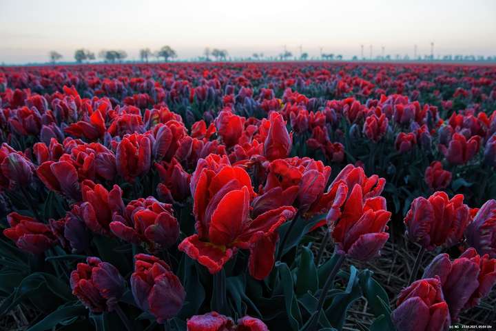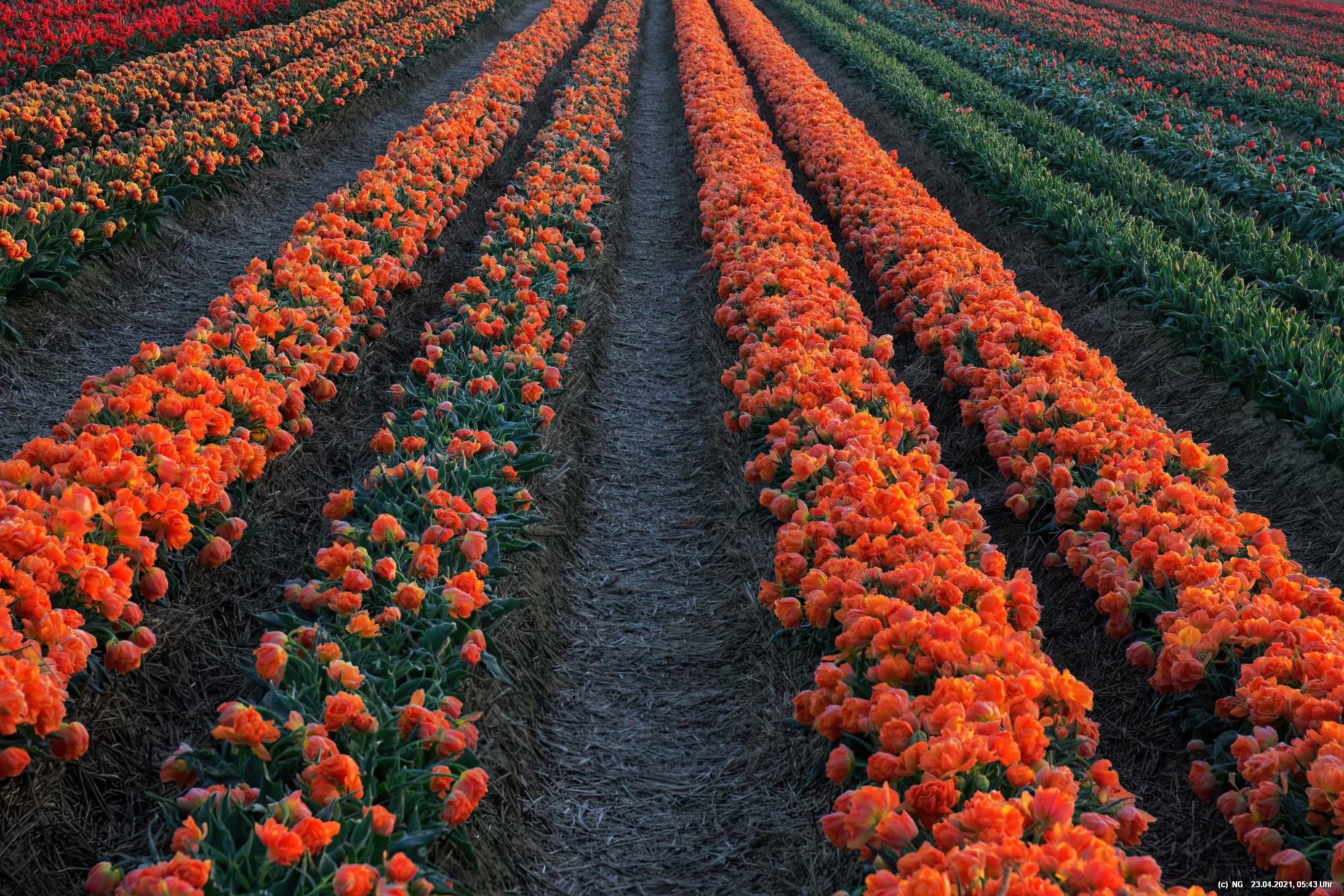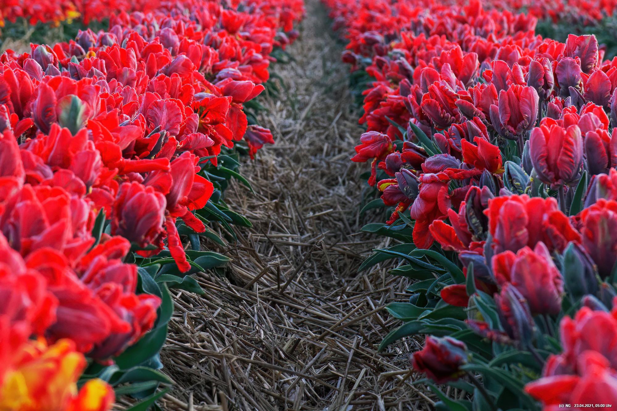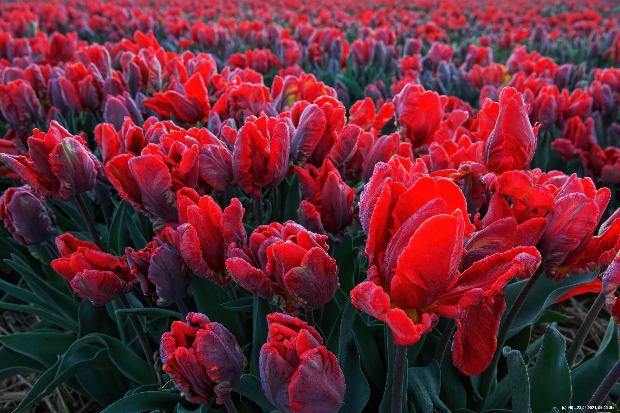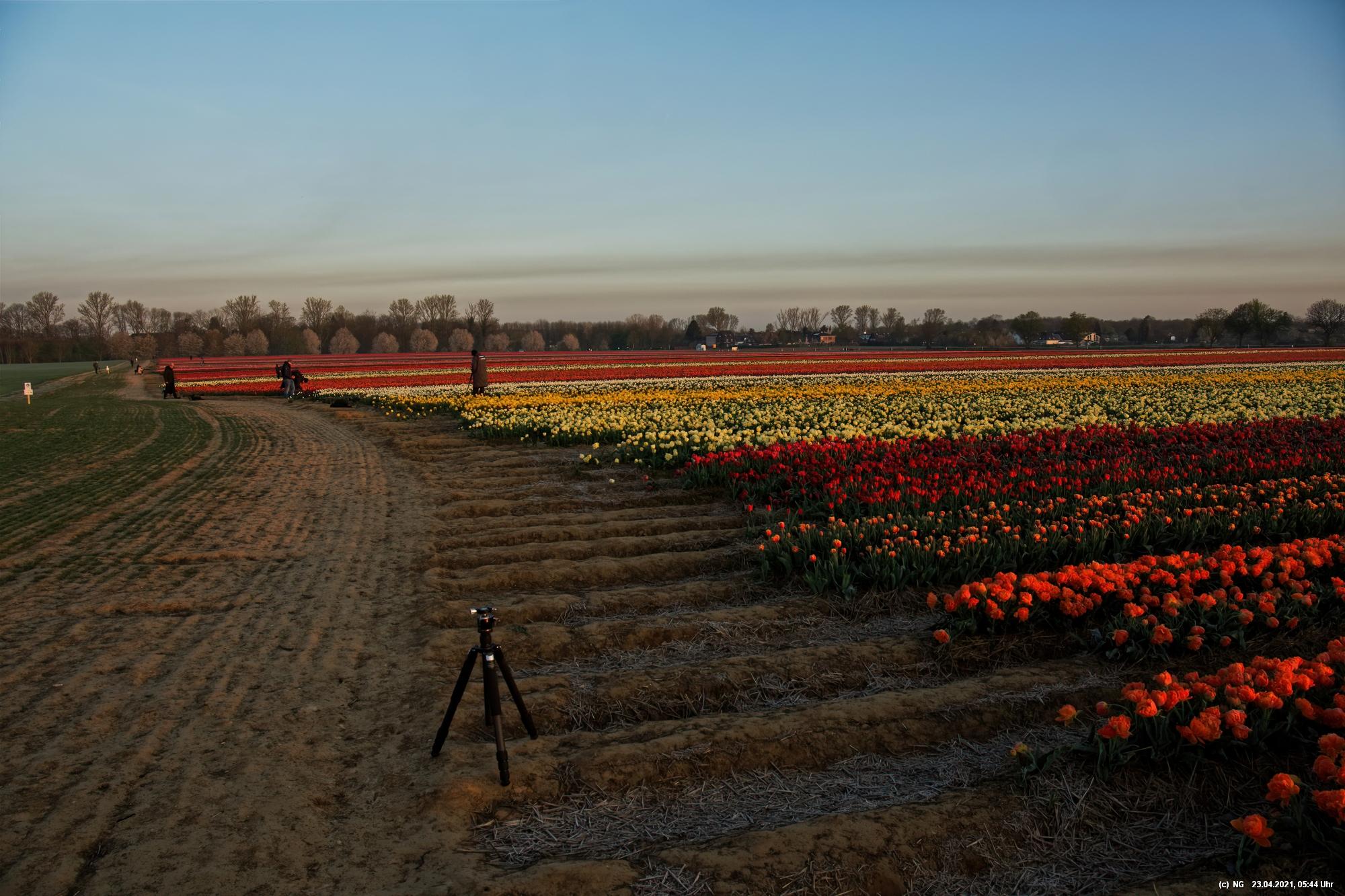 Früh morgens, noch vor Sonnenaufgang, war es ruhig dort - so nach etwa 1 Stunde Fahrzeit. Nur etwa 15 Fotografen mit fast genau so vielen Hunden waren dort, um die Tulpen beim Sonnenaufgang zu sehen. Es war klar und kalt mit leichten Frost. Die Tulpen waren überzogen mit einem Hauch von Reif und an den Blütenblätter bildeten sich kleine Kristalle. Über den festen, lehmigen Boden konnte man gut zwischen die Tulpenreihen laufen und war somit immer nah dran. Es gab viele Parkplätze und sogar eine kleine Toilette - und das ohne Eintrittskosten. Bei dem Wetter war zu erwarten, dass der Ansturm am Tage sehr groß sein wird.