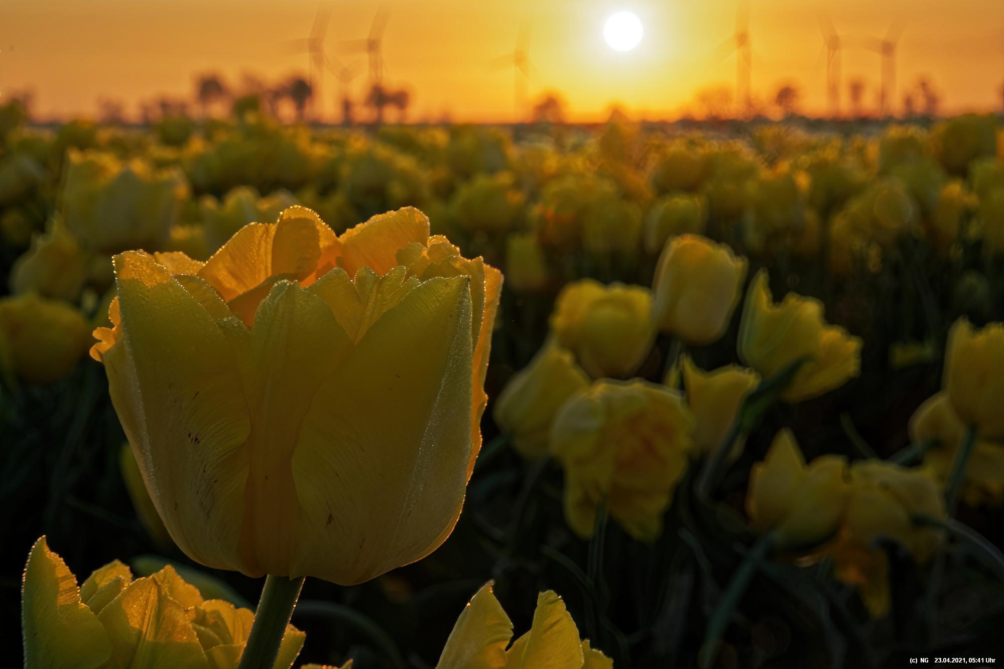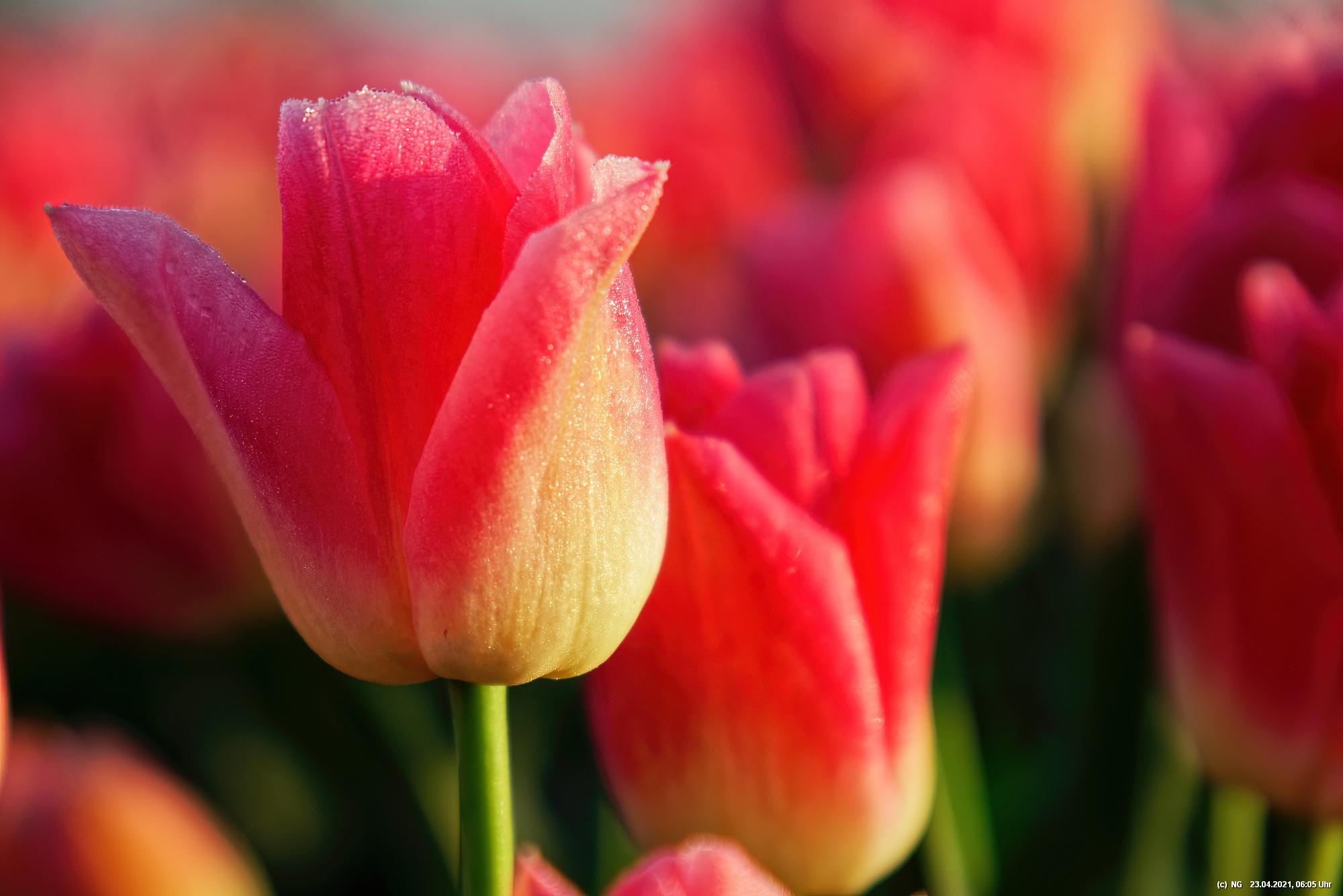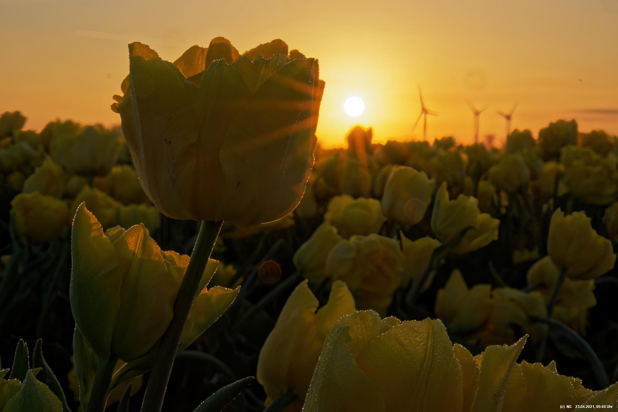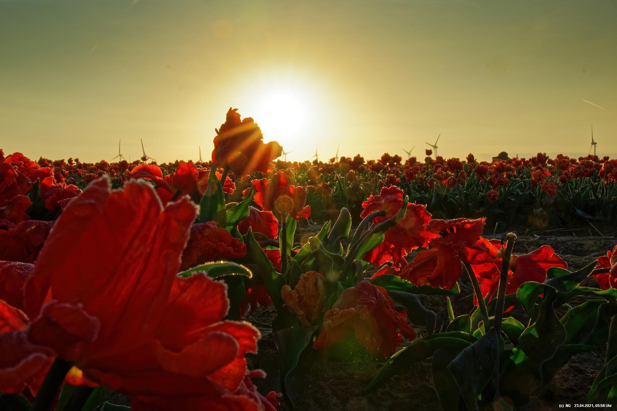 Kurz vor 06:30 Uhr ging dann die Sonne auf. Die Strahlen wärmten und gaben den Tulpen noch mehr Farbe.