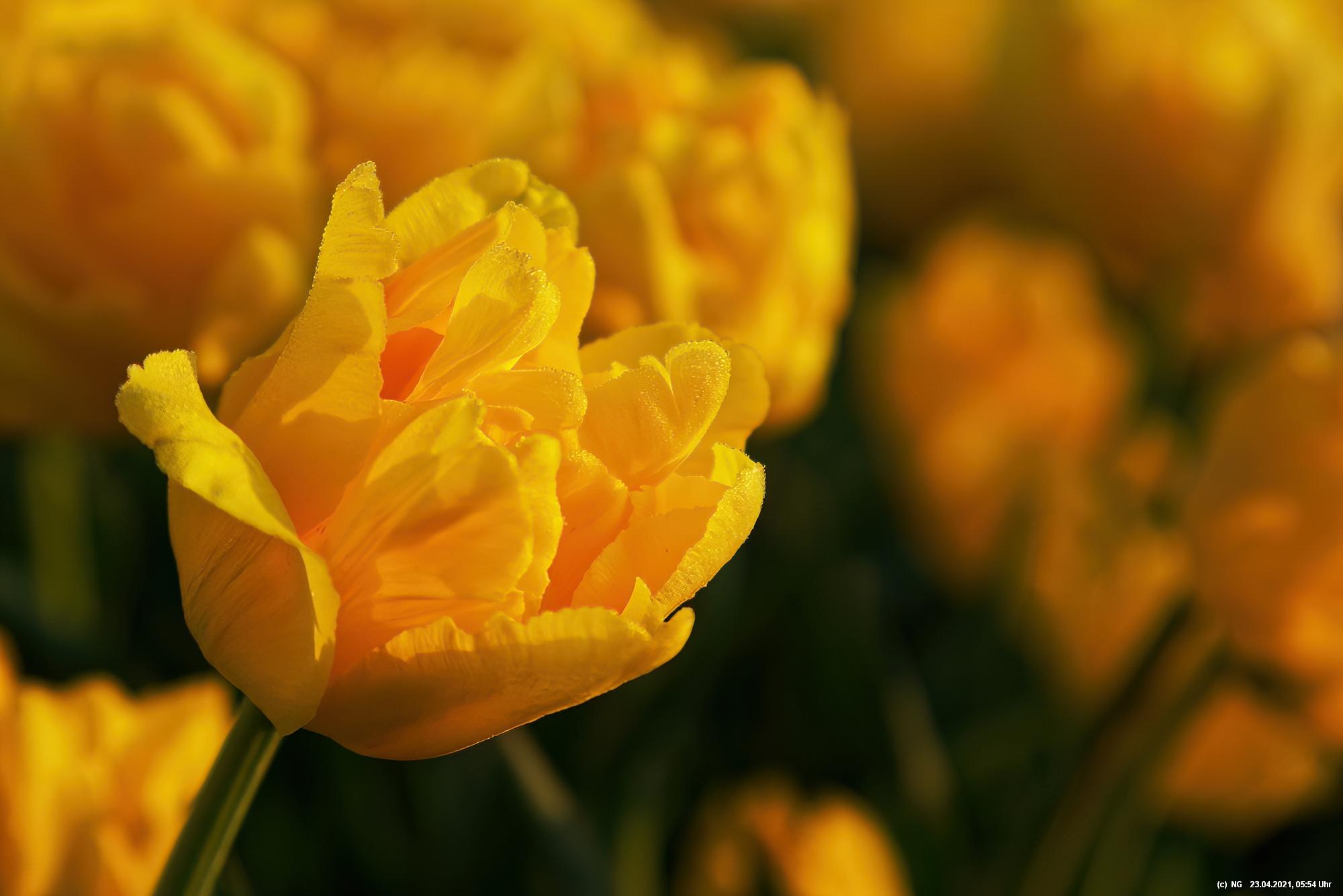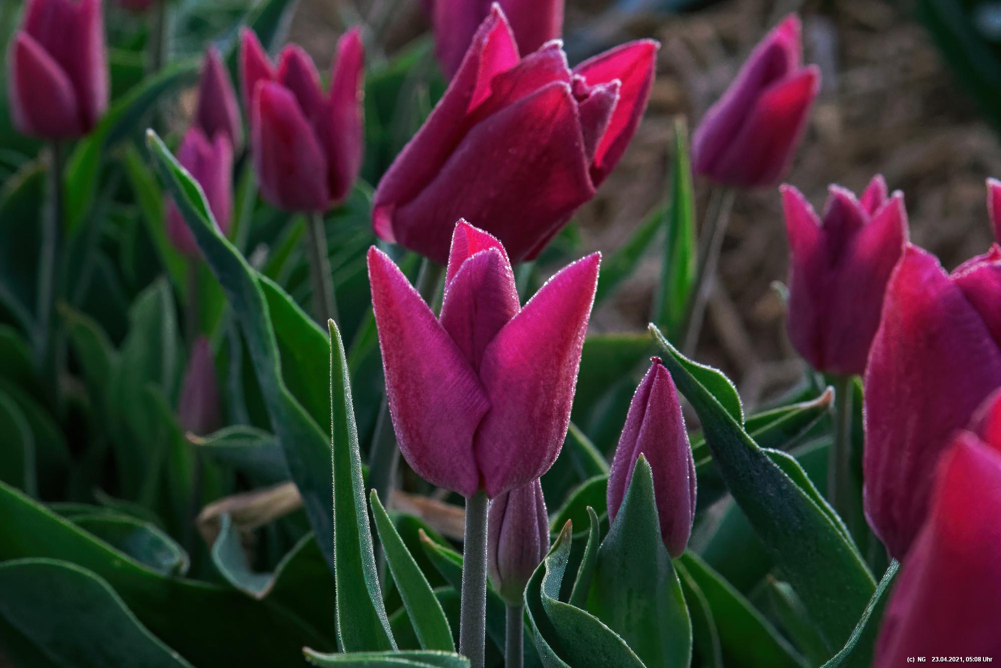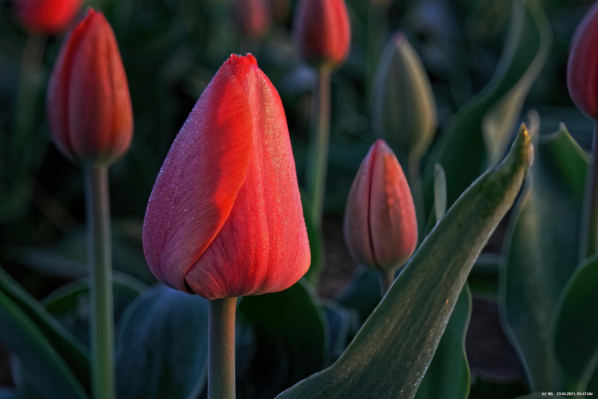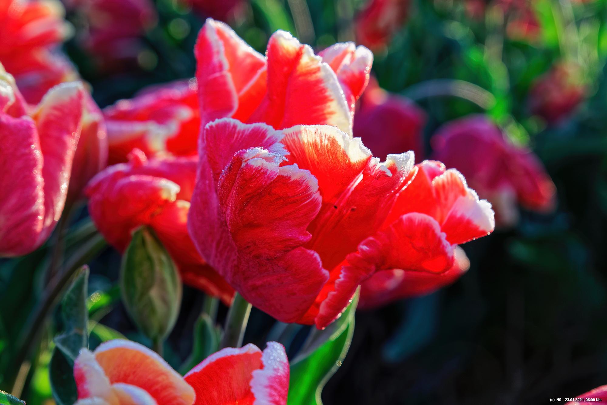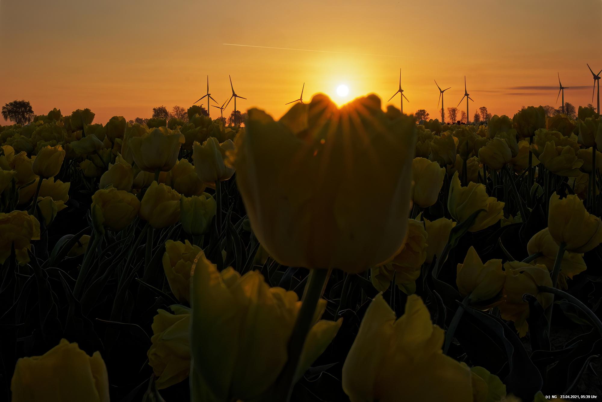 Kurz vor 06:30 Uhr ging dann die Sonne auf. Die Strahlen wärmten und gaben den Tulpen noch mehr Farbe.