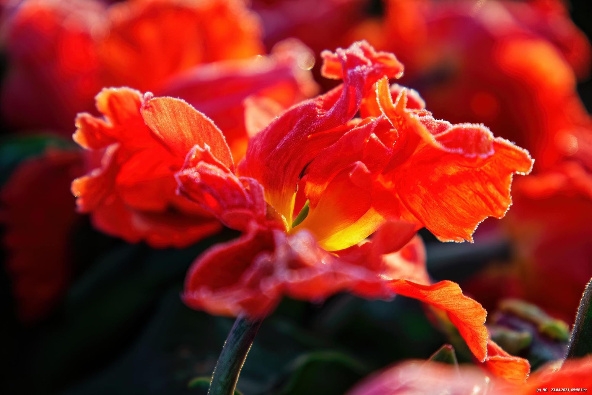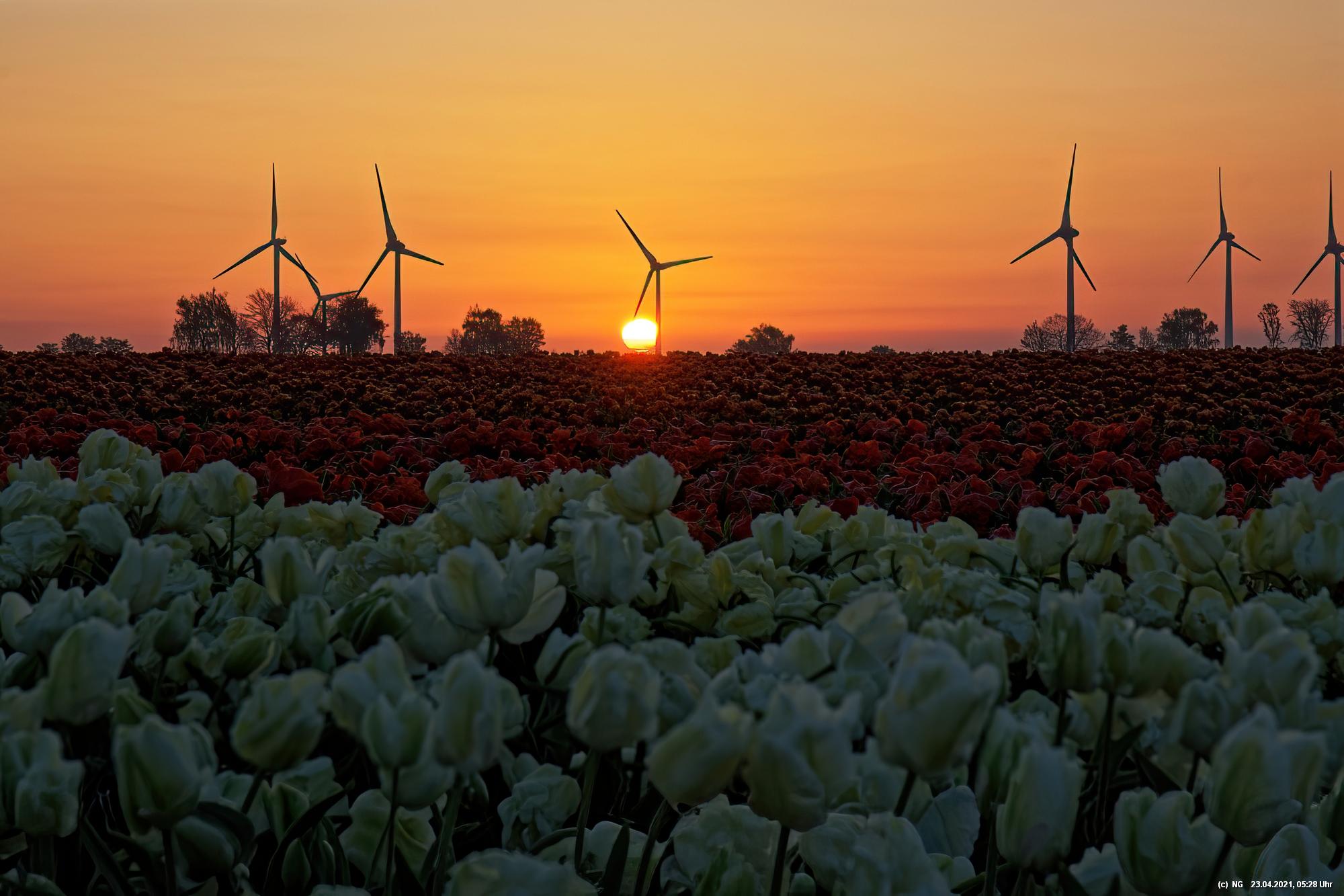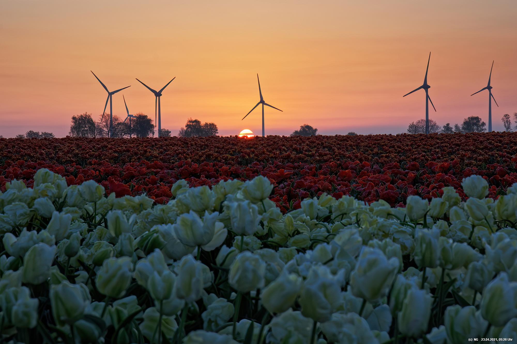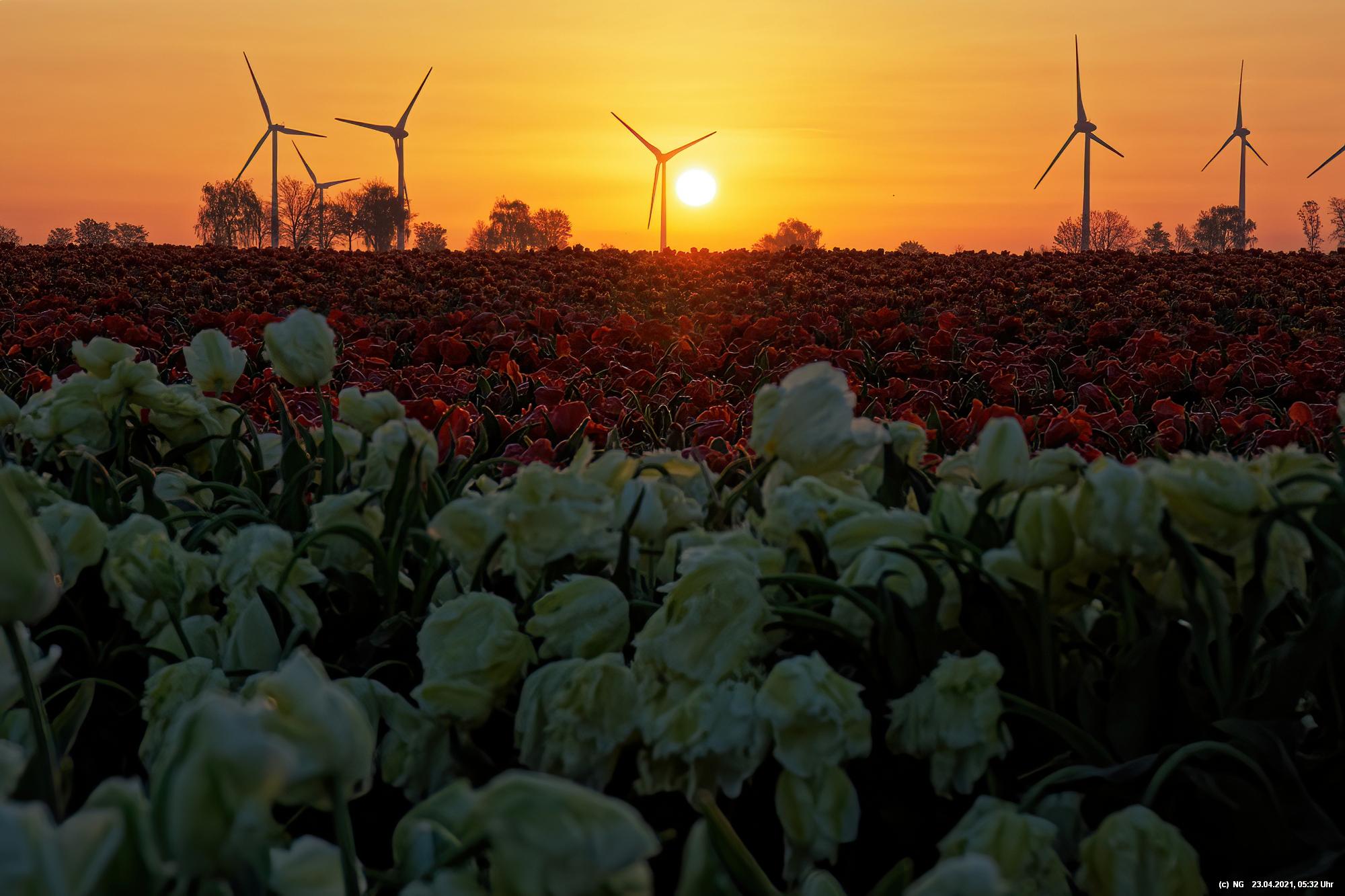 Kurz vor 06:30 Uhr ging dann die Sonne auf. Die Strahlen wärmten und gaben den Tulpen noch mehr Farbe.