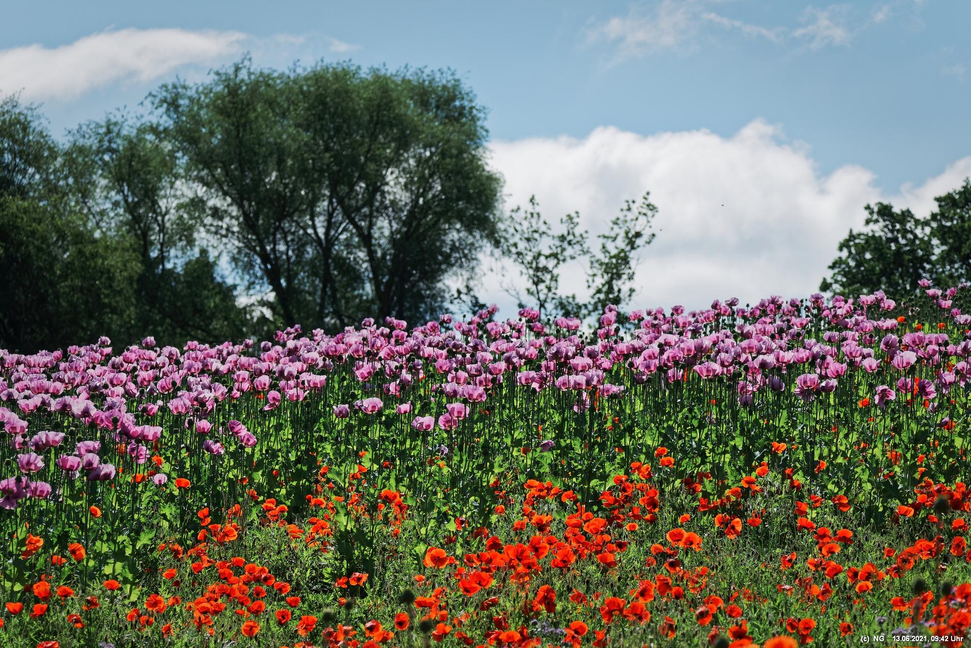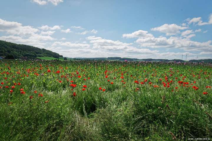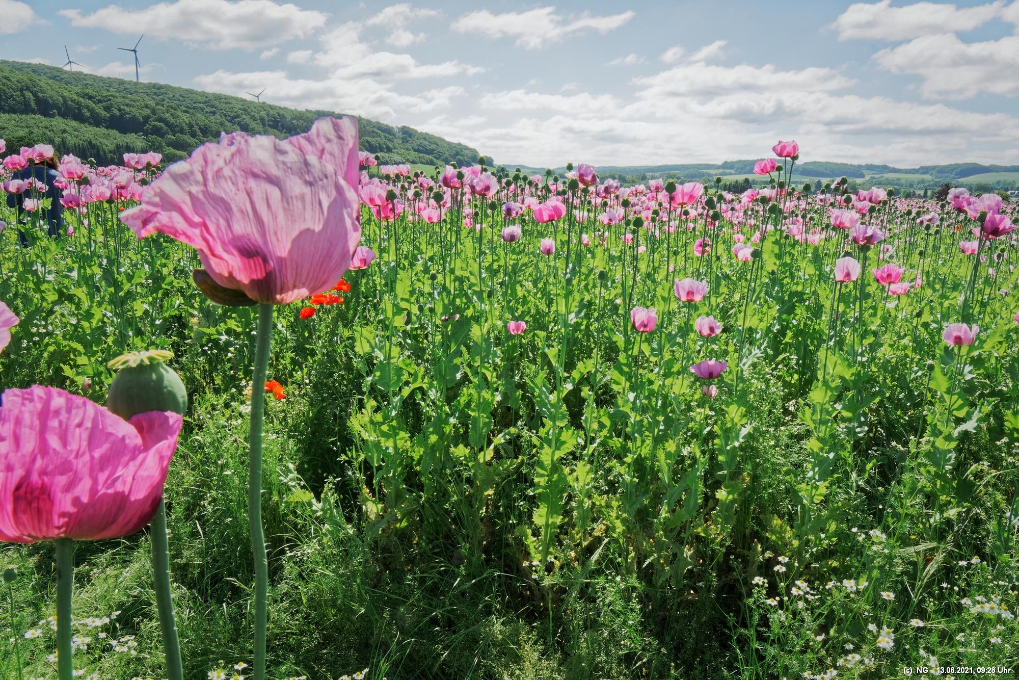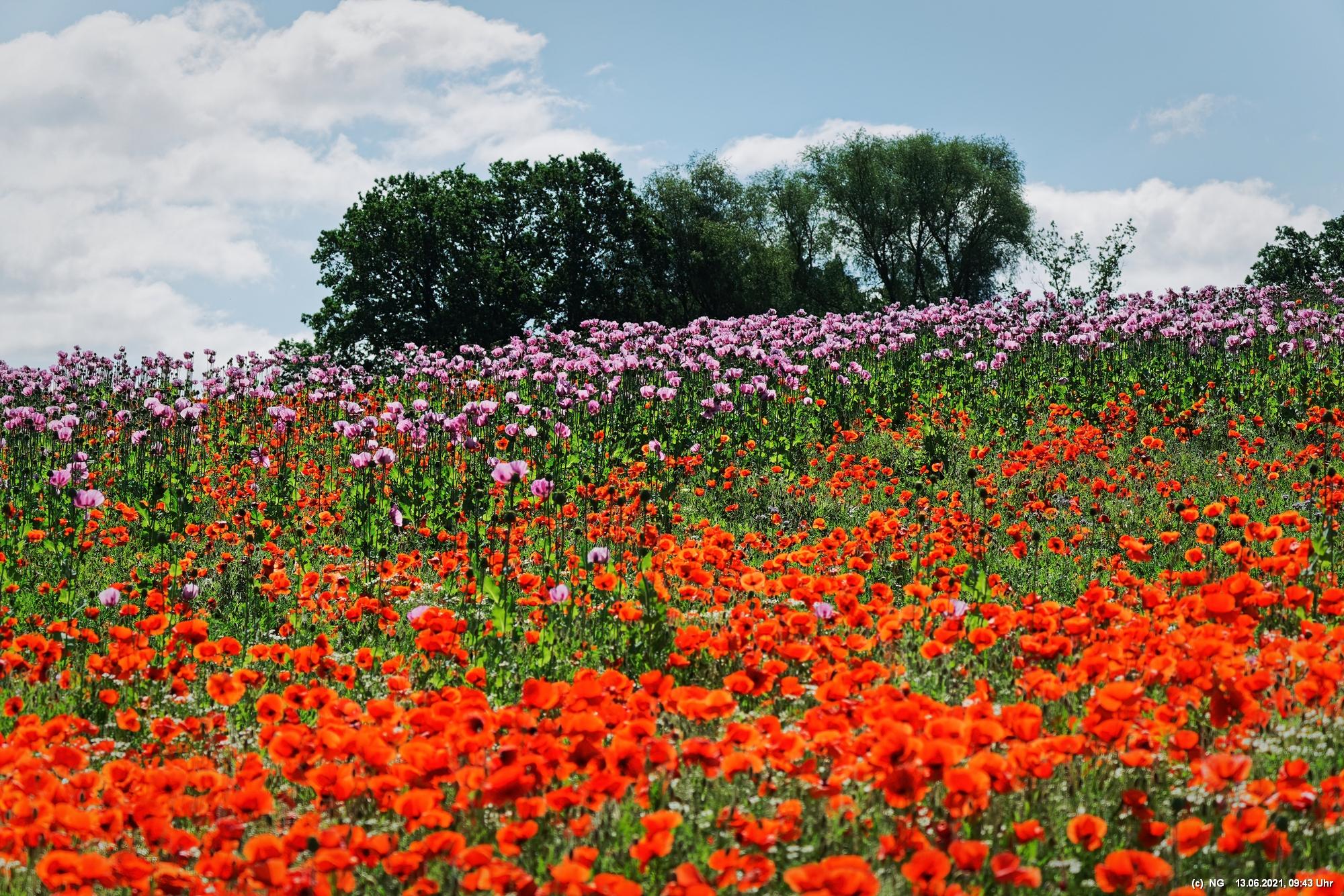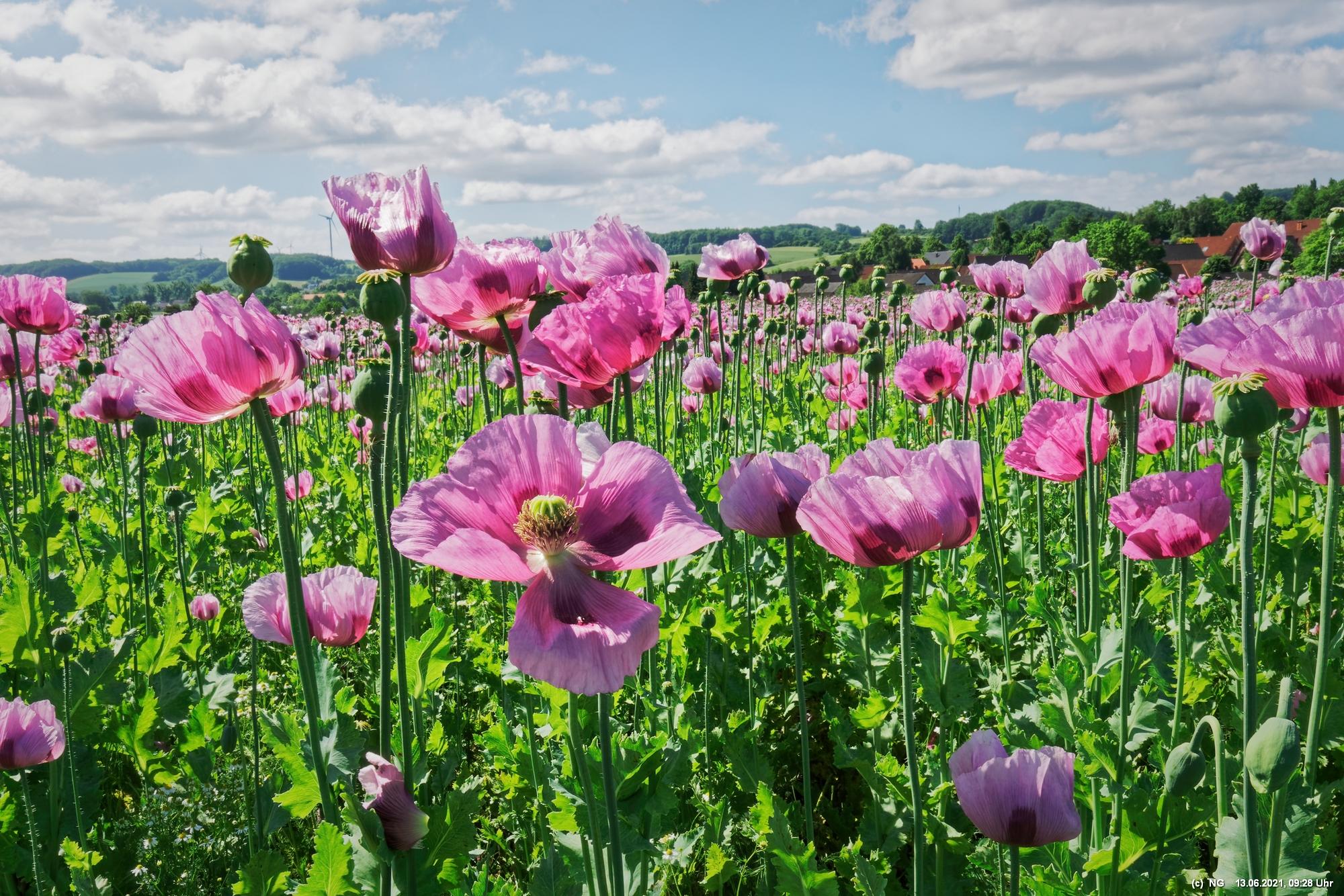 Die Gemeinde Kalletal liegt sehr idyllisch im Nordosten Nordrhein-Westfalens. Irgendwie ist die Welt dort noch in Ordnung. Ein wenig versteckt liegt abseits der großen Straßen das Anbaufeld am Bruchweg. Auch wenn man schon da ist, ahnt man es erst, bevor man eine Kuppe überwindet. Und dann sieht man das Meer von „Papaver somniferum“ oder einfach Schlafmohn, der für die regionalen Bäckereien angebaut wird. Die Blüten halten sich nur einen Tag. Davor haben sich roter Mohn und wilde Kamille angesiedelt. Millionen Blüten finden den Weg in die Sinne. Es war beeindruckend!