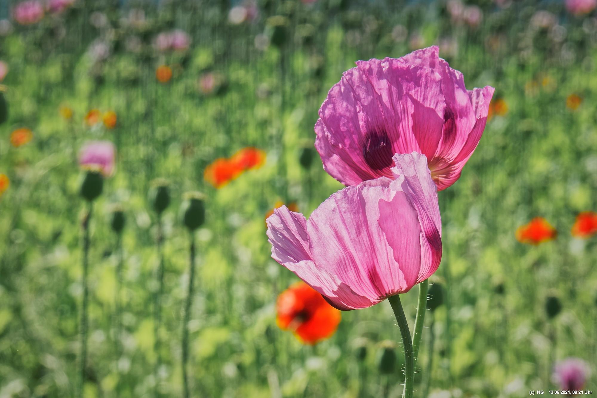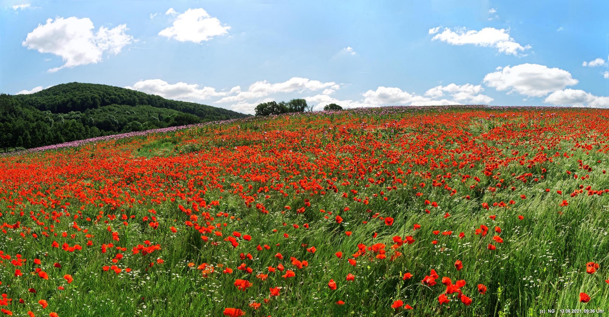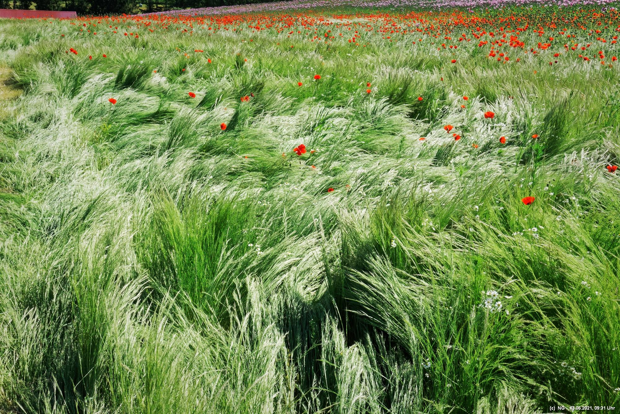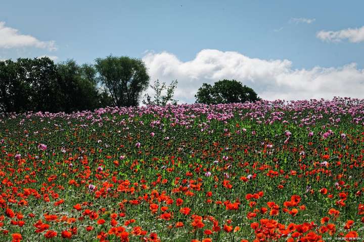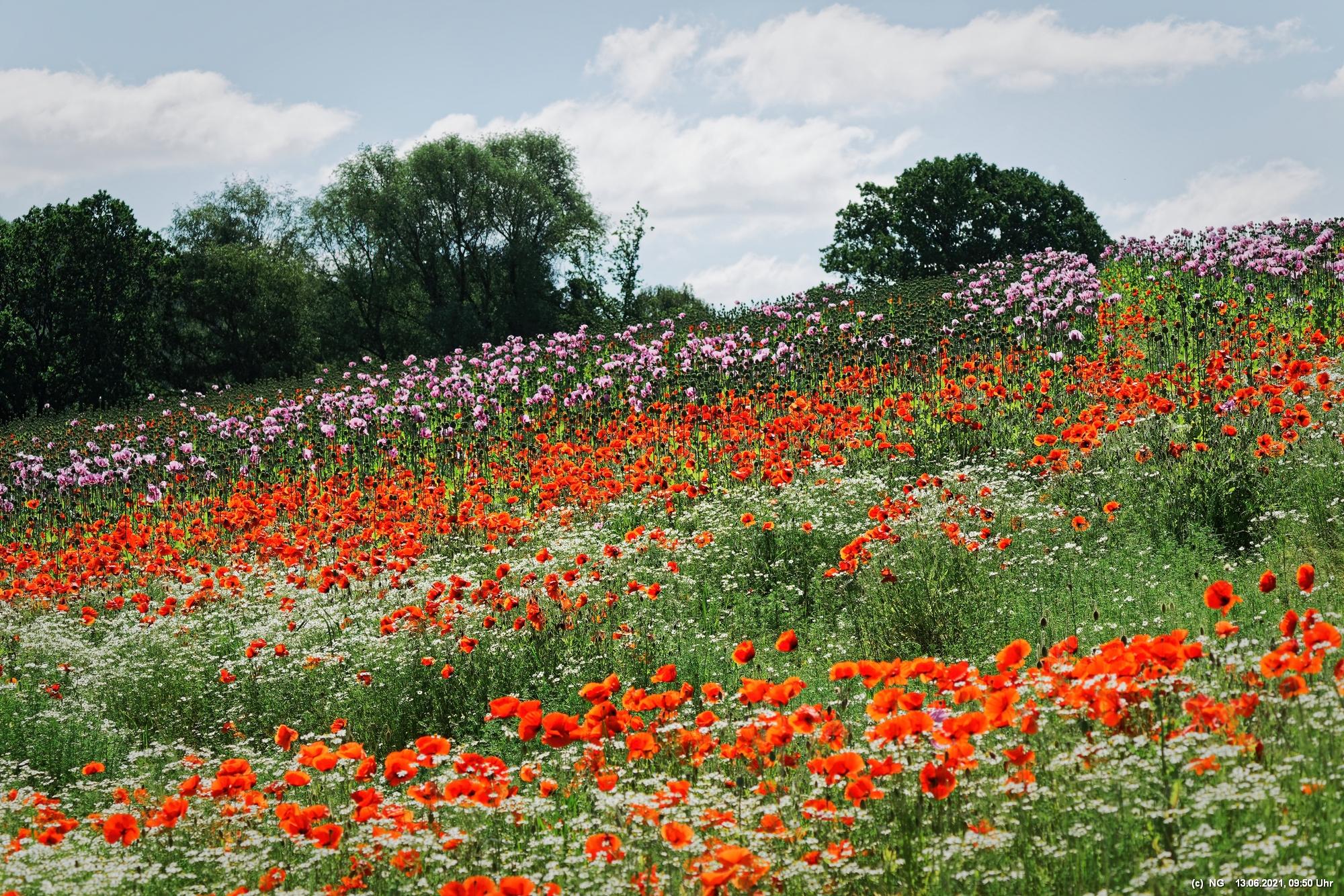 Die Gemeinde Kalletal liegt sehr idyllisch im Nordosten Nordrhein-Westfalens. Irgendwie ist die Welt dort noch in Ordnung. Ein wenig versteckt liegt abseits der großen Straßen das Anbaufeld am Bruchweg. Auch wenn man schon da ist, ahnt man es erst, bevor man eine Kuppe überwindet. Und dann sieht man das Meer von „Papaver somniferum“ oder einfach Schlafmohn, der für die regionalen Bäckereien angebaut wird. Die Blüten halten sich nur einen Tag. Davor haben sich roter Mohn und wilde Kamille angesiedelt. Millionen Blüten finden den Weg in die Sinne. Es war beeindruckend!