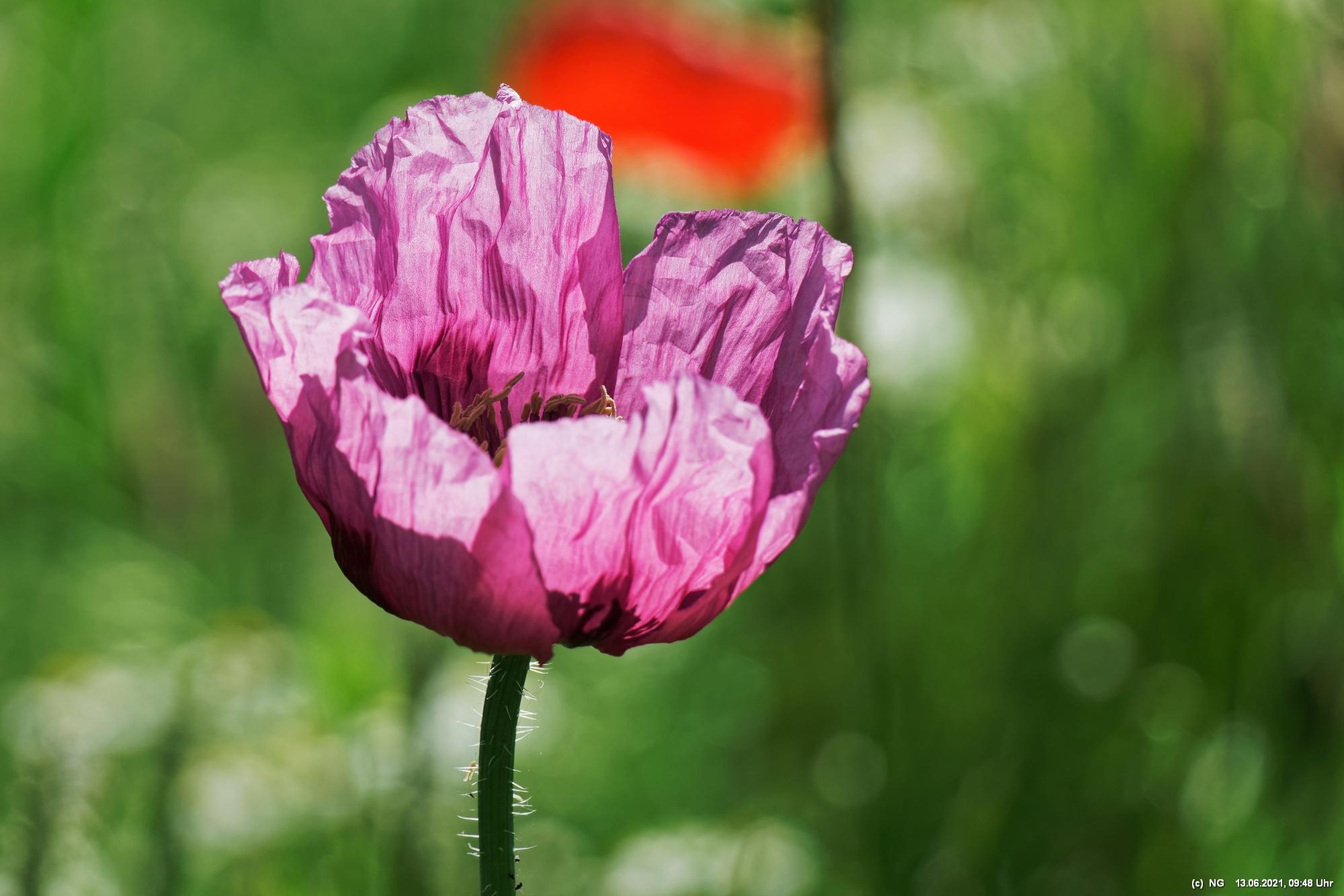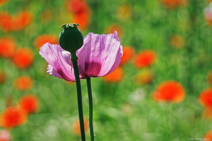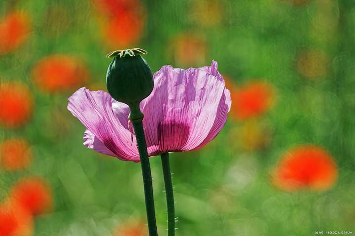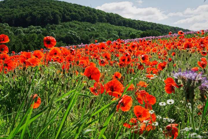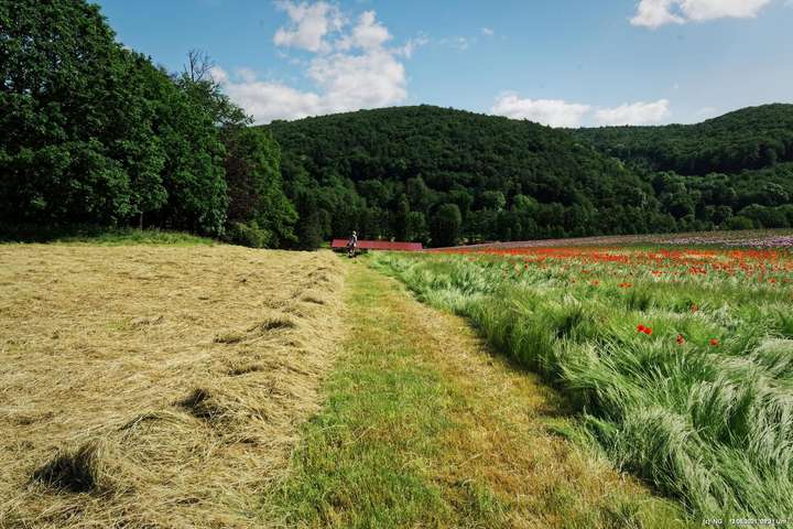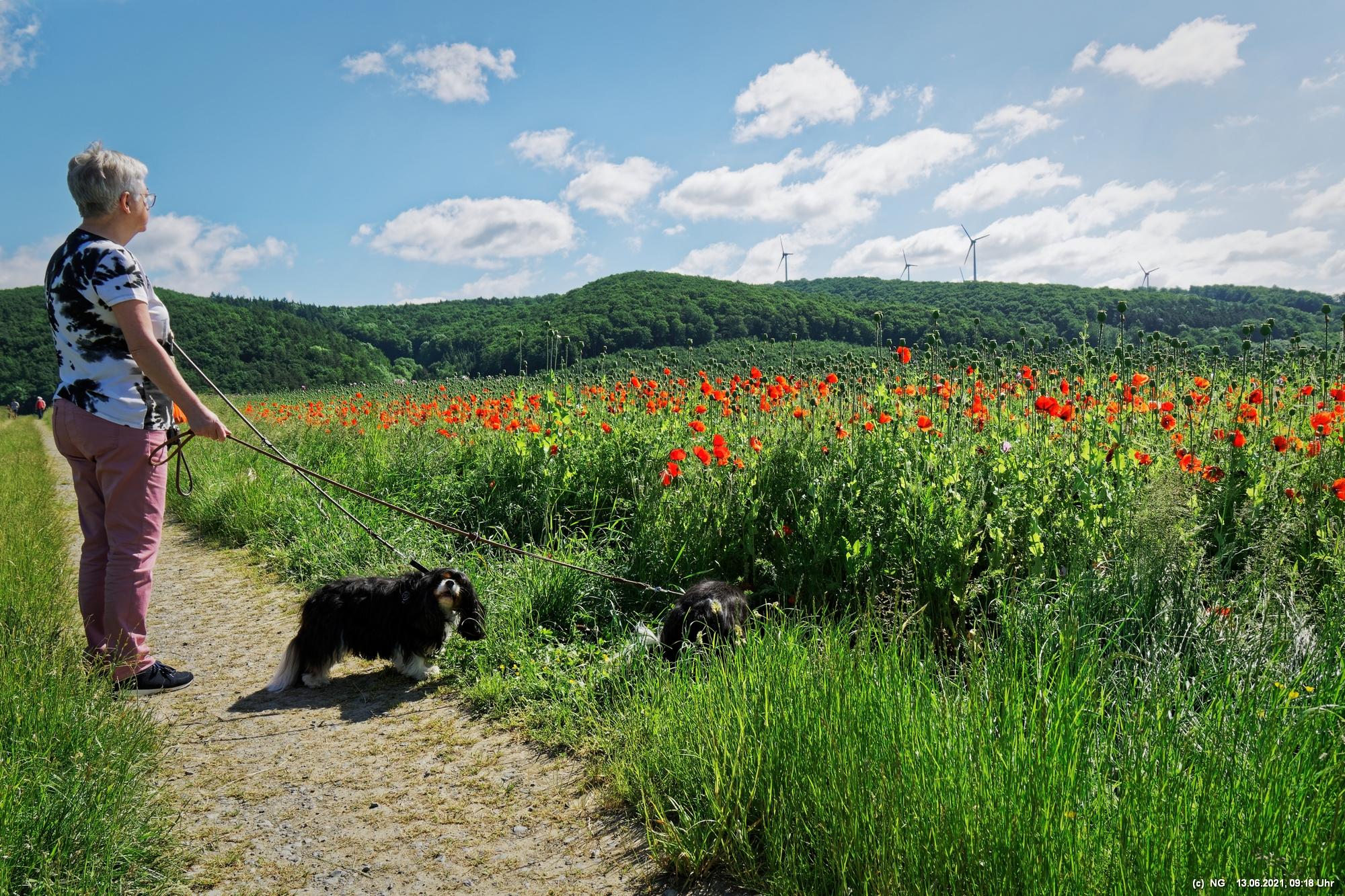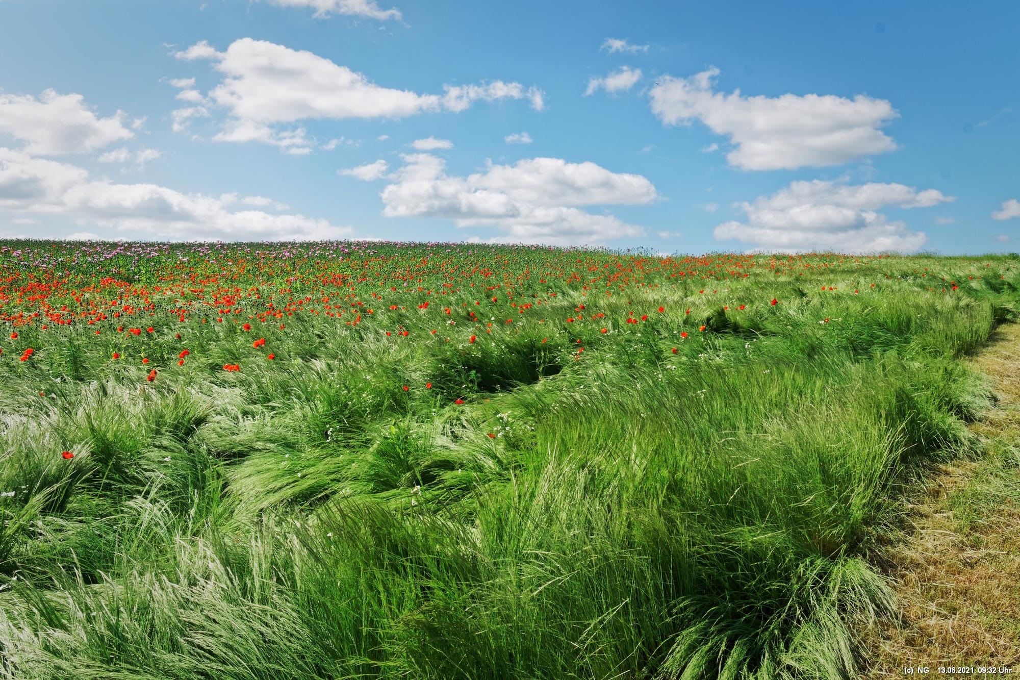 Die Gemeinde Kalletal liegt sehr idyllisch im Nordosten Nordrhein-Westfalens. Irgendwie ist die Welt dort noch in Ordnung. Ein wenig versteckt liegt abseits der großen Straßen das Anbaufeld am Bruchweg. Auch wenn man schon da ist, ahnt man es erst, bevor man eine Kuppe überwindet. Und dann sieht man das Meer von „Papaver somniferum“ oder einfach Schlafmohn, der für die regionalen Bäckereien angebaut wird. Die Blüten halten sich nur einen Tag. Davor haben sich roter Mohn und wilde Kamille angesiedelt. Millionen Blüten finden den Weg in die Sinne. Es war beeindruckend!