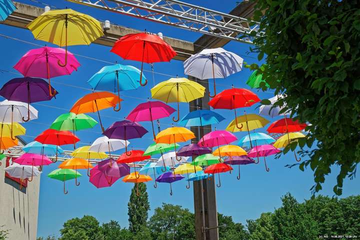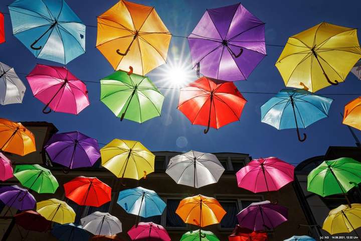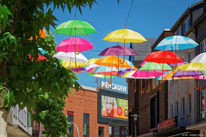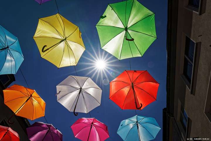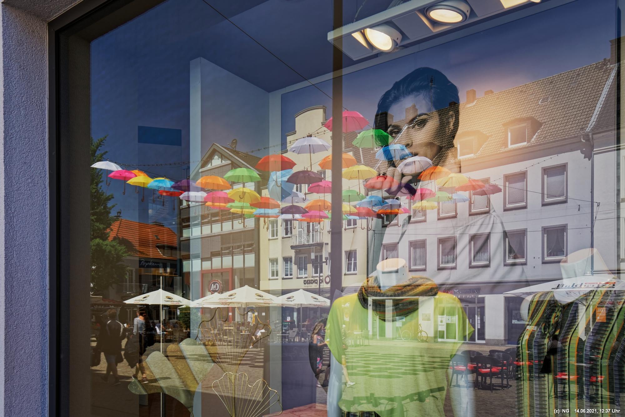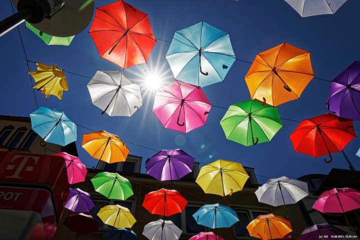 An den 3 Hautzugängen zur Innenstadt und über dem Marktplatz wurden mit den Lockerungen im Zuge der nachlassenden Infektionen mit Corona bunte Schirme aufgehängt. Ganz nach dem Motto „Wir sind wieder für Sie da! Live & bunt!“. Bei herrlichem Wetter sind sie auch ein Zeichnen der Freude, da die Innenstadt wieder ohne Masken begangen werden darf.