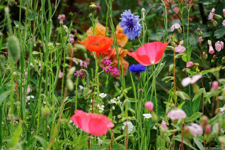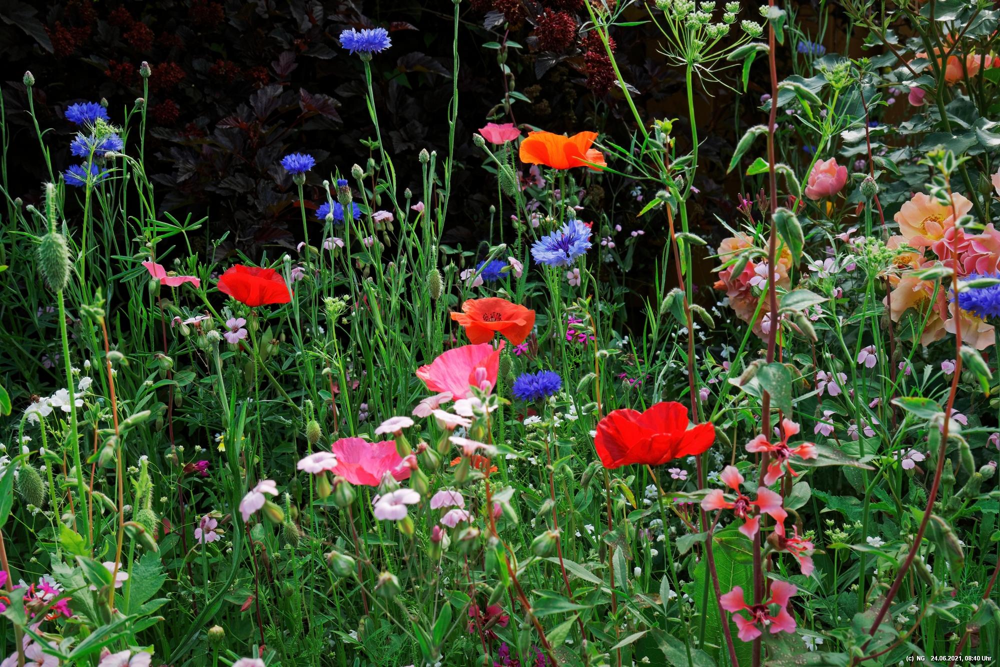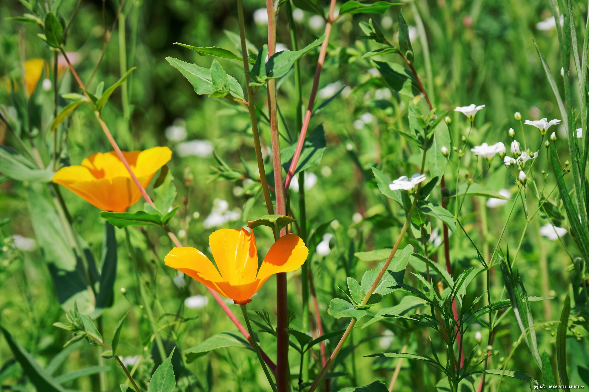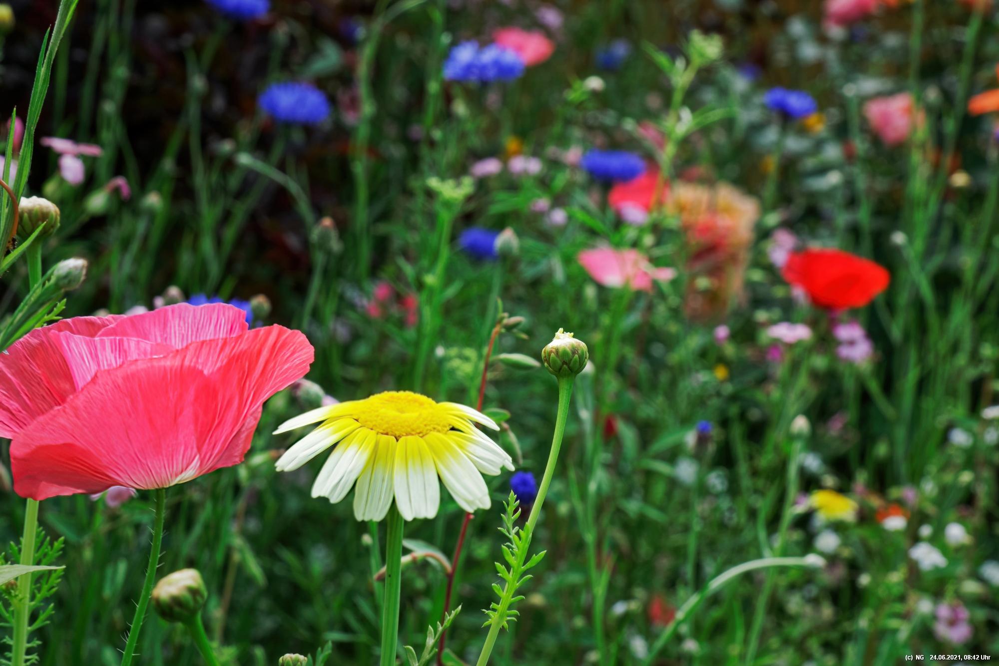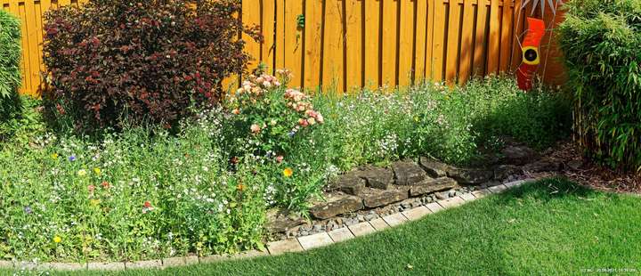 Es hat uns fasziniert. Recht schnell gingen die Samen auf und die Pflanzen wuchsen. Dann kamen die ersten Blüten - und es wurden immer mehr - geschätzt jetzt schon einige Tausend. Es ist so toll bunt dort, dass wir jeden Tag genau auf "Neuankömmlinge" warten und diese regelrecht feiern. Insekten sind auch schon jede Menge da (und halten sich sogar von unserer Terrasse fern). Schmetterlinge sind noch selten. Sie sind aber auch in der Umgebung selten geworden.