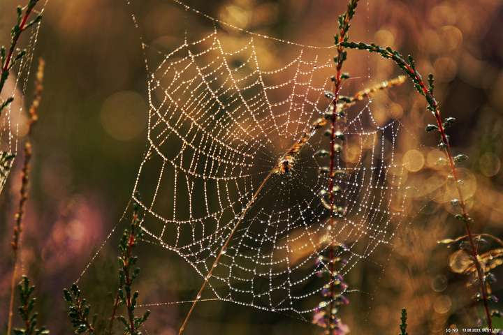 Alle vernünftigen Menschen schlafen noch um diese Zeit - nur 2 Revierblicker nicht. Und so haben wir auch nur 3 Fremde und einen Hund gesehen. Es war so schön ruhig. Der erwünschte Bodennebel war da und bewegte sich dauernd. Nur wenige Wolken bedeckten den Himmel, die aber für Farbe sorgten. Direkt nach dem Sonnenaufgang senkte sich die Luftfeuchtigkeit ab und bedeckte alle Pflanzen, aber auch die Spinnweben. Es war bezaubernd!
