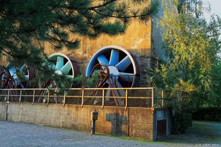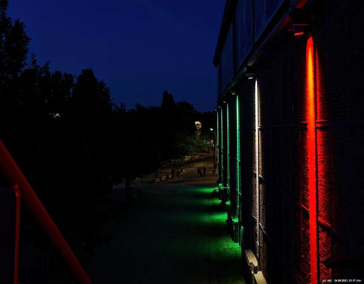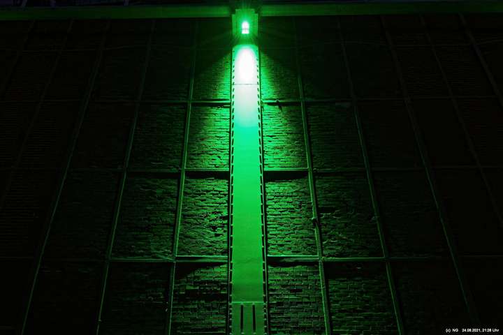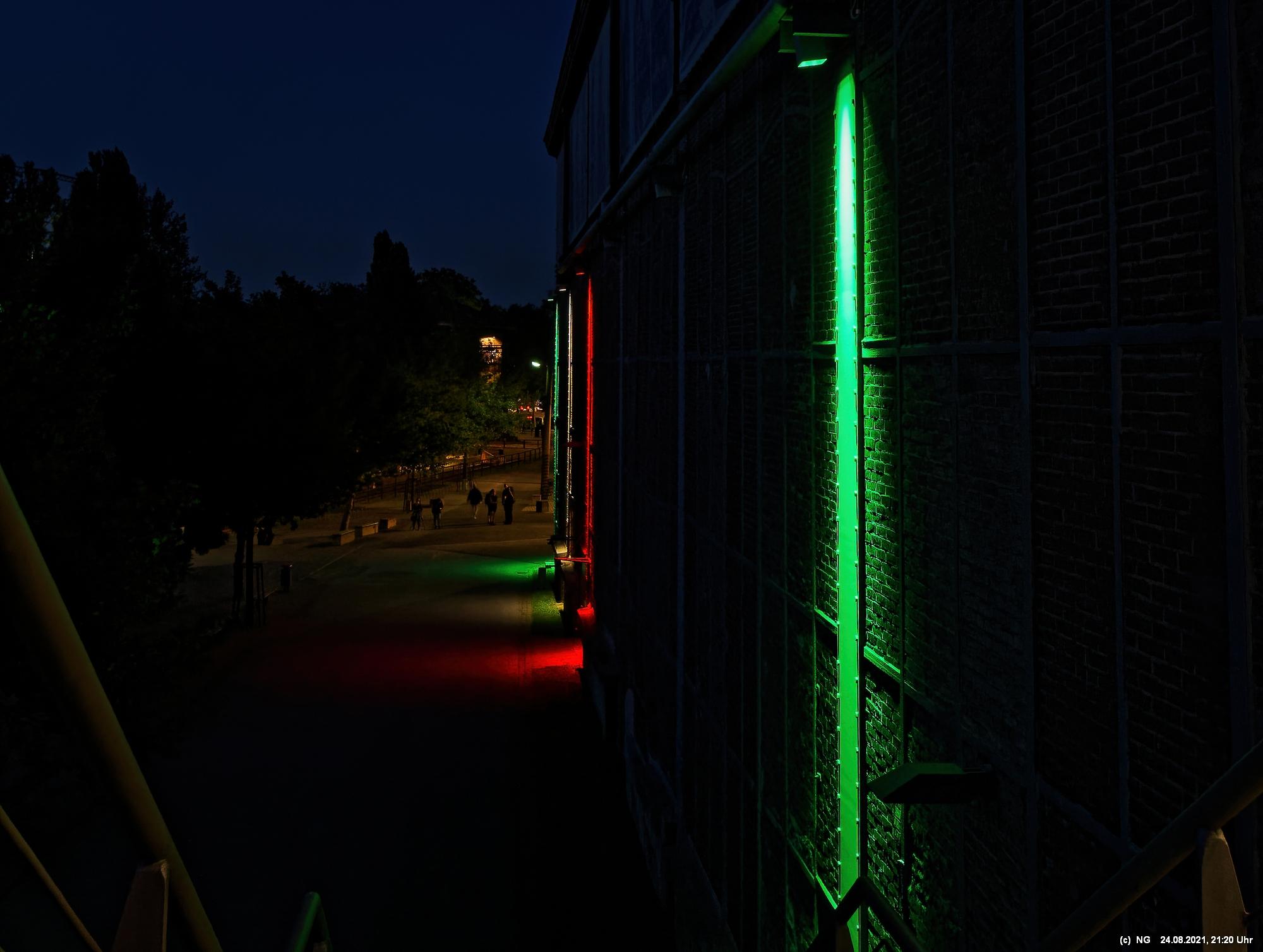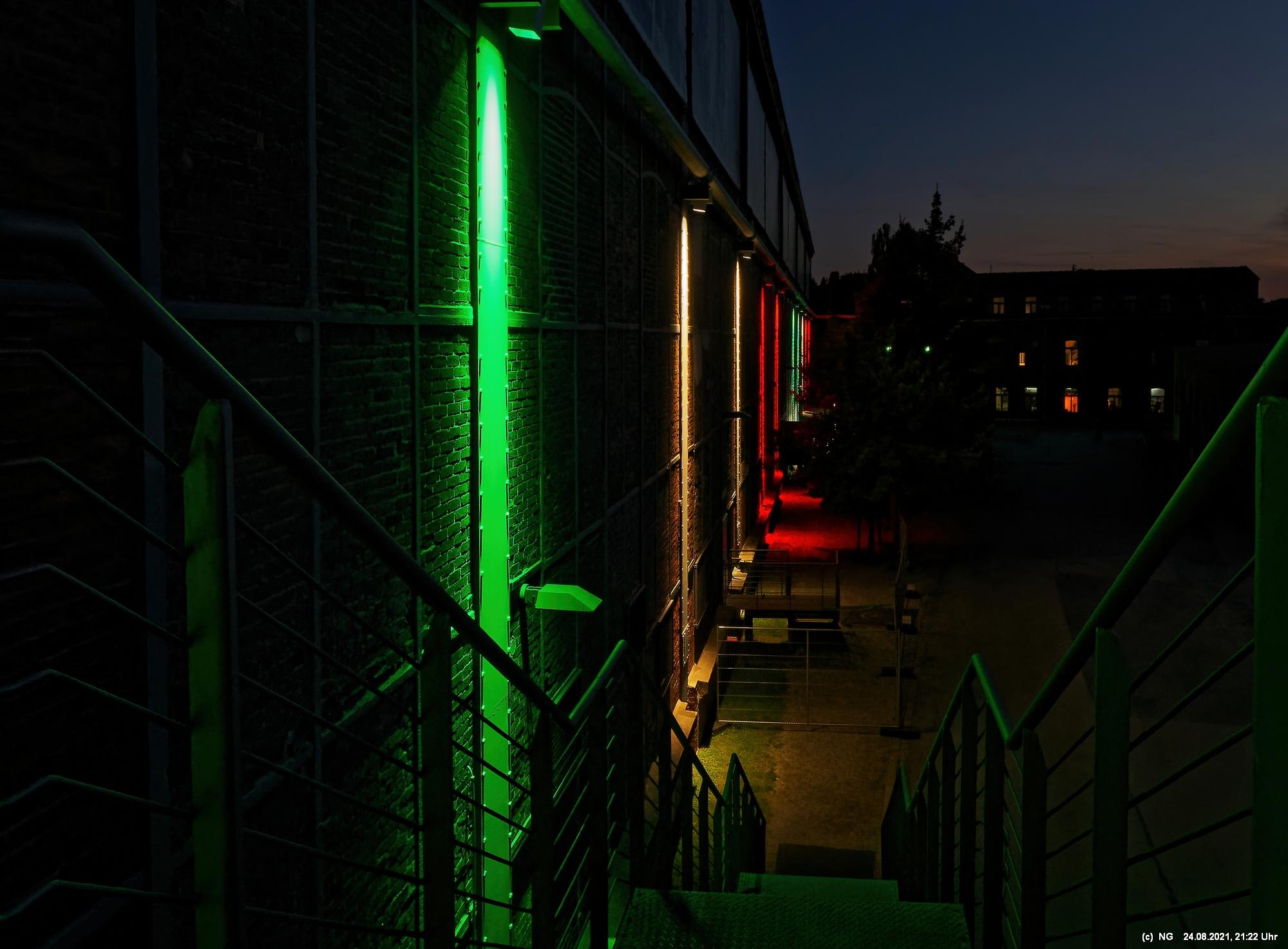 Anlässlich der Feierlichkeiten wird die Kraftzentrale in den Landesfarben beleuchtet.