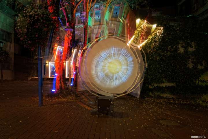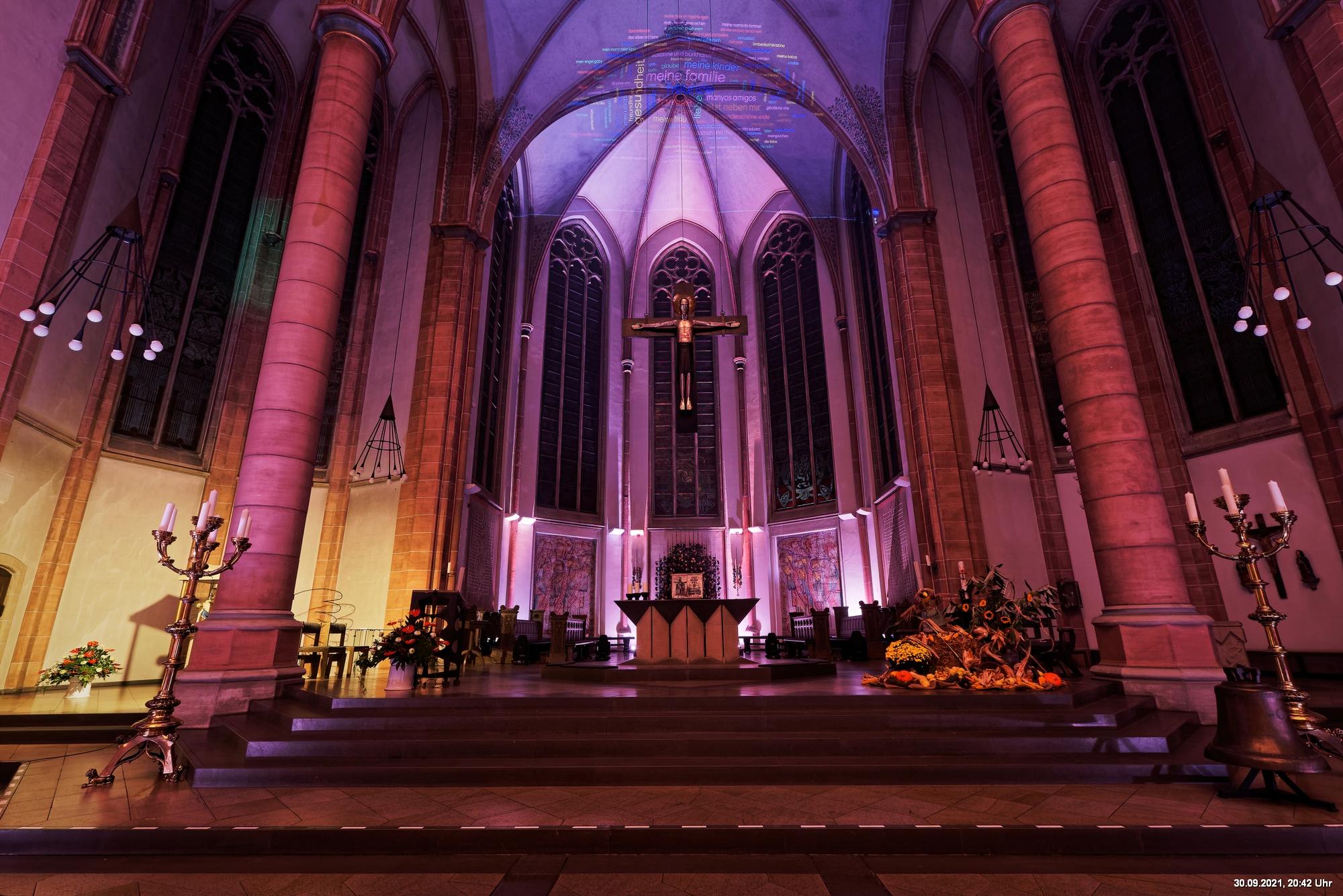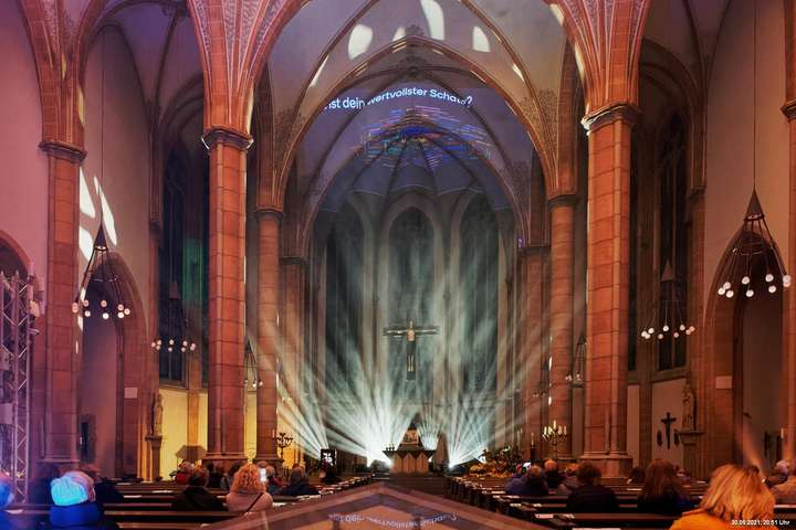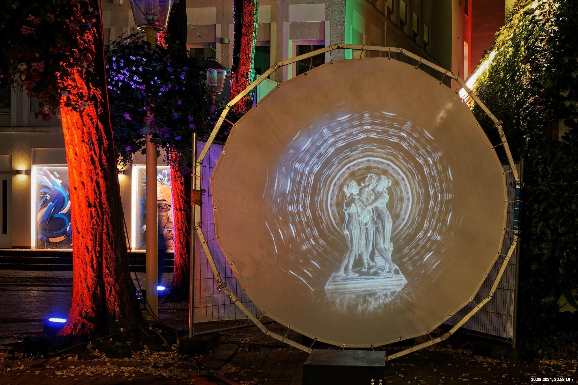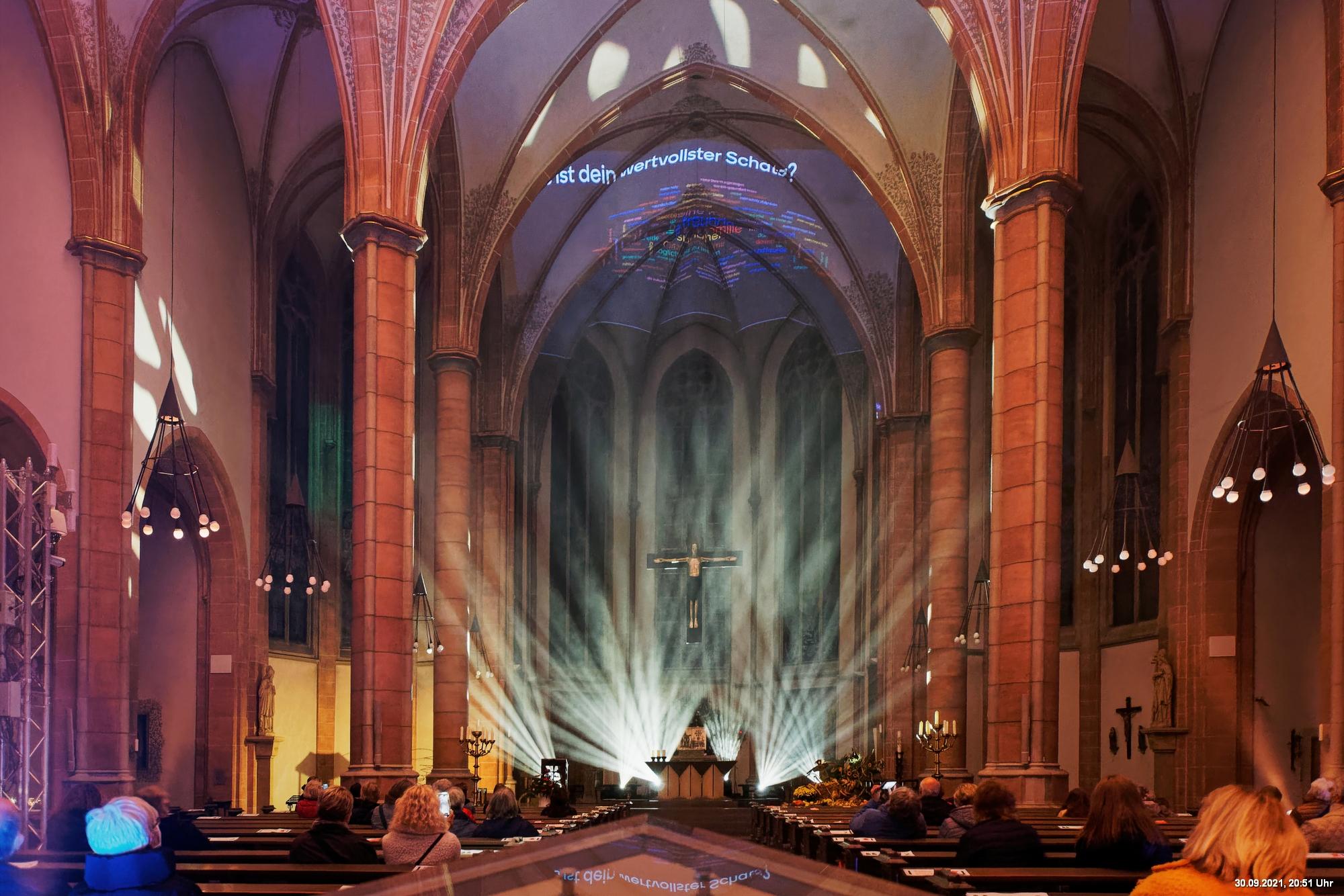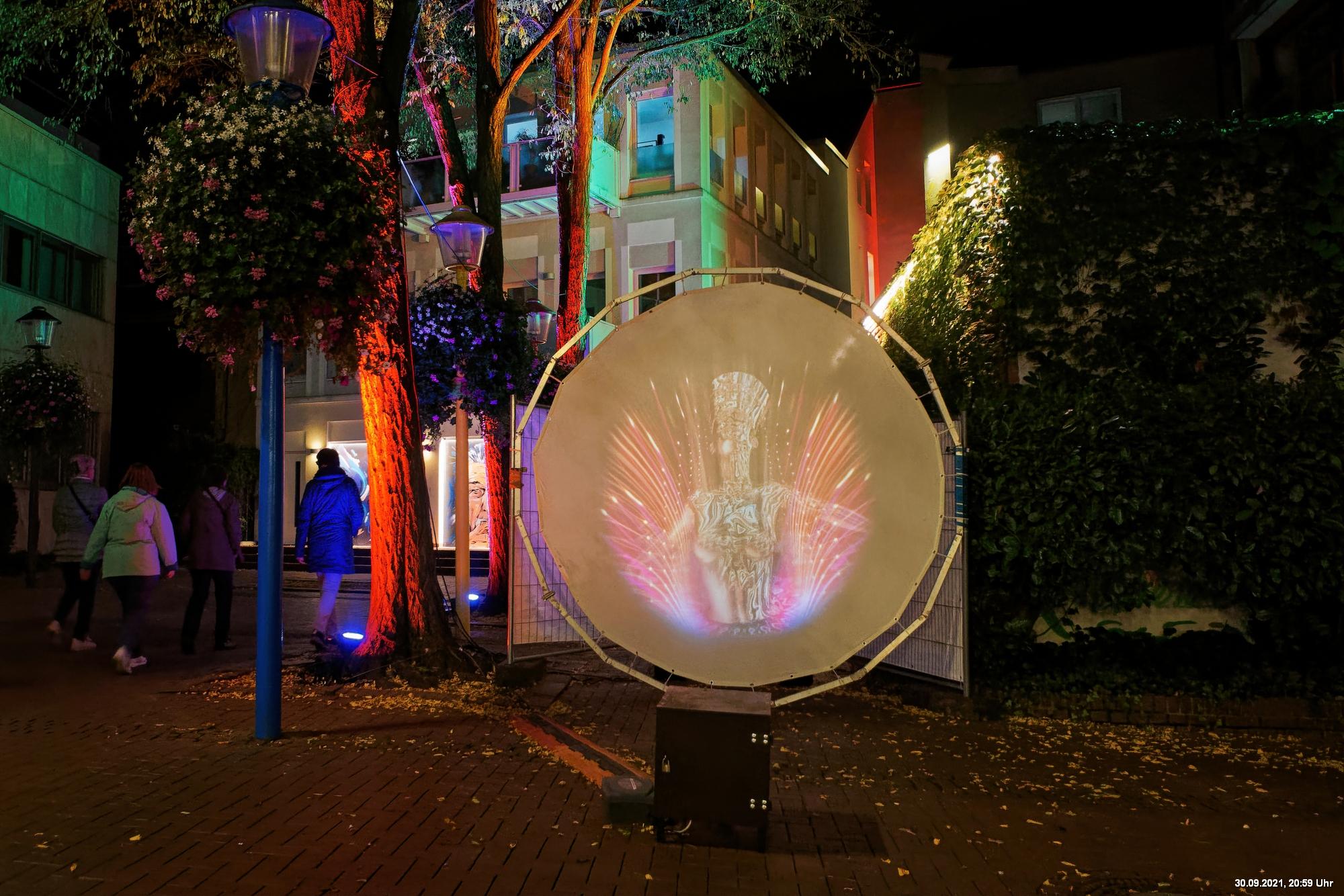 Dazu wurden wieder 10 „Künstler“ beauftragt, mit ihren Installationen „Goldstücke“ zu schaffen. Das ist diesmal reichlich misslungen! Liegt es an uns, dass wir im letzten Jahr das Gespür für Kunst verloren haben? Oder sind wir vielleicht schon zu satt? Oder hat sich hier mal wieder nur die 3. Garde ausgetobt? Da haben wir vor der Kirche Mariä Himmelfahrt fast 30 Minuten gewartet, weil niemand einen Schlüssel hatte. Dann sollten wir drinnen noch mal warten, bis man einzeln an dieses unfertig erscheinende Teil herantreten konnte, um die Gedanken der Künstlerin nachvollziehen zu können. Hä? Sollte hier Kunst gezeigt werden, oder ging es um Therapiestunden? Die Choreographie "Nebel und Objekte" war leidenschaftslos zusammengebaut und bestand aus Lautsprechern, in die Nebel über Plastikrohre hineinfiel. Das hätte jeder Schüler besser gemacht. Es sollte einen Ablauf von mehreren Installationen geben, von denen wir aber nur eine sehen konnte und die nachfolgenden in der "Pause" dran vorbeigingen. Dann gab es Schilder in "Baumarktqualität", die so unscheinbar waren, dass man dagegen stoßen musste, um sie zu entdecken. An St. Urbanus war keine Außenbeleuchtung erkennbar. Innen wurde die Decke angestrahlt mit Schriften, die aufgrund des Gewölbes und der viel zu kleinen Schrift kaum lesbar waren. Die 3-minütige Lichtshow bestand aus immer gleichen, langweiligen Bewegungen von Strahlern. Wir haben die "Langeweile" mit ein paar Fototricks überbrückt.