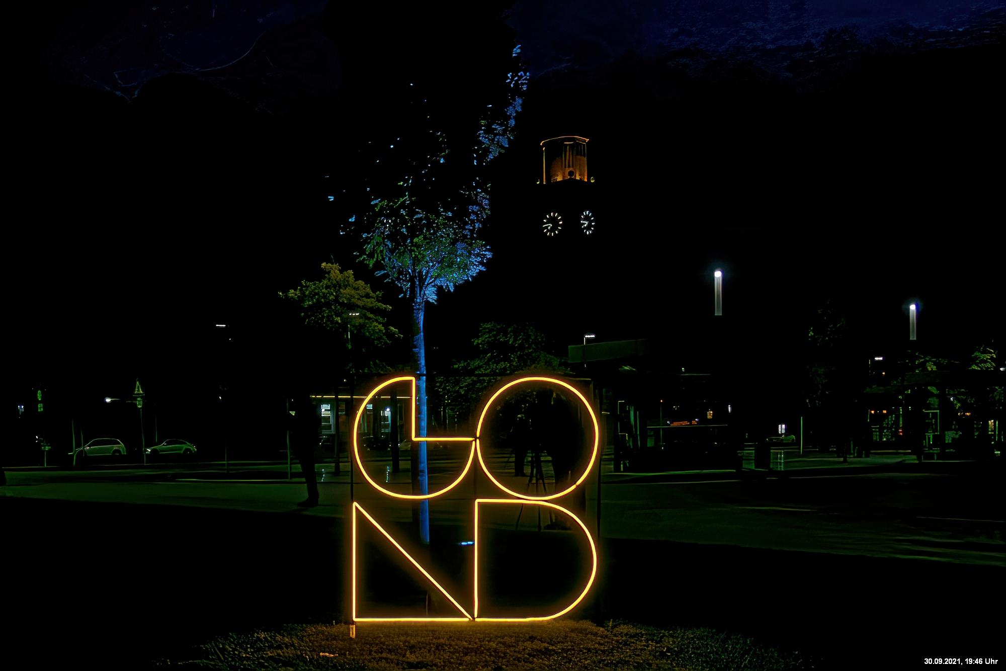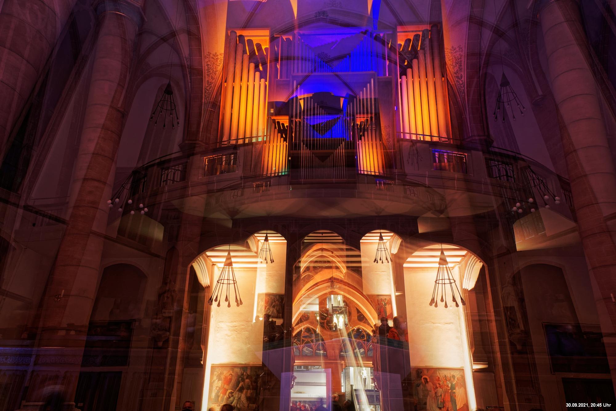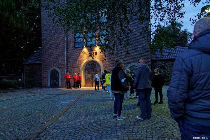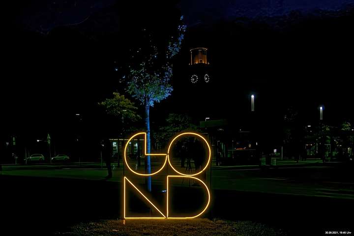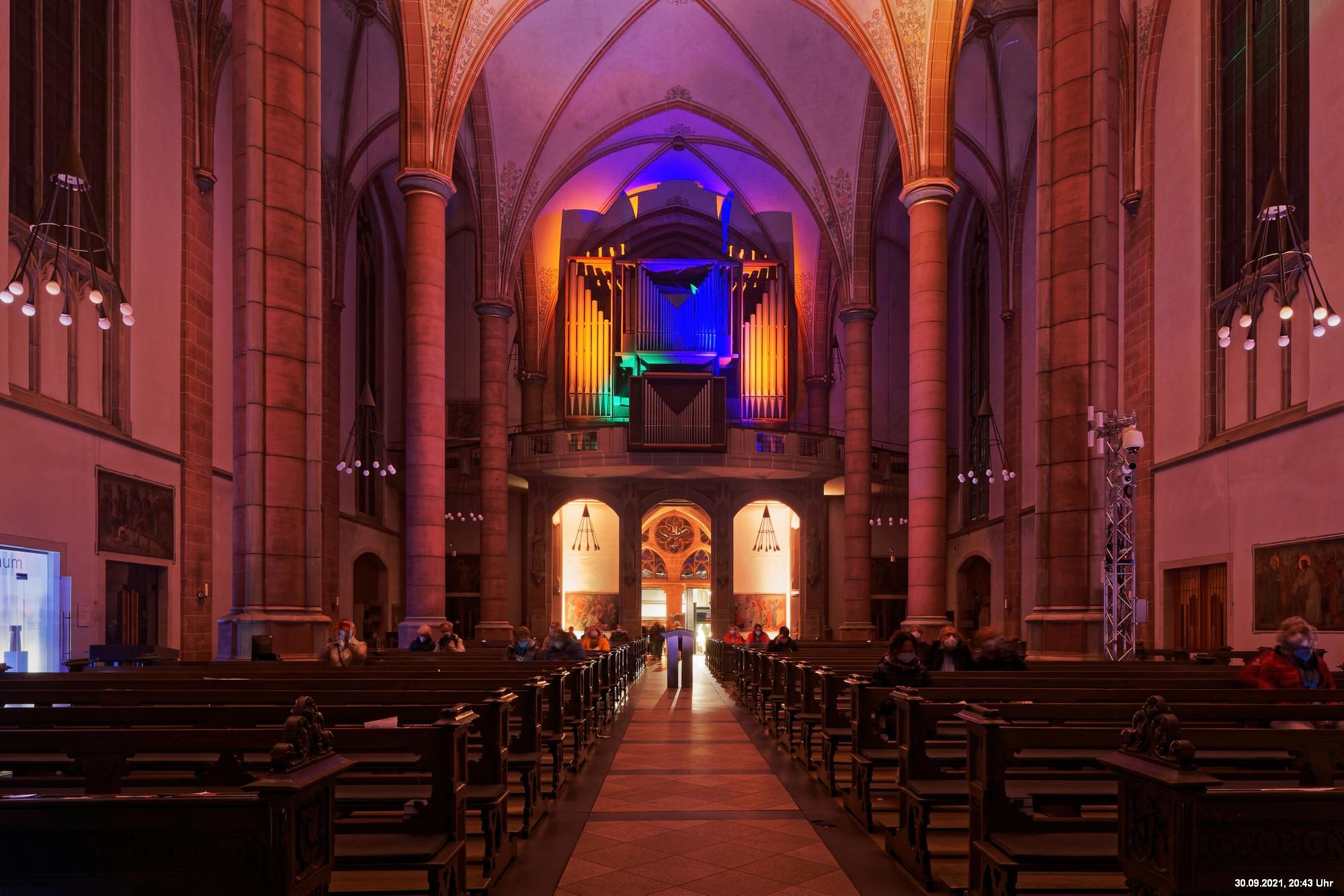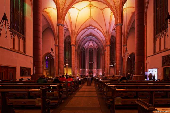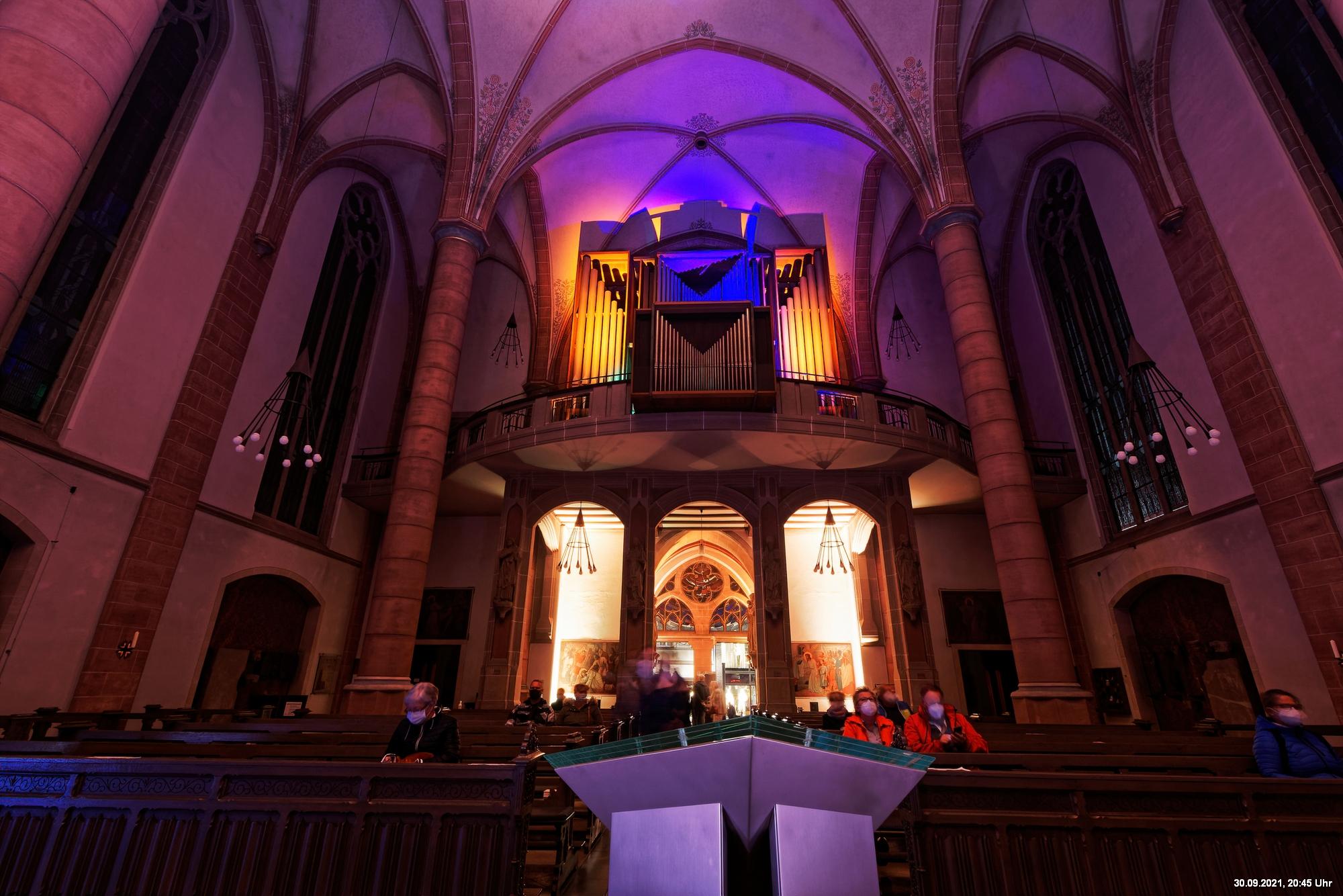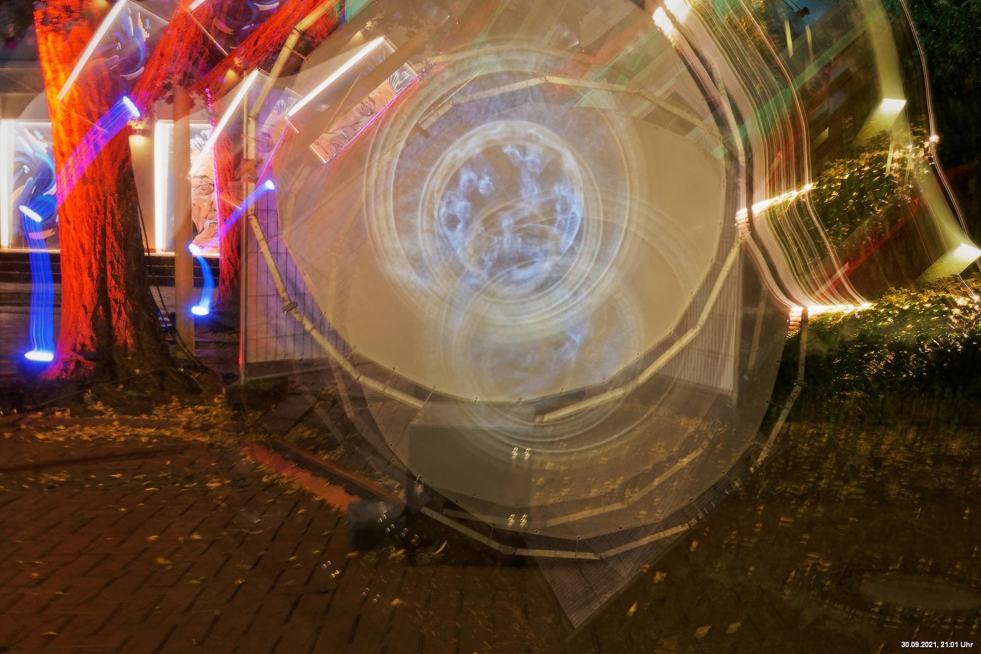 Dazu wurden wieder 10 „Künstler“ beauftragt, mit ihren Installationen „Goldstücke“ zu schaffen. Das ist diesmal reichlich misslungen! Liegt es an uns, dass wir im letzten Jahr das Gespür für Kunst verloren haben? Oder sind wir vielleicht schon zu satt? Oder hat sich hier mal wieder nur die 3. Garde ausgetobt? Da haben wir vor der Kirche Mariä Himmelfahrt fast 30 Minuten gewartet, weil niemand einen Schlüssel hatte. Dann sollten wir drinnen noch mal warten, bis man einzeln an dieses unfertig erscheinende Teil herantreten konnte, um die Gedanken der Künstlerin nachvollziehen zu können. Hä? Sollte hier Kunst gezeigt werden, oder ging es um Therapiestunden? Die Choreographie "Nebel und Objekte" war leidenschaftslos zusammengebaut und bestand aus Lautsprechern, in die Nebel über Plastikrohre hineinfiel. Das hätte jeder Schüler besser gemacht. Es sollte einen Ablauf von mehreren Installationen geben, von denen wir aber nur eine sehen konnte und die nachfolgenden in der "Pause" dran vorbeigingen. Dann gab es Schilder in "Baumarktqualität", die so unscheinbar waren, dass man dagegen stoßen musste, um sie zu entdecken. An St. Urbanus war keine Außenbeleuchtung erkennbar. Innen wurde die Decke angestrahlt mit Schriften, die aufgrund des Gewölbes und der viel zu kleinen Schrift kaum lesbar waren. Die 3-minütige Lichtshow bestand aus immer gleichen, langweiligen Bewegungen von Strahlern. Wir haben die "Langeweile" mit ein paar Fototricks überbrückt.