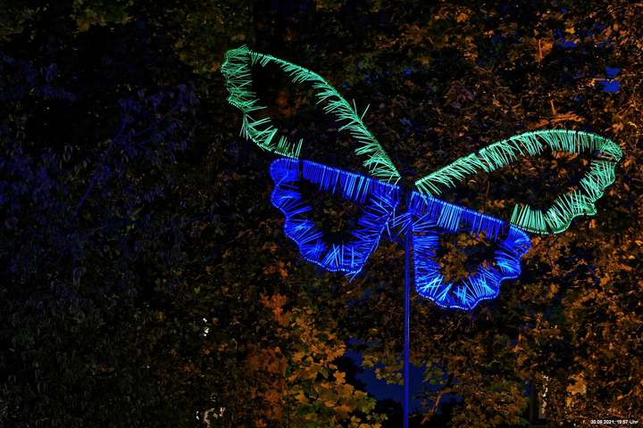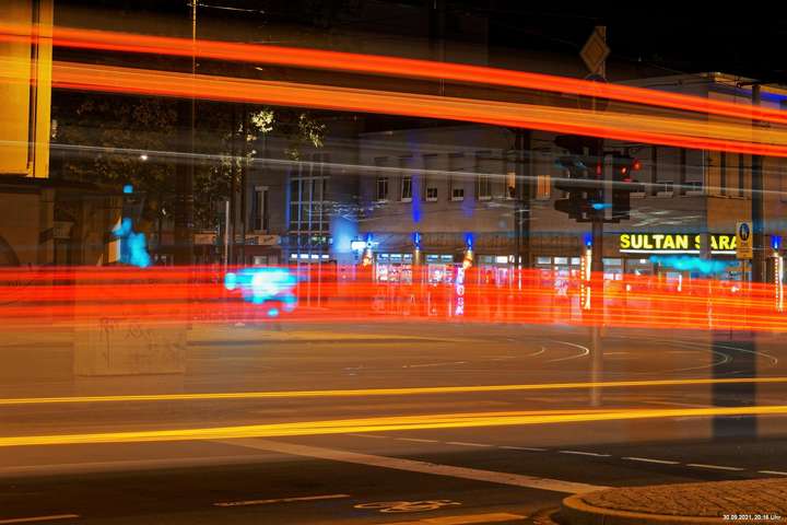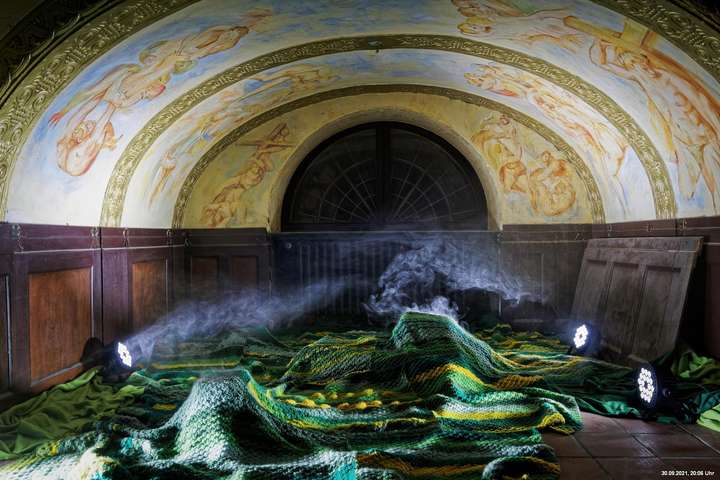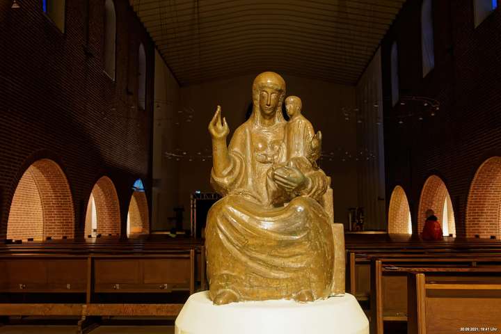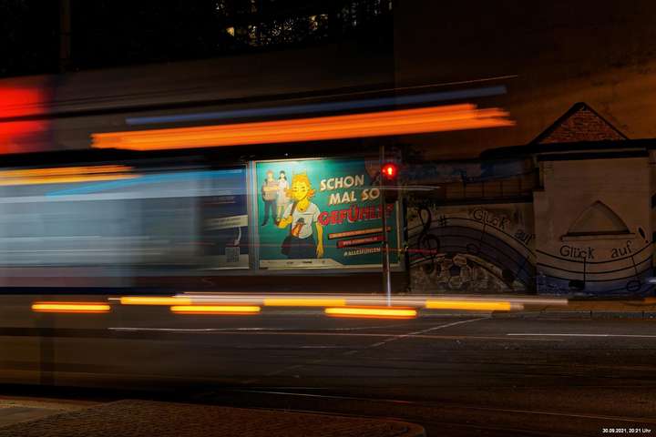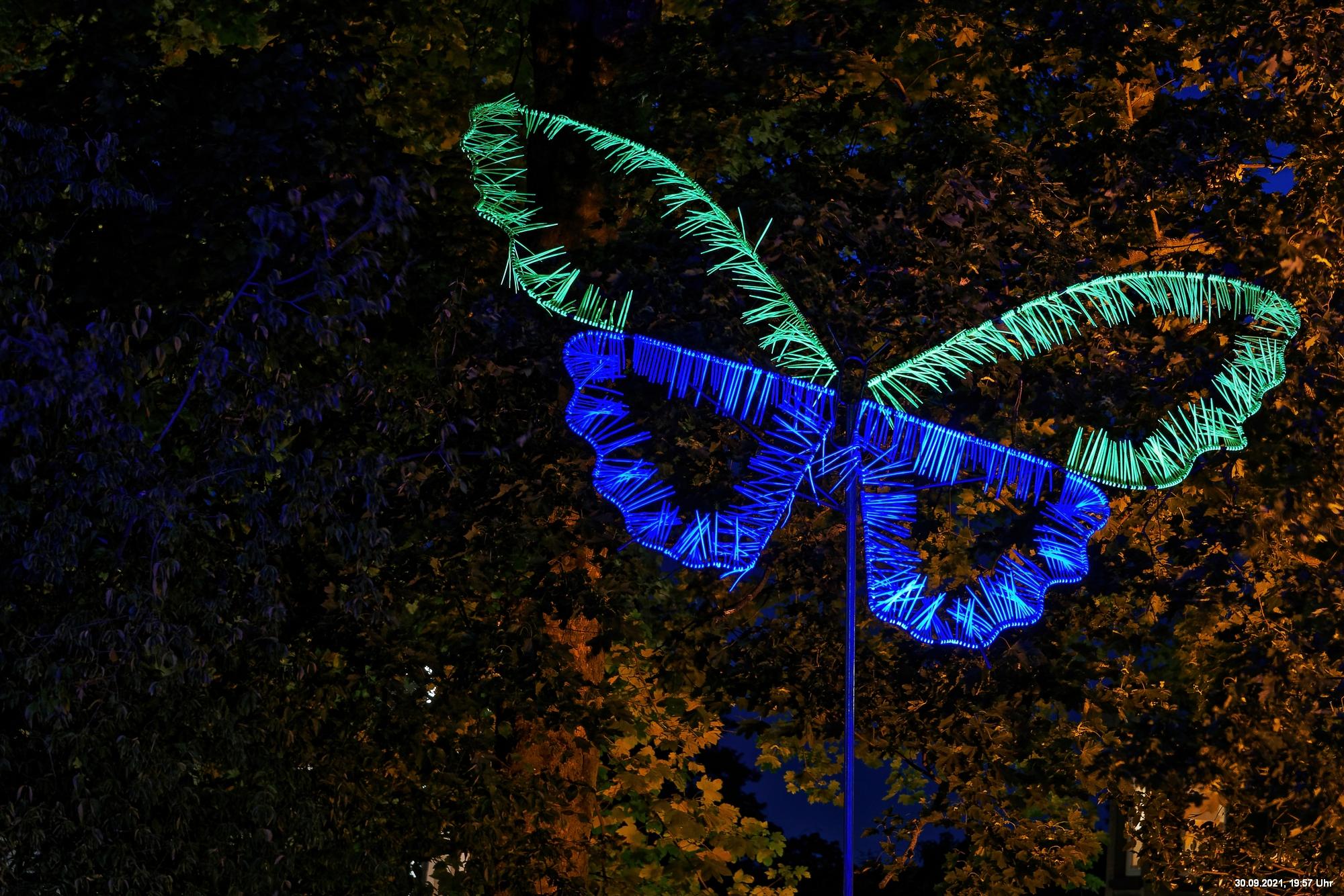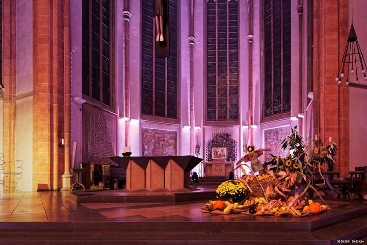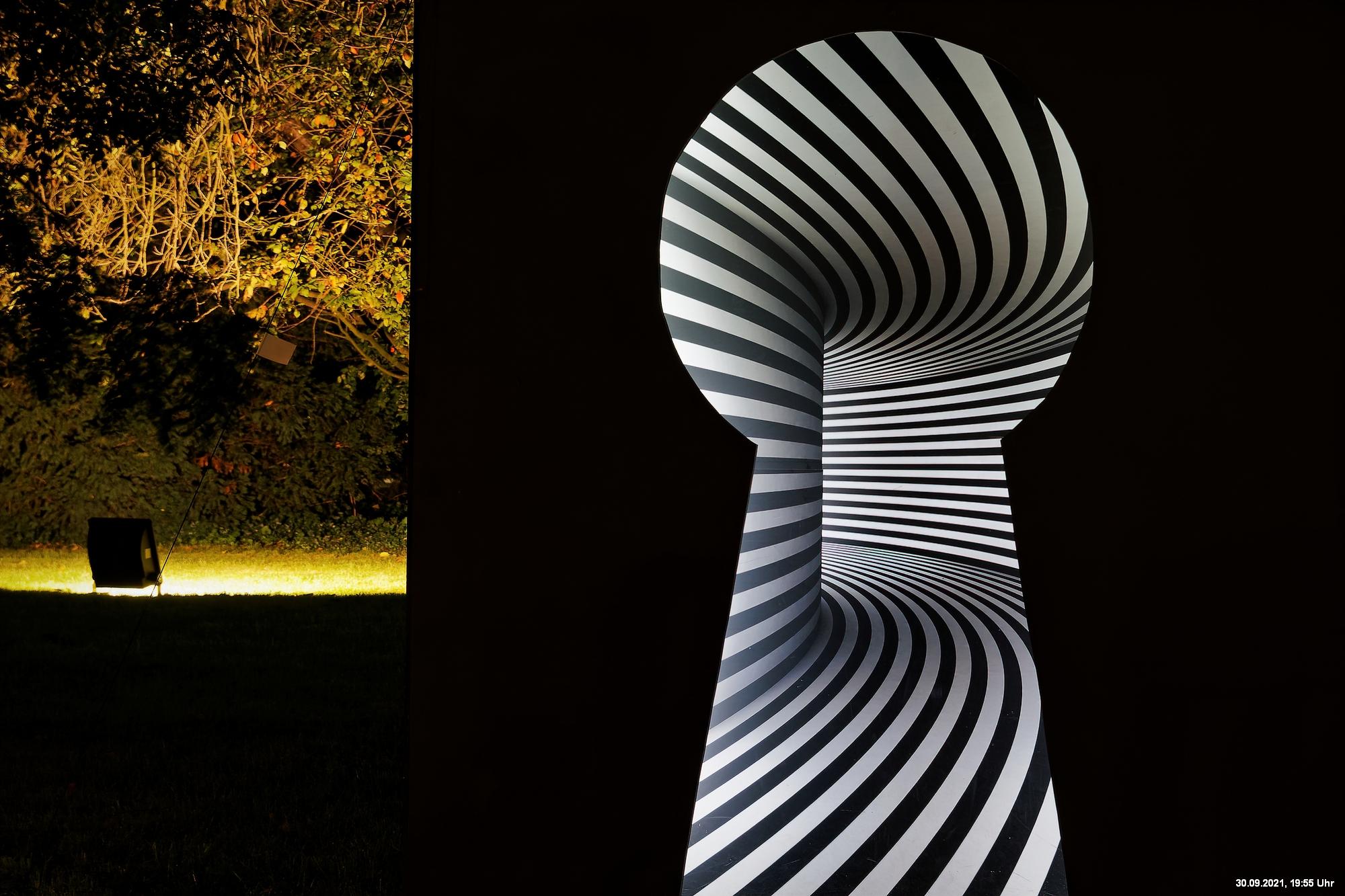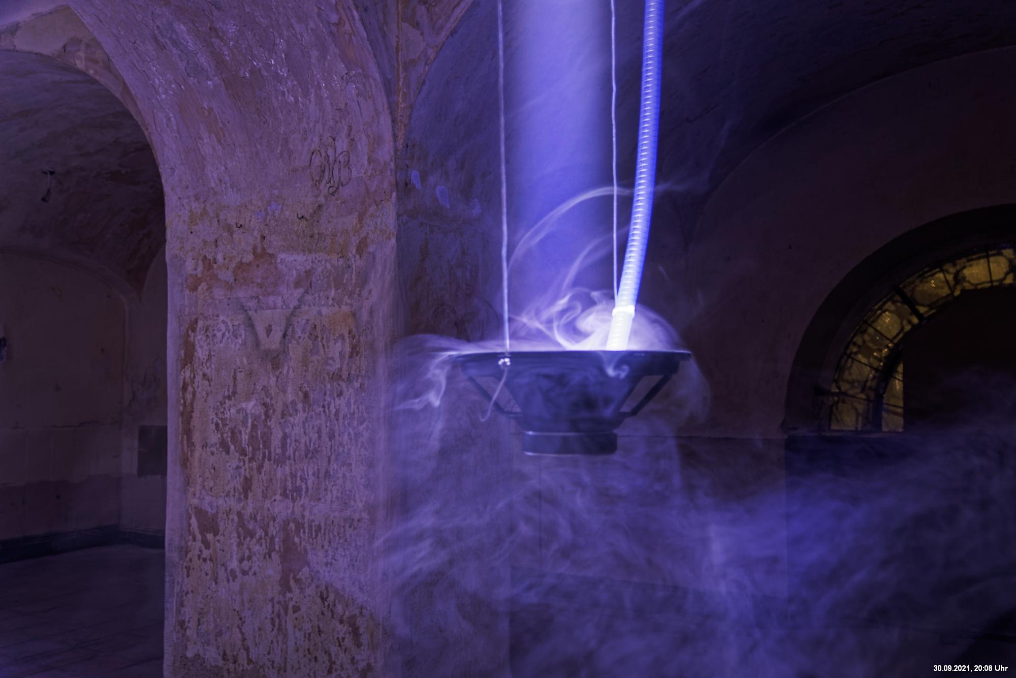 Dazu wurden wieder 10 „Künstler“ beauftragt, mit ihren Installationen „Goldstücke“ zu schaffen. Das ist diesmal reichlich misslungen! Liegt es an uns, dass wir im letzten Jahr das Gespür für Kunst verloren haben? Oder sind wir vielleicht schon zu satt? Oder hat sich hier mal wieder nur die 3. Garde ausgetobt? Da haben wir vor der Kirche Mariä Himmelfahrt fast 30 Minuten gewartet, weil niemand einen Schlüssel hatte. Dann sollten wir drinnen noch mal warten, bis man einzeln an dieses unfertig erscheinende Teil herantreten konnte, um die Gedanken der Künstlerin nachvollziehen zu können. Hä? Sollte hier Kunst gezeigt werden, oder ging es um Therapiestunden? Die Choreographie "Nebel und Objekte" war leidenschaftslos zusammengebaut und bestand aus Lautsprechern, in die Nebel über Plastikrohre hineinfiel. Das hätte jeder Schüler besser gemacht. Es sollte einen Ablauf von mehreren Installationen geben, von denen wir aber nur eine sehen konnte und die nachfolgenden in der "Pause" dran vorbeigingen. Dann gab es Schilder in "Baumarktqualität", die so unscheinbar waren, dass man dagegen stoßen musste, um sie zu entdecken. An St. Urbanus war keine Außenbeleuchtung erkennbar. Innen wurde die Decke angestrahlt mit Schriften, die aufgrund des Gewölbes und der viel zu kleinen Schrift kaum lesbar waren. Die 3-minütige Lichtshow bestand aus immer gleichen, langweiligen Bewegungen von Strahlern. Wir haben die "Langeweile" mit ein paar Fototricks überbrückt.