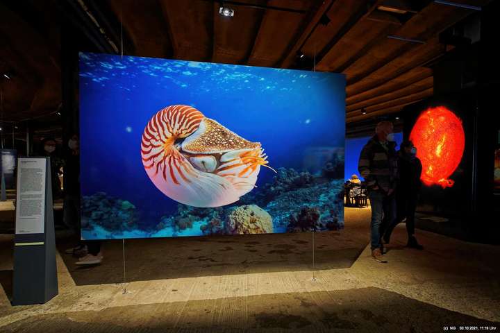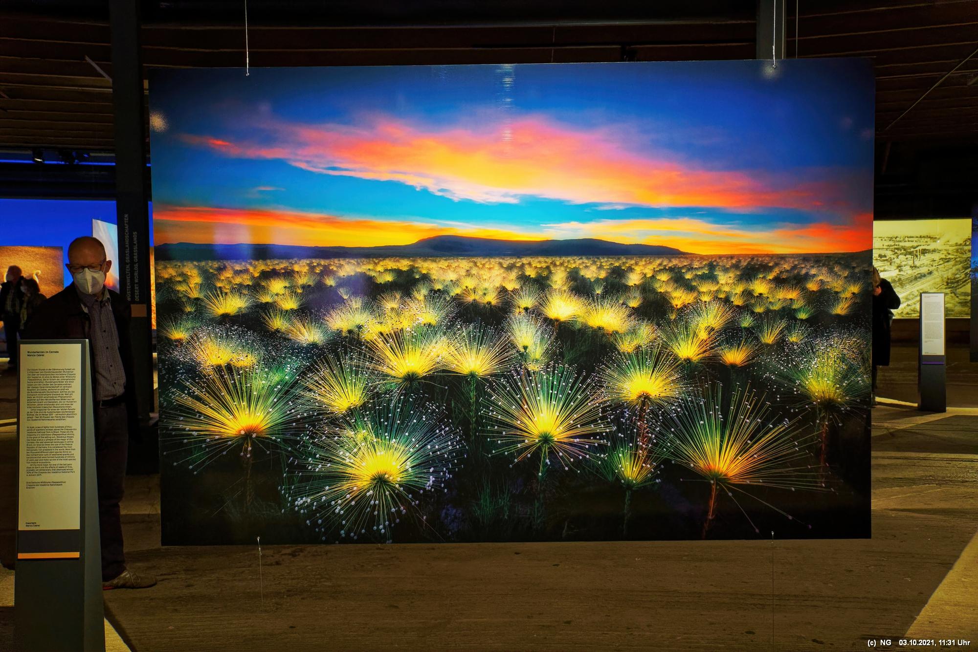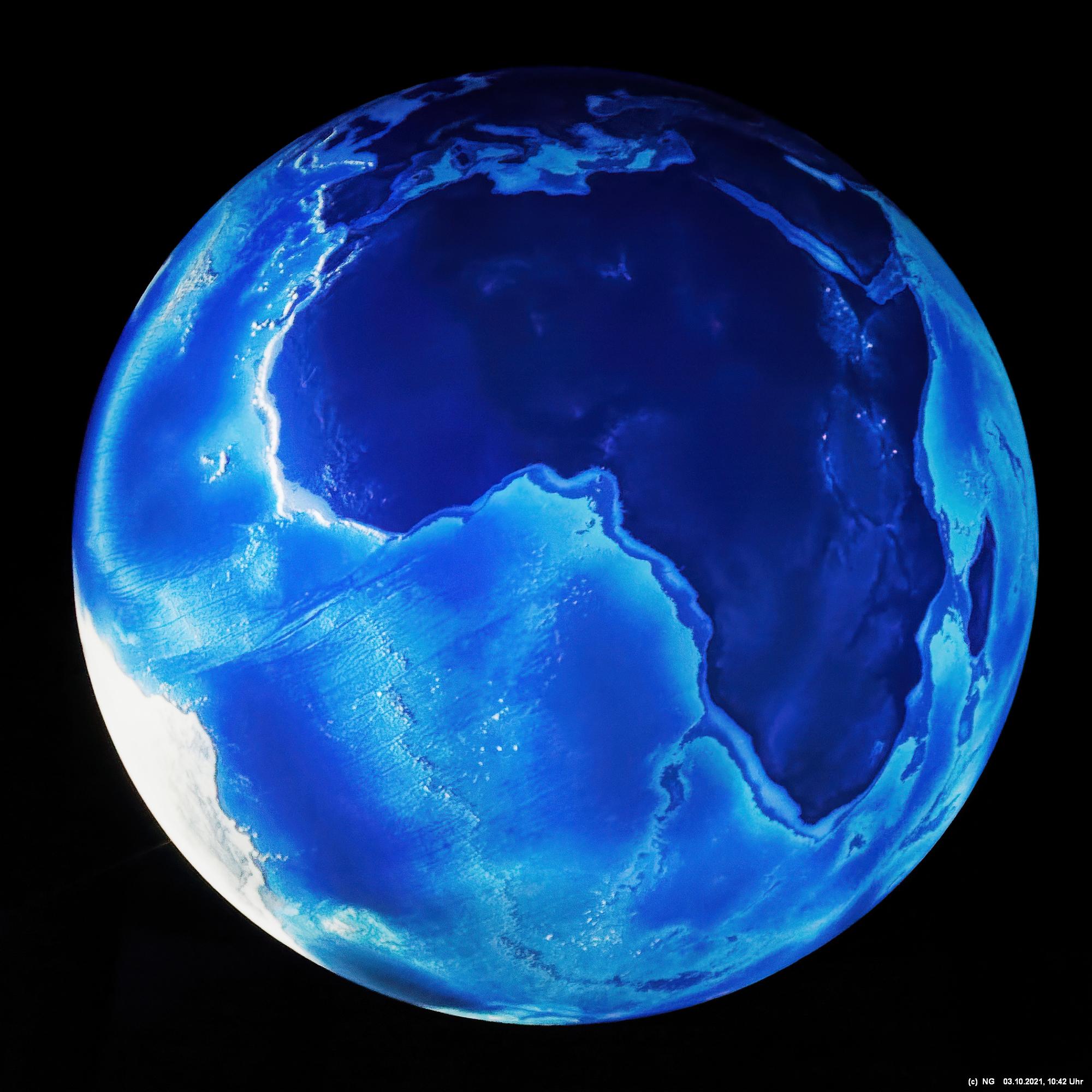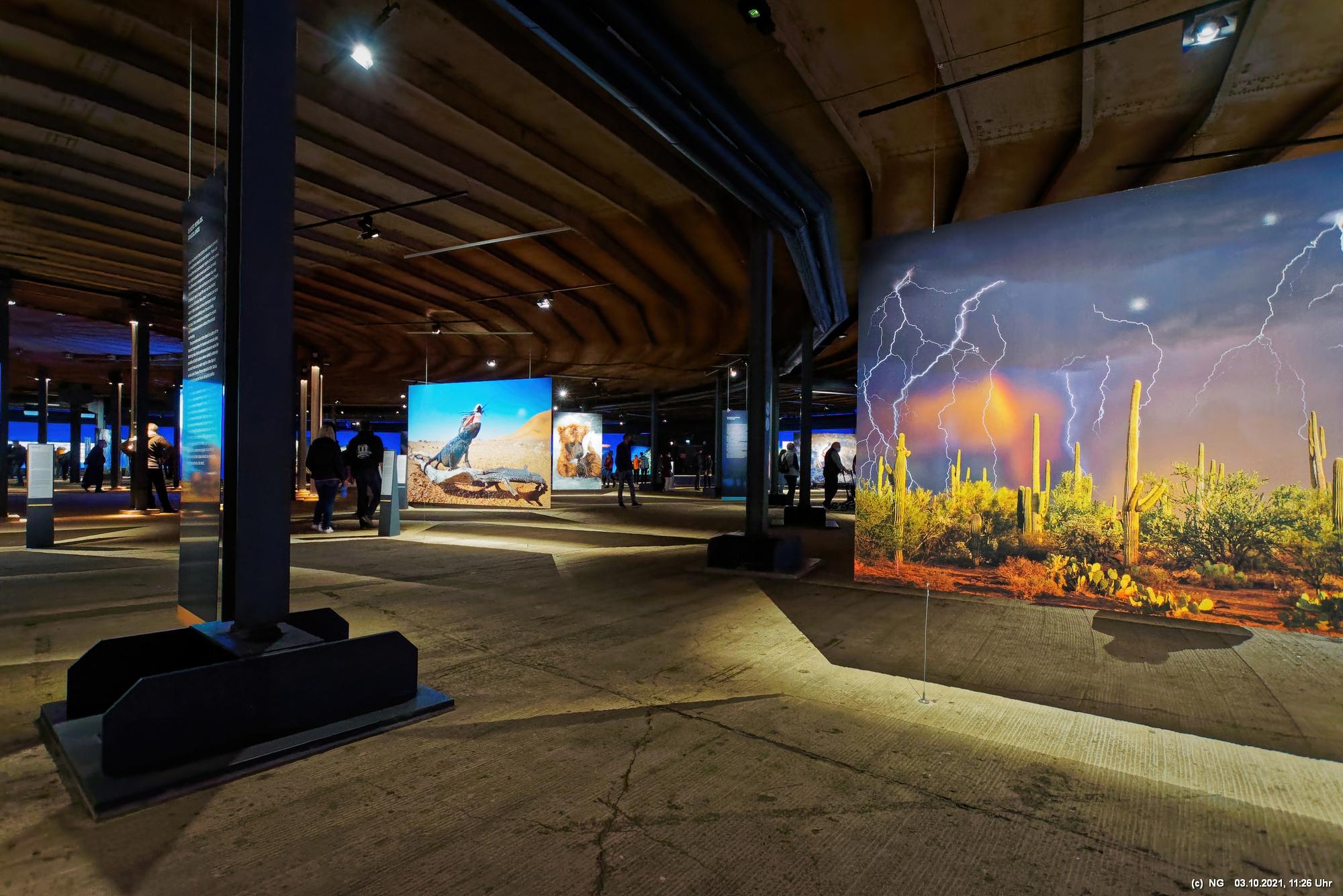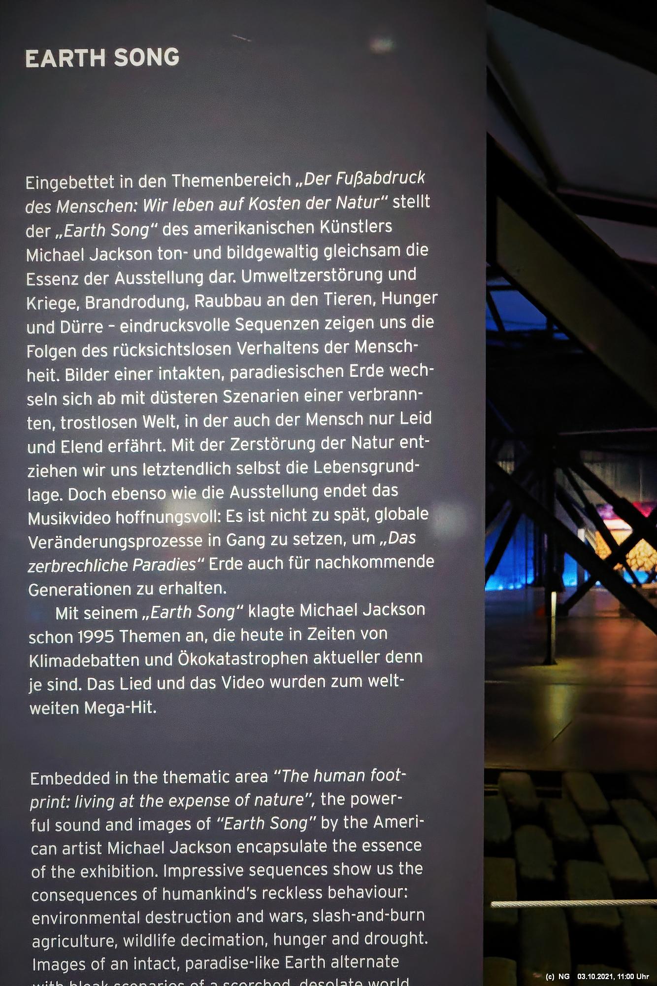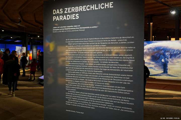 Die Ausstellung "Das zerbrechliche Paradies" zeigt auf rund 150 Bildern die Schönheiten der Schöpfung, aber auch die Folgen der menschlichen Ausbeutung. Neben den wunderbaren, meist preisgekrönten Fotos schwebte wieder die Erde in dem 100 m hohen Raum. Die Projektionen waren jetzt noch perfekter und hochauflösender, als vor einigen Jahren. Wenn man mit dem Glasaufzug in fast 100 m Höhe fährt, erlebt man sich als Astronaut - man rast an der Erde vorbei und es kribbelt im Bauch.