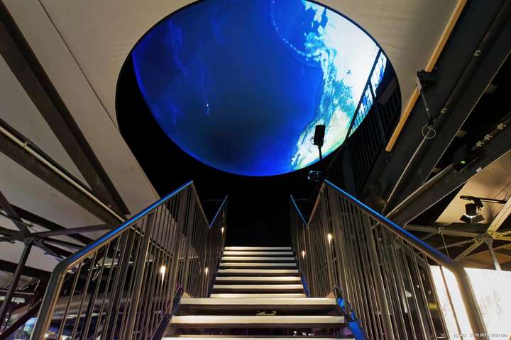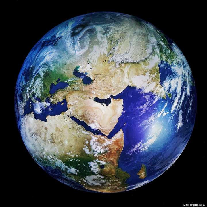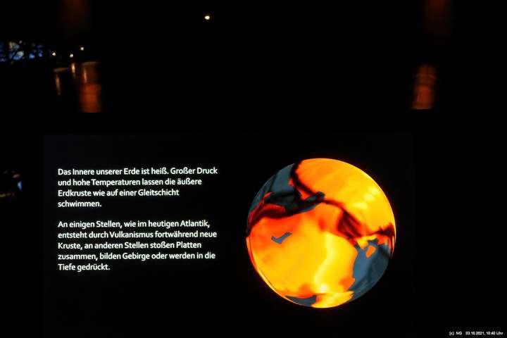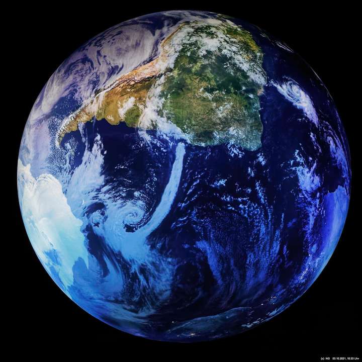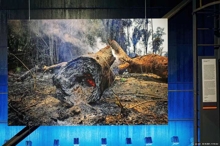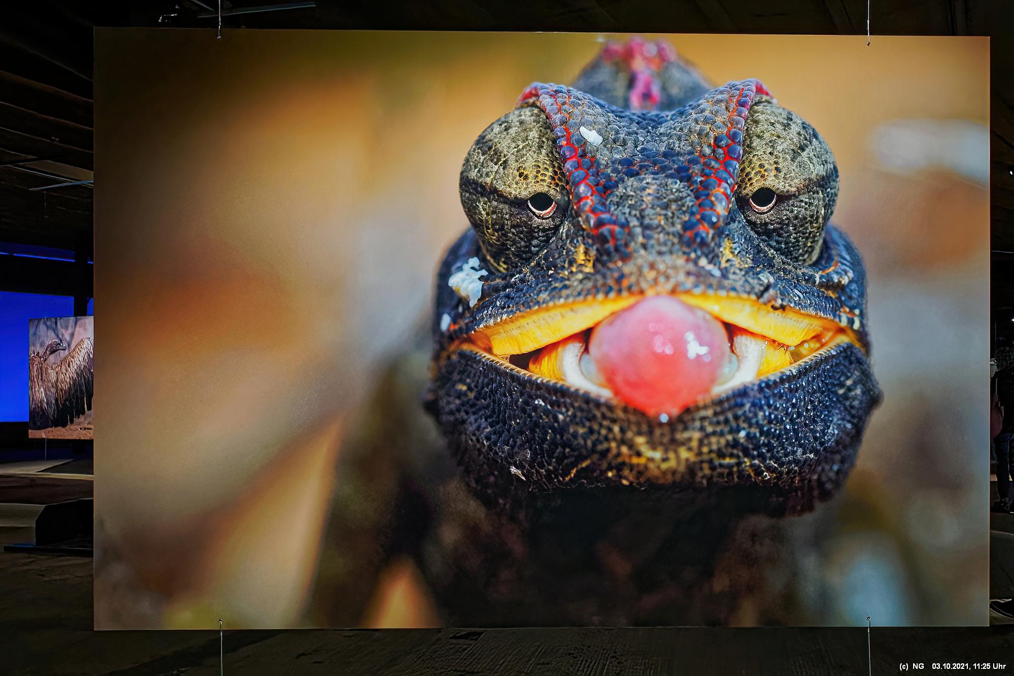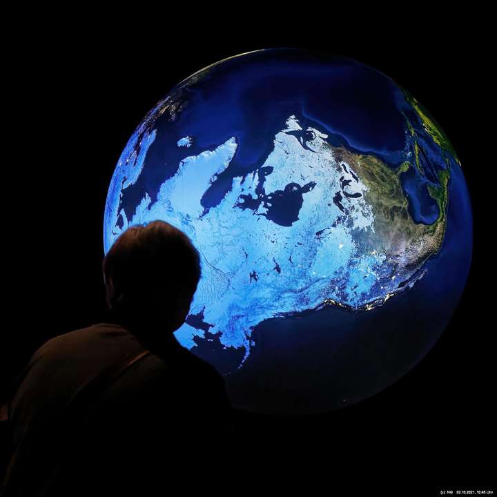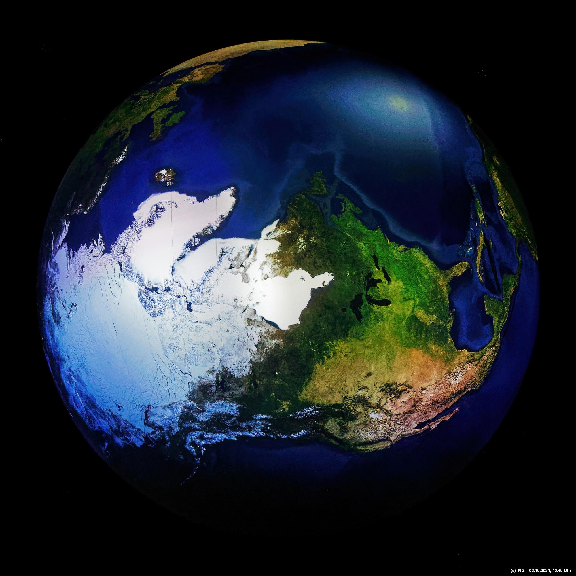 Die Ausstellung "Das zerbrechliche Paradies" zeigt auf rund 150 Bildern die Schönheiten der Schöpfung, aber auch die Folgen der menschlichen Ausbeutung. Neben den wunderbaren, meist preisgekrönten Fotos schwebte wieder die Erde in dem 100 m hohen Raum. Die Projektionen waren jetzt noch perfekter und hochauflösender, als vor einigen Jahren. Wenn man mit dem Glasaufzug in fast 100 m Höhe fährt, erlebt man sich als Astronaut - man rast an der Erde vorbei und es kribbelt im Bauch.