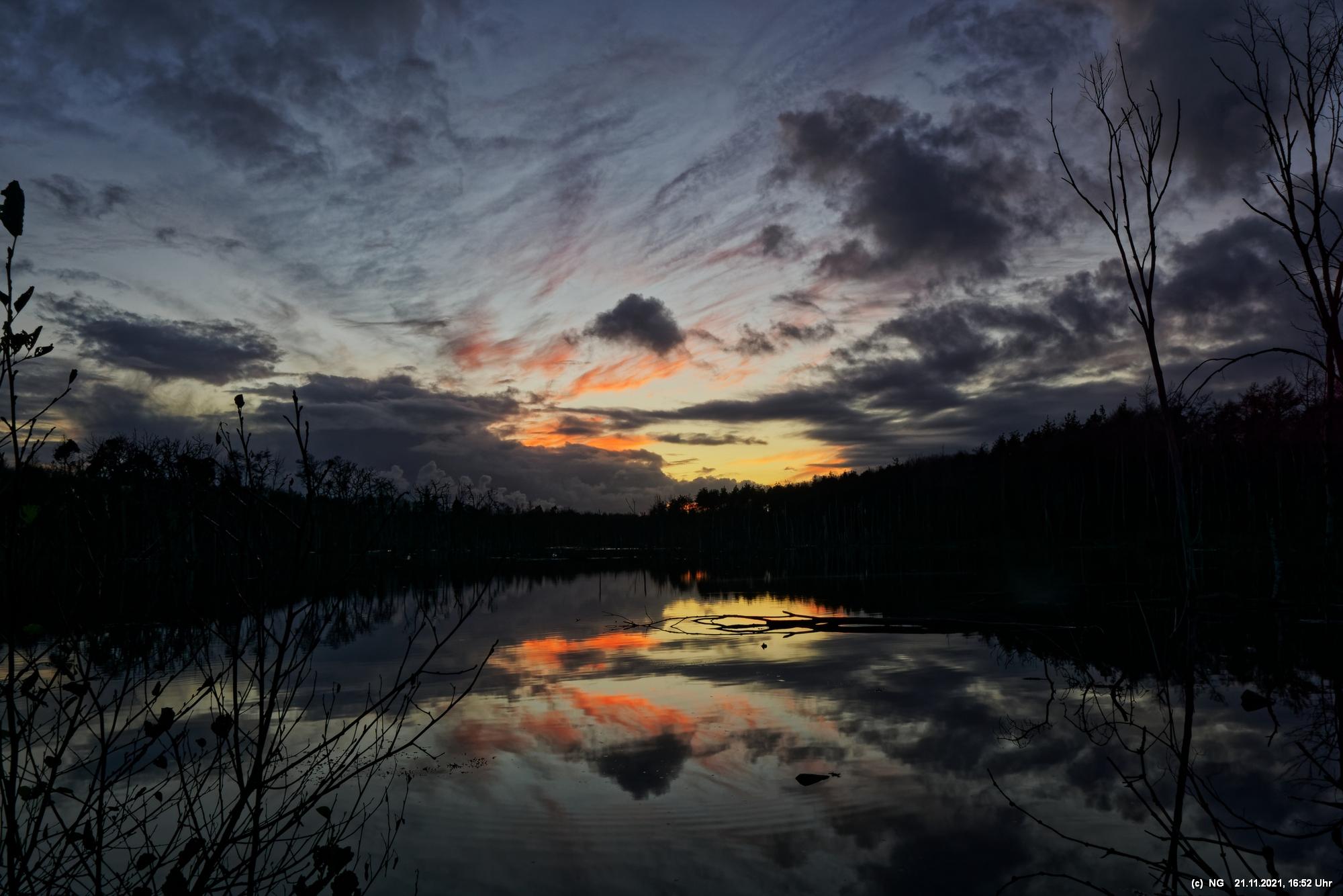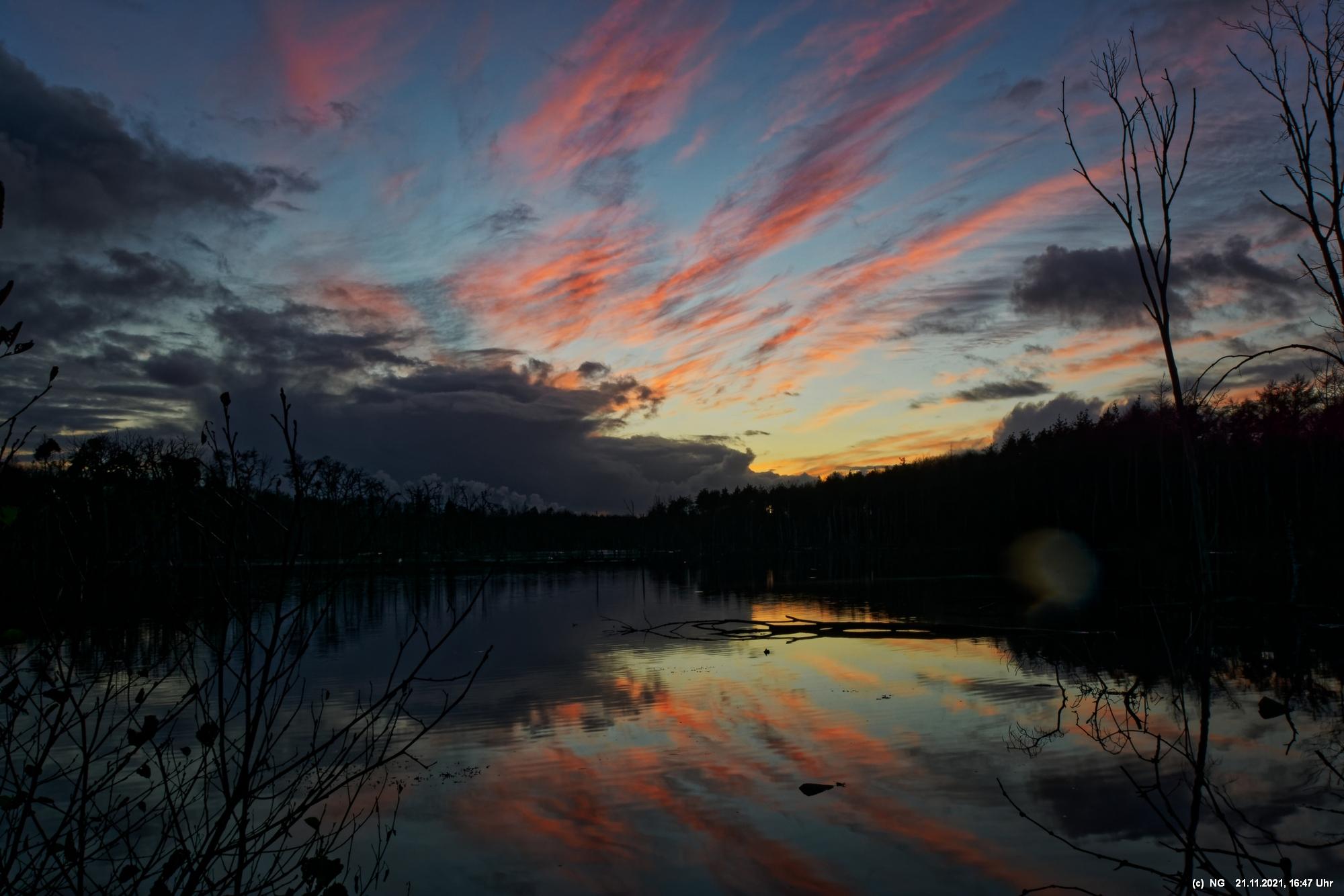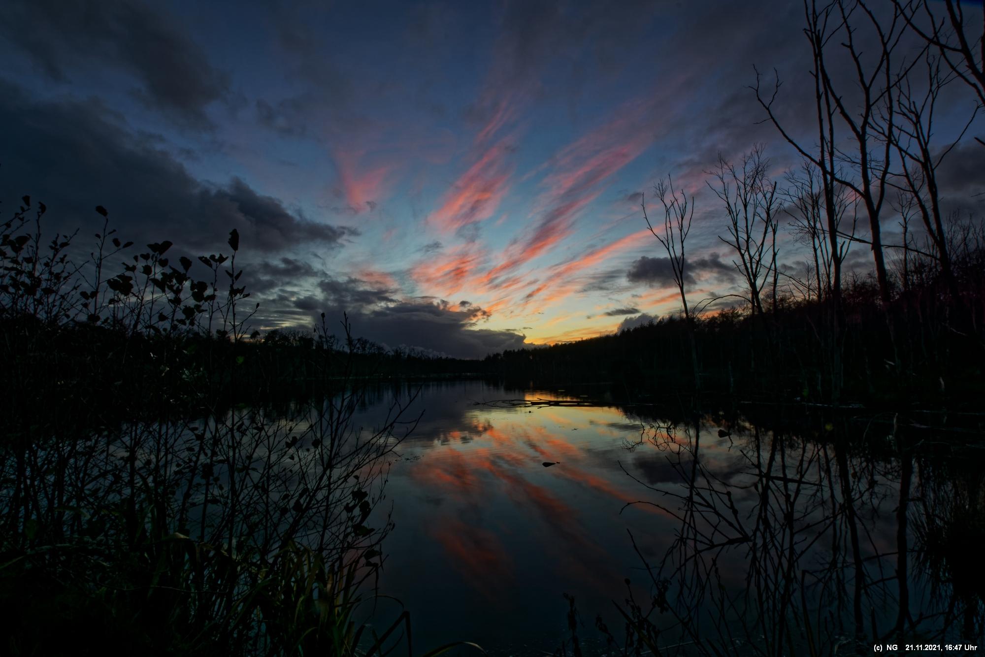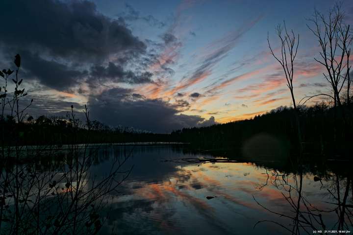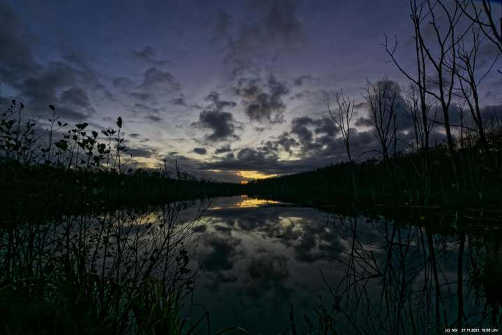 Seit Wochen versuchen Fotofreund Thomas Lizala (Revierblicke) und ich einen passenden Termin am Pfingstsee zum Sonnenuntergang zu finden. Jedes Mal kam irgendetwas dazwischen. Das Wetter hielt sich nicht an die Prognosen und die Wolken zogen erst eine halbe Stunde nach Sonnenuntergang ab - und so. Heute war es prächtig. Die Prognose bestens und das Radar auf unserer Seite. Nur - direkt zum eigentlichen Sonnenuntergang schob sich eine einzige dicke Wolke davor.