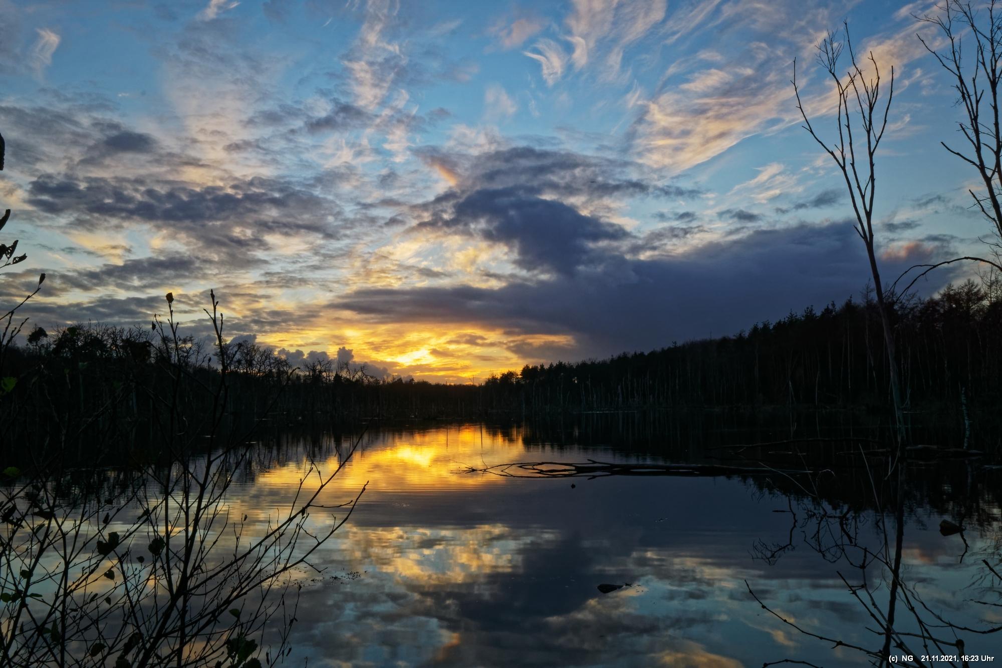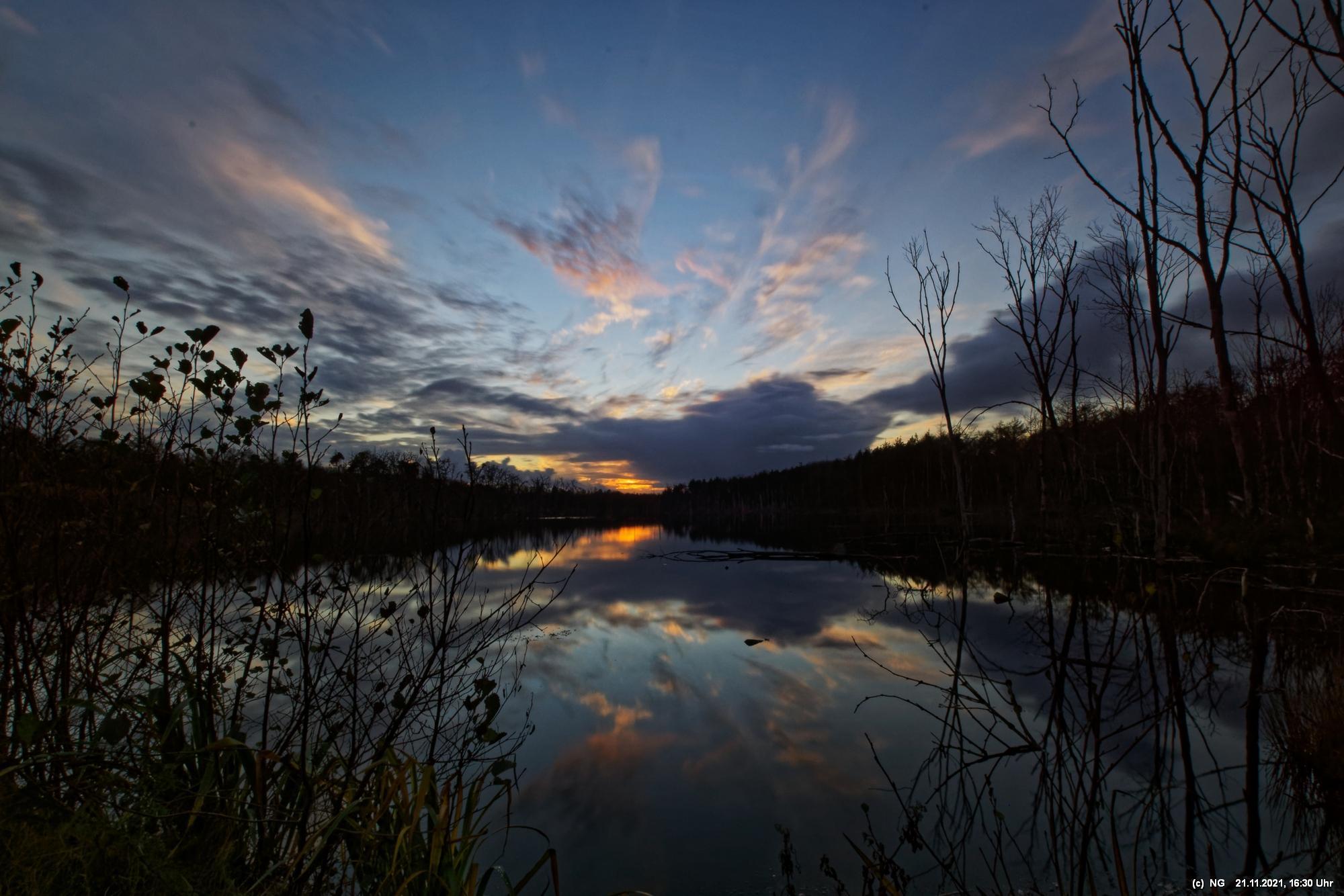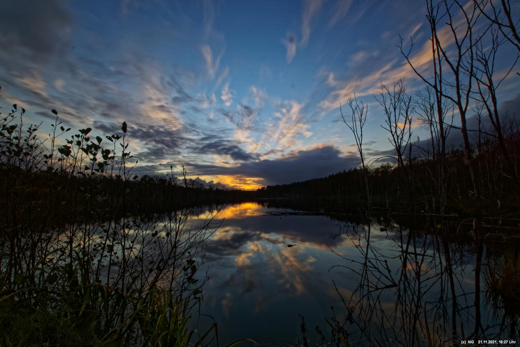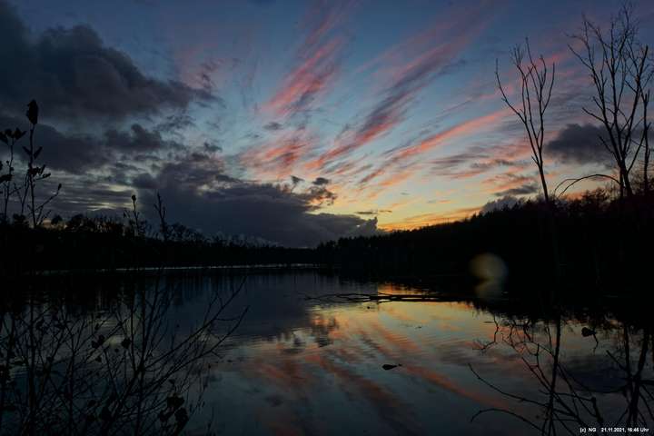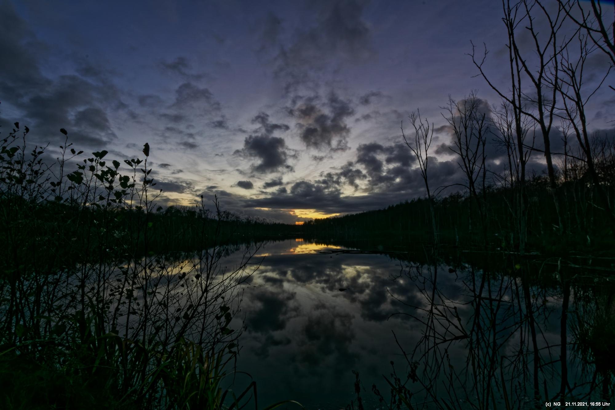 Seit Wochen versuchen Fotofreund Thomas Lizala (Revierblicke) und ich einen passenden Termin am Pfingstsee zum Sonnenuntergang zu finden. Jedes Mal kam irgendetwas dazwischen. Das Wetter hielt sich nicht an die Prognosen und die Wolken zogen erst eine halbe Stunde nach Sonnenuntergang ab - und so. Heute war es prächtig. Die Prognose bestens und das Radar auf unserer Seite. Nur - direkt zum eigentlichen Sonnenuntergang schob sich eine einzige dicke Wolke davor.