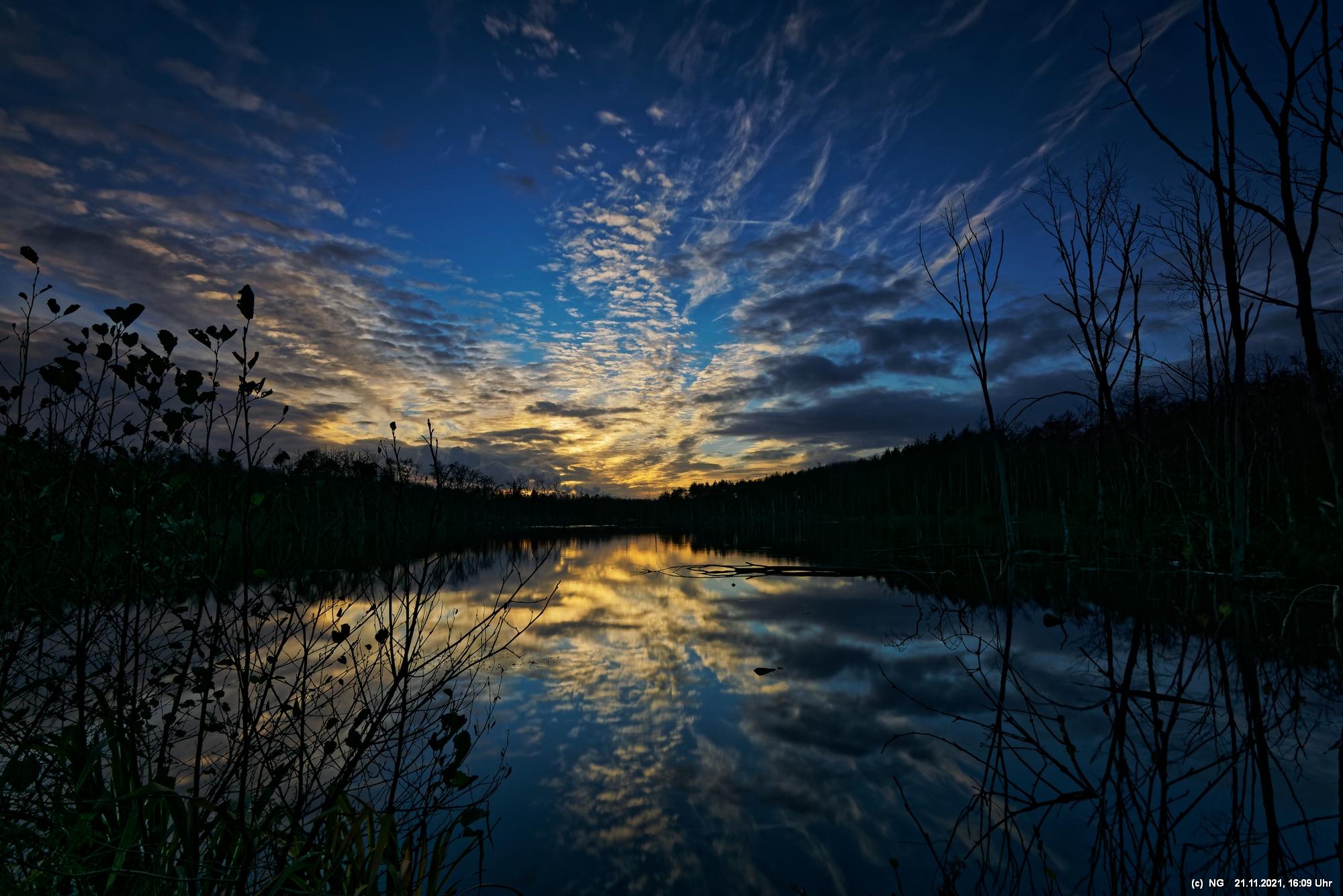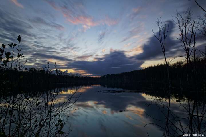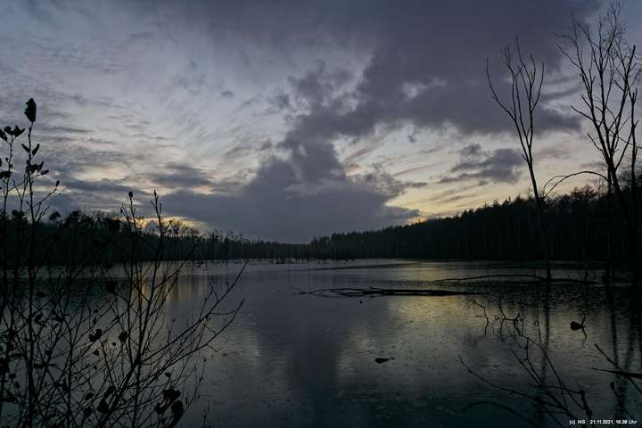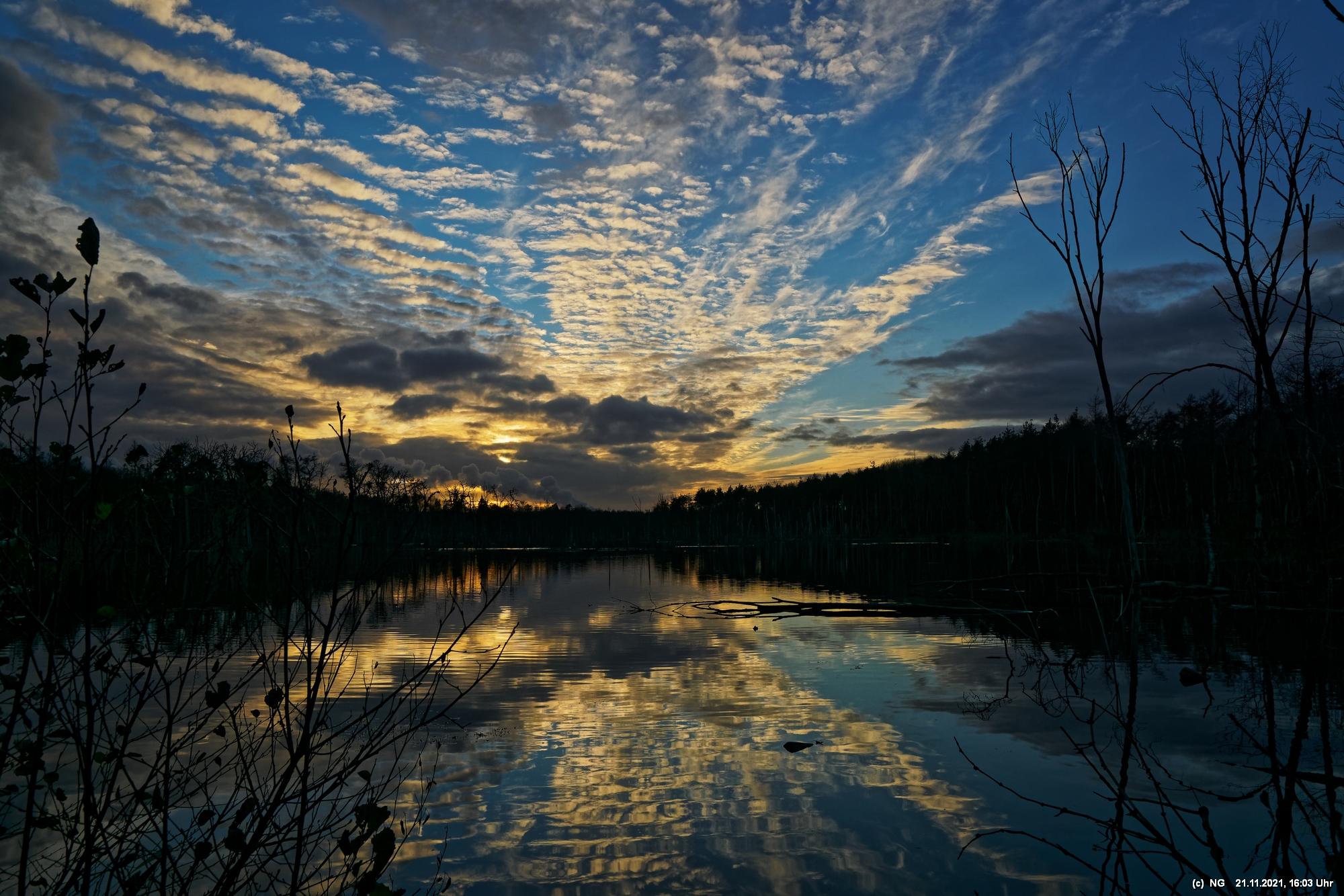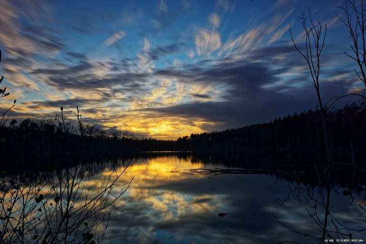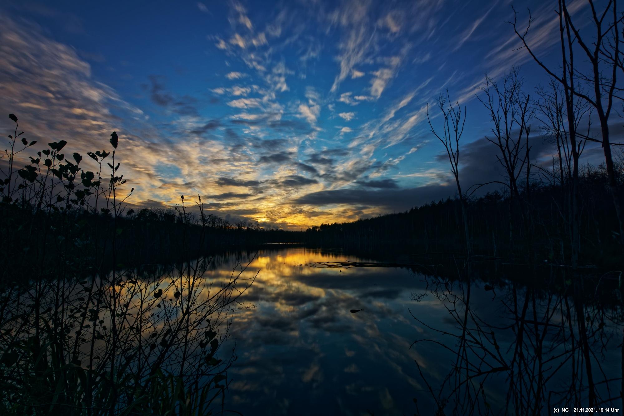 Seit Wochen versuchen Fotofreund Thomas Lizala (Revierblicke) und ich einen passenden Termin am Pfingstsee zum Sonnenuntergang zu finden. Jedes Mal kam irgendetwas dazwischen. Das Wetter hielt sich nicht an die Prognosen und die Wolken zogen erst eine halbe Stunde nach Sonnenuntergang ab - und so. Heute war es prächtig. Die Prognose bestens und das Radar auf unserer Seite. Nur - direkt zum eigentlichen Sonnenuntergang schob sich eine einzige dicke Wolke davor.