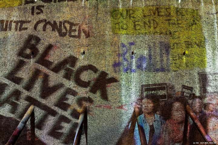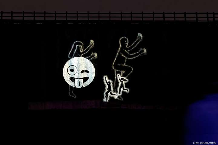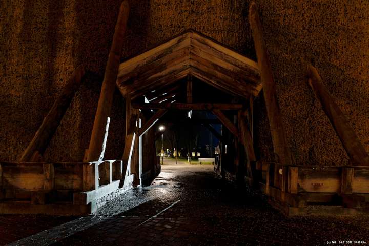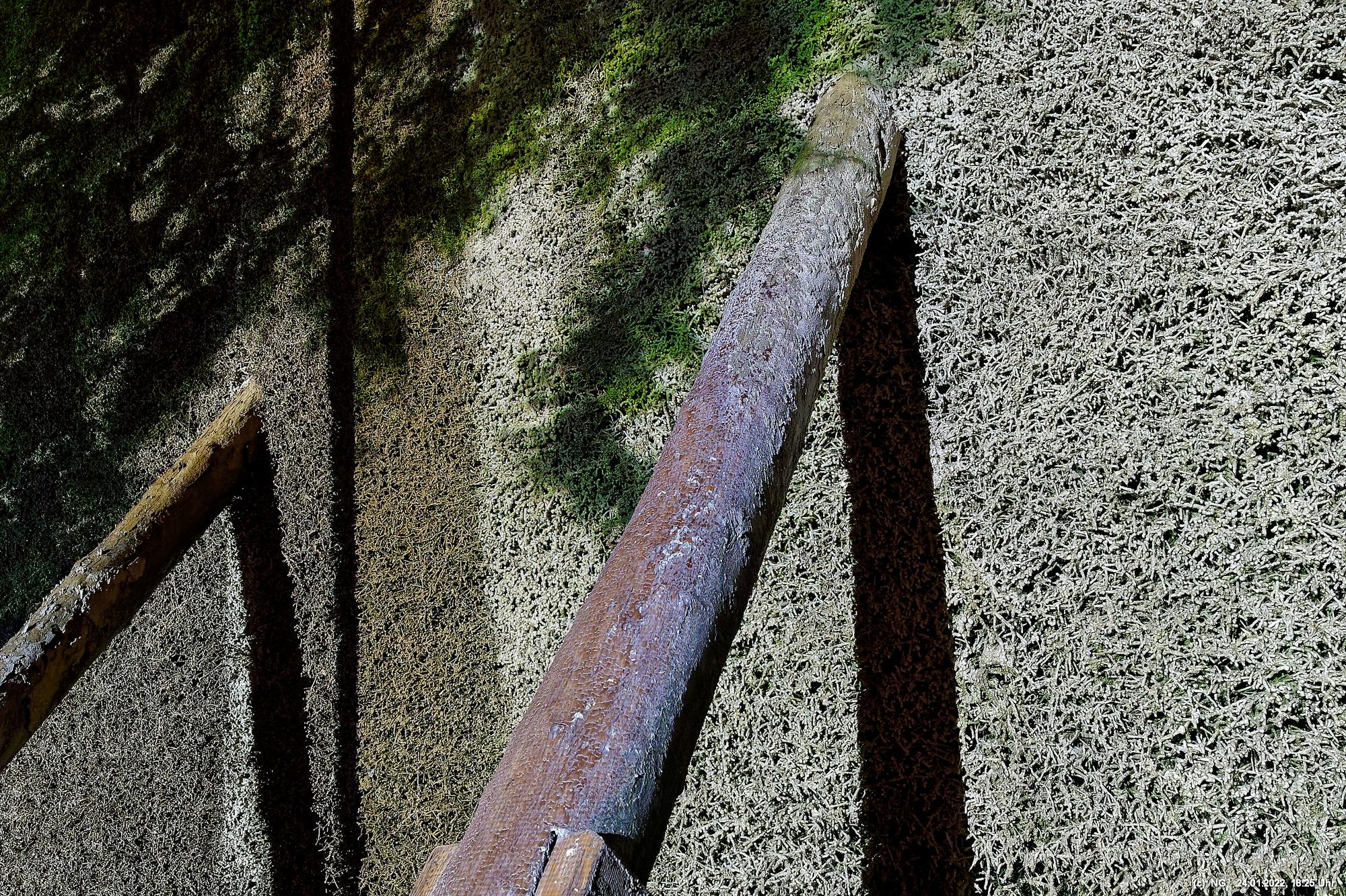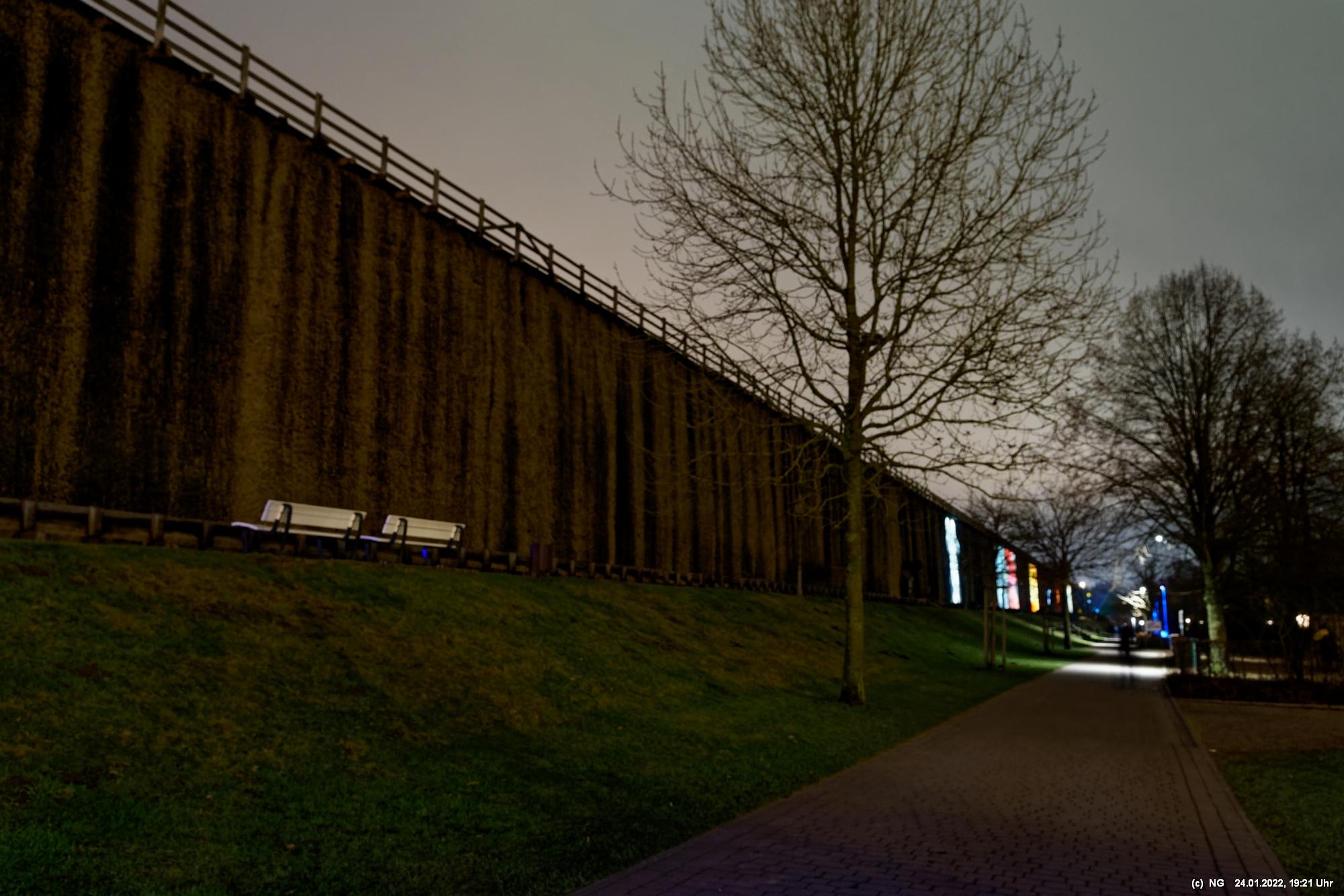 Die etwa 10.000 m² großen Wände aus Dornenzweigen lassen das Licht brillanter erstrahlen als jede andere Fläche, obwohl es doch ziemlich dunkel war. Zudem kommt es durch die vielen salzumantelten Schwarzdornzweige zu einzigartigen Schattierungen - ein ungewohntes Bild! Es werden nur Videos präsentiert. Die Bewegungen einzufangen, ist für Fotografen sehr schwierig. Für Fachleute: ISO bis 10.000. Die Filme sind teils ansprechend, teils aber auch befremdlich. Horrorszenen können wir in der Umgebung nicht ertragen. Auf der einen Seite war die rund 400 m lange Wand mit einem durchgehenden Breitpanorama-Video bespielt. An einer Kopfseite wurden kleine Hüpfer von Besuchern aufgenommen und auf der Wand dann wie ein Flug nach oben präsentiert. Das war ungewöhnlich und witzig.