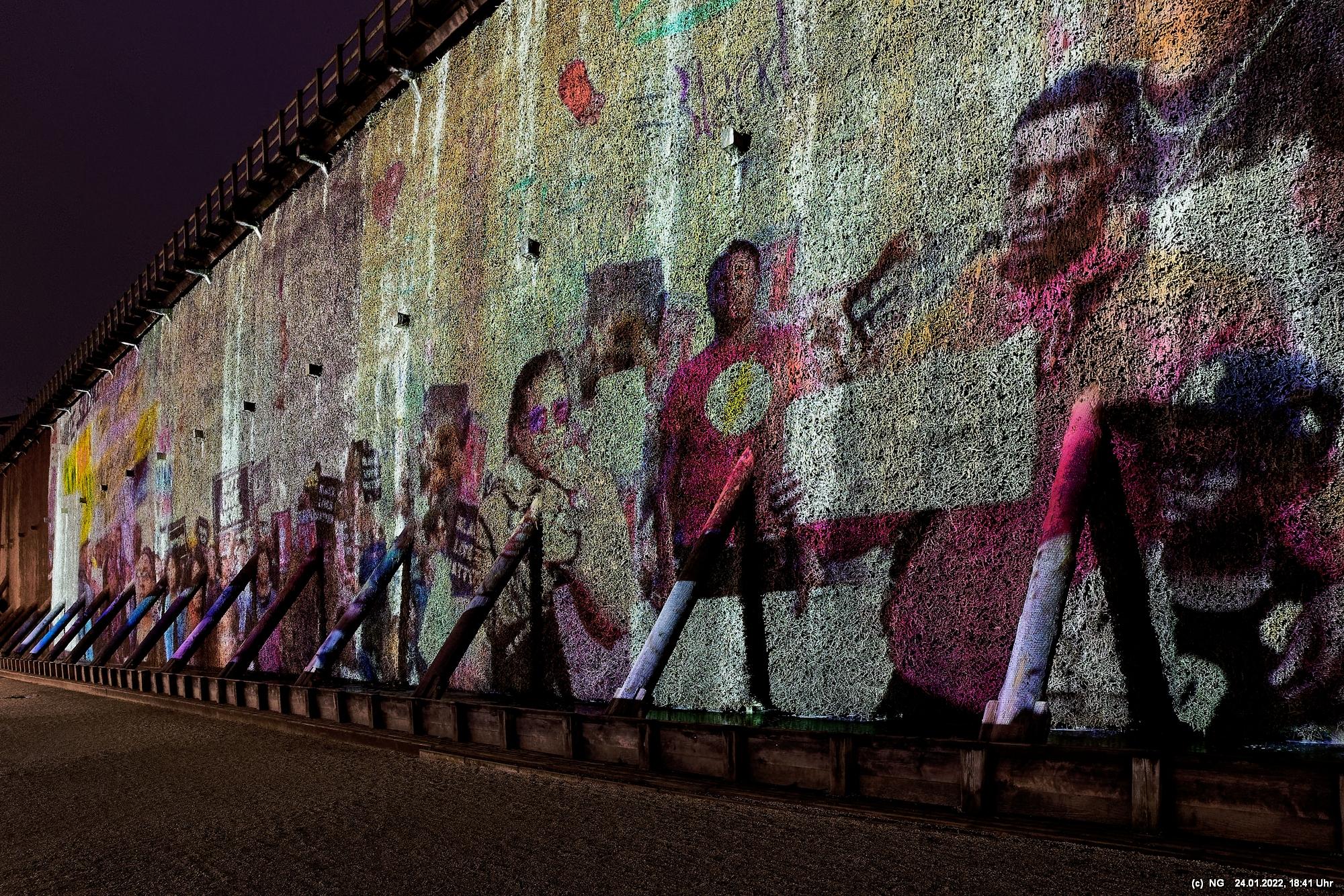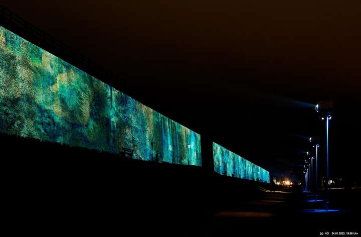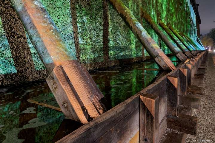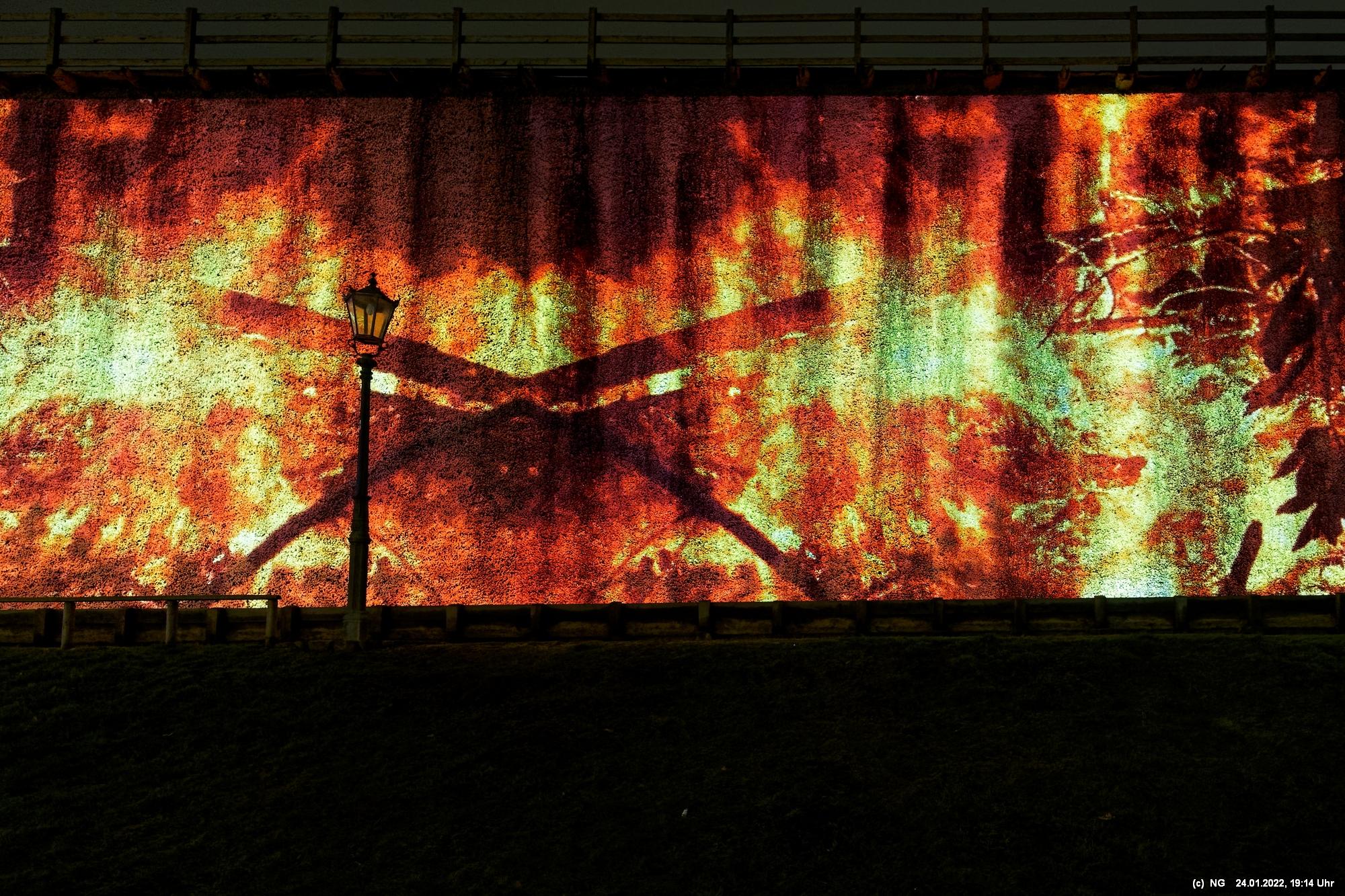 Licht-/Filmkunst am Gradierwerk - einmalig: Alle 3 Jahre, 4 Monate lang, rund 1.000 m lange Galerie präsentiert täglich bildgewaltige Szenen und Filme mit vielen Projektoren auf das Gradierwerk.