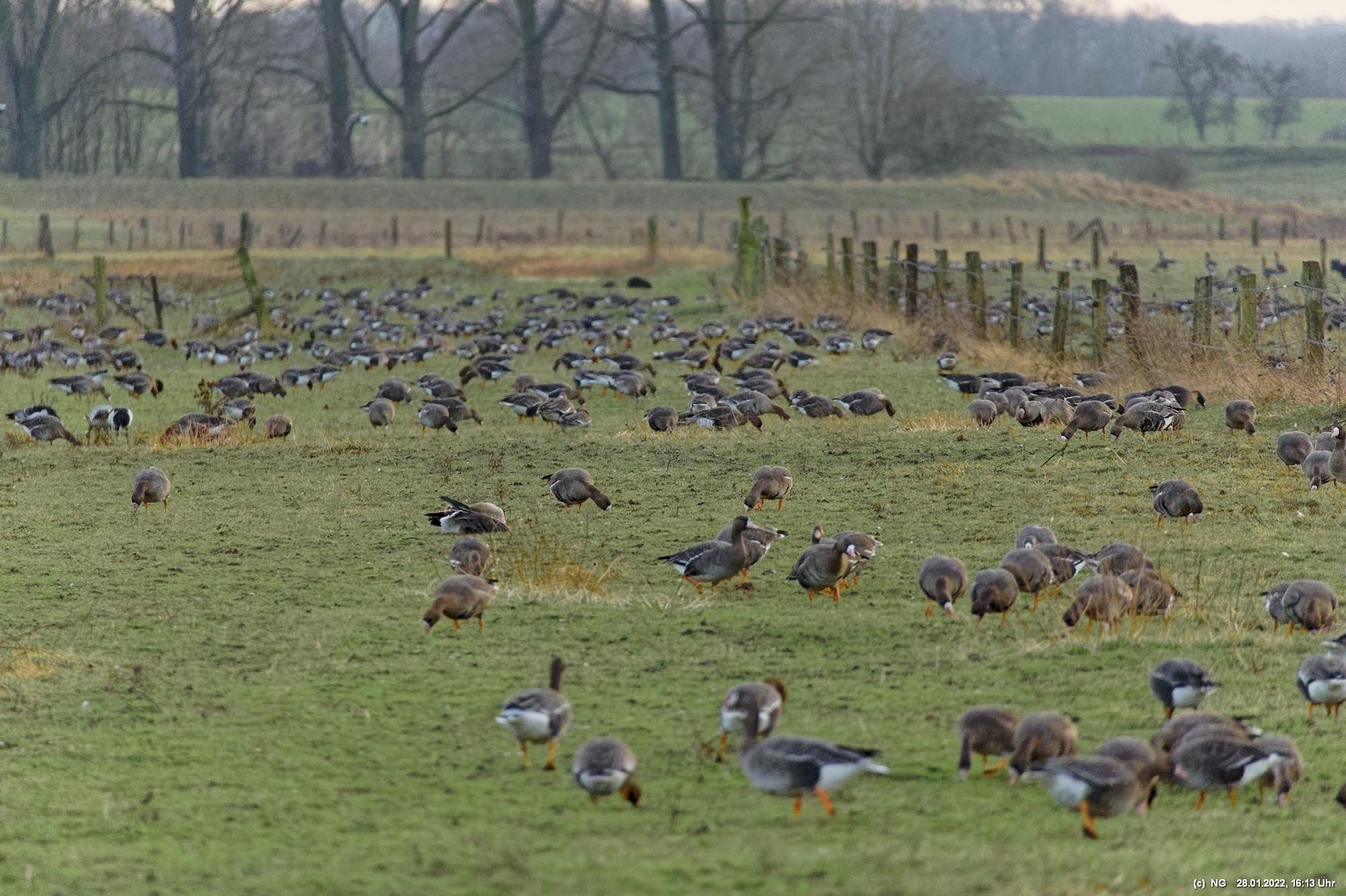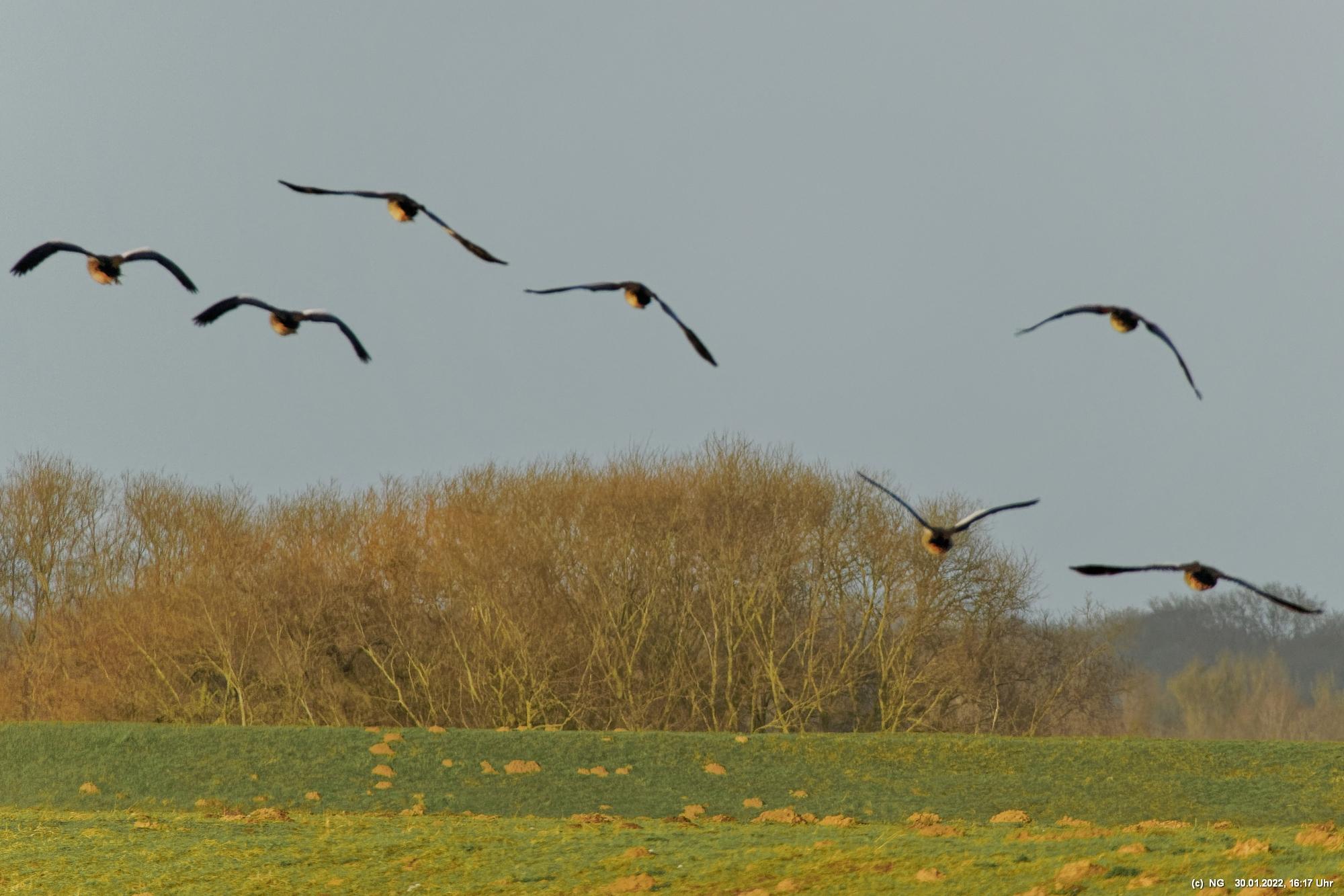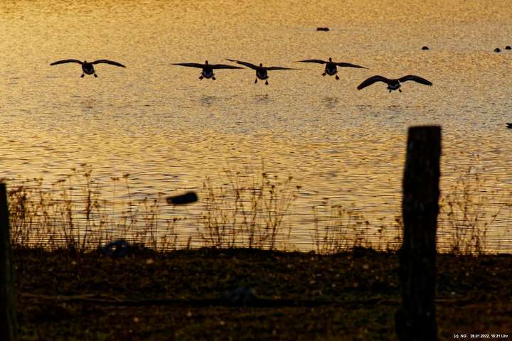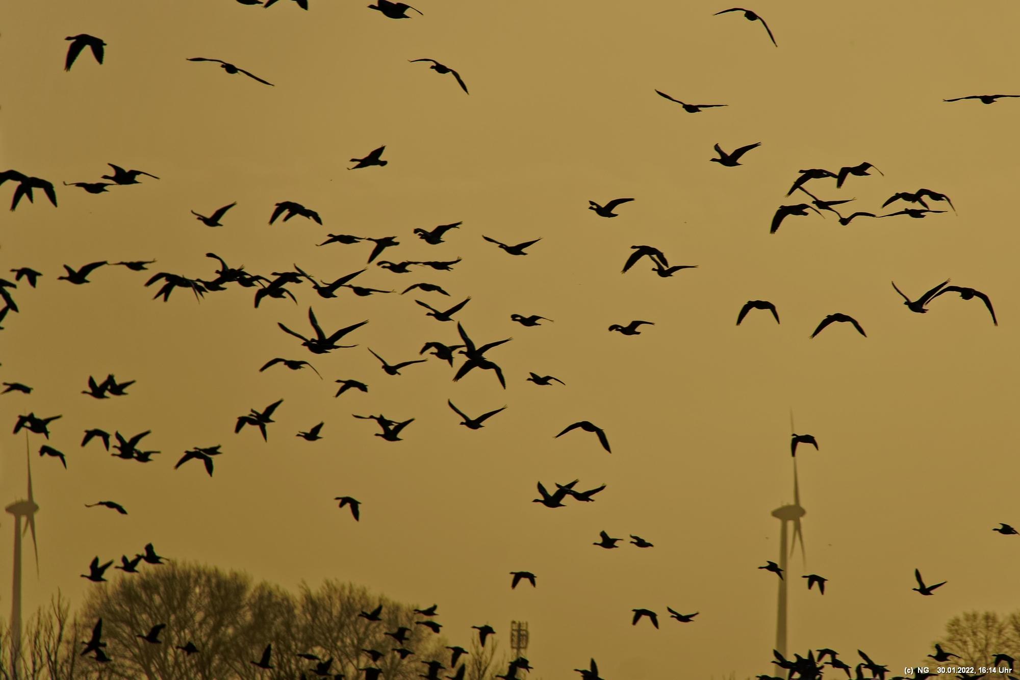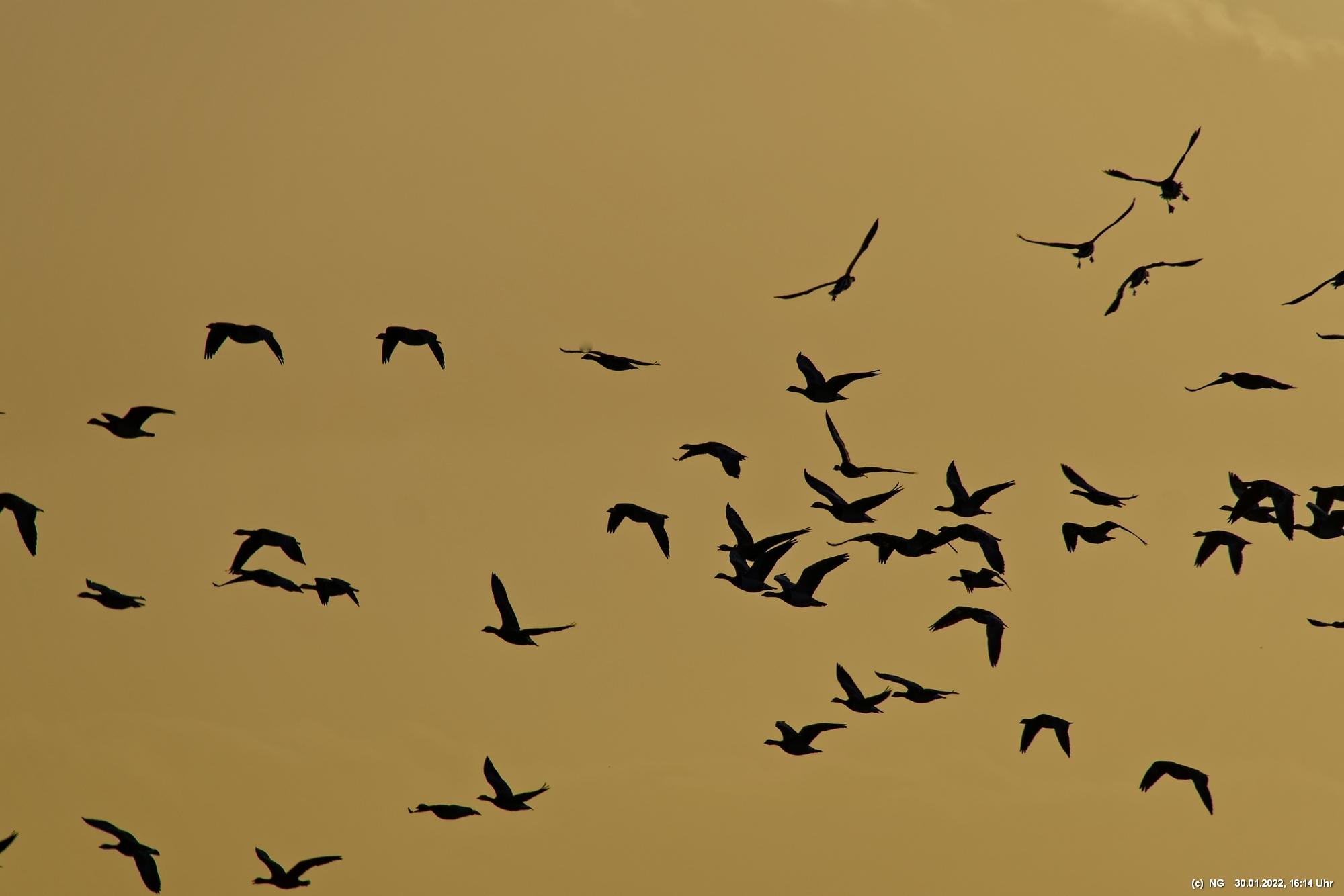 Am Freitag waren sie dicht gedrängt in riesigen Mengen dort, aber alle in einer Richtung und zu weit entfernt für die Kamera. Einmal sind Unmengen gleichzeitig mit viel Geschnatter aufgestiegen und haben den Himmel verdunkelt. Am Sonntag waren dann etwas weiniger dort, haben aber die Straße öfter überquert und konnten dabei gut beobachtet werden. Aber es war kalt und sehr windig und die Sonnenuntergänge goldfarben. Die Wildgänse sind schon einzigartig!