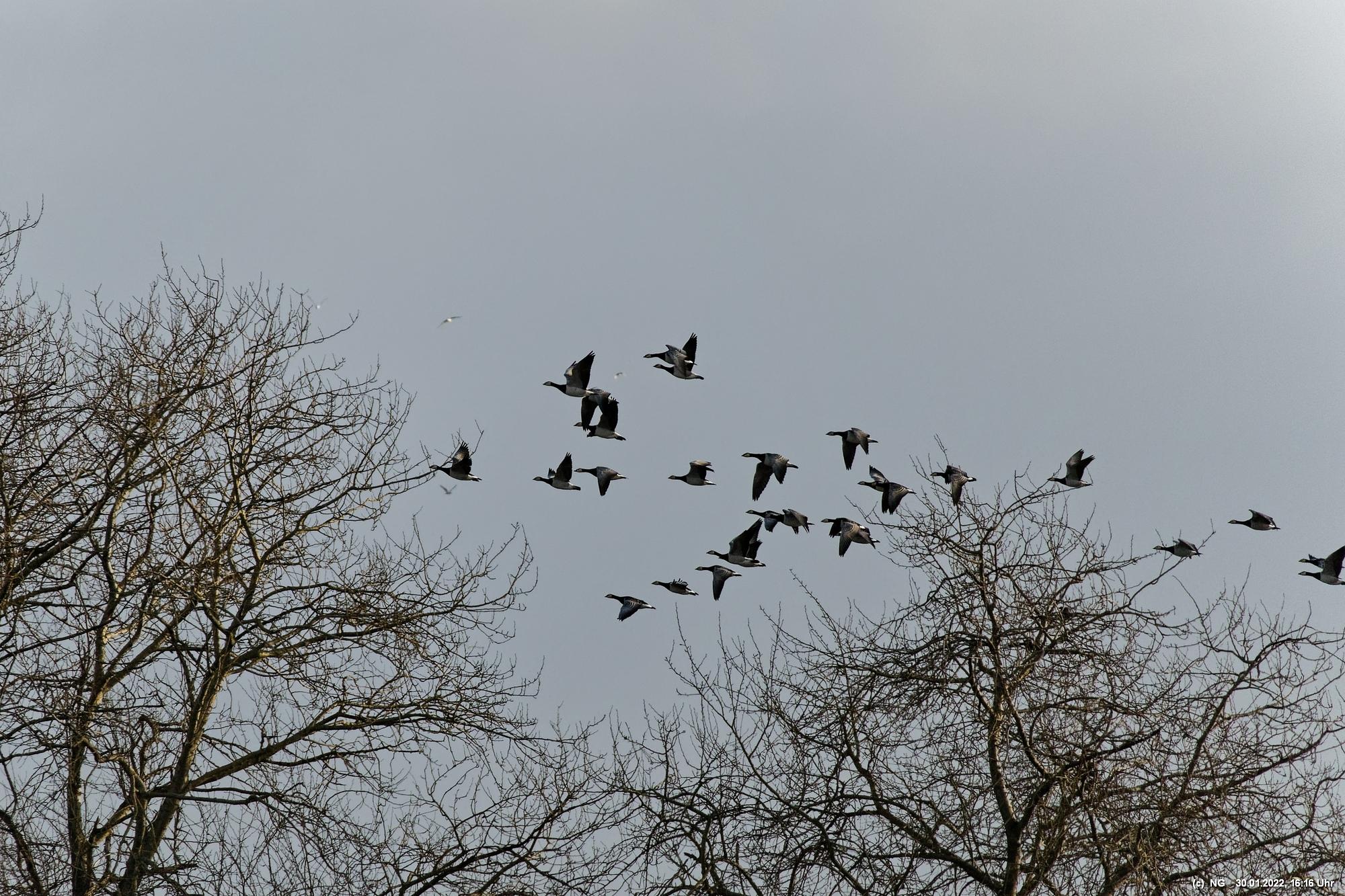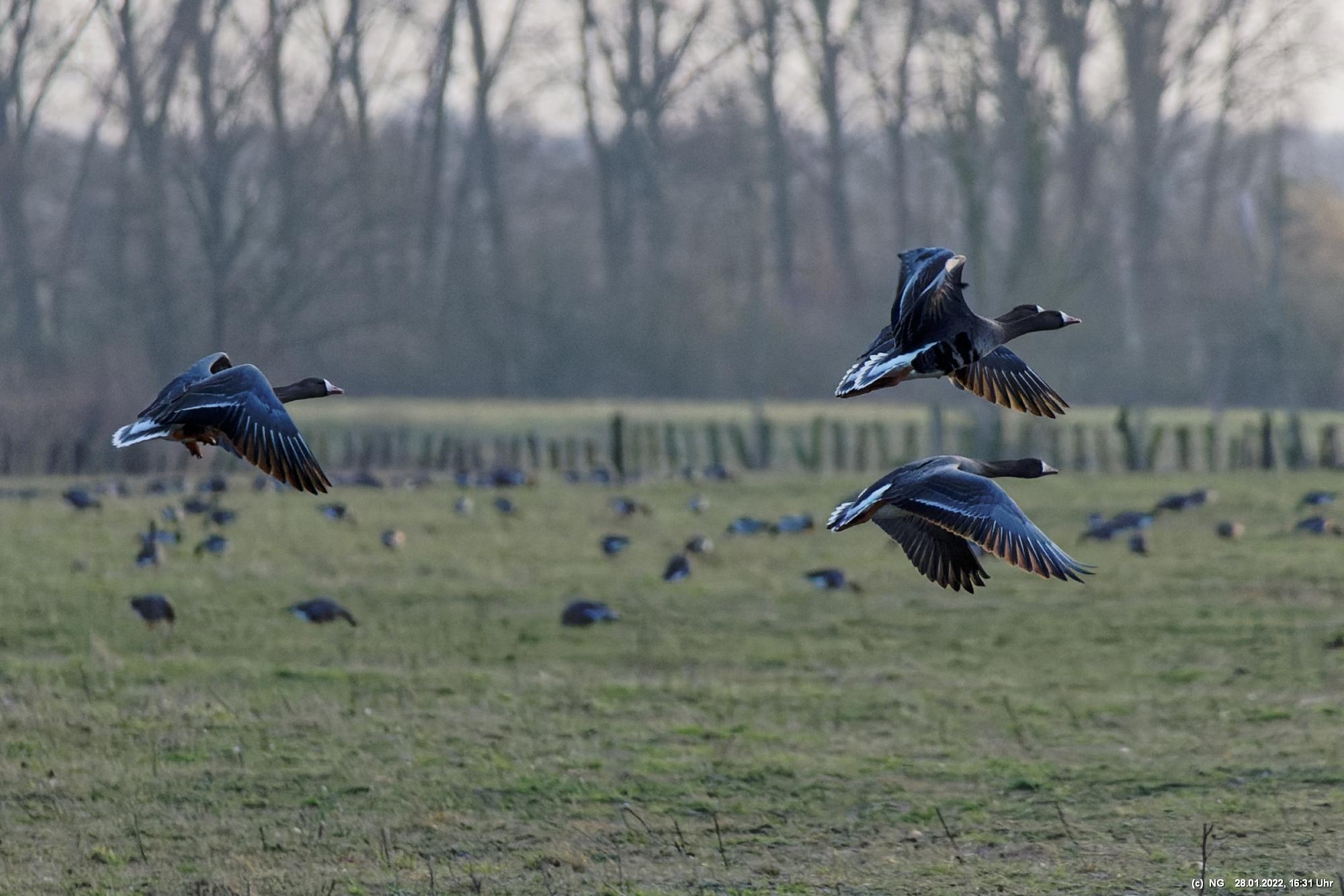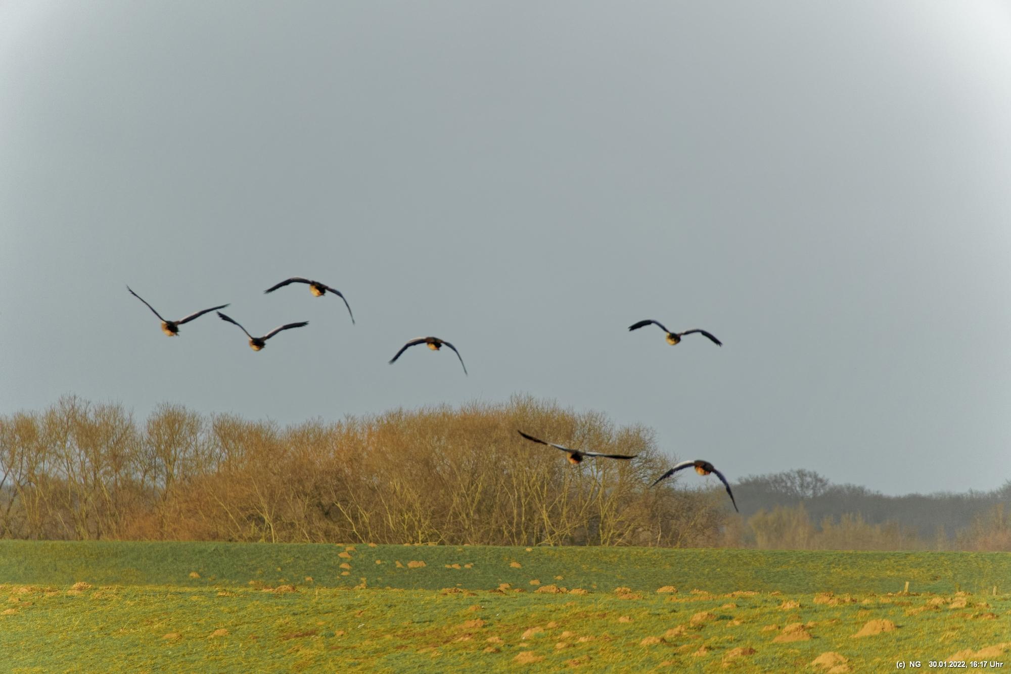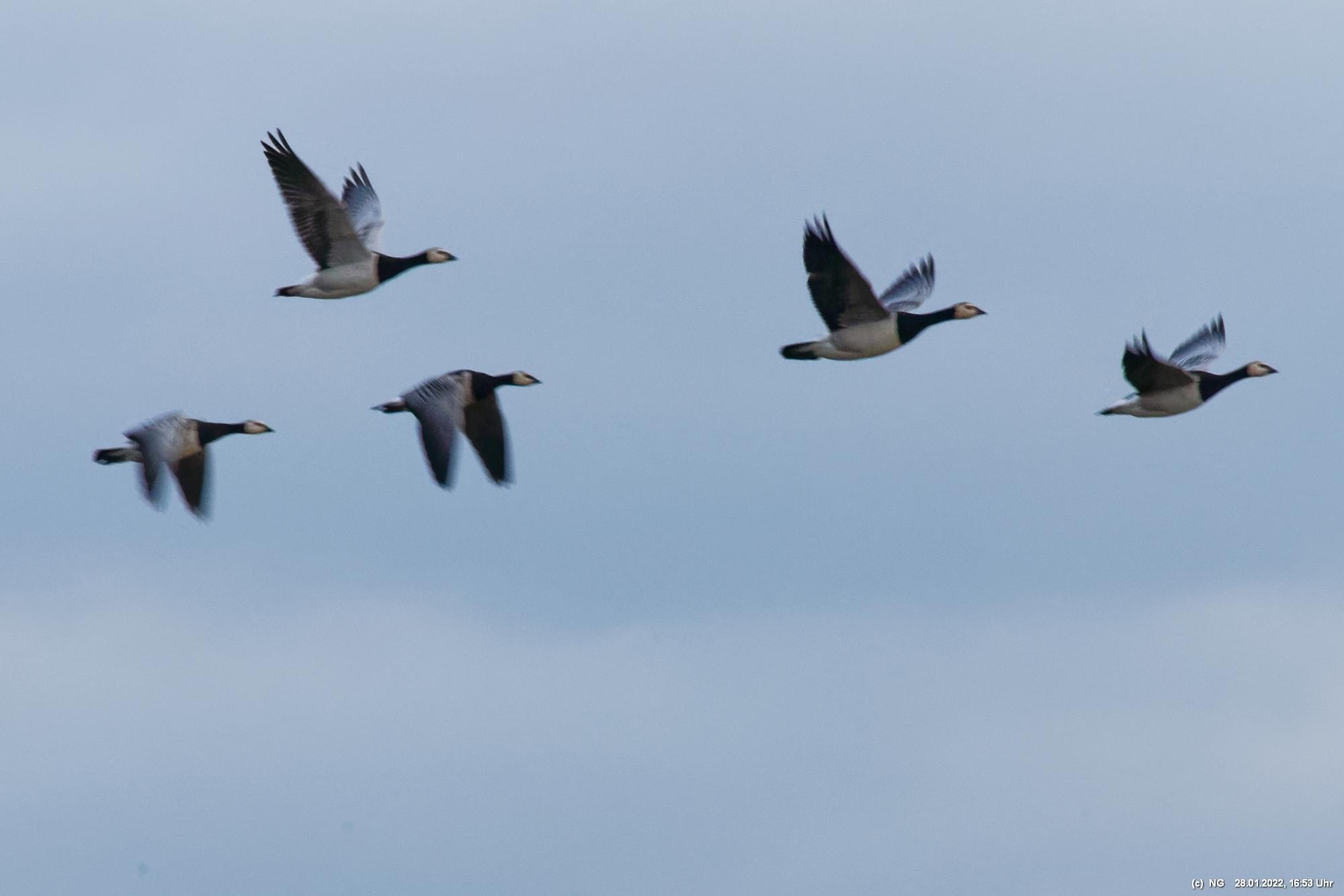 Am Freitag waren sie dicht gedrängt in riesigen Mengen dort, aber alle in einer Richtung und zu weit entfernt für die Kamera. Einmal sind Unmengen gleichzeitig mit viel Geschnatter aufgestiegen und haben den Himmel verdunkelt. Am Sonntag waren dann etwas weiniger dort, haben aber die Straße öfter überquert und konnten dabei gut beobachtet werden. Aber es war kalt und sehr windig und die Sonnenuntergänge goldfarben. Die Wildgänse sind schon einzigartig!