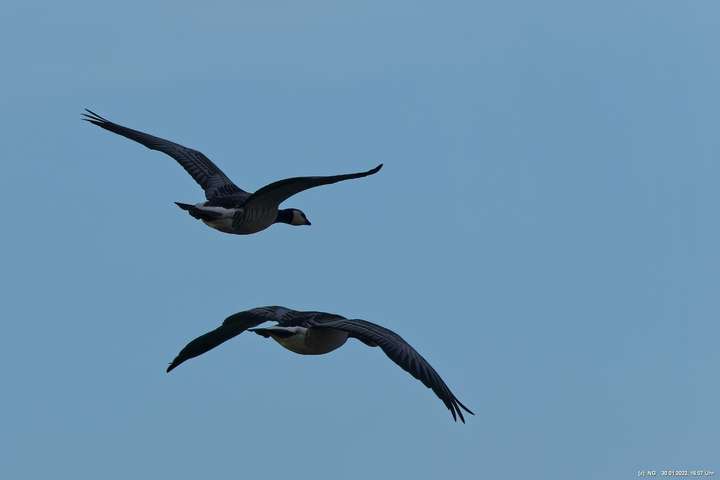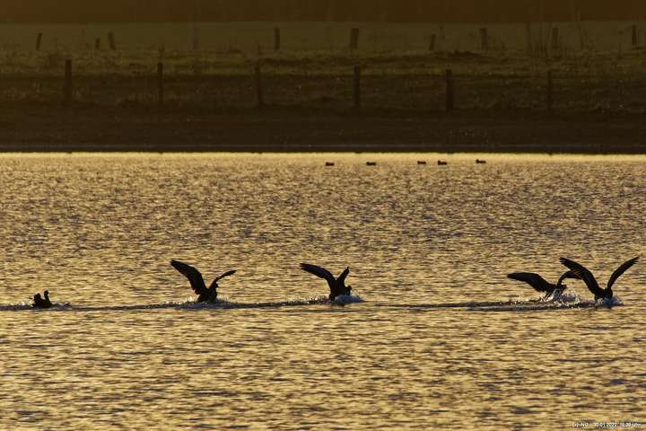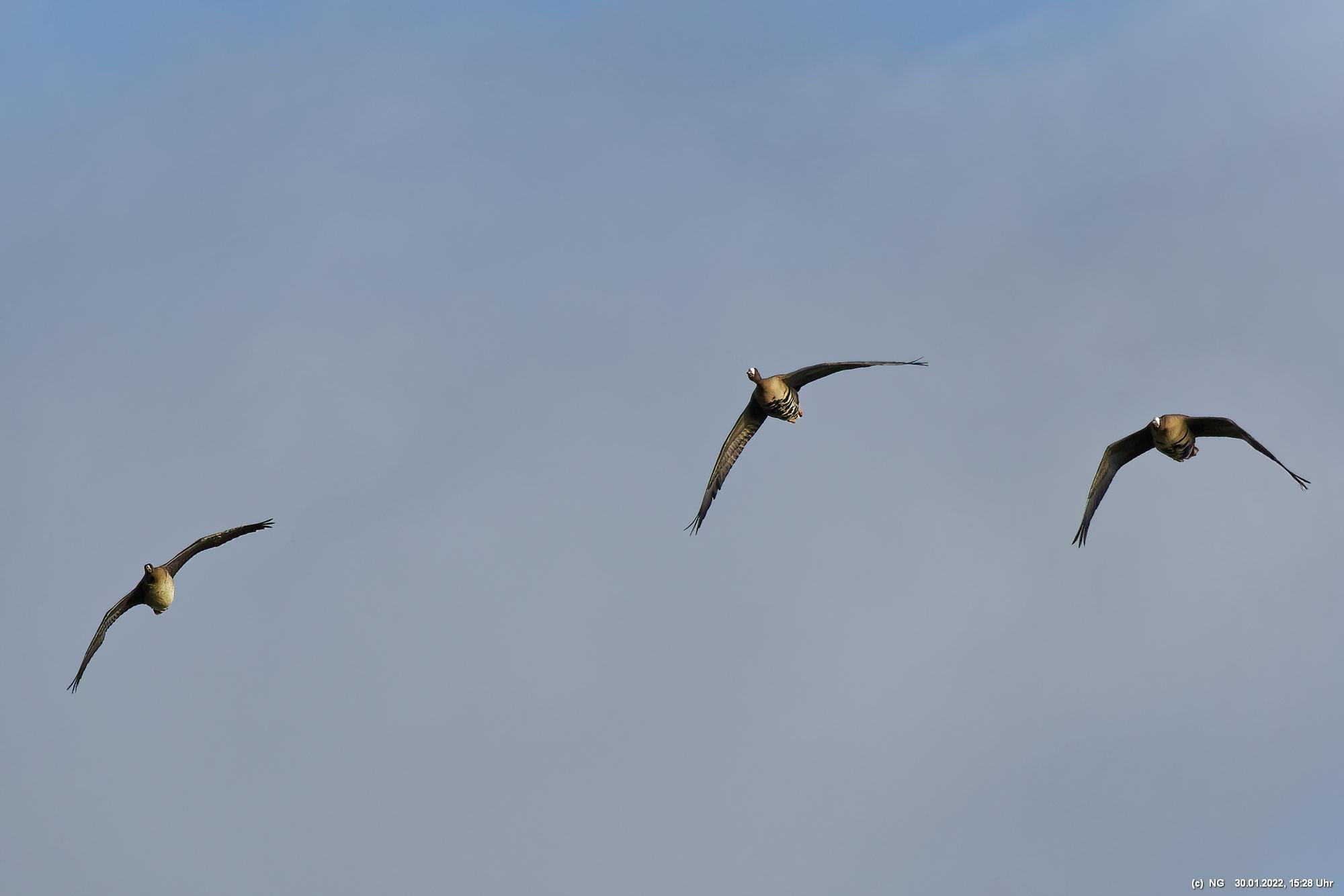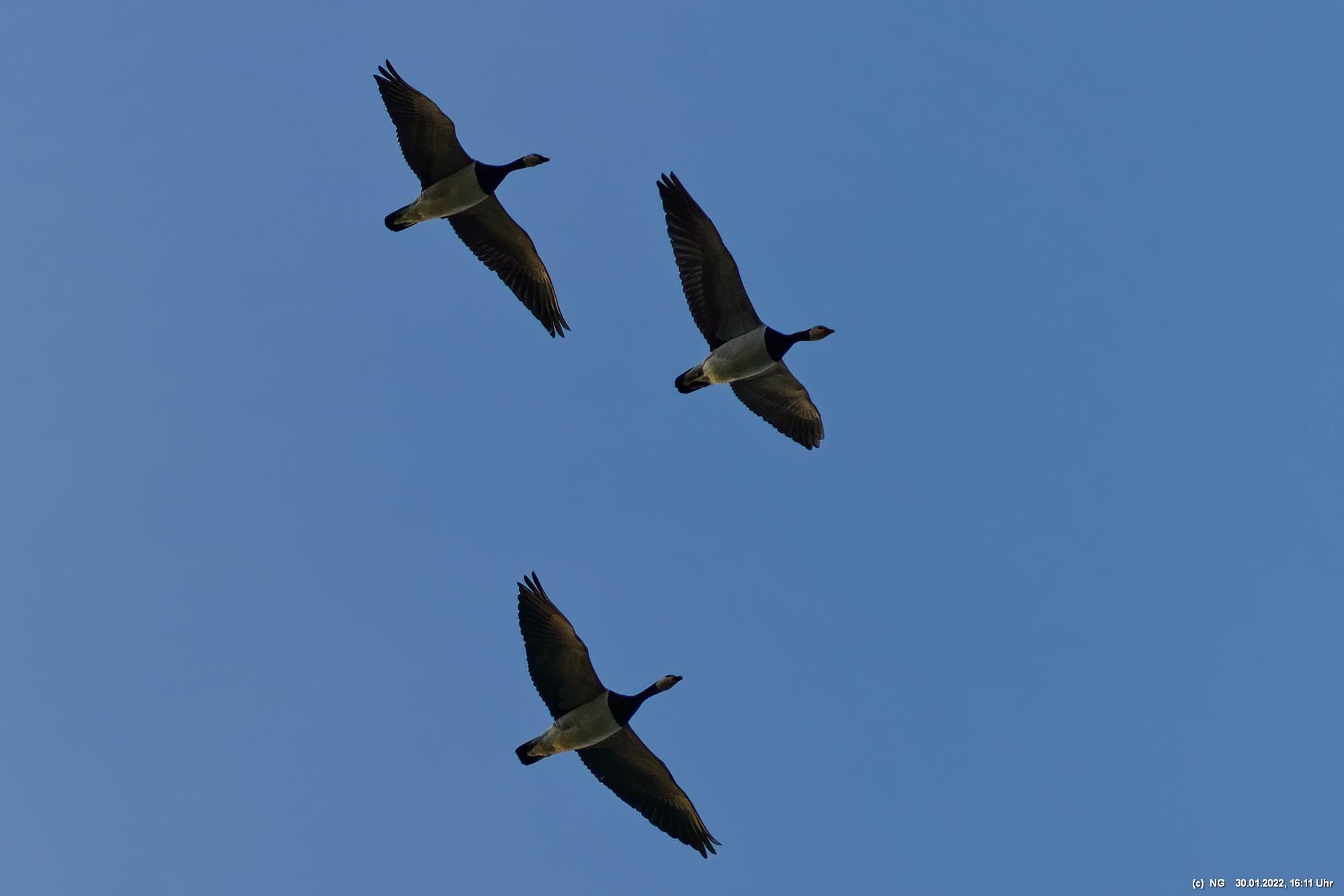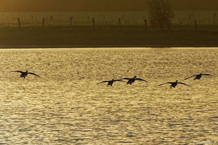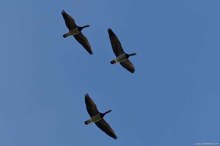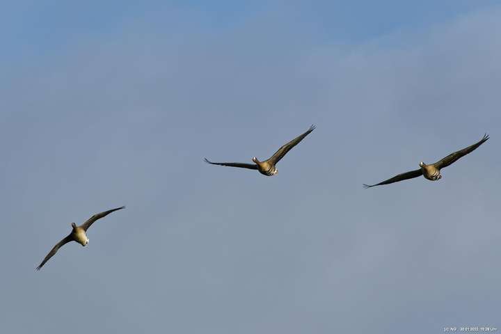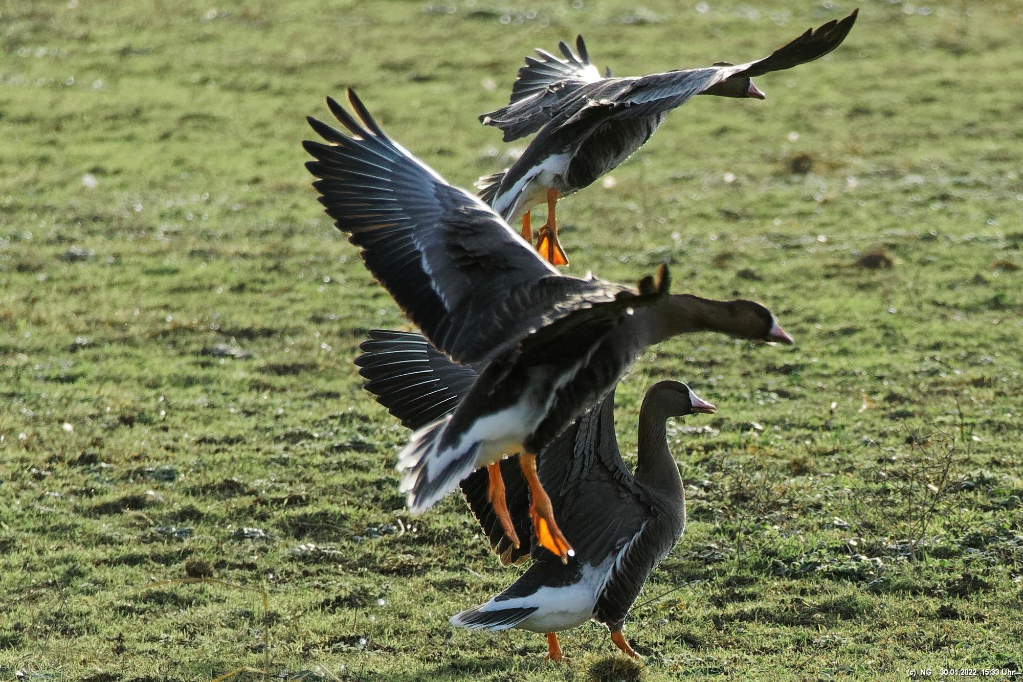 Am Freitag waren sie dicht gedrängt in riesigen Mengen dort, aber alle in einer Richtung und zu weit entfernt für die Kamera. Einmal sind Unmengen gleichzeitig mit viel Geschnatter aufgestiegen und haben den Himmel verdunkelt. Am Sonntag waren dann etwas weiniger dort, haben aber die Straße öfter überquert und konnten dabei gut beobachtet werden. Aber es war kalt und sehr windig und die Sonnenuntergänge goldfarben. Die Wildgänse sind schon einzigartig!
