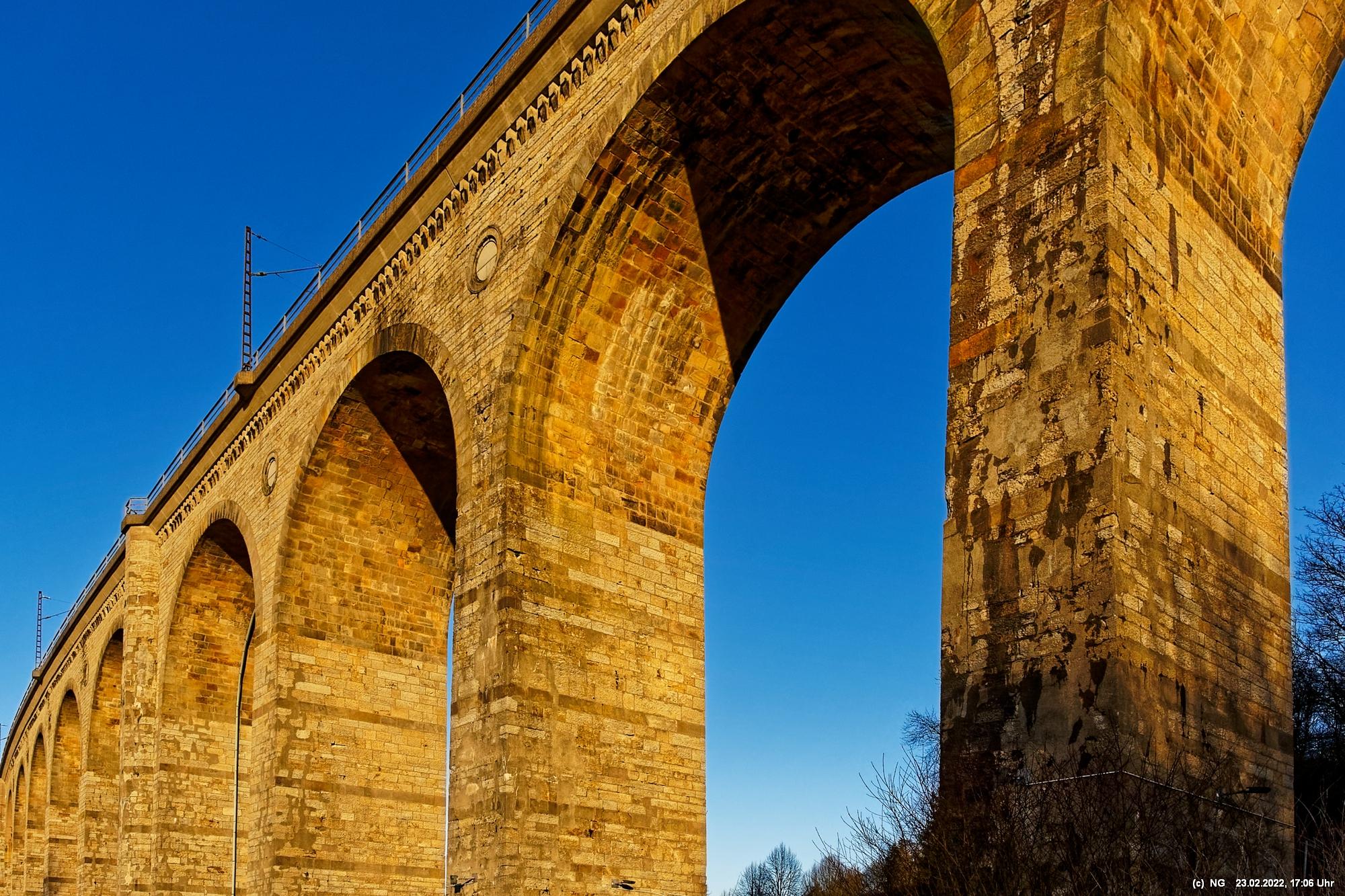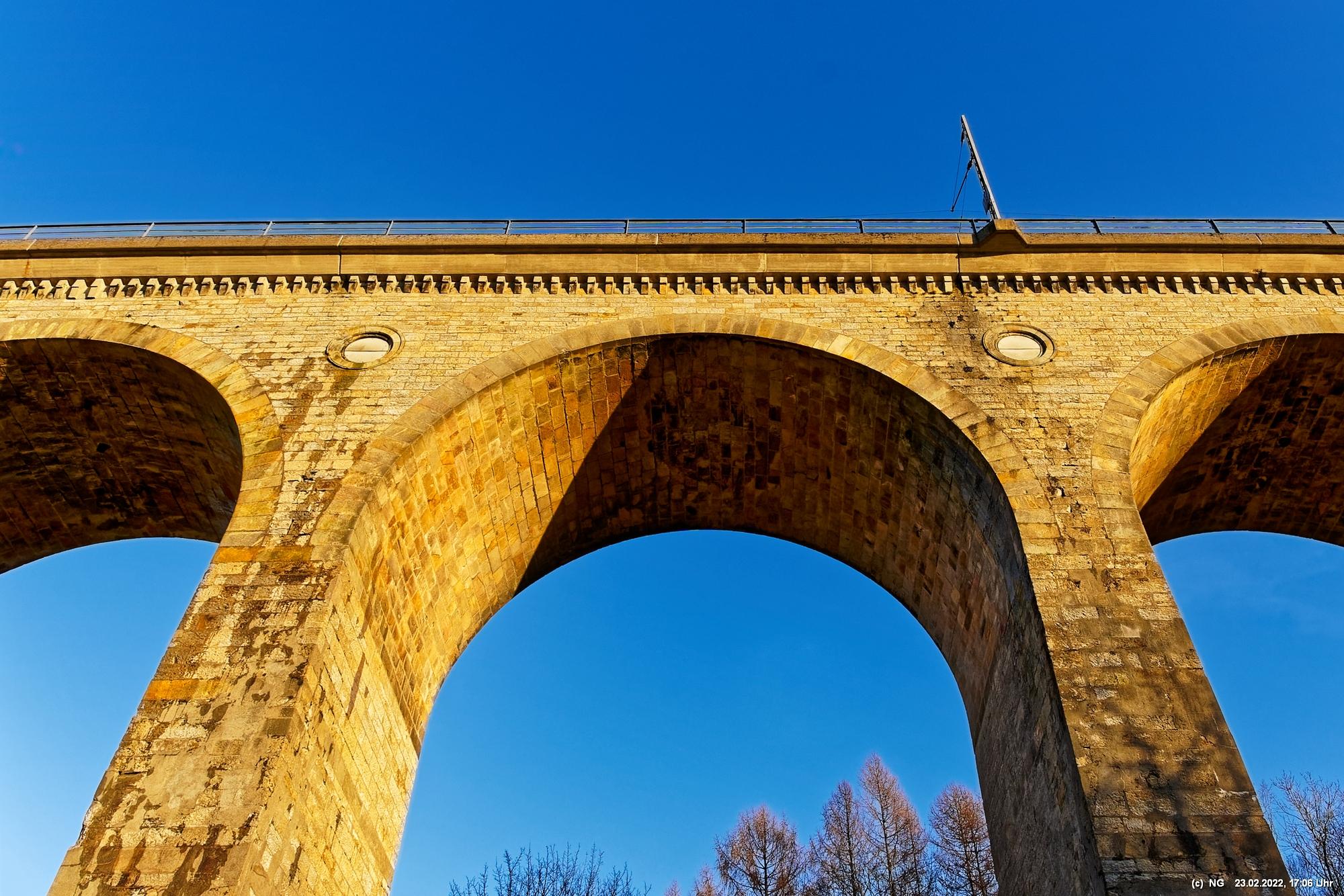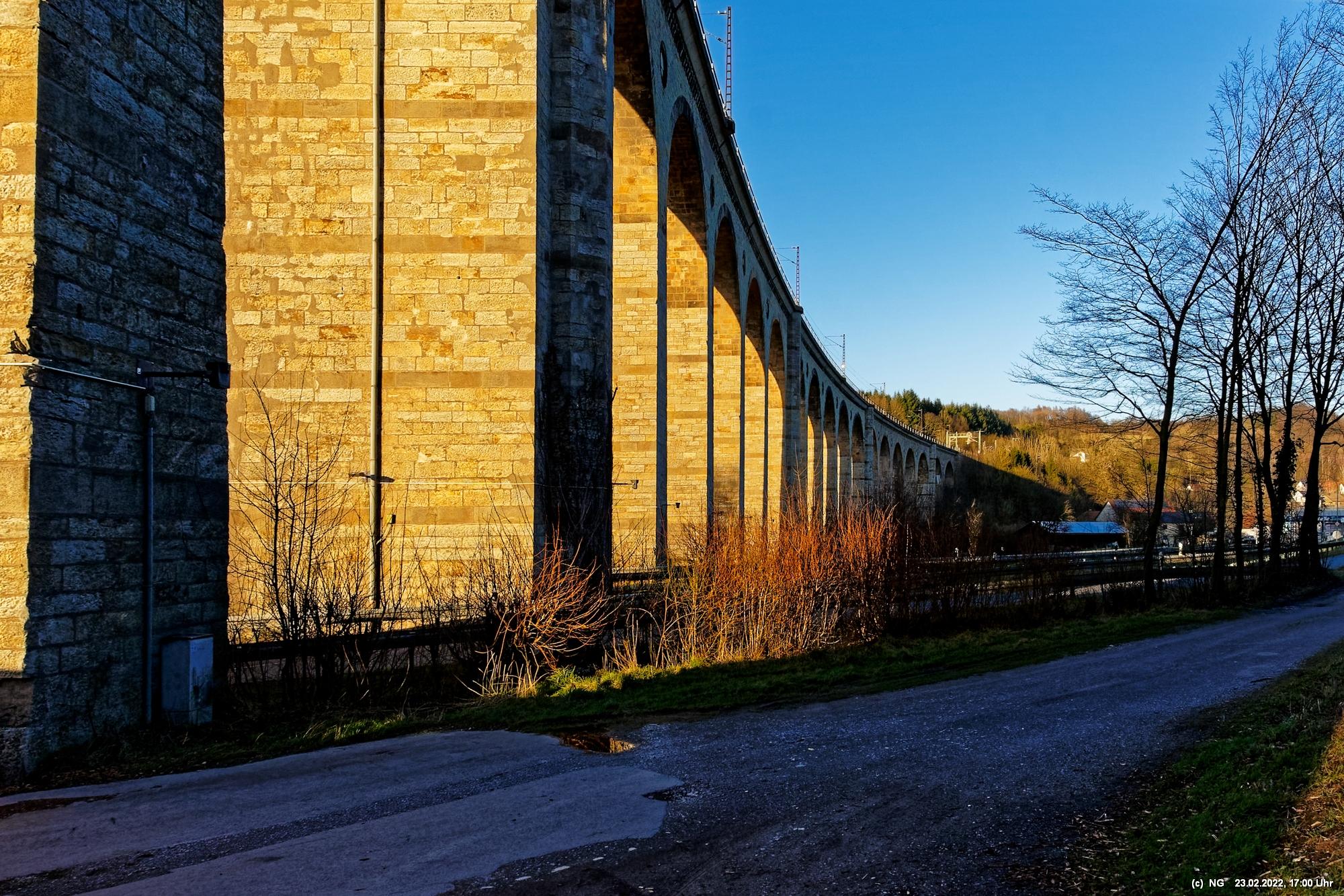 Jetzt endlich erzeugte die plötzlich scheinende Sonne nach den langen Regenwochen den Drang, doch mal endlich hinzufahren - und es hat sich gelohnt! Die in den 1850er Jahren gebaute Brücke ist die längste Kalksteinbrücke Europas. Sie wurde am 21.07.1853 vom König Friedrich Wilhelm IV. eingeweiht. Der soll seinerzeit geglaubt haben, die Brücke sei aus purem Gold errichtet - weil sie so teuer geworden sei. Sie liegt aber auch sowas von idyllisch und ist ein richtiger Hotspot geworden.