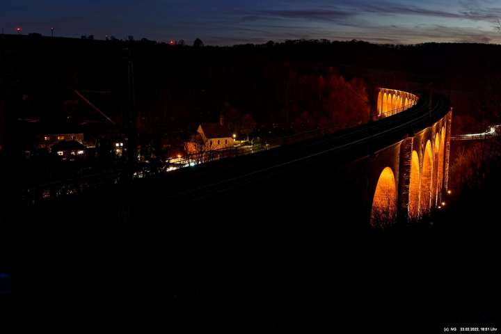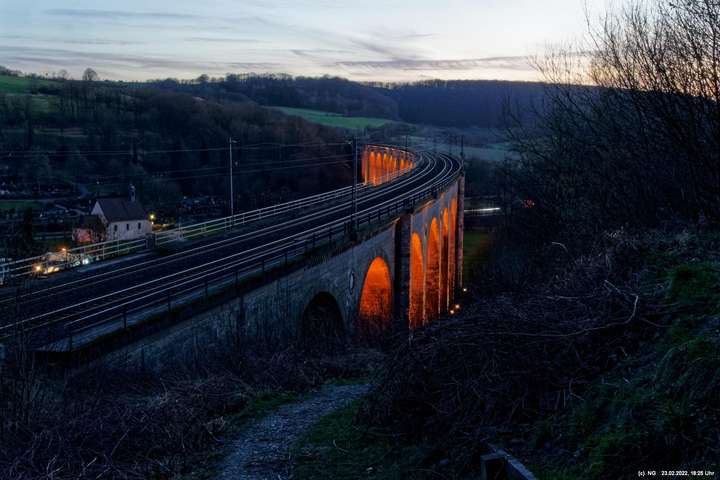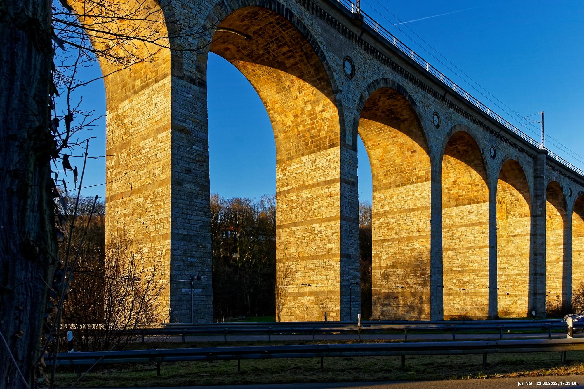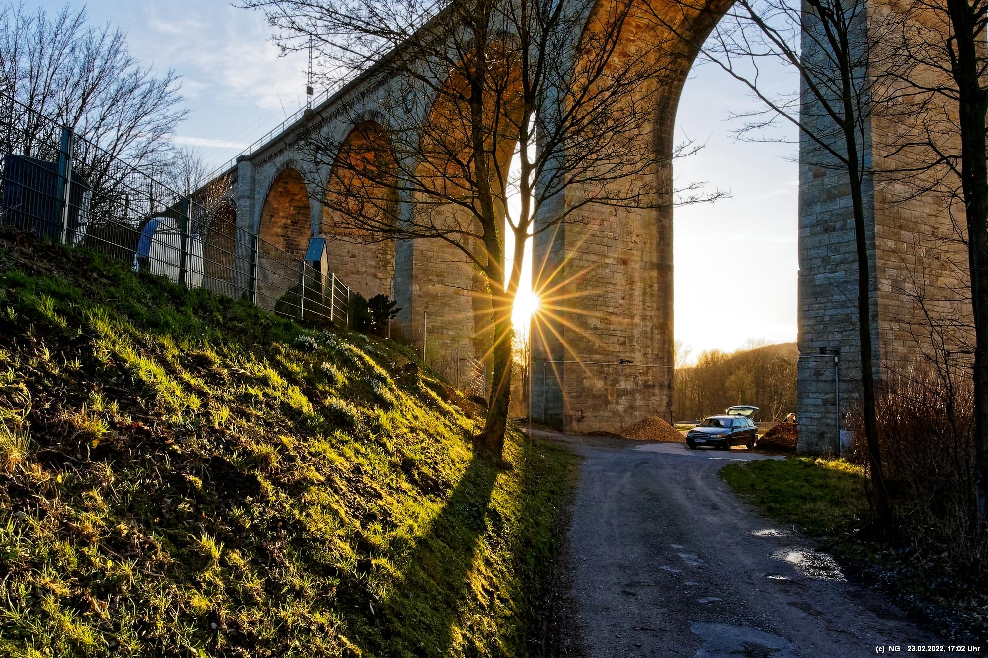 Jetzt endlich erzeugte die plötzlich scheinende Sonne nach den langen Regenwochen den Drang, doch mal endlich hinzufahren - und es hat sich gelohnt! Die in den 1850er Jahren gebaute Brücke ist die längste Kalksteinbrücke Europas. Sie wurde am 21.07.1853 vom König Friedrich Wilhelm IV. eingeweiht. Der soll seinerzeit geglaubt haben, die Brücke sei aus purem Gold errichtet - weil sie so teuer geworden sei. Sie liegt aber auch sowas von idyllisch und ist ein richtiger Hotspot geworden.