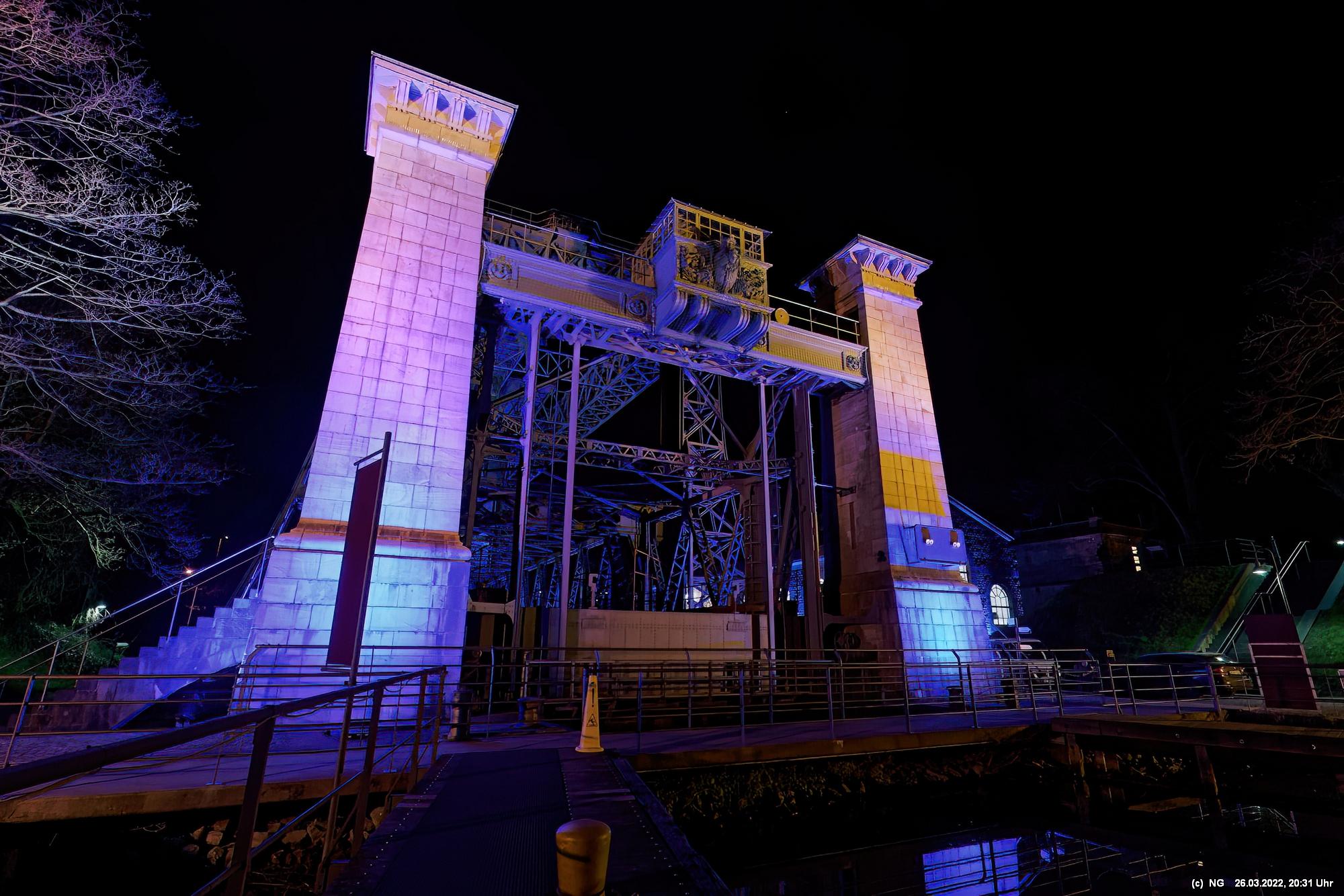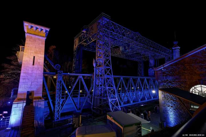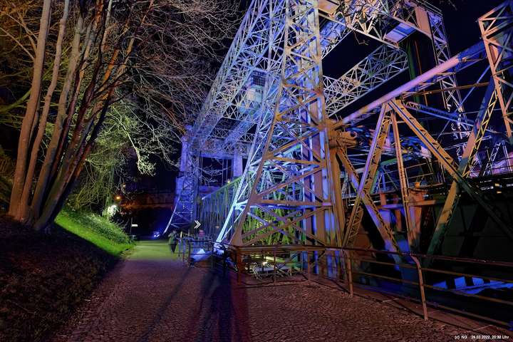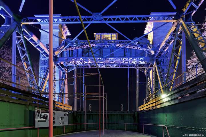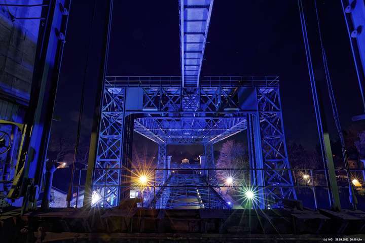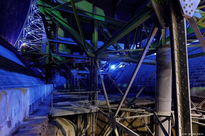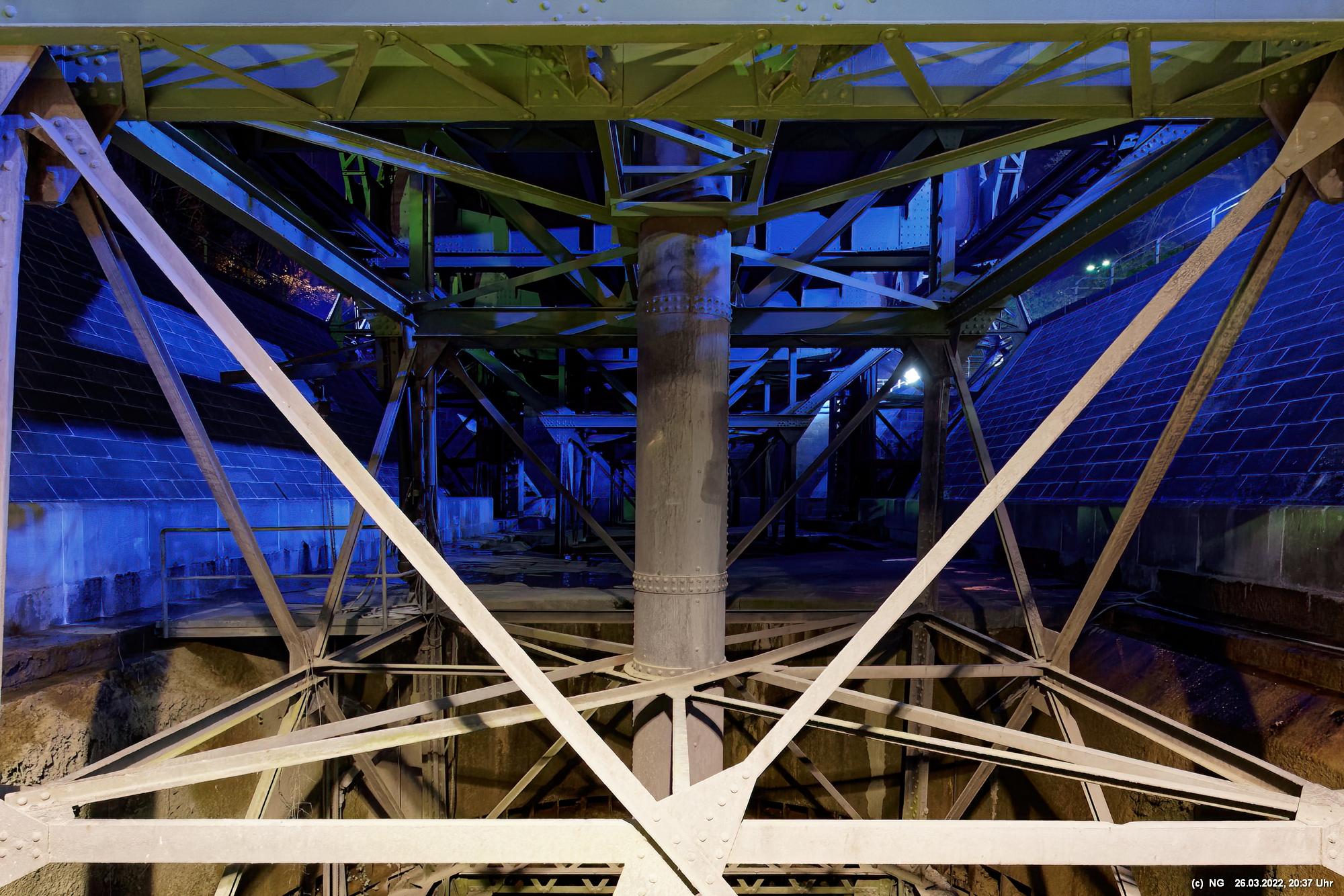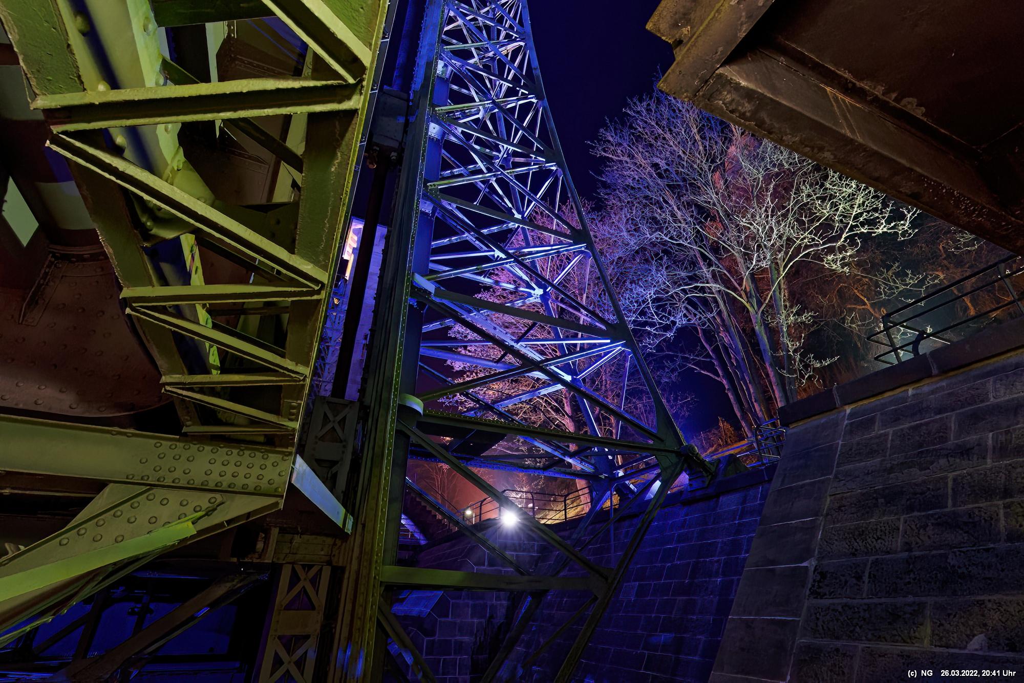 Das ganze Hebewerk war mit Blau angestrahlt. Damit entwickelten sich in Verbindung mit dem normalen Laternenlicht viele ungewöhnliche Farbenspiele - und dass nur für eine Woche. Die künstlerische Bestrahlung der beiden Türme am Oberwasser wurde von der Designerin Cristina Tarquini entwickelt und hat konzentriert in den Bann gezogen. Die Wendeltreppe im Turm führte dann zum Unterwasser. Dort konnte man die gesamte Konstruktion des alten Hebewerks besichtigen. Bei warmen Frühlingswetter eine spannende Geschichte.
