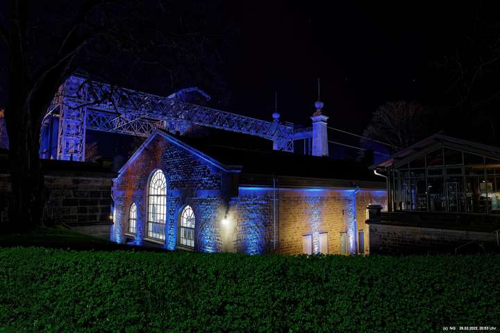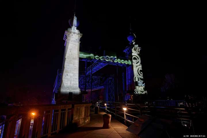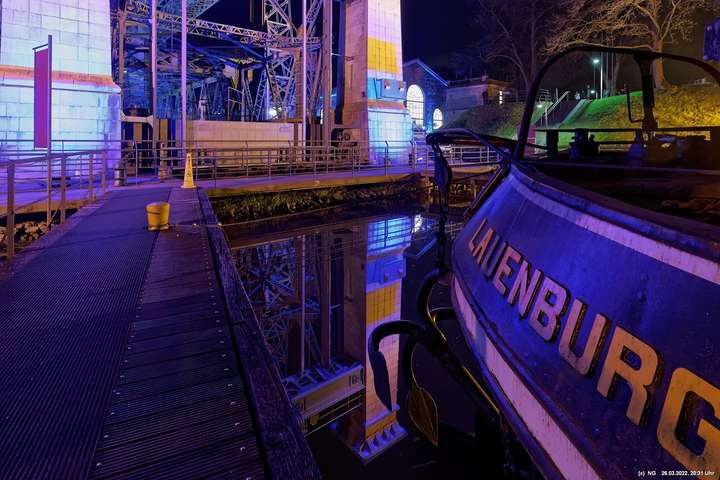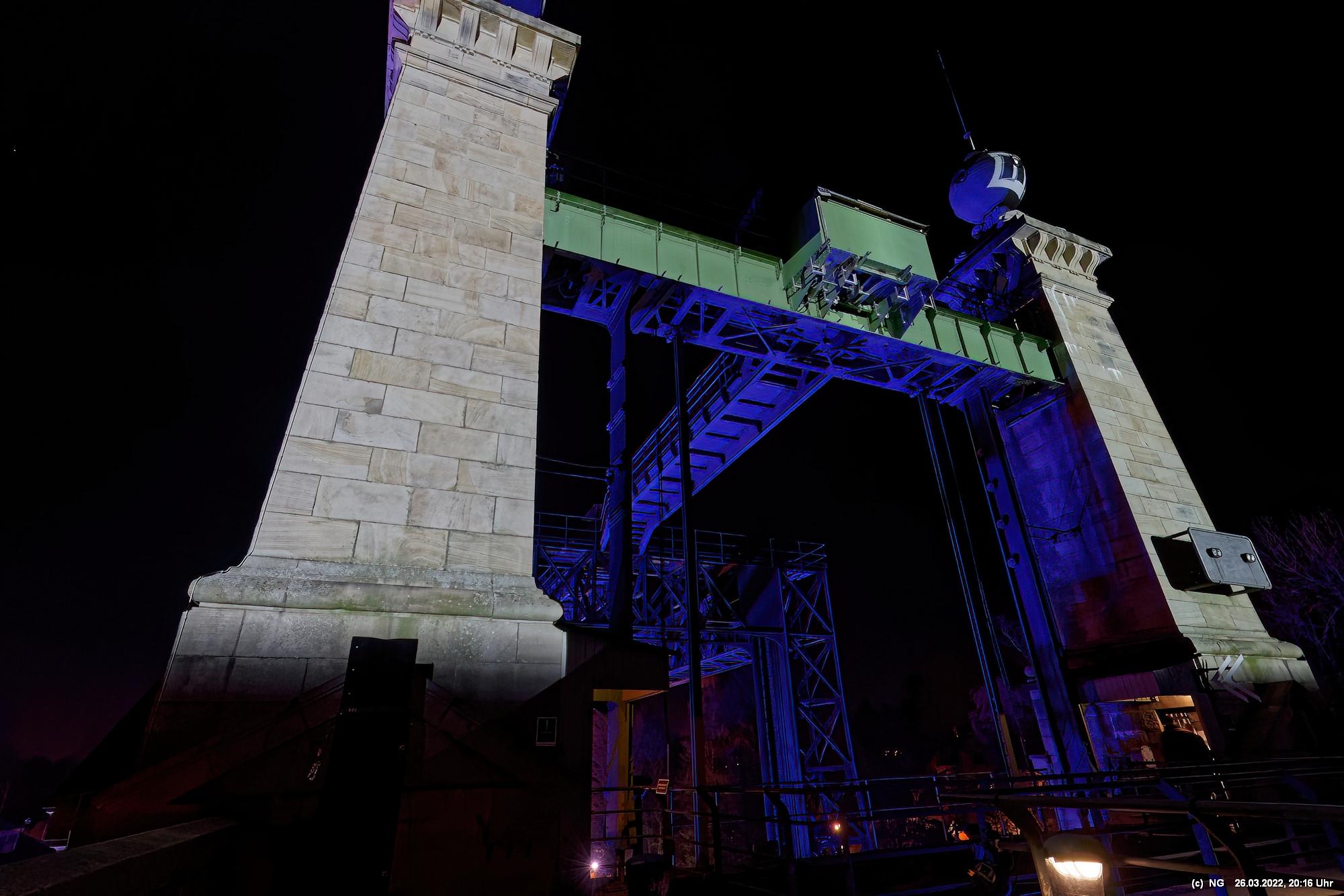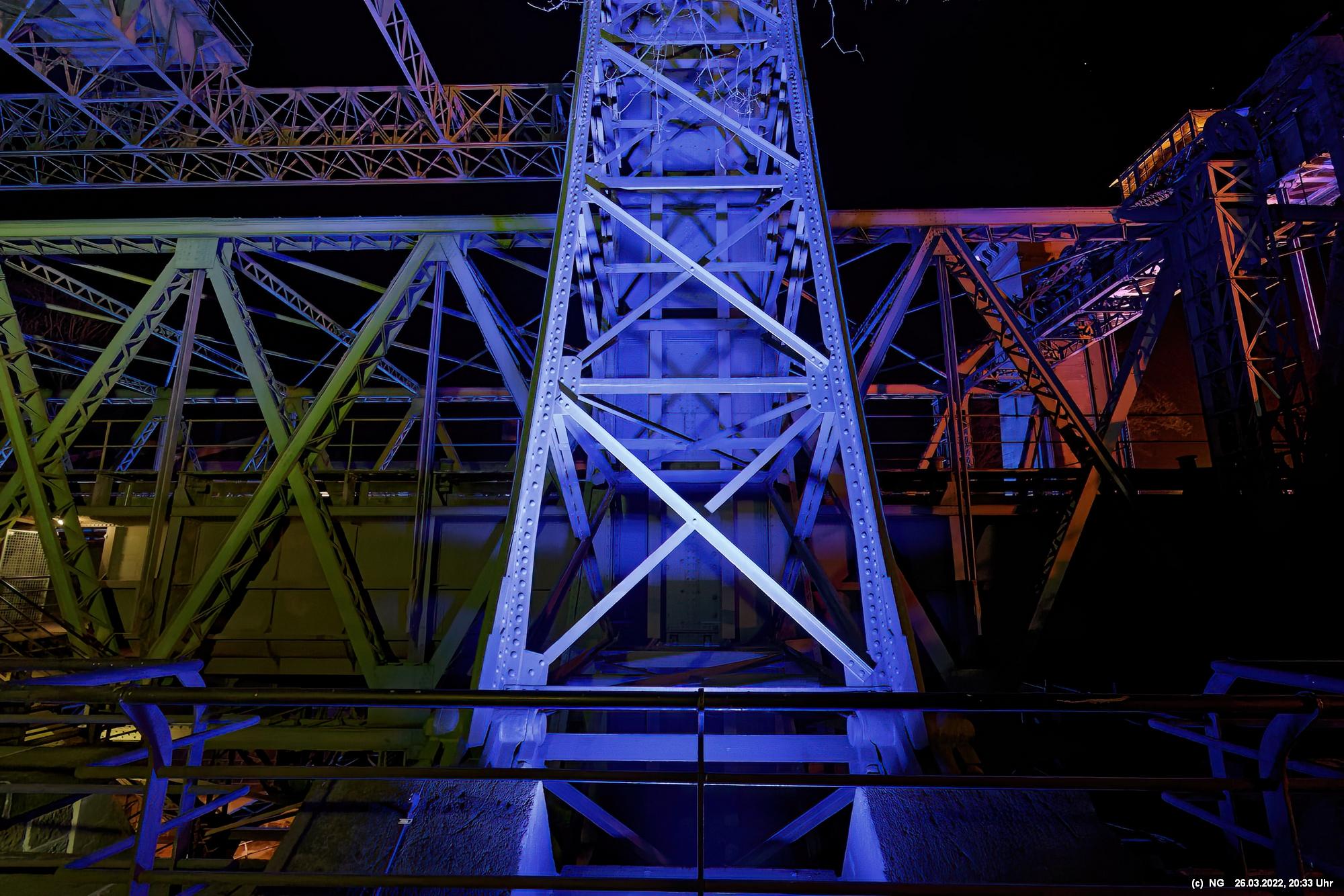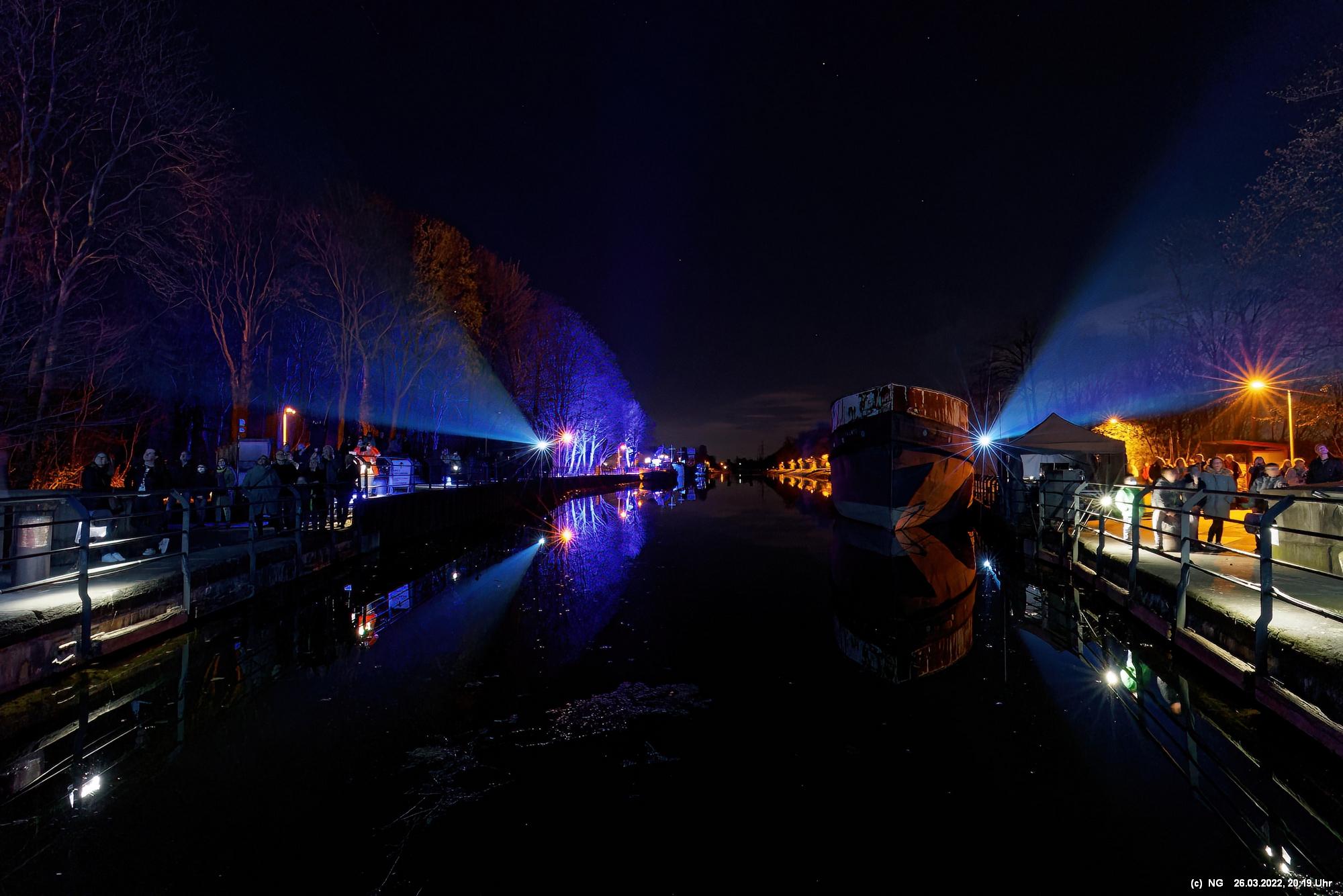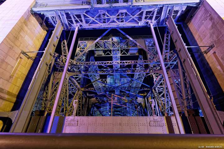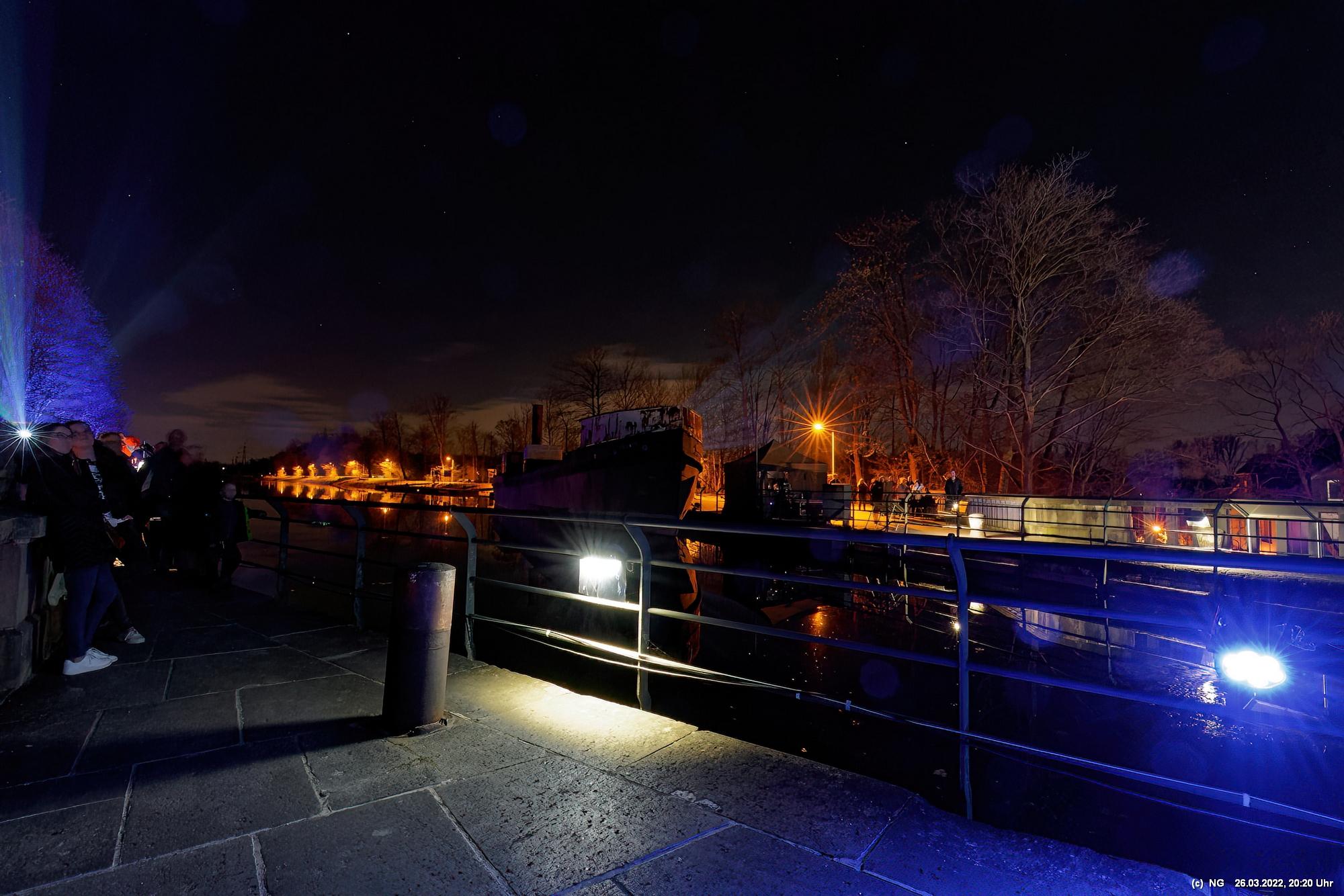 Das ganze Hebewerk war mit Blau angestrahlt. Damit entwickelten sich in Verbindung mit dem normalen Laternenlicht viele ungewöhnliche Farbenspiele - und dass nur für eine Woche. Die künstlerische Bestrahlung der beiden Türme am Oberwasser wurde von der Designerin Cristina Tarquini entwickelt und hat konzentriert in den Bann gezogen. Die Wendeltreppe im Turm führte dann zum Unterwasser. Dort konnte man die gesamte Konstruktion des alten Hebewerks besichtigen. Bei warmen Frühlingswetter eine spannende Geschichte.