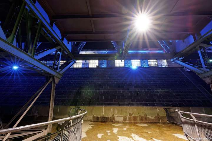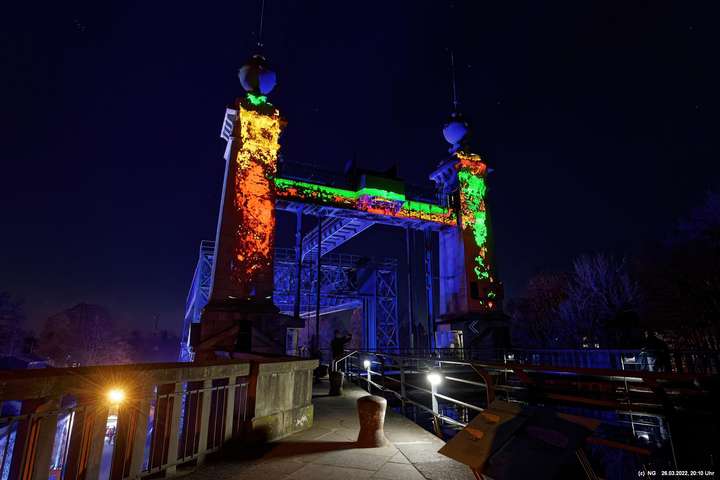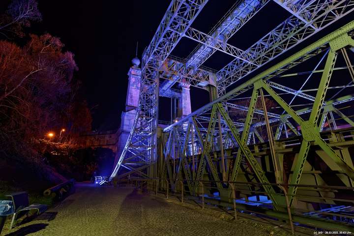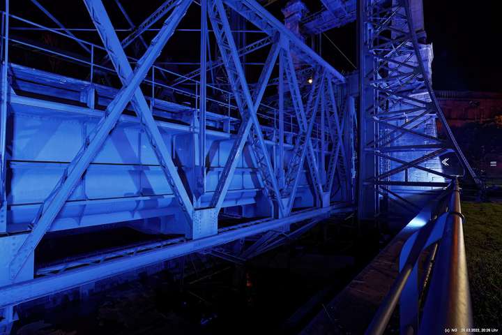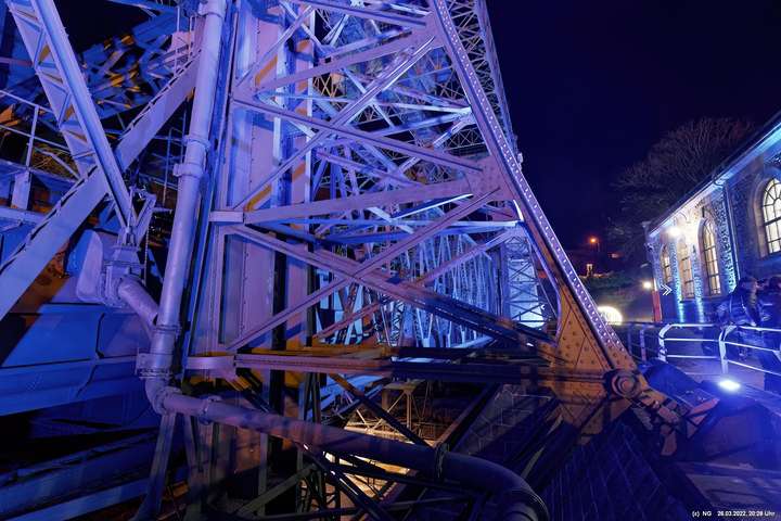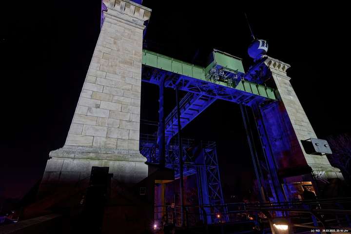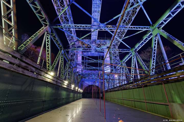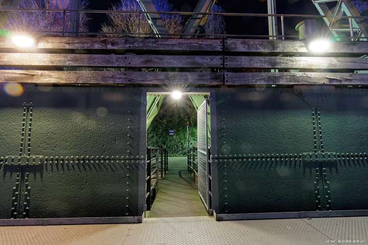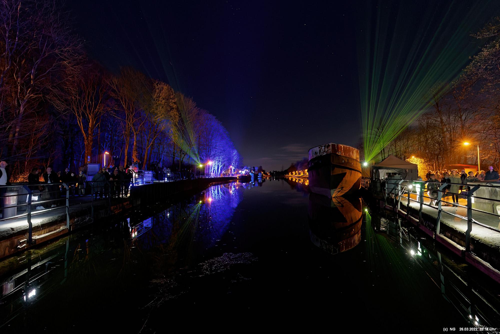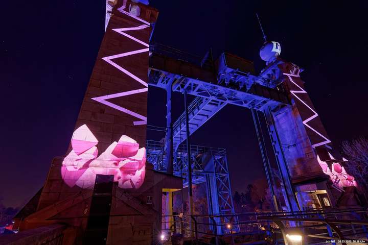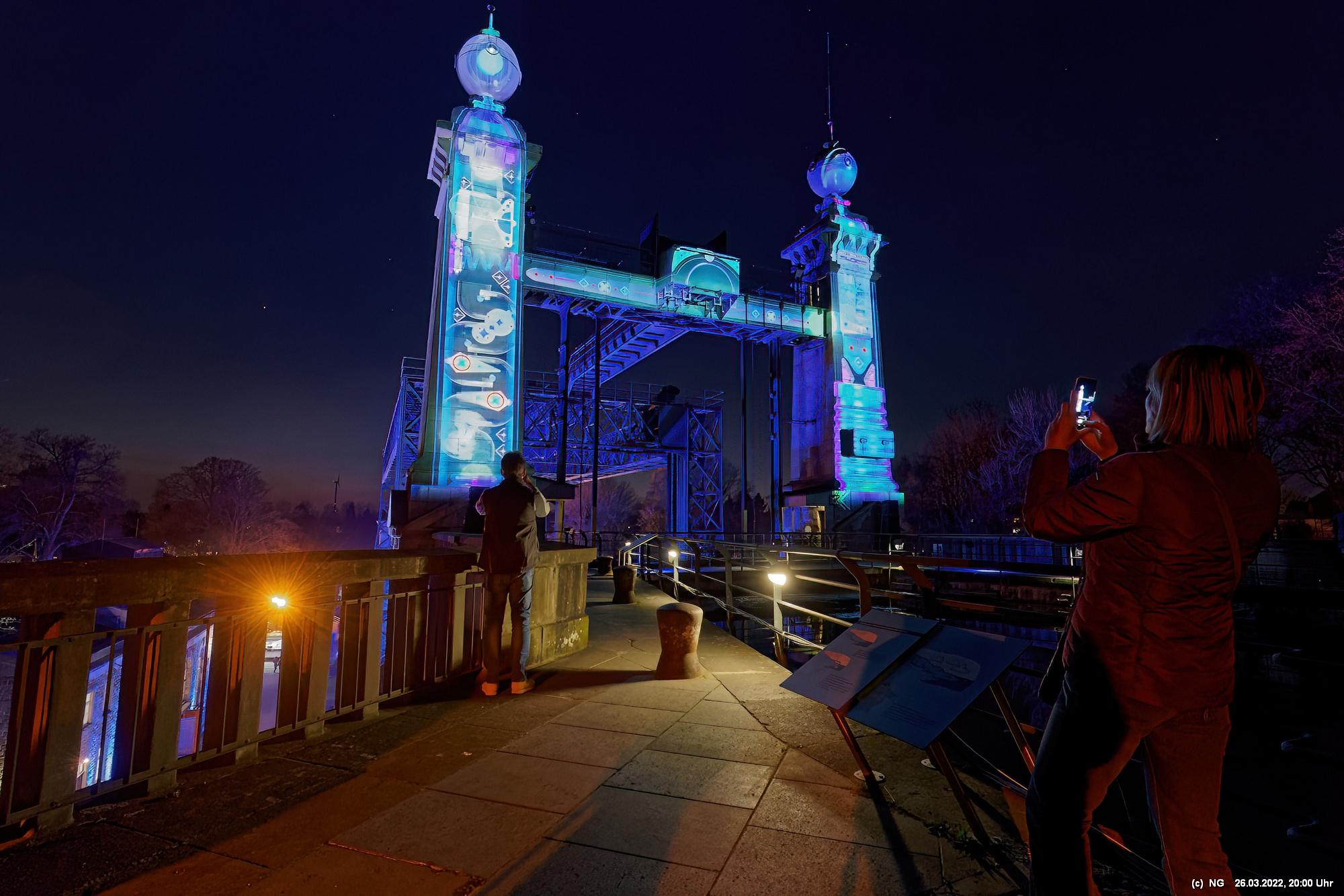 Das ganze Hebewerk war mit Blau angestrahlt. Damit entwickelten sich in Verbindung mit dem normalen Laternenlicht viele ungewöhnliche Farbenspiele - und dass nur für eine Woche. Die künstlerische Bestrahlung der beiden Türme am Oberwasser wurde von der Designerin Cristina Tarquini entwickelt und hat konzentriert in den Bann gezogen. Die Wendeltreppe im Turm führte dann zum Unterwasser. Dort konnte man die gesamte Konstruktion des alten Hebewerks besichtigen. Bei warmen Frühlingswetter eine spannende Geschichte.