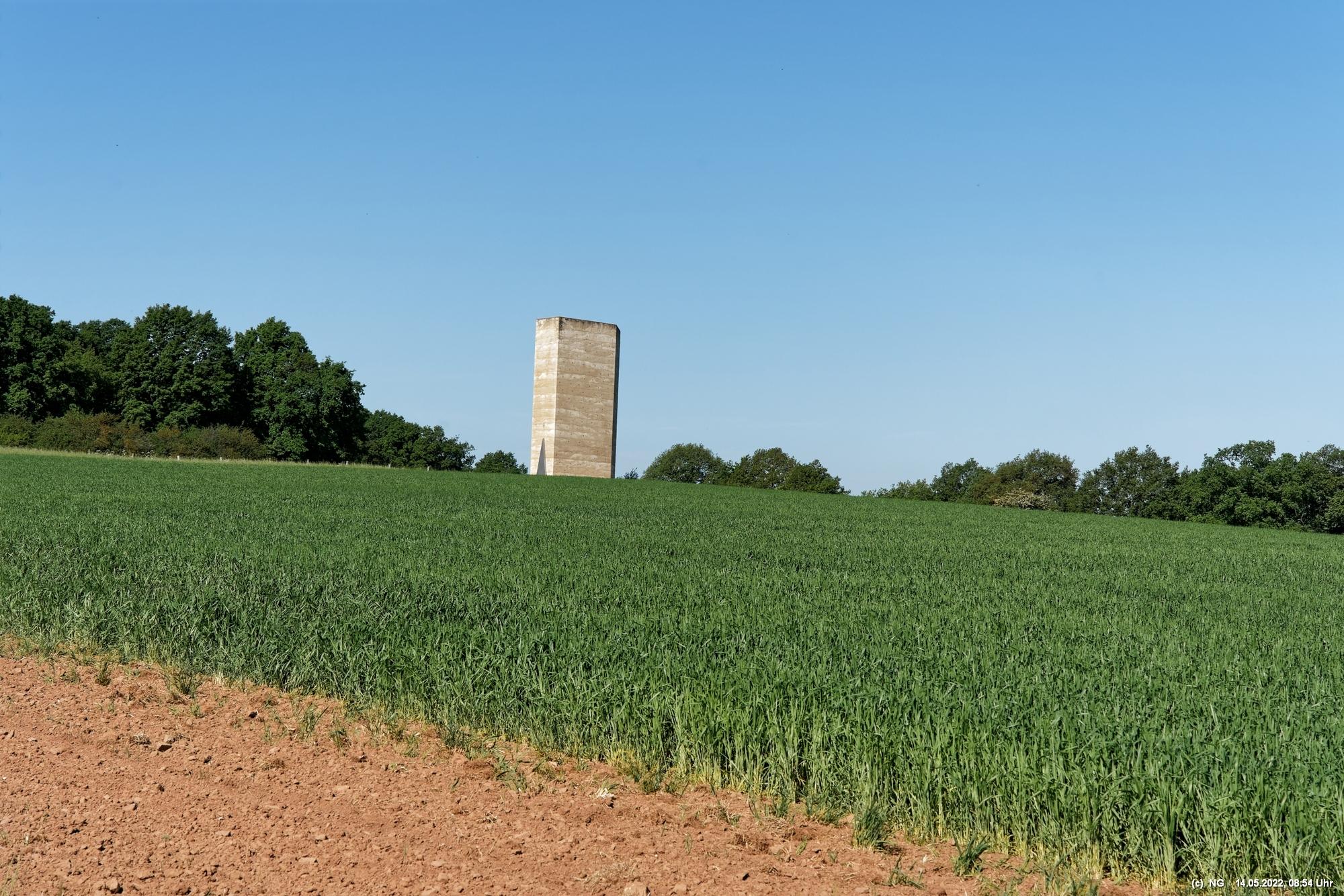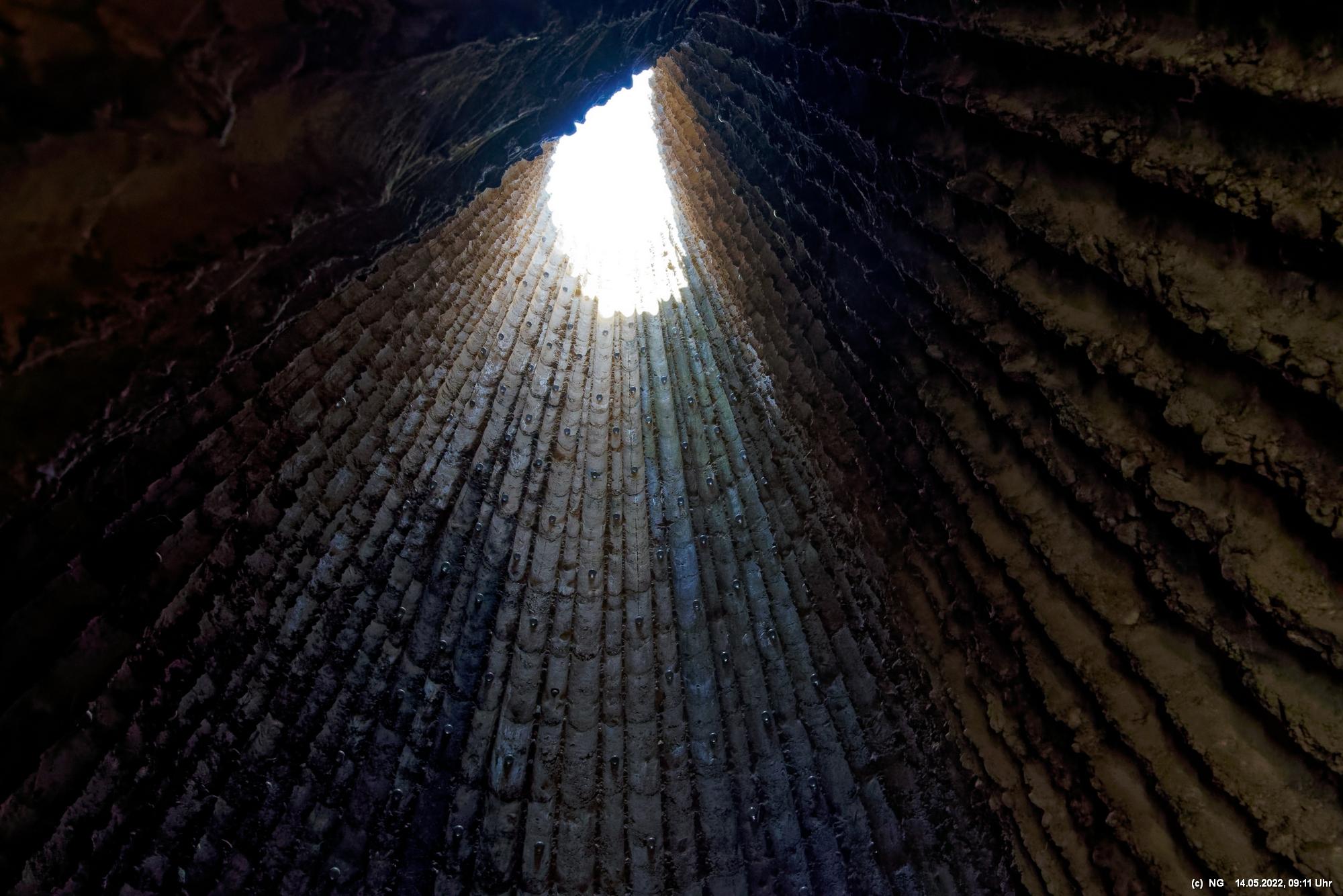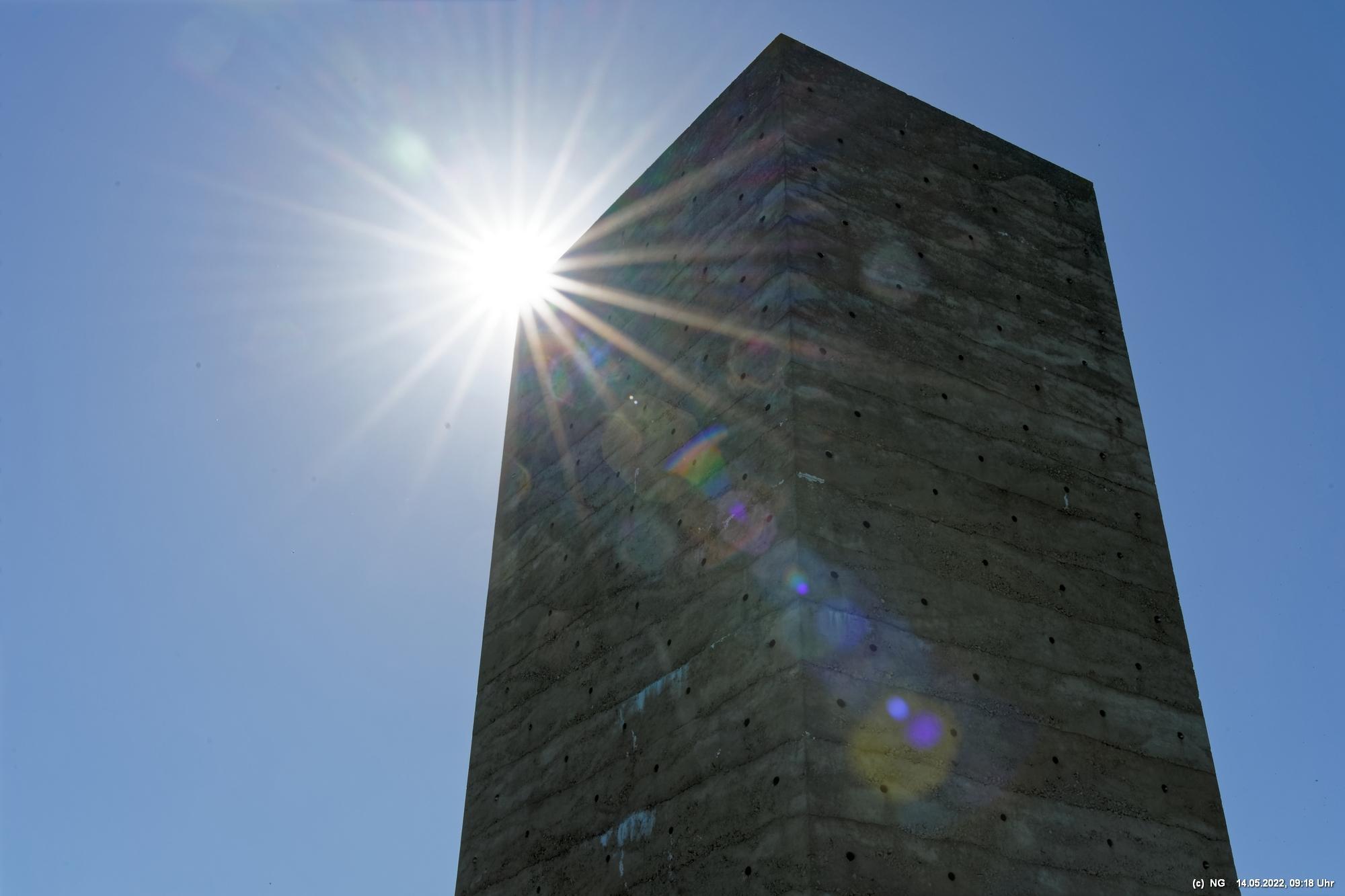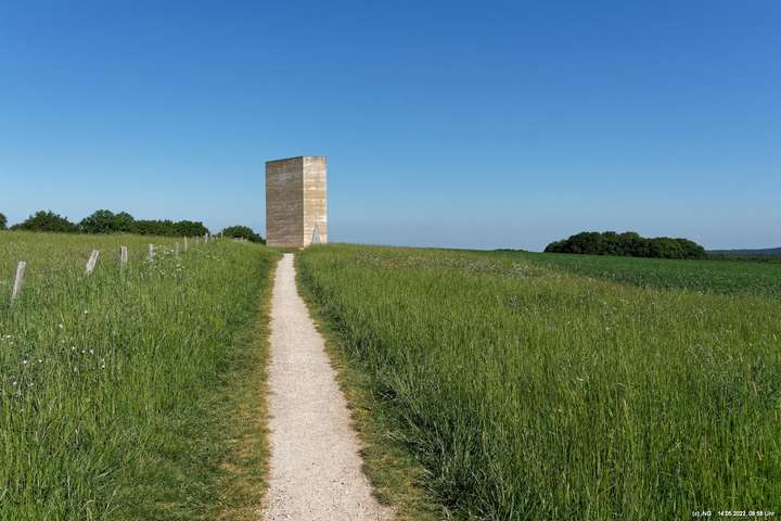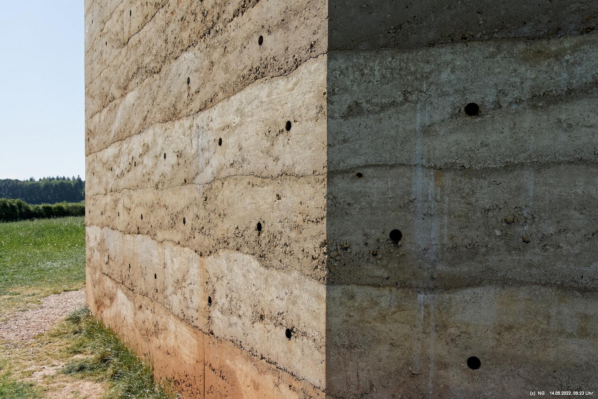 Beeindruckend: Die klare Form des 5-eckigen Gebäudes, oben offen und innen stark senkrecht strukturiert. Die Außenwände bestehen aus 23 Schichten Beton. Sie wurden nach alter Handwerkertradition geschichtet und gestampft. Als Schalung wurden innen verkohlte Baumstämme benutzt, die dem kleinen Raum etwas ganz Besonderes bieten – das muss man gesehen haben! Seitlich dringt nur wenig Licht durch kleine Röhrchen ein. Das große, natürliche Licht kommt massiv von oben. Der Raumeindruck ist unbeschreiblich und hat uns wiederum richtig gepackt. Den längeren Weg durch die Felder zum Auto haben wir richtig gebraucht. Ganz sicher: Wir kommen wieder!