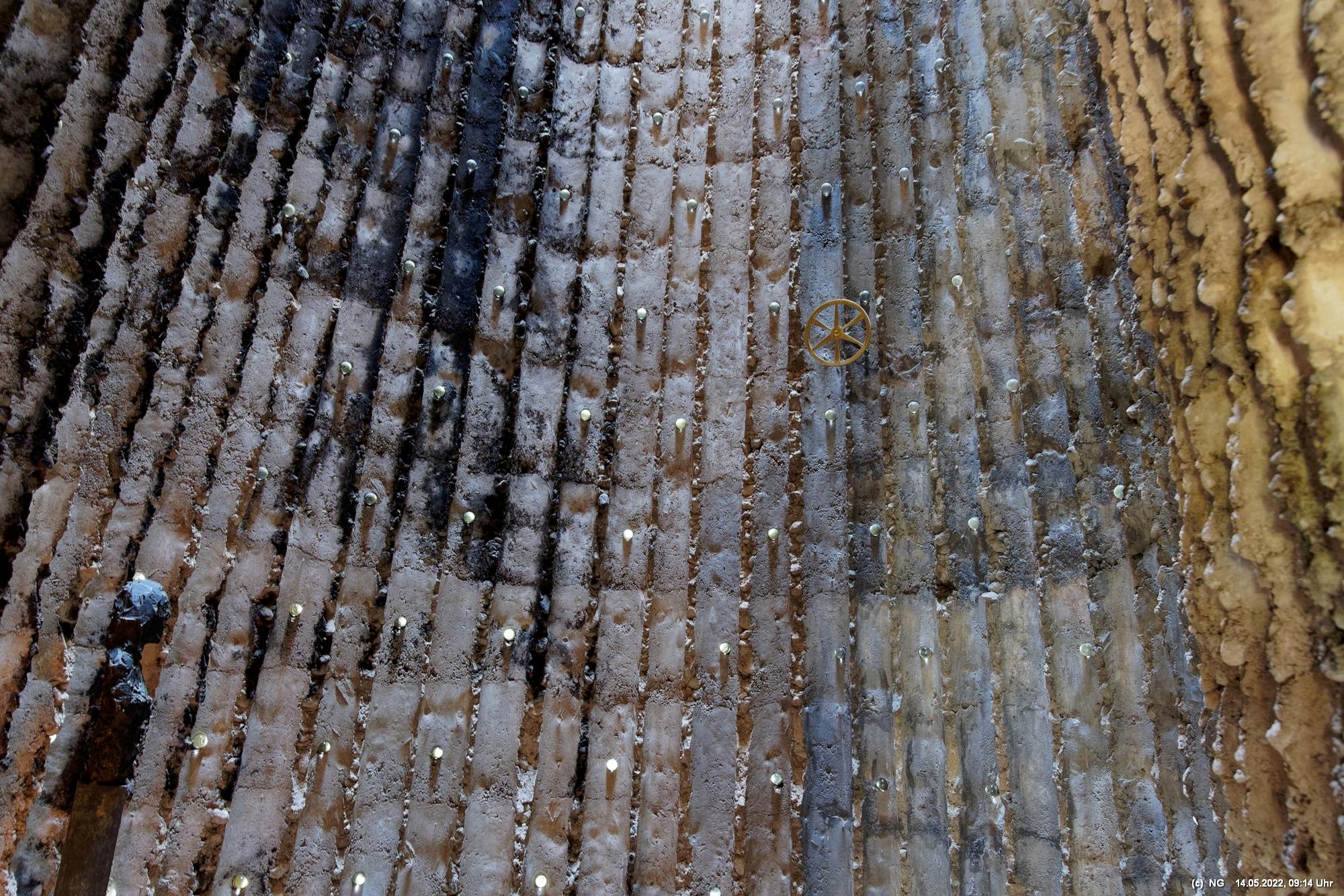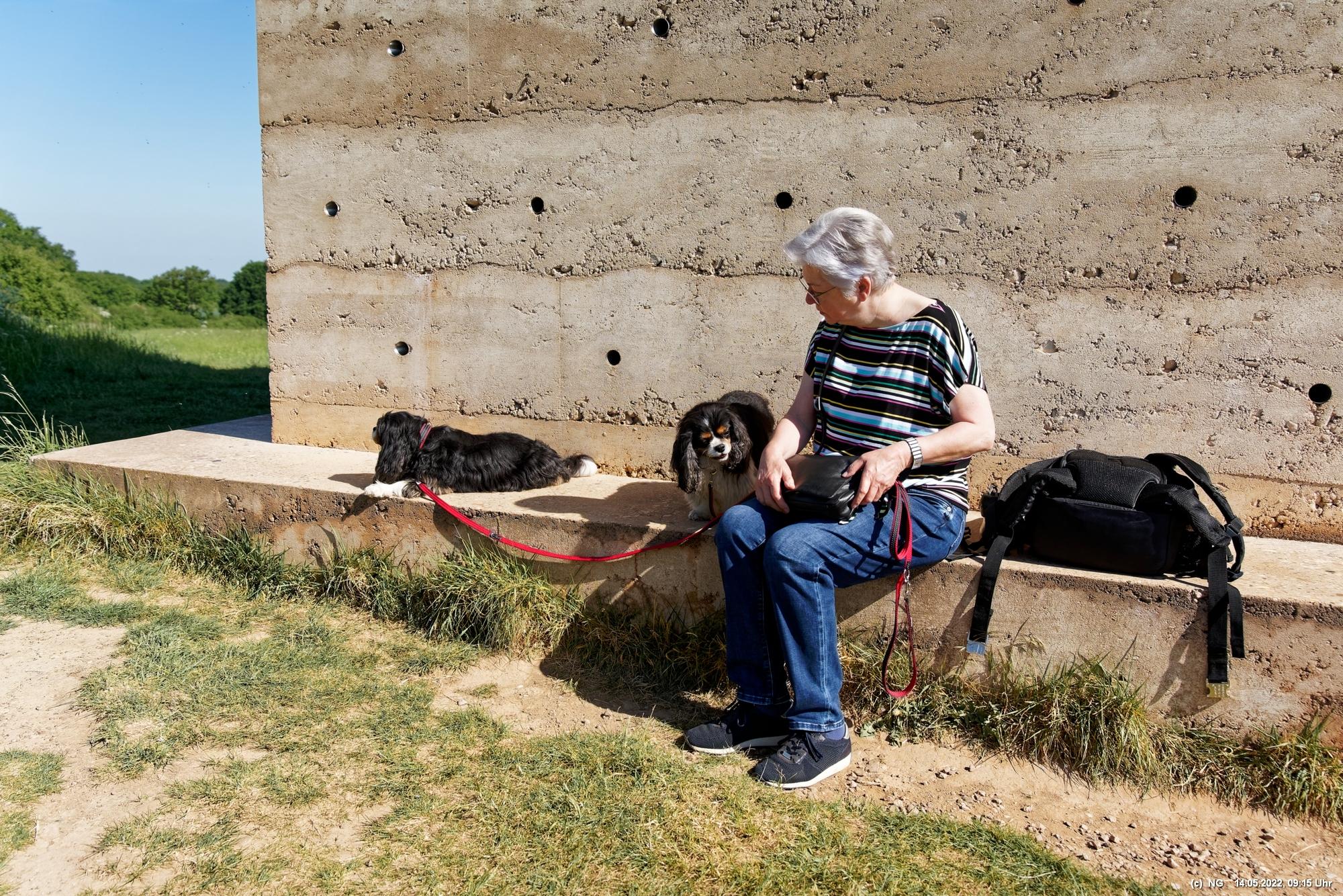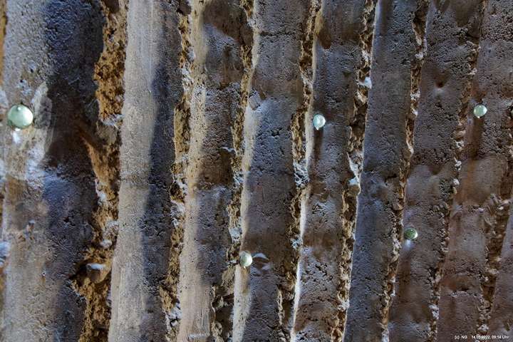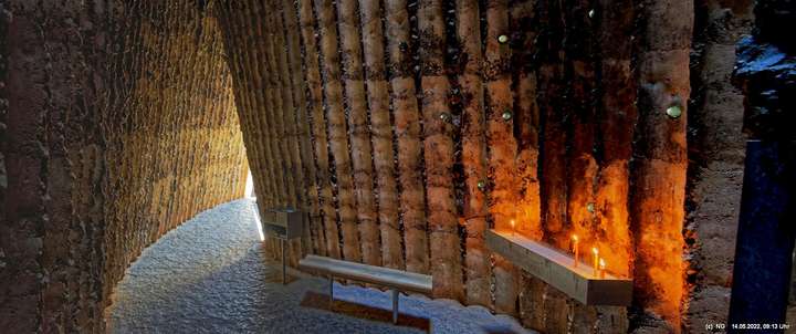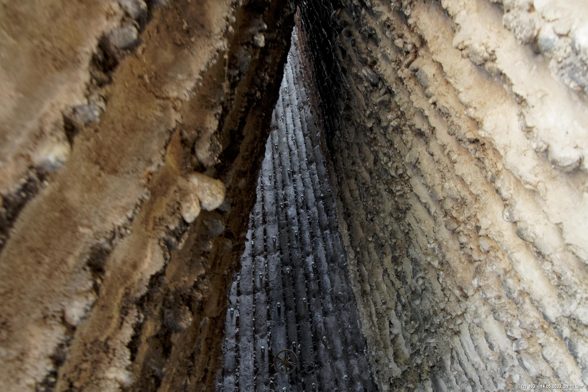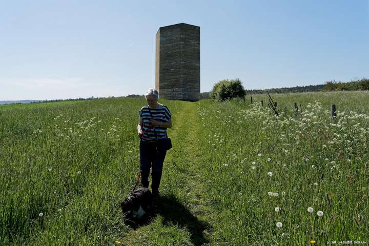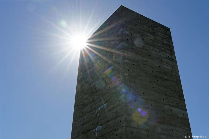Beeindruckend: Die klare Form des 5-eckigen Gebäudes, oben offen und innen stark senkrecht strukturiert. Die Außenwände bestehen aus 23 Schichten Beton. Sie wurden nach alter Handwerkertradition geschichtet und gestampft. Als Schalung wurden innen verkohlte Baumstämme benutzt, die dem kleinen Raum etwas ganz Besonderes bieten – das muss man gesehen haben! Seitlich dringt nur wenig Licht durch kleine Röhrchen ein. Das große, natürliche Licht kommt massiv von oben. Der Raumeindruck ist unbeschreiblich und hat uns wiederum richtig gepackt. Den längeren Weg durch die Felder zum Auto haben wir richtig gebraucht. Ganz sicher: Wir kommen wieder!