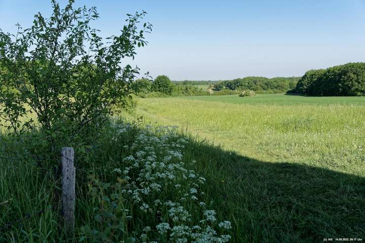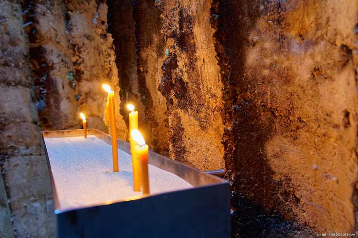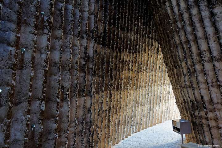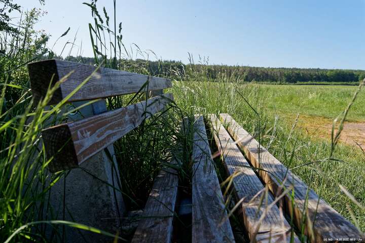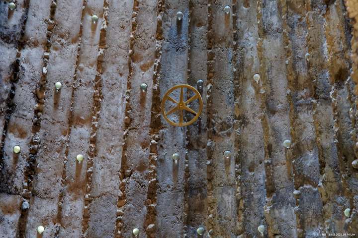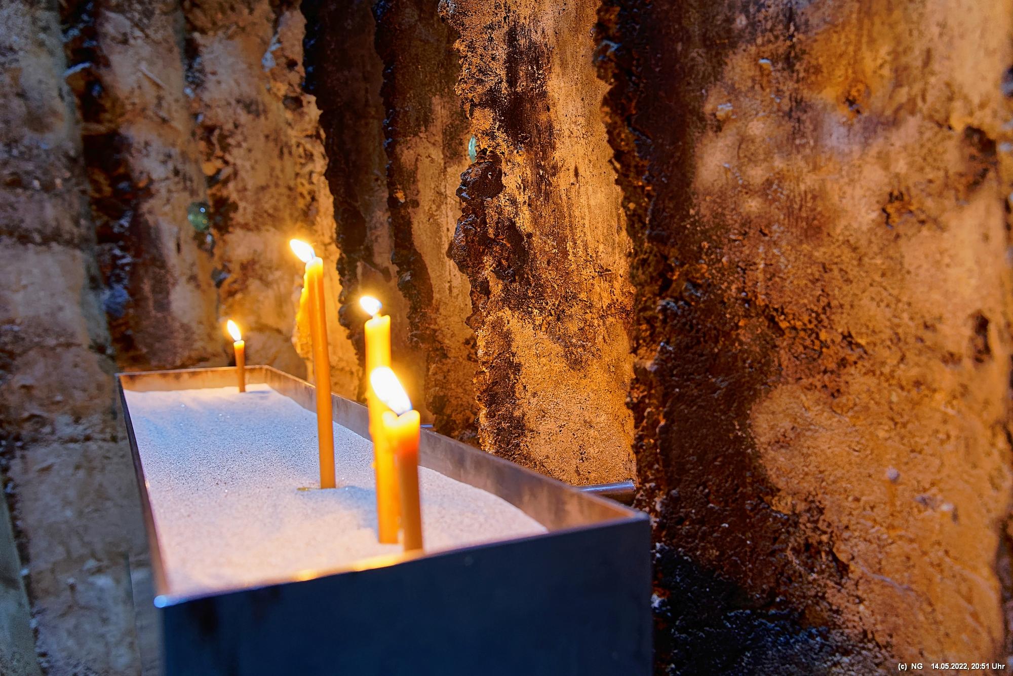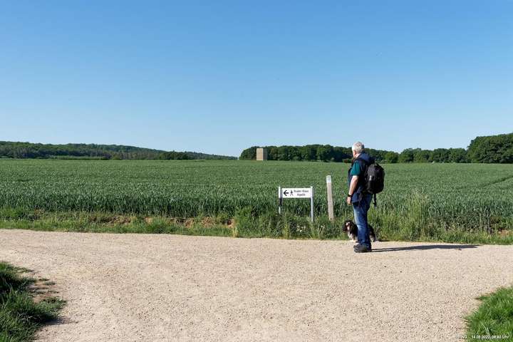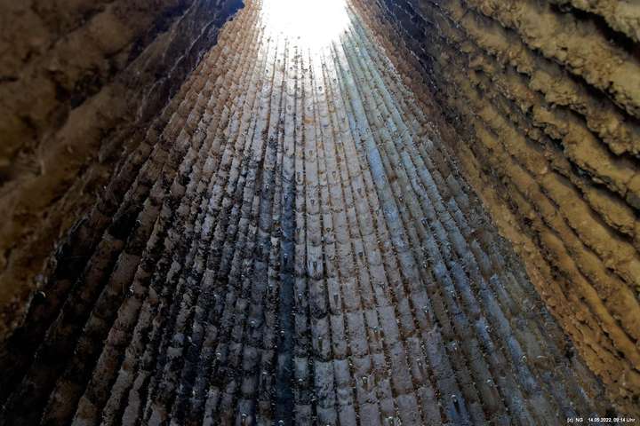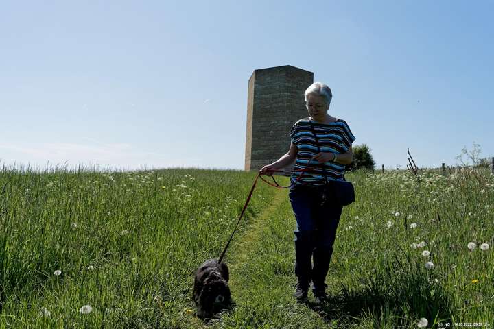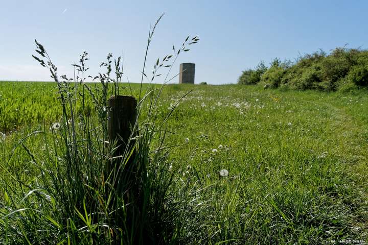 Beeindruckend: Die klare Form des 5-eckigen Gebäudes, oben offen und innen stark senkrecht strukturiert. Die Außenwände bestehen aus 23 Schichten Beton. Sie wurden nach alter Handwerkertradition geschichtet und gestampft. Als Schalung wurden innen verkohlte Baumstämme benutzt, die dem kleinen Raum etwas ganz Besonderes bieten – das muss man gesehen haben! Seitlich dringt nur wenig Licht durch kleine Röhrchen ein. Das große, natürliche Licht kommt massiv von oben. Der Raumeindruck ist unbeschreiblich und hat uns wiederum richtig gepackt. Den längeren Weg durch die Felder zum Auto haben wir richtig gebraucht. Ganz sicher: Wir kommen wieder!