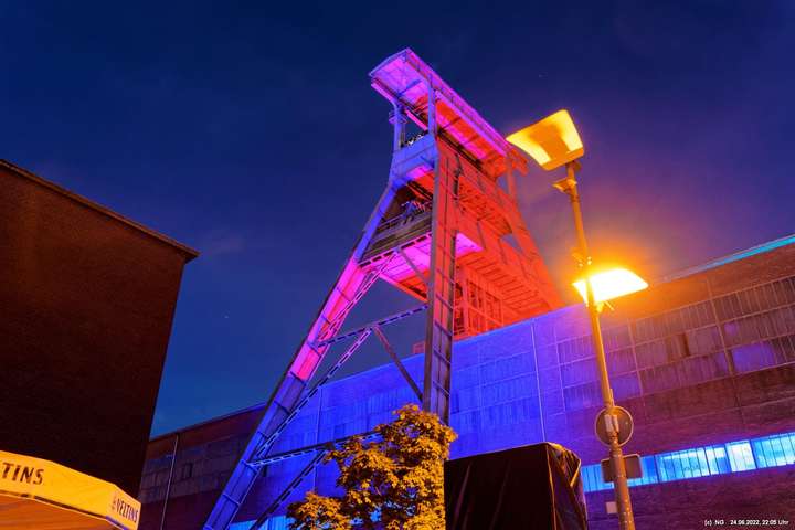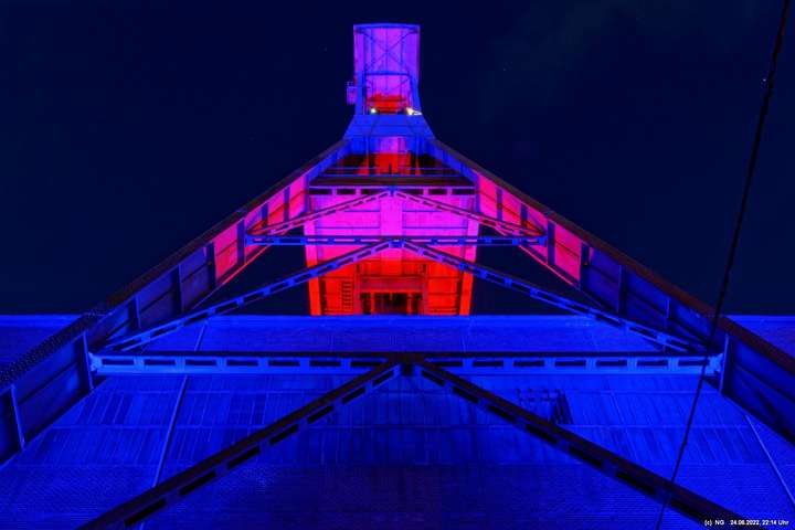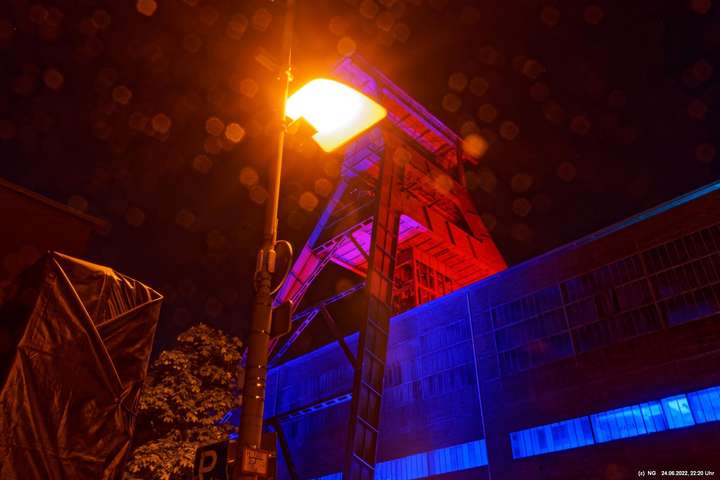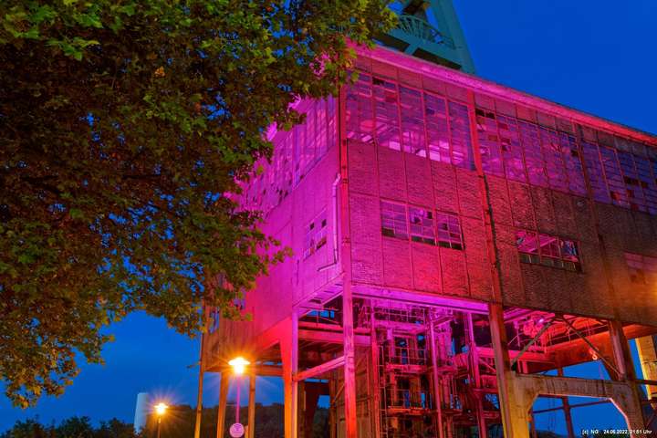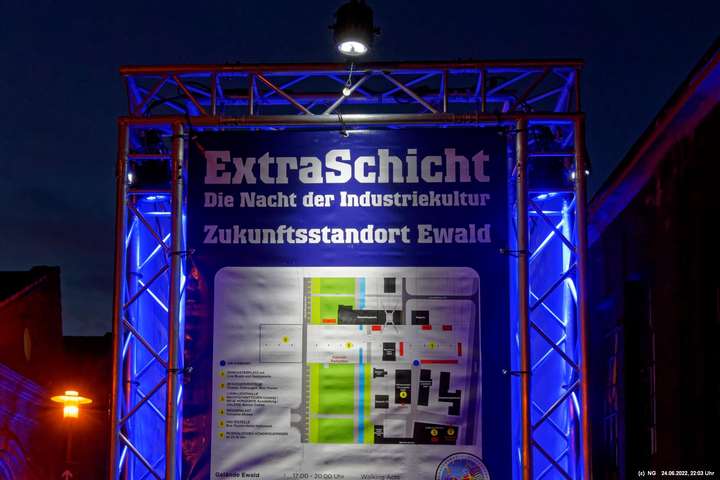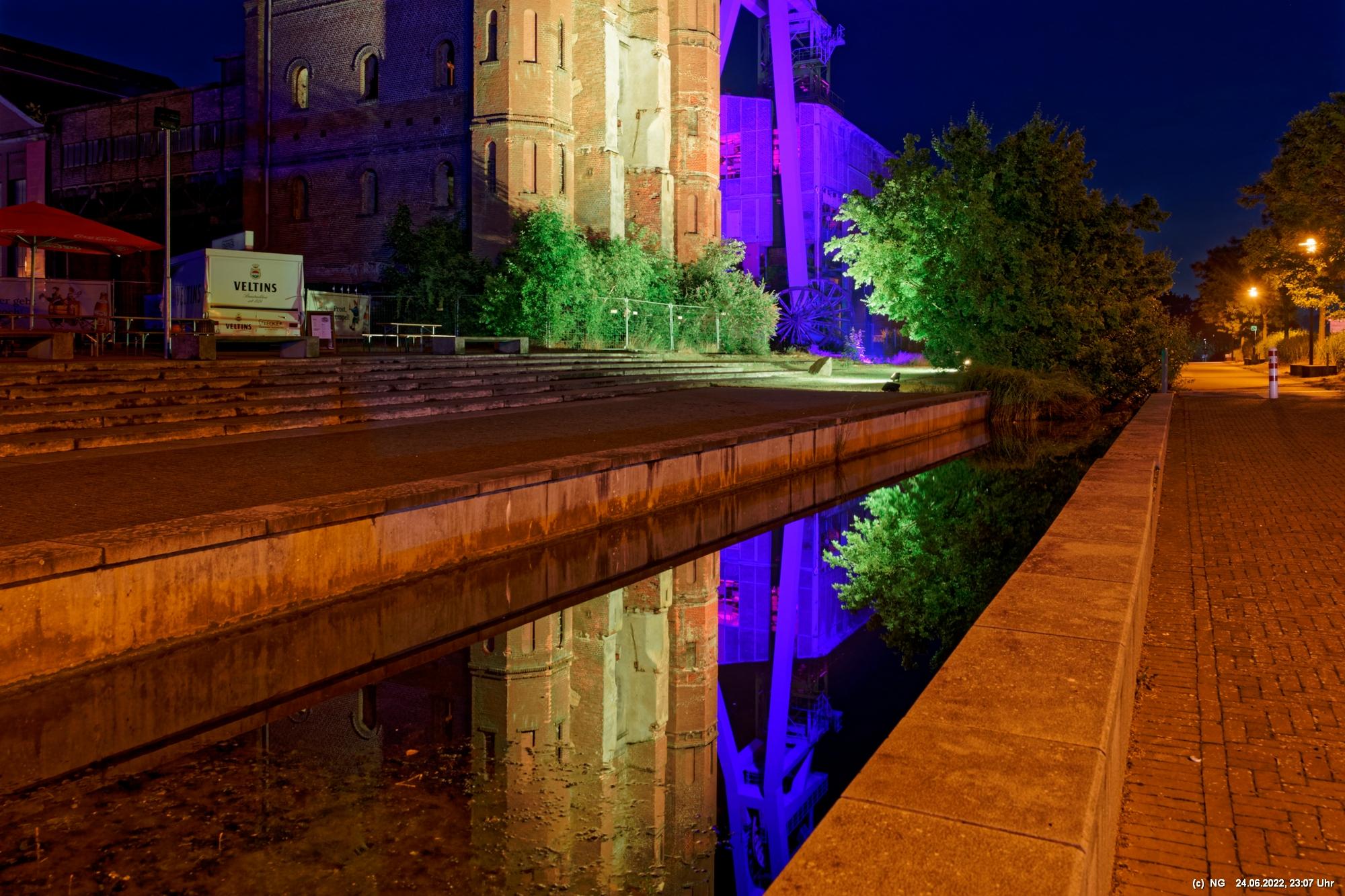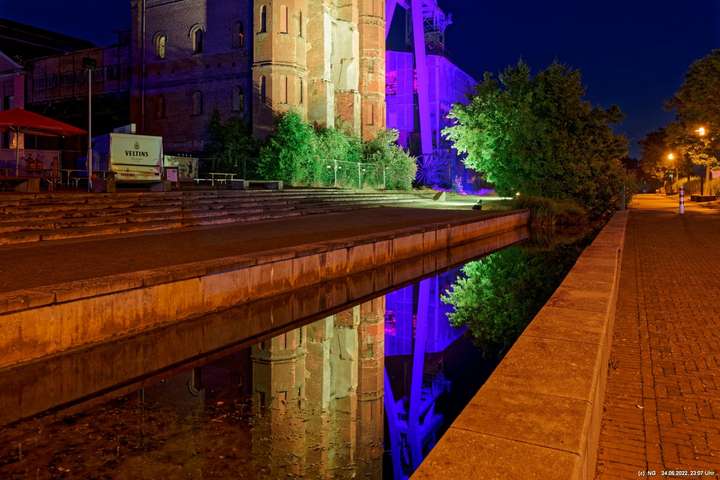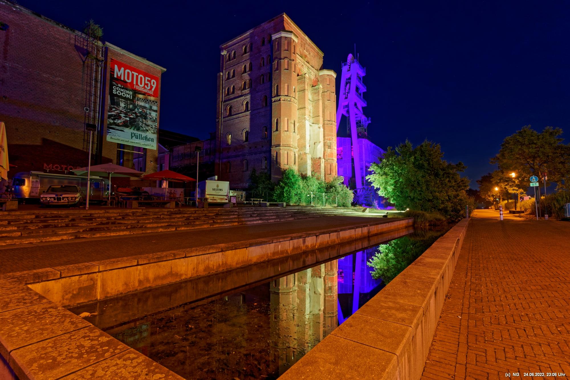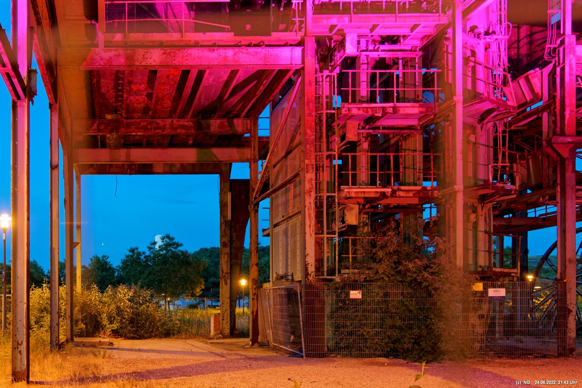 Es ging zur Zeche Ewald und der dortigen „Revierkunst“, wo Beleuchtungsproben für die Extraschicht anstanden. Leider war das irgendwie anders als sonst. Es wurden nur wenige Gebäude beleuchtet. Möglicherweise wurde erst später noch andere dazu geschaltet, aber schon nach Mitternacht war dann doch Schicht.