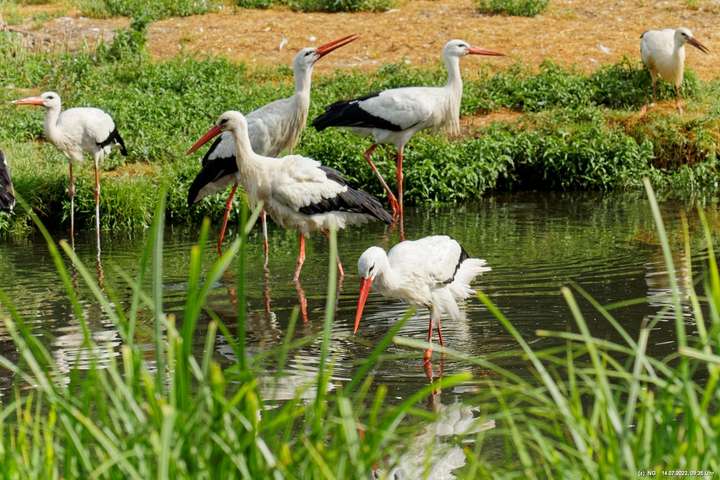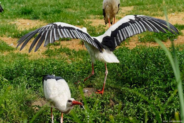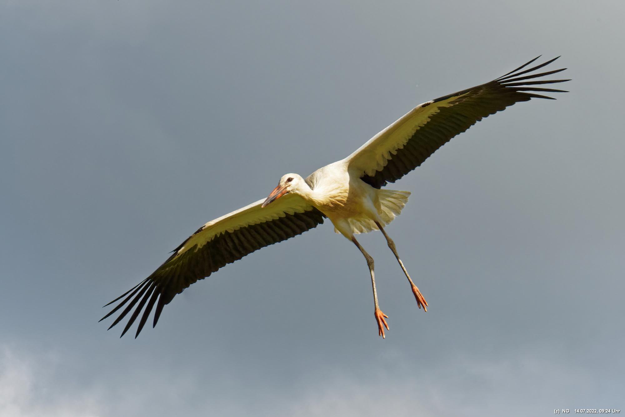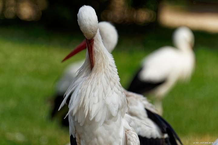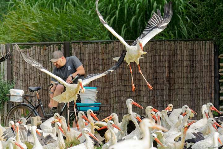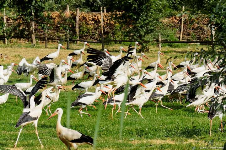 Zur morgentlichen Fütterung der Störche erhöhte sich der Flugverkehr dramatisch. Ein Fluglotse hätte keine Übersicht mehr. Die Tiere haben ein gutes Zeitgefühl und so tummelt es sich dort gewaltig. Und wenn dann der Mann mit dem Futter kommt, sieht man nur noch eine wallende riesige Masse.