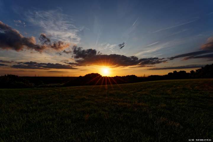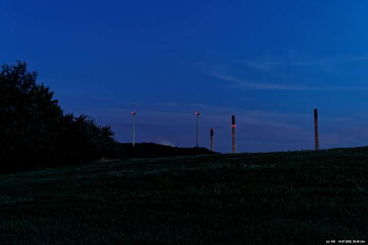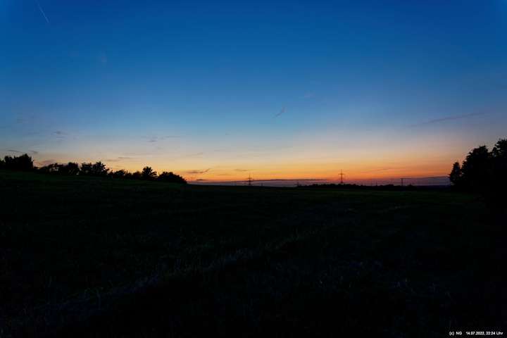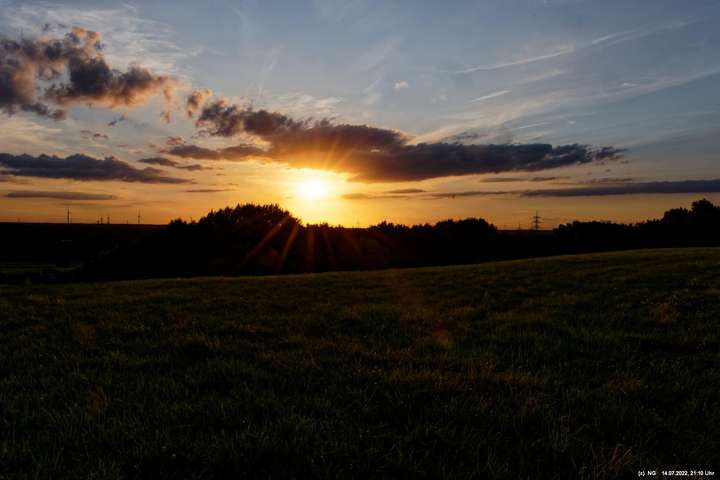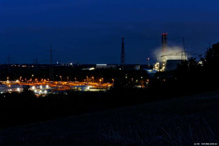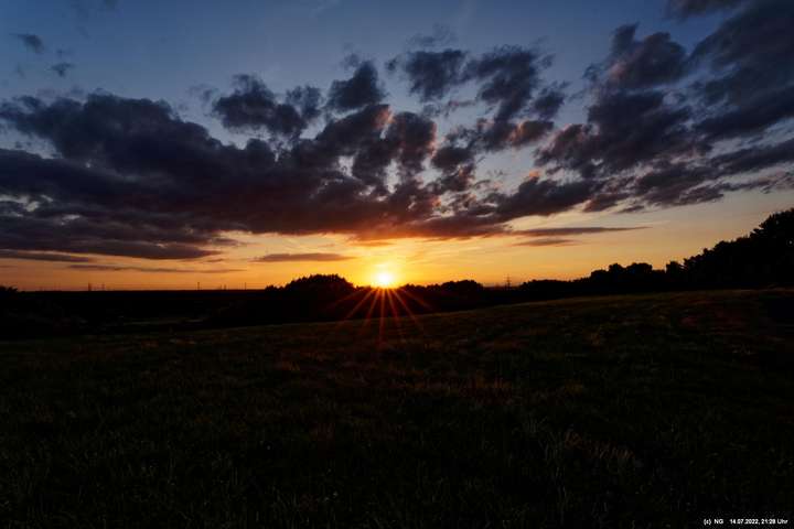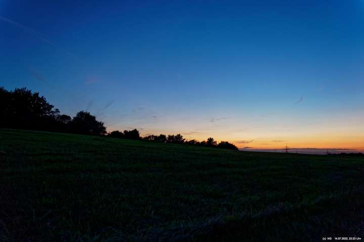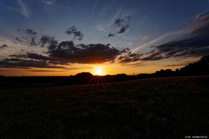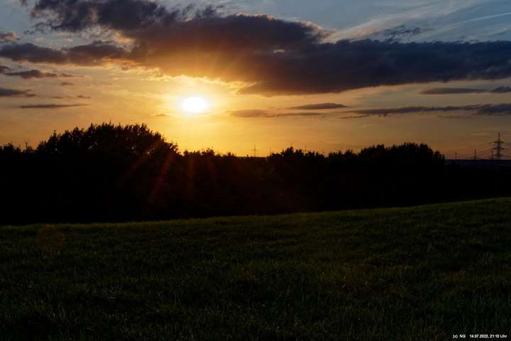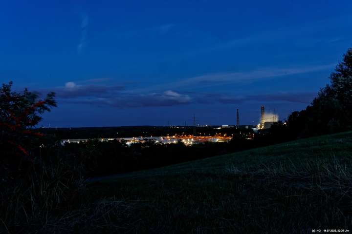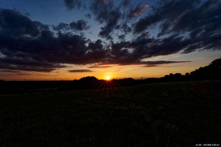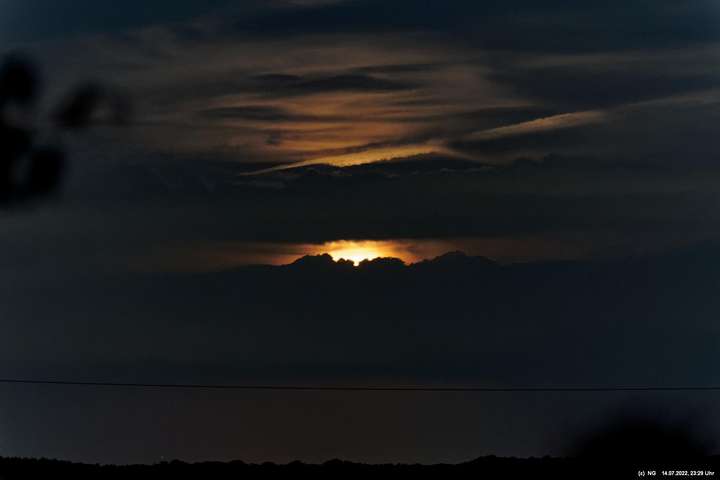 Es ging wieder auf die Halde Scholver Feld (GE-Buer). Gehofft hatte ich auf einen schönen Sonnenuntergang und noch auf den Aufgang des Supermondes. Anfangs waren noch einige Pärchen oben. Als es dunkler und kälter wurde, waren die alle bald verschwunden. Der Sonnenuntergang (21:45 Uhr) fing prächtig an. Doch am entscheidenden Ende schob sich eine kleine Wolkenwand vor die Sonne (wieder einmal). Dann hieß es warten bis 23:00 Uhr zum Mondaufgang. Es war schon dunkel und auch langsam und dem ordentlichen Wind ziemlich frisch. Dann war es so weit. Ich konnte den Mondaufgang sehen, aber es waren Schleierwolken davor. Als die Hoffnung auf freie Mondsicht stieg, kamen dann doch wieder die Wolken. Egal - es war hoch interessant!