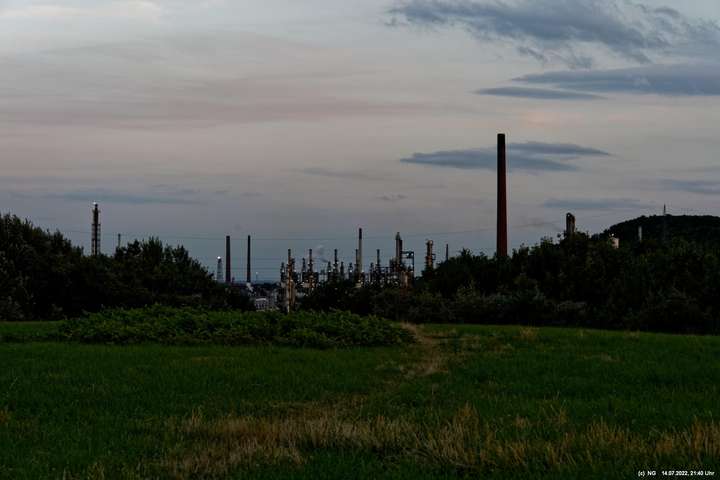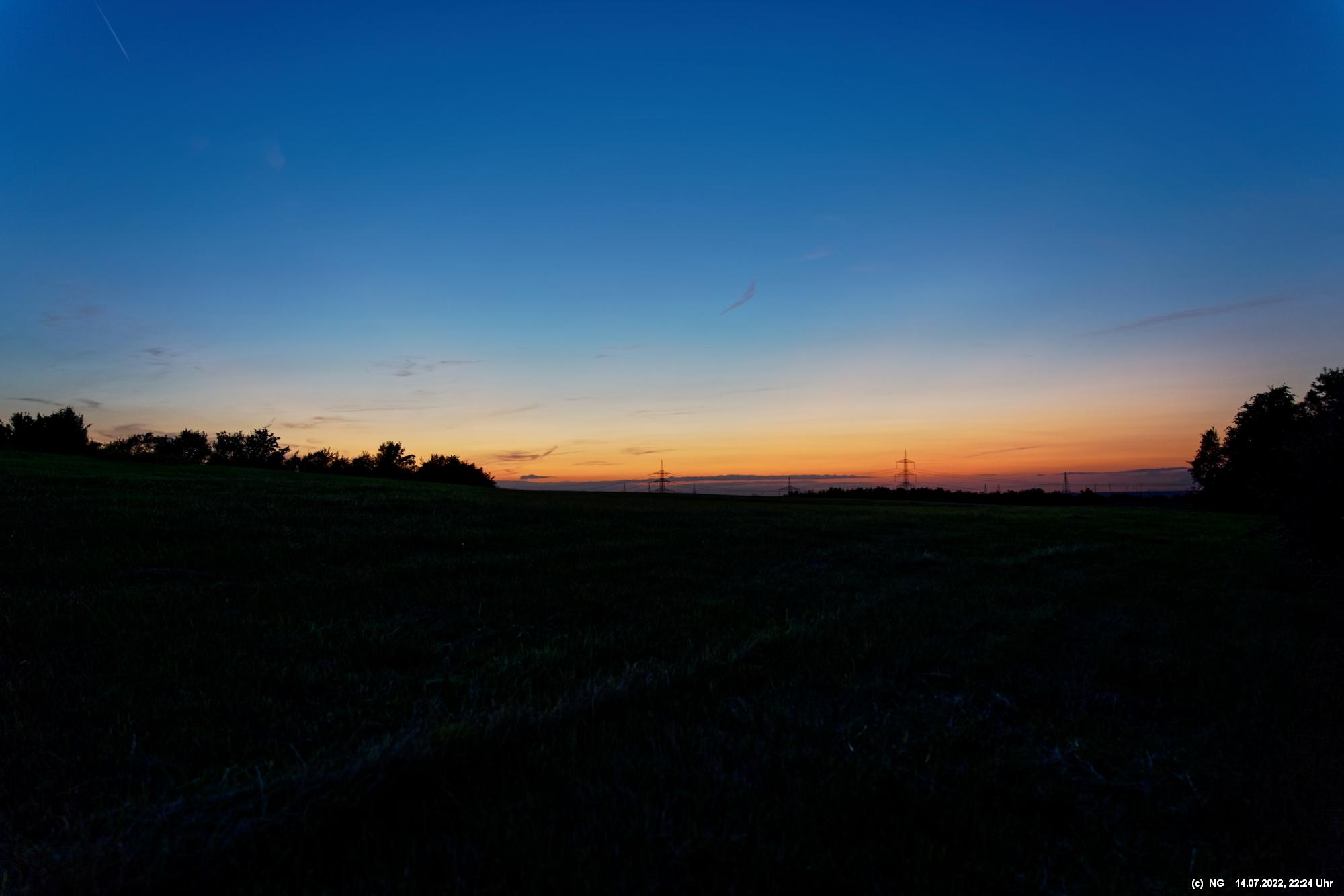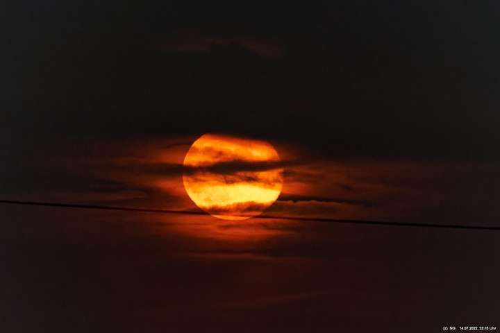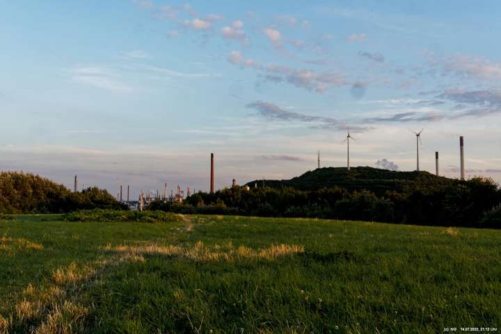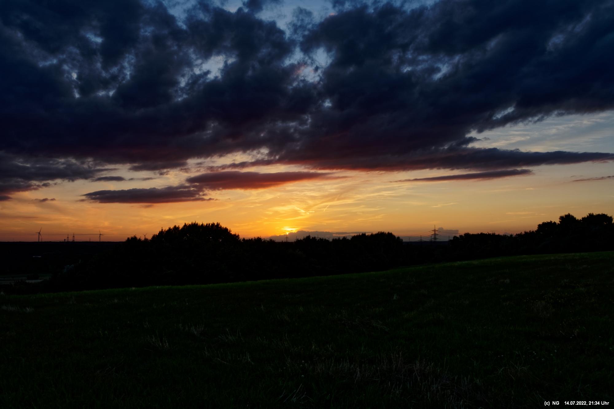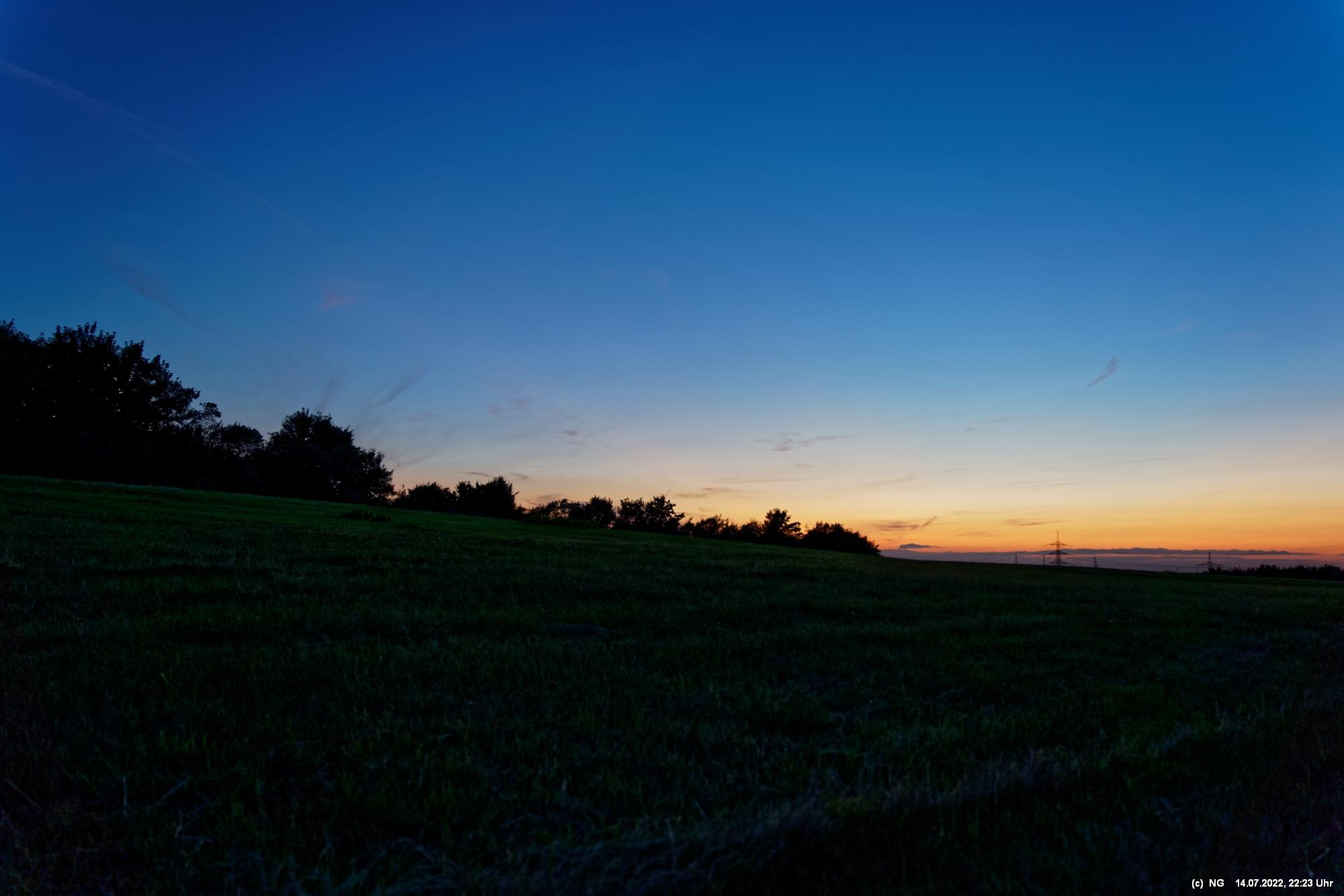 Es ging wieder auf die Halde Scholver Feld (GE-Buer). Gehofft hatte ich auf einen schönen Sonnenuntergang und noch auf den Aufgang des Supermondes. Anfangs waren noch einige Pärchen oben. Als es dunkler und kälter wurde, waren die alle bald verschwunden. Der Sonnenuntergang (21:45 Uhr) fing prächtig an. Doch am entscheidenden Ende schob sich eine kleine Wolkenwand vor die Sonne (wieder einmal). Dann hieß es warten bis 23:00 Uhr zum Mondaufgang. Es war schon dunkel und auch langsam und dem ordentlichen Wind ziemlich frisch. Dann war es so weit. Ich konnte den Mondaufgang sehen, aber es waren Schleierwolken davor. Als die Hoffnung auf freie Mondsicht stieg, kamen dann doch wieder die Wolken. Egal - es war hoch interessant!