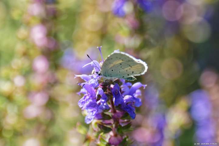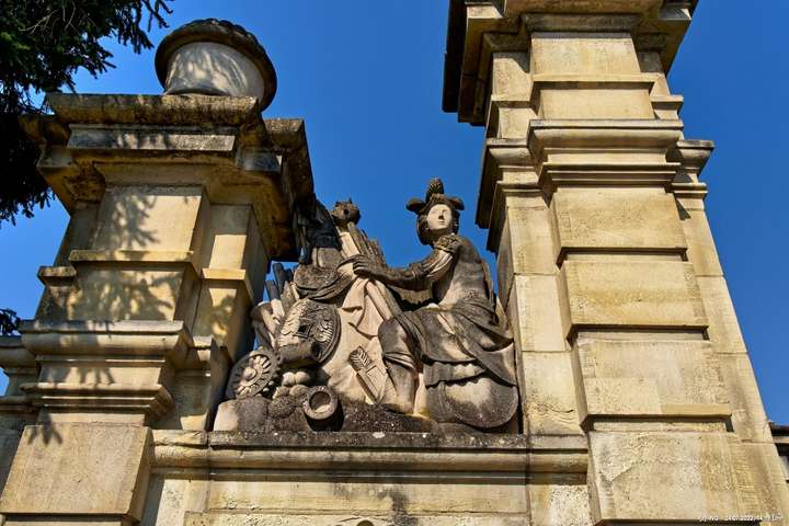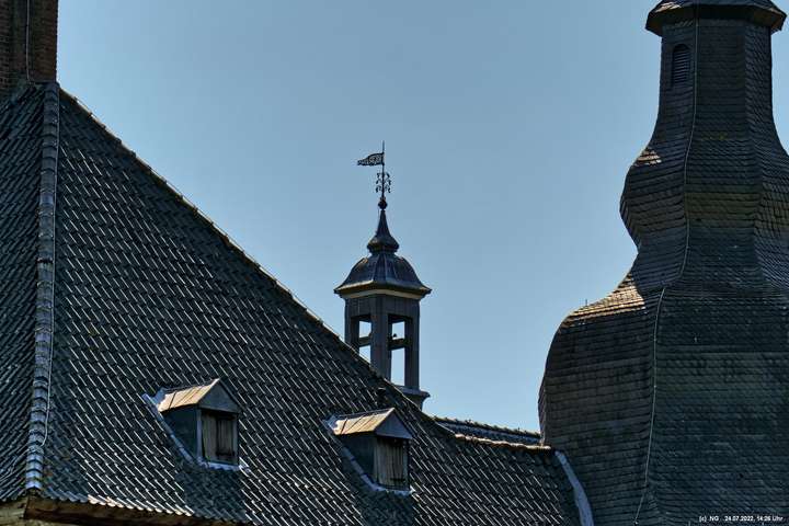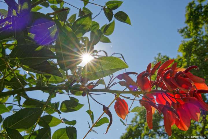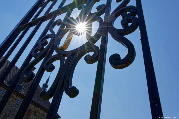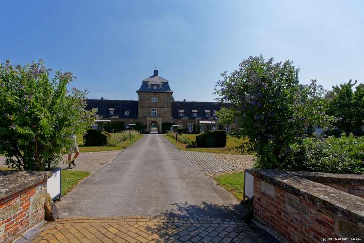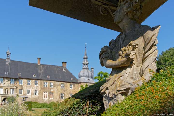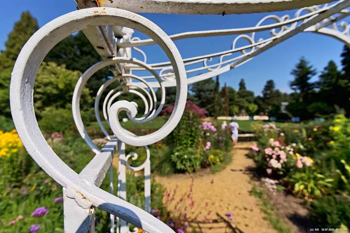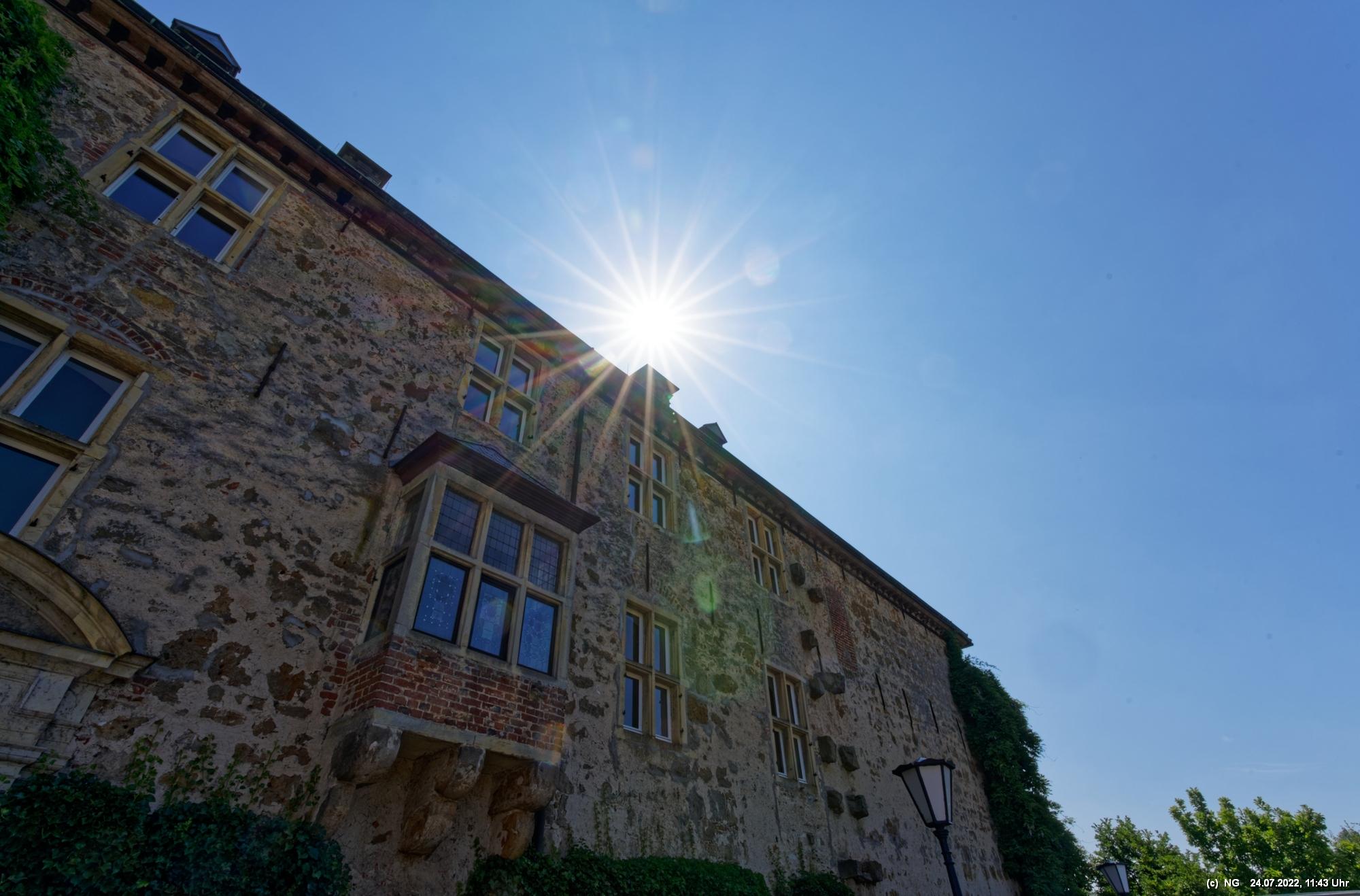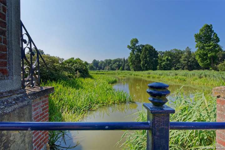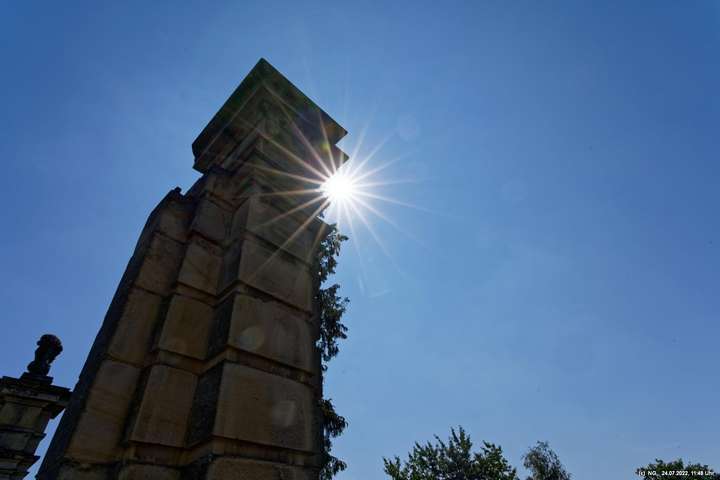 Der Schlosspark hatte ursprünglich barocke Formen mit symmetrischen Wegachsen. Im 19. Jahrhundert wurde er, dem Zeitgeist folgend, zu einem englischen Landschaftspark mit solitär stehenden Bäumen und Rhododendren umgestaltet. Heute ging es auf eine Fototour mit "Revierblicke". Wir waren recht früh dort und nur wenige Menschen standen unseren Fotomotiven im Weg. Es war wolkenlos und gegen Mittag wurde es heiß.