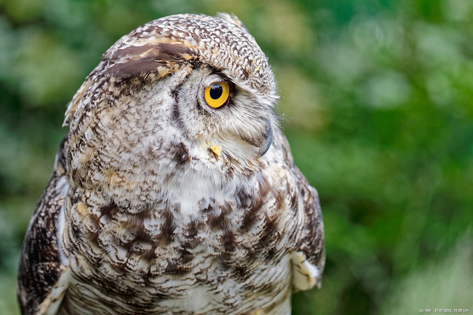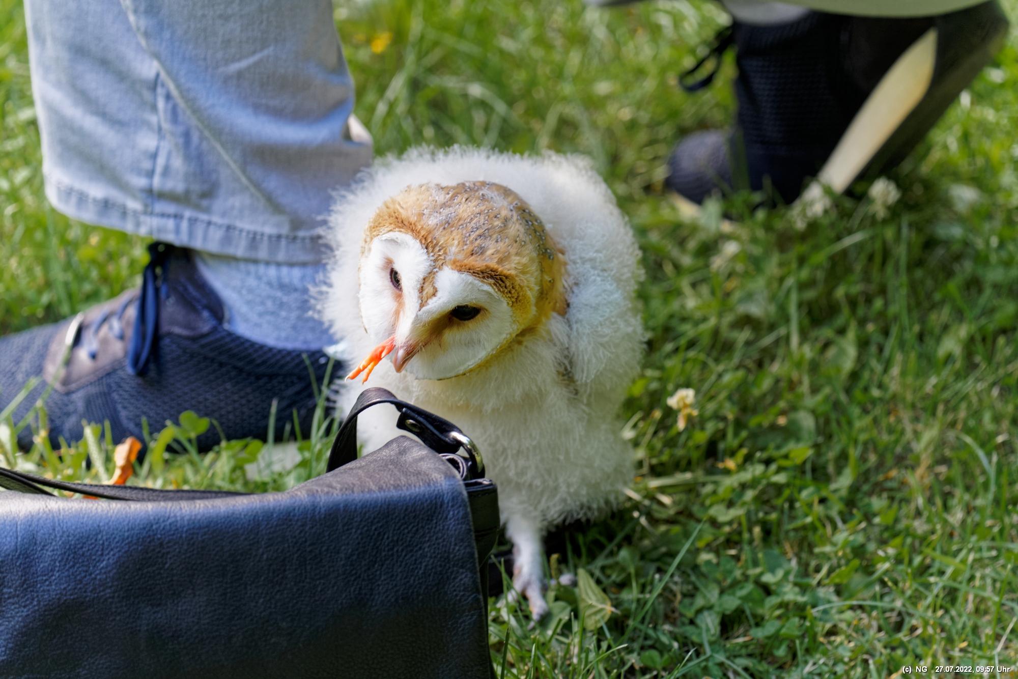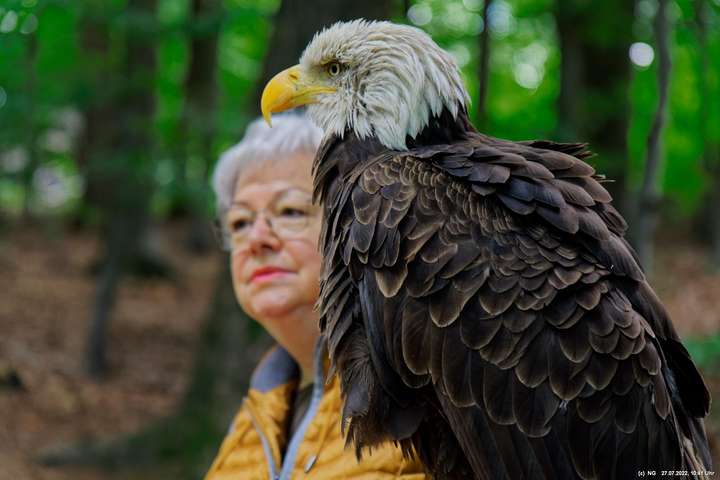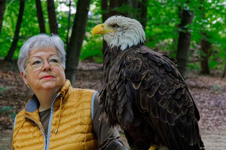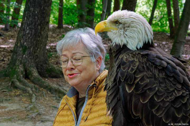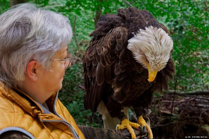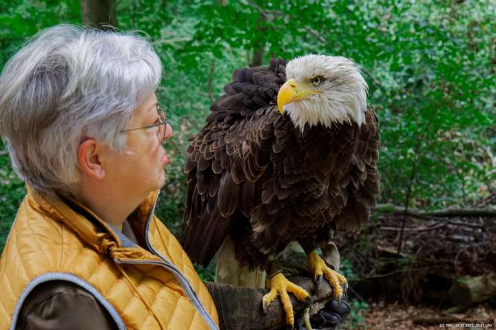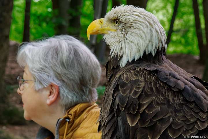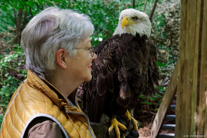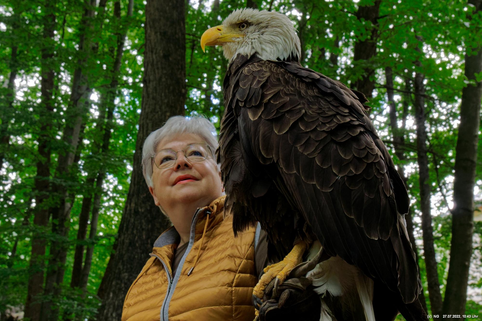 Die Umgebung ist abseits vom Stadtrummel wirklich traumhaft. Über 50 Tiere leben dort in großen Volieren. Viele von ihnen sind aber meist im Freien, unter Bäumen und mit viel Auslauf. Eine Stunde lang durften wir den engen Kontakt zu den Tieren genießen. Ich denke, wir hatten mehr Respekt vor denen, als die vor uns. Wenn man z.B. den großen Weißkopfseeadler auf dem Arm hat, ist man schon sehr beeindruckt. Es war ein tolles Erlebnis!